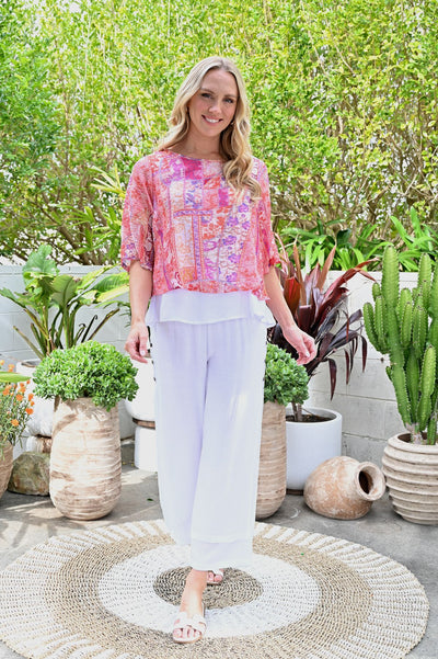 This lovely layered design is effortlessly elegant, with an element of beachy style. With two layers of textured, woven fabric. A beautiful piece for layering with a pant, or simply your favourite denim.