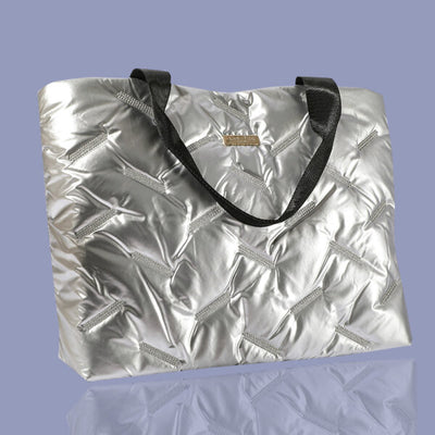Make a statement where ever you go with Silver Puff&Go Tote by Lavish. This eye catching everyday bag combines modern shine with lightweight practicality, making it your perfect grab-and-go companion. The padded quilted design adds a trendy touch, while the spacious interior easily fits all your daily essentials - from your laptop to your gym gear or weekend must haves.
