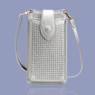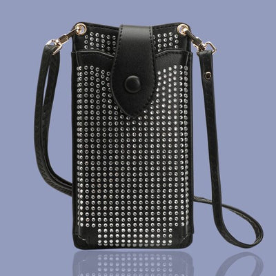 Stay stylish and hand free with Silver Cross Body Phone Holder by Lavish, the perfect blend of fashion and functionality. Designed with sleek black finish and glittering stud embellishments, this compact accessory keeps your essentials close while adding a touch of glamour to any outfit. The adjustable strap ensures comfort and convenience, making is ideal for days on the go.