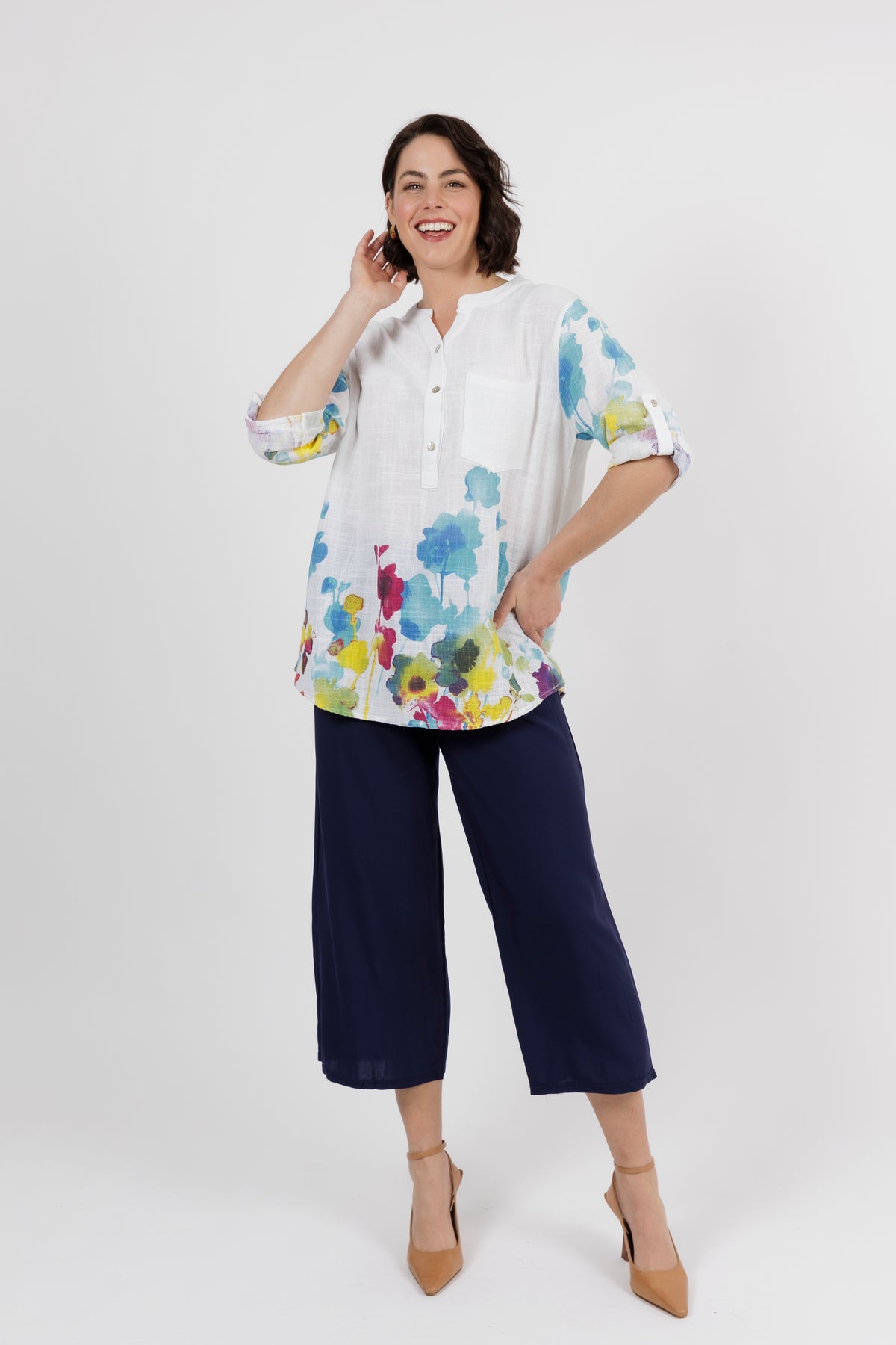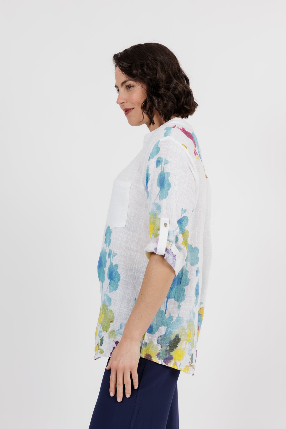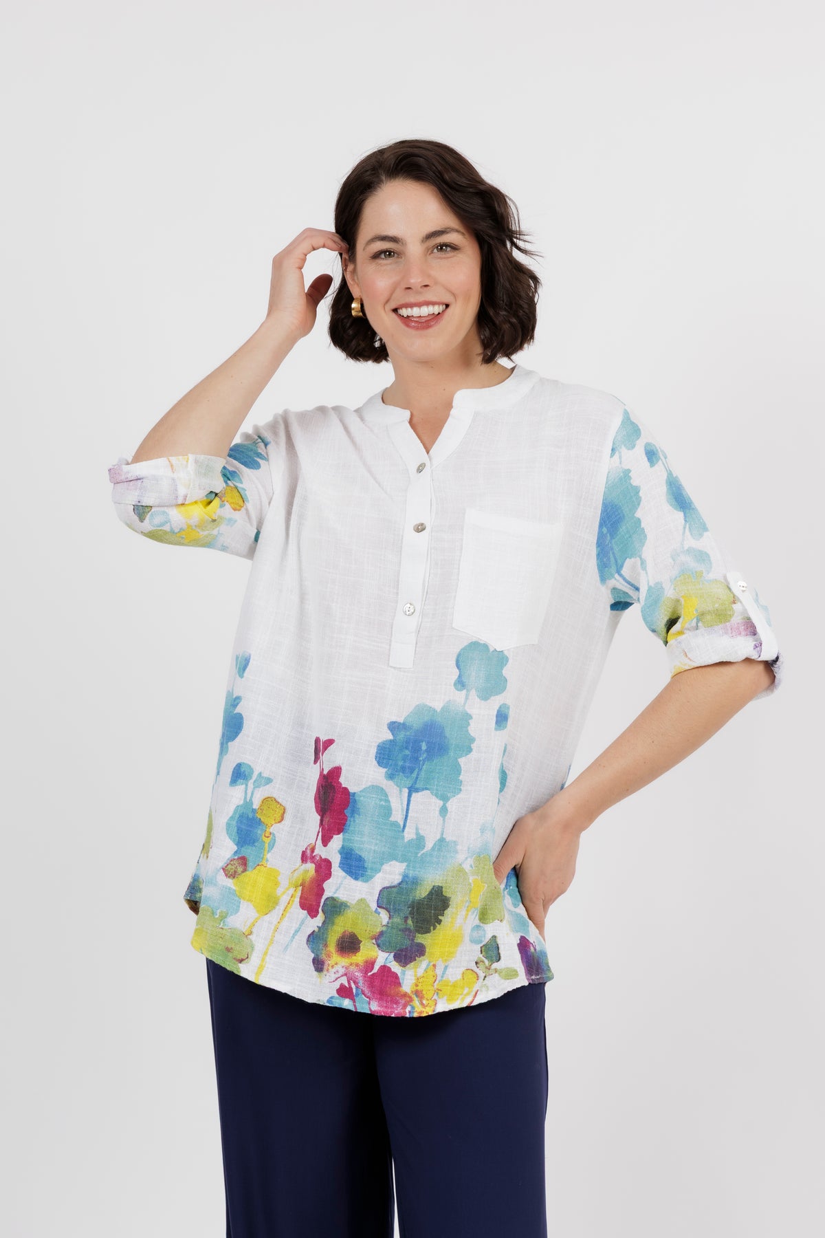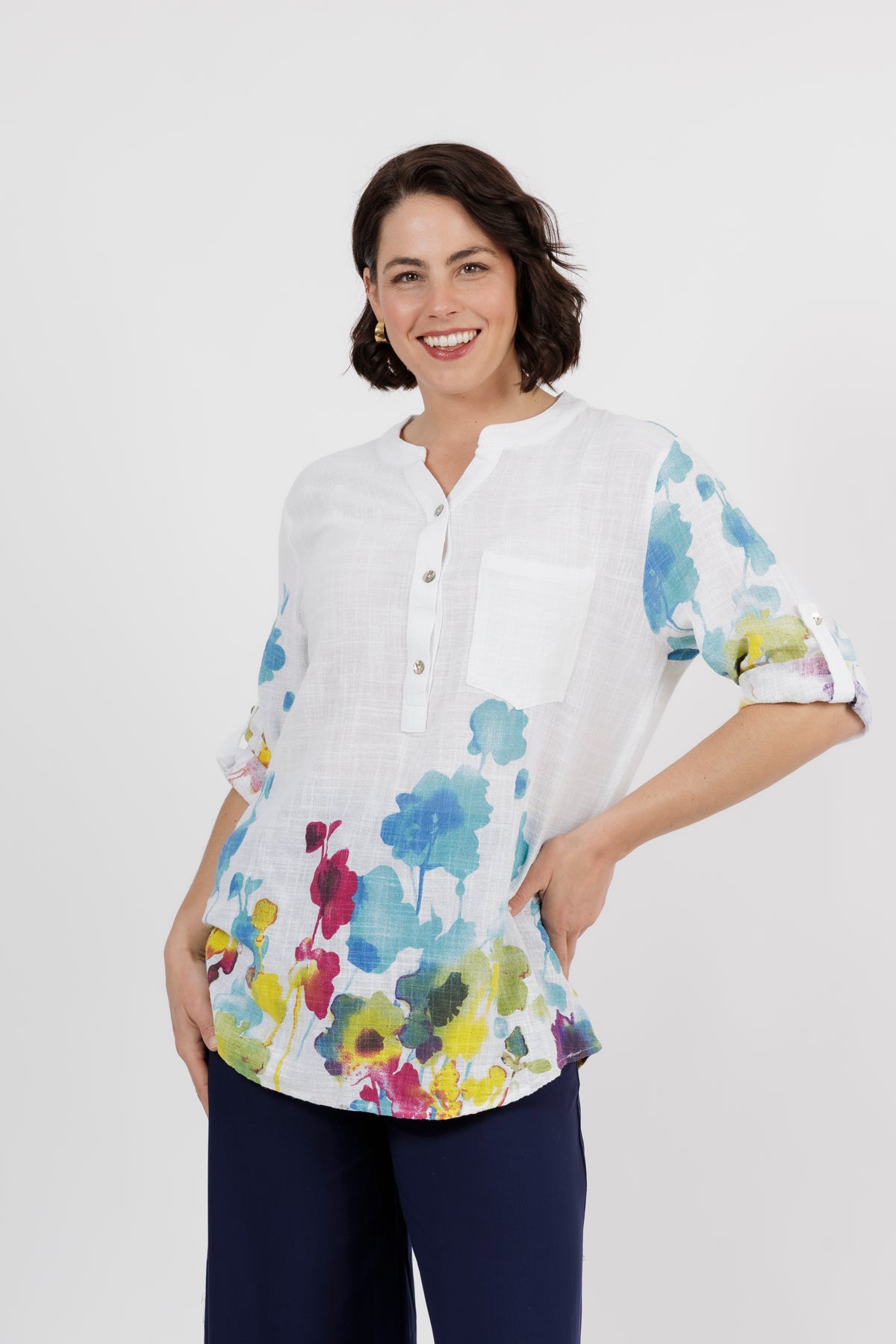 Regular price $89.95 Sale price $55.00Bring a fresh pop of colour to your wardrobe with this relaxed jade-green animal print top. Made in a soft, lightweight fabric, it drapes beautifully while giving you complete comfort for all-day wear. The Henley-style button front adds a casual, everyday touch, while the rolled tab sleeves let you switch between long and 3/4 styling with ease.