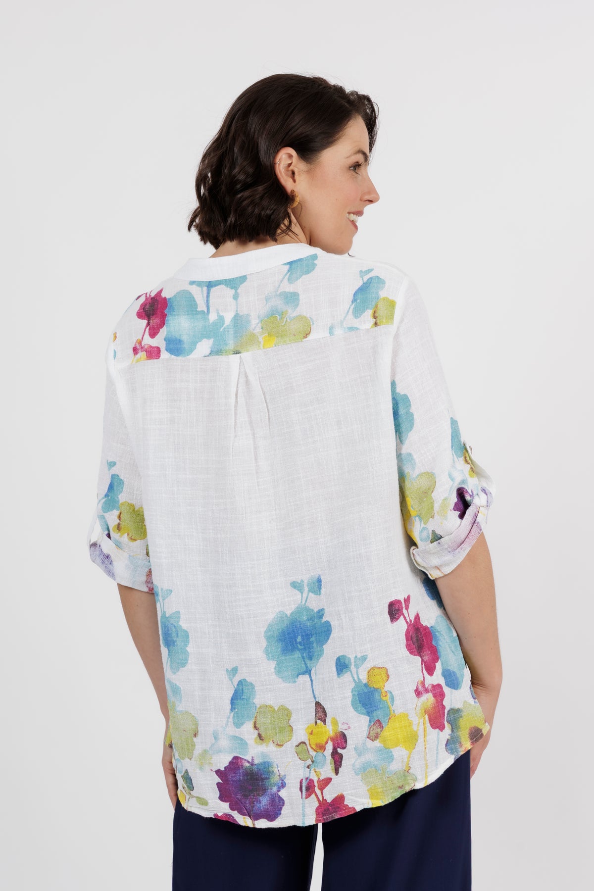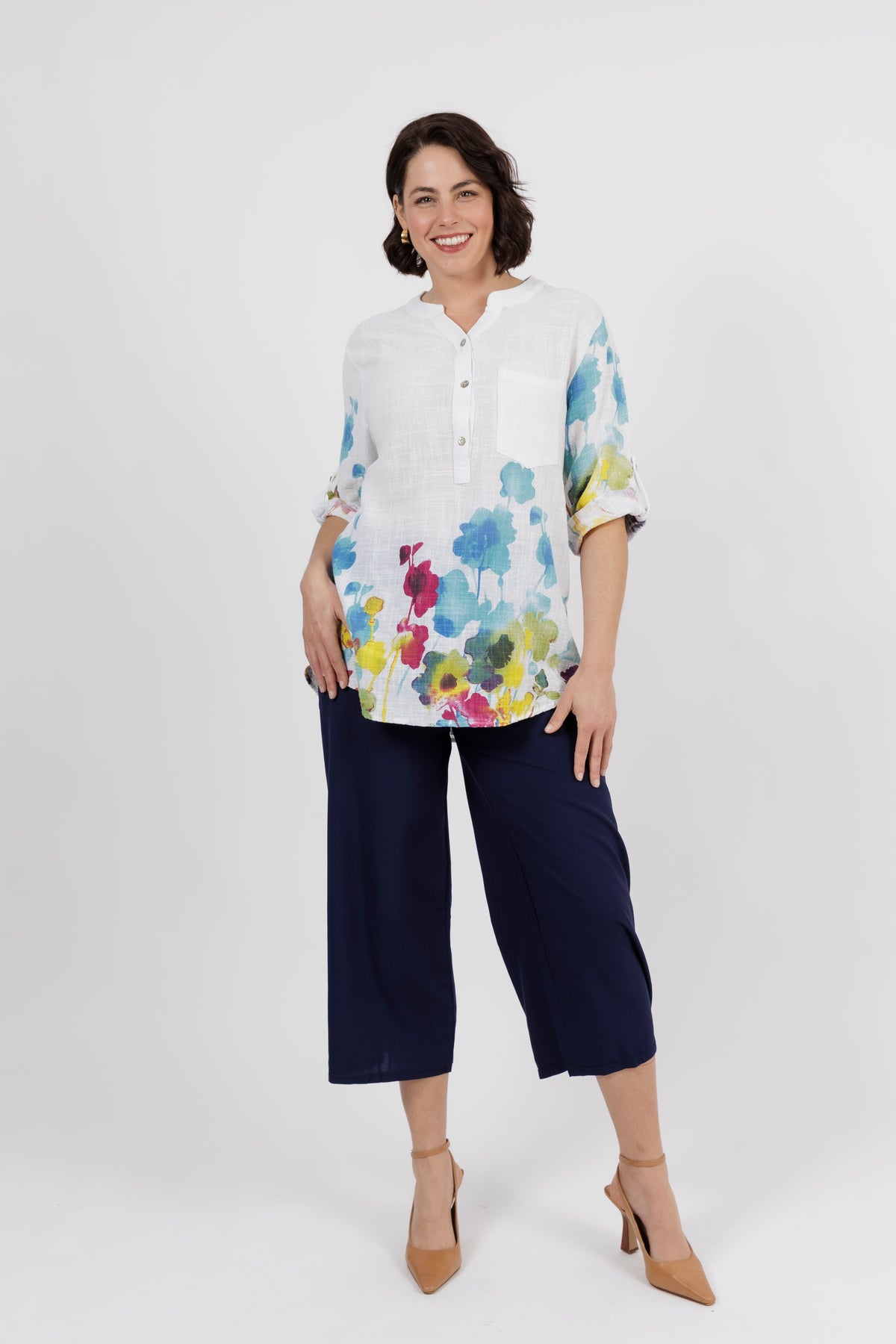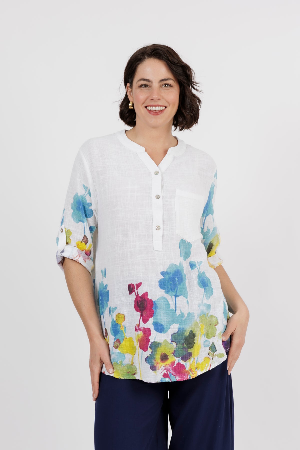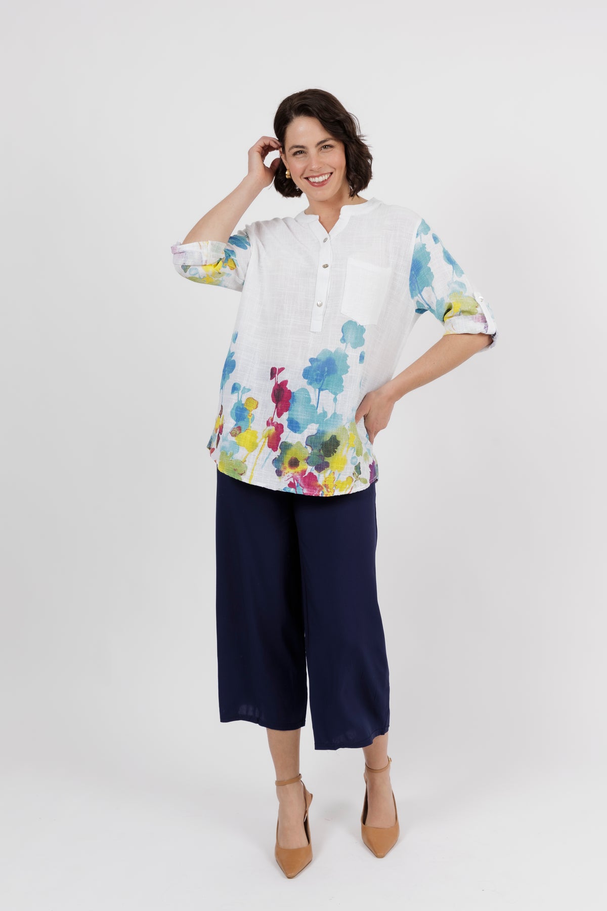 Regular price $89.95 Sale price $55.00Bring a fresh pop of colour to your wardrobe with this relaxed jade-green animal print top. Made in a soft, lightweight fabric, it drapes beautifully while giving you complete comfort for all-day wear. The Henley-style button front adds a casual, everyday touch, while the rolled tab sleeves let you switch between long and 3/4 styling with ease.