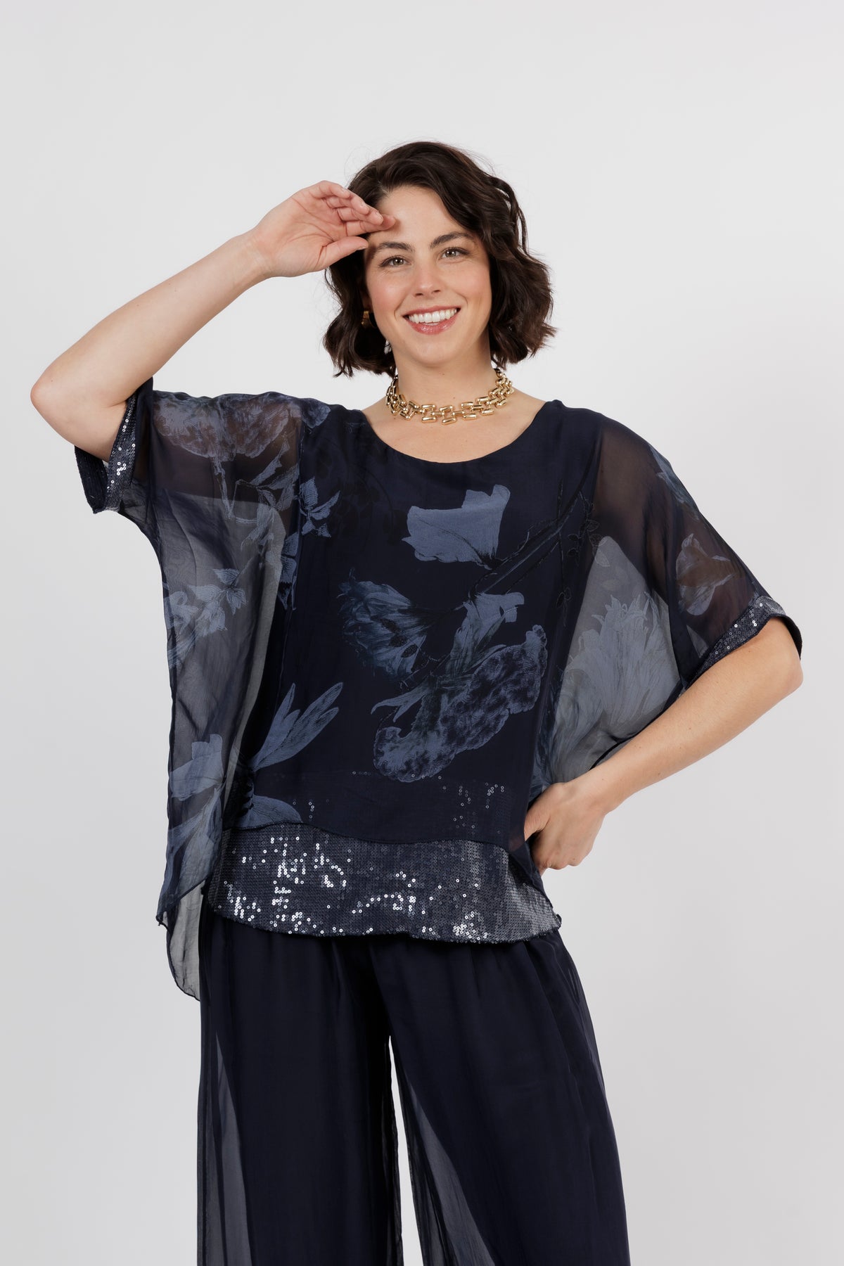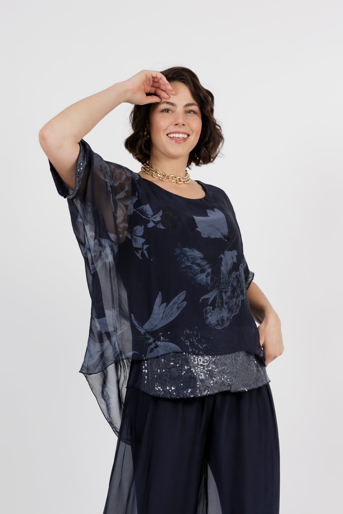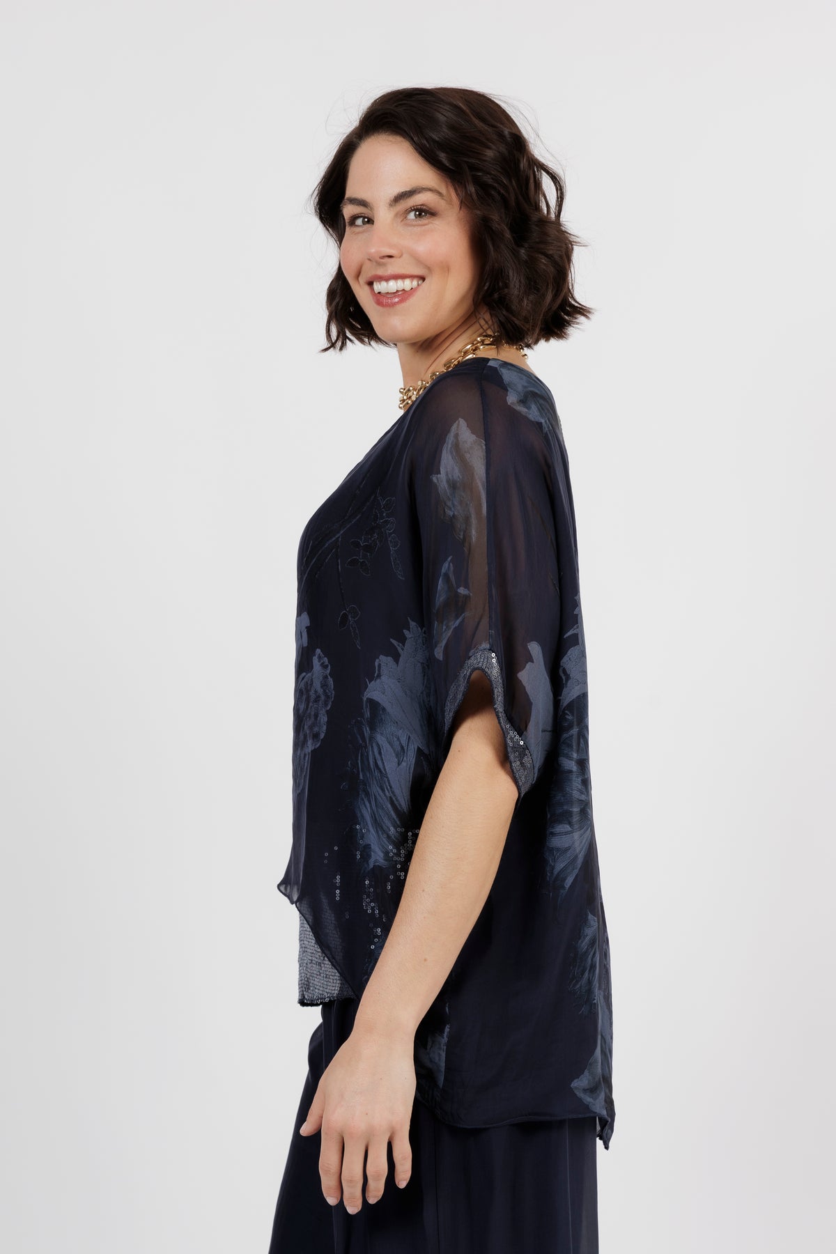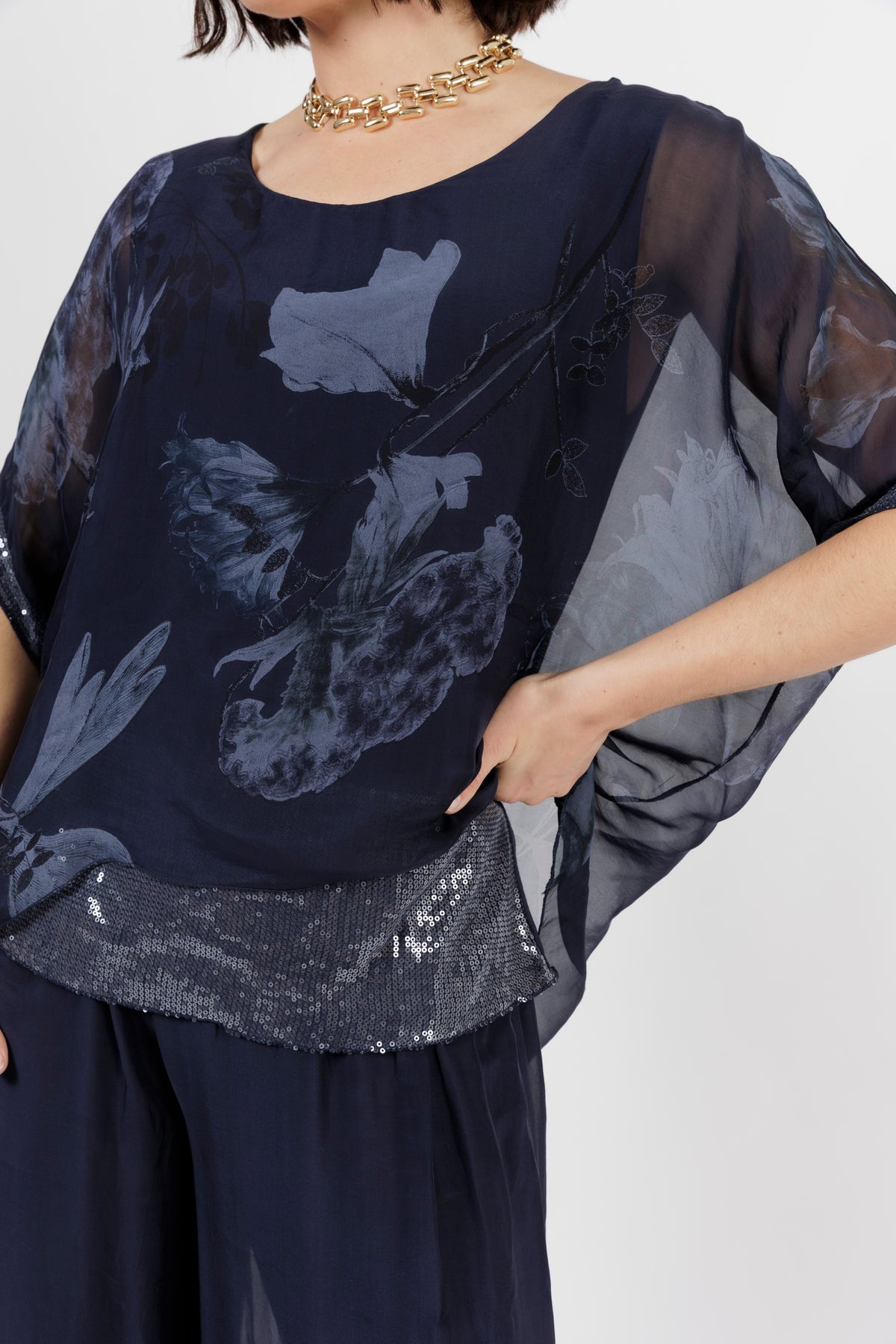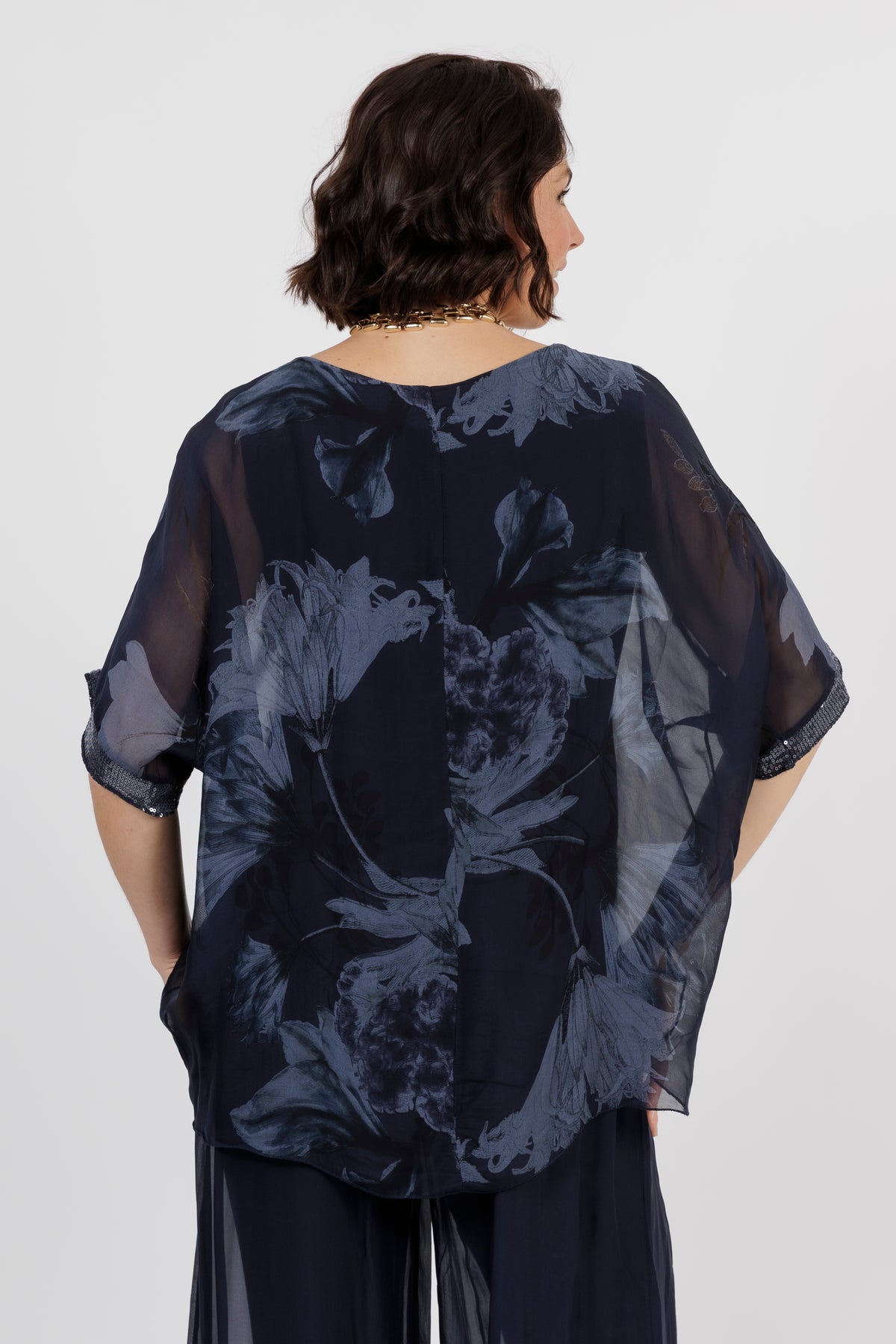 ARIADNA Navy Pink Floral Silk Overlay Top