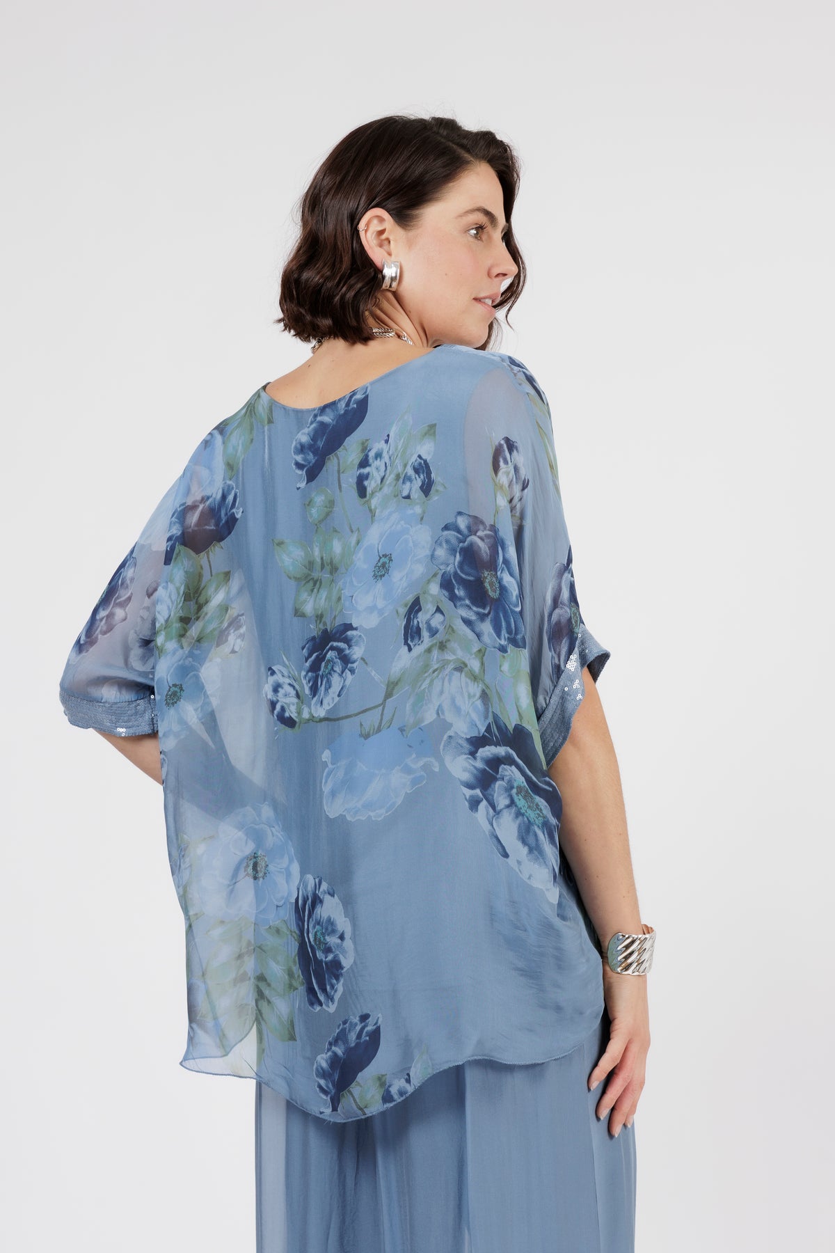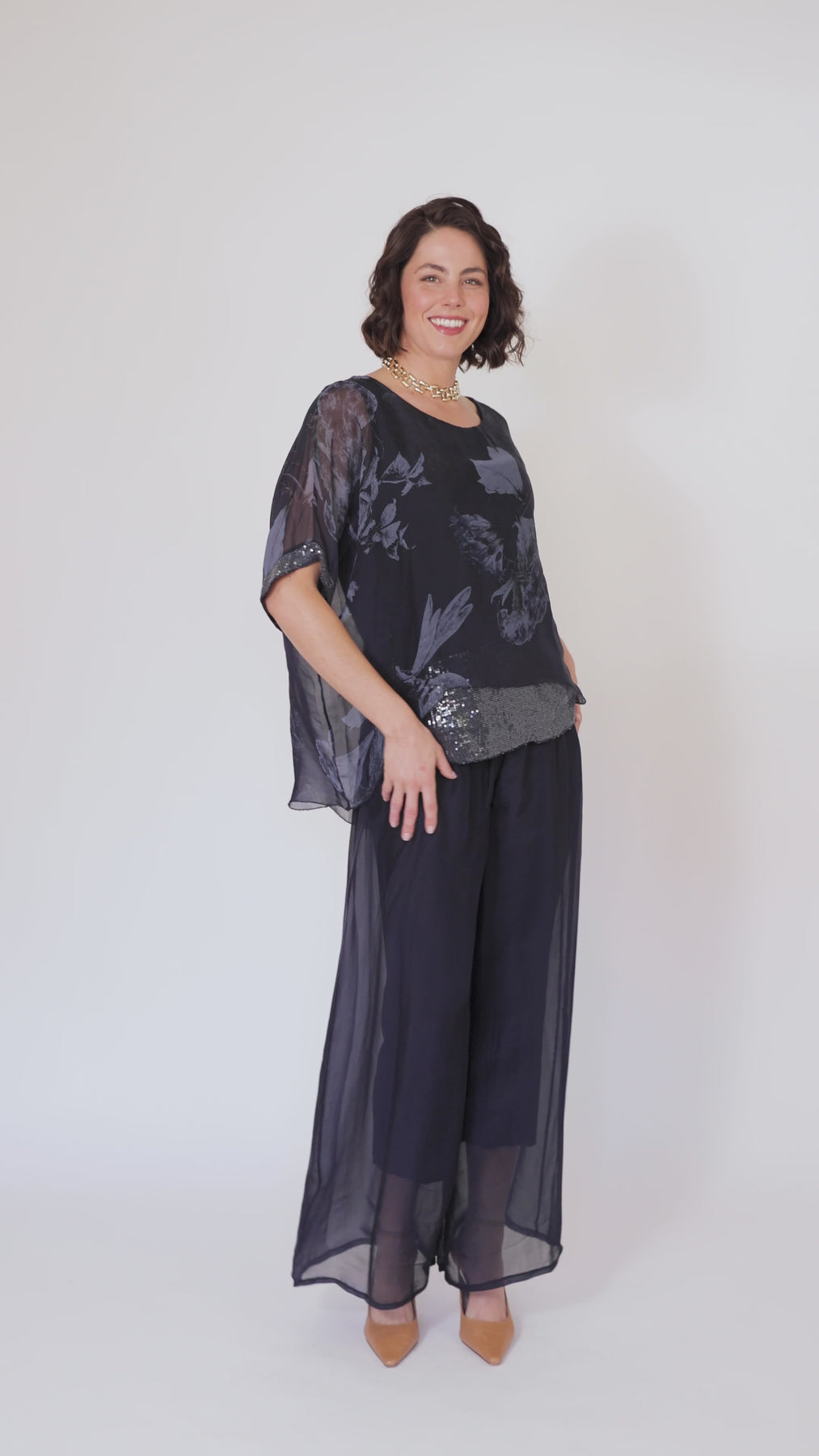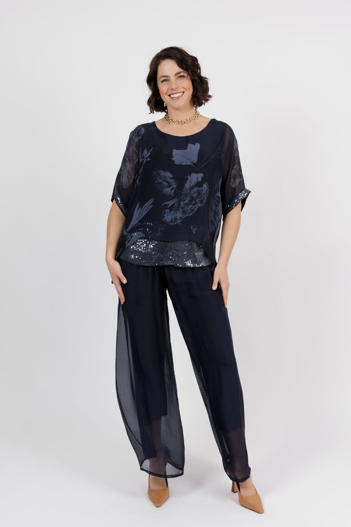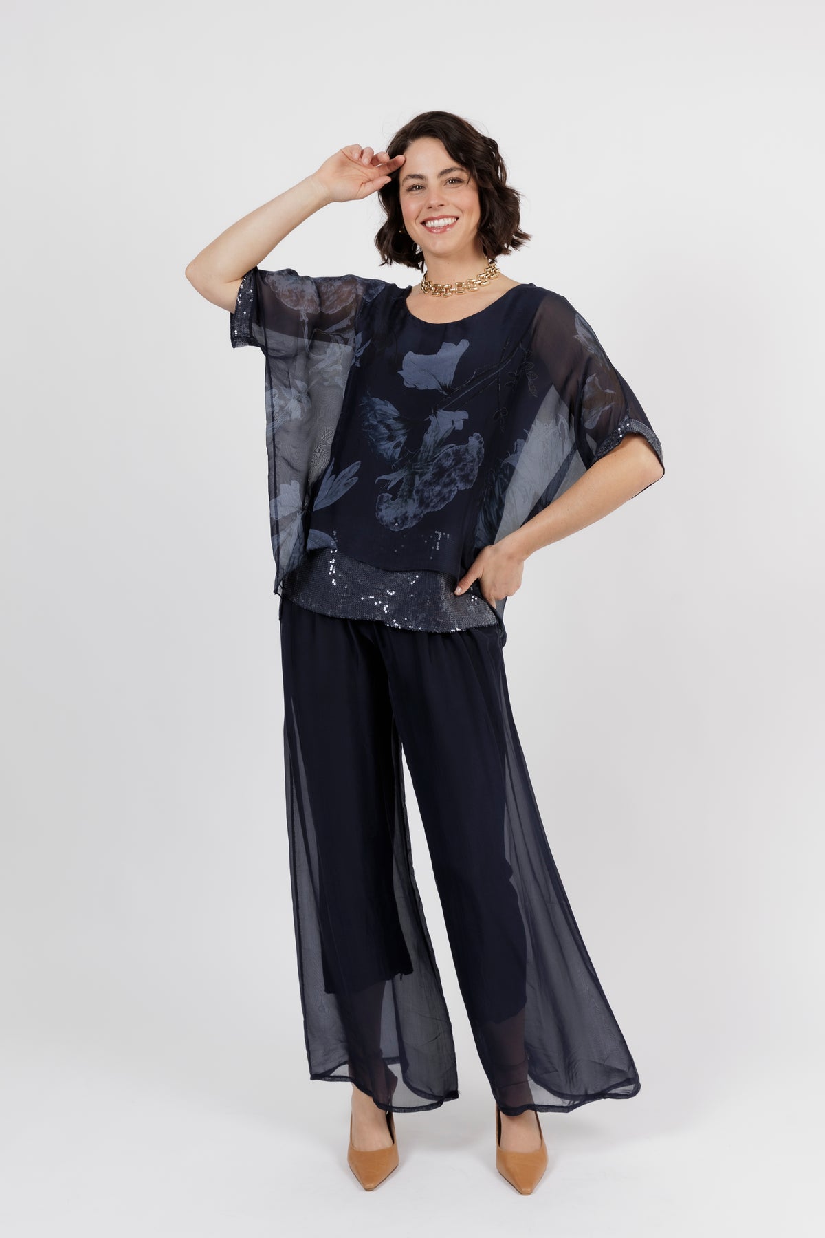 ARIADNA Navy Pink Floral Silk Overlay Top