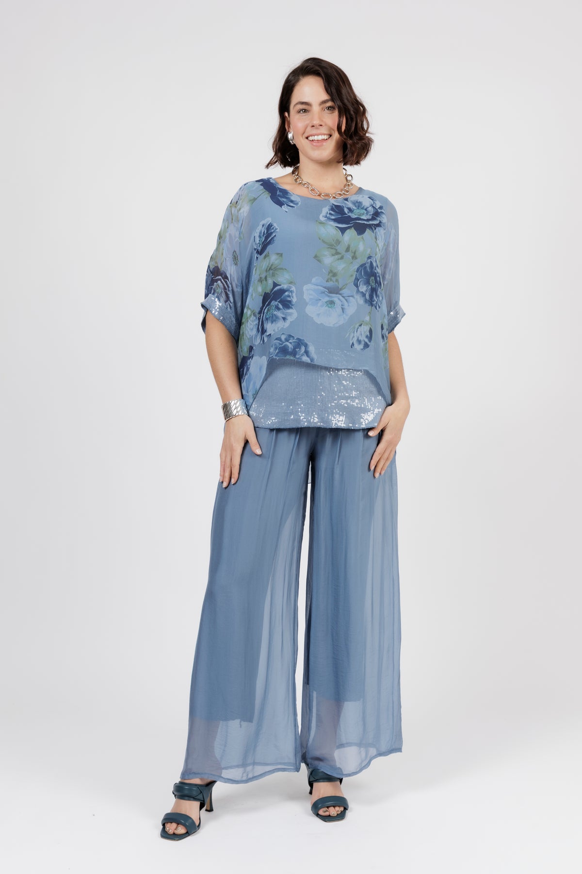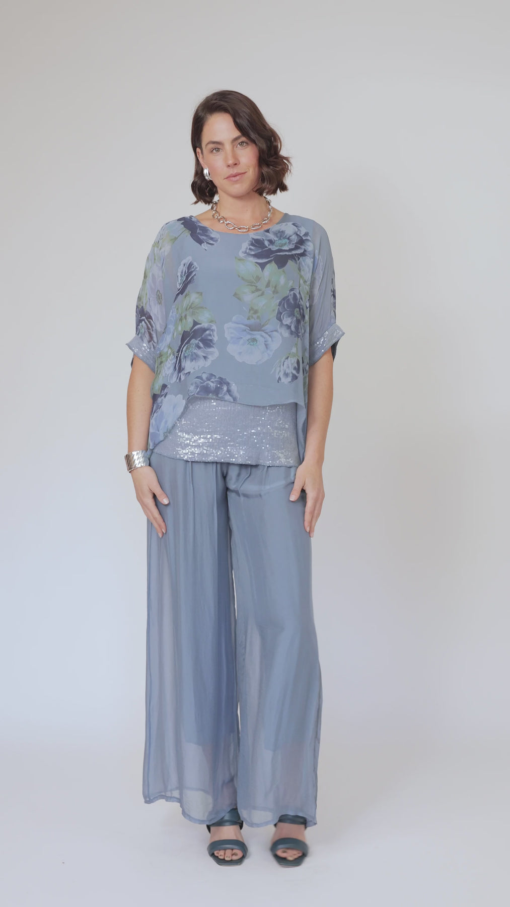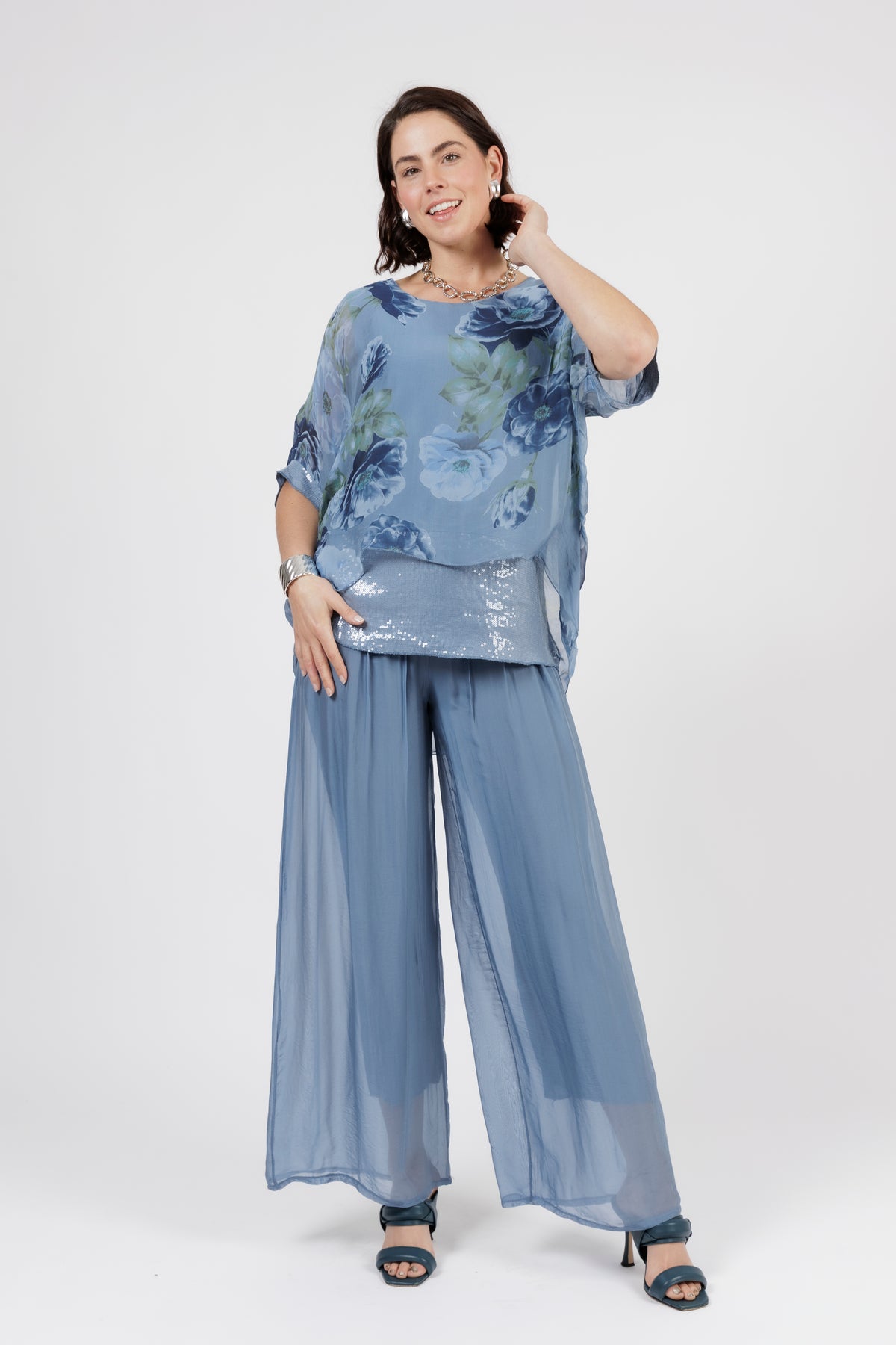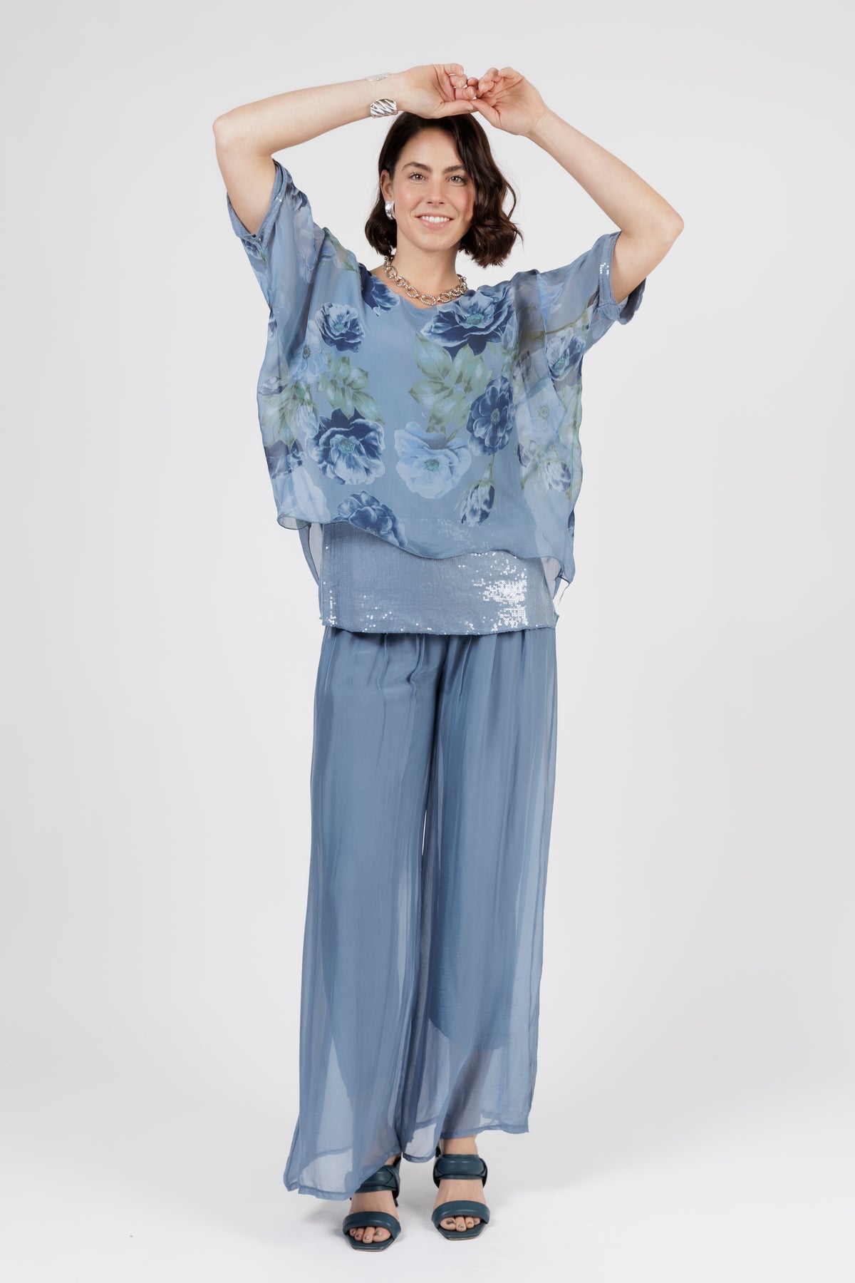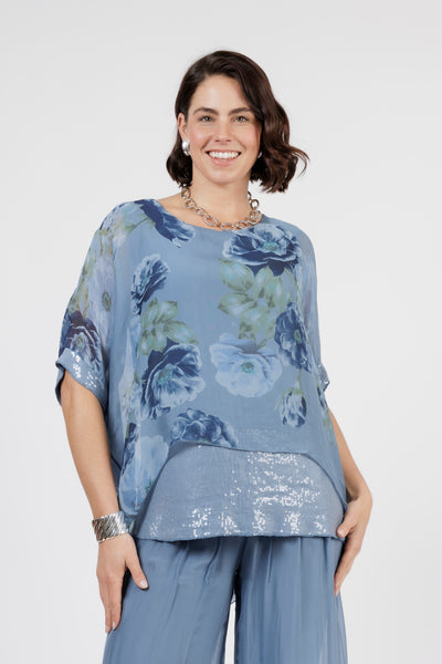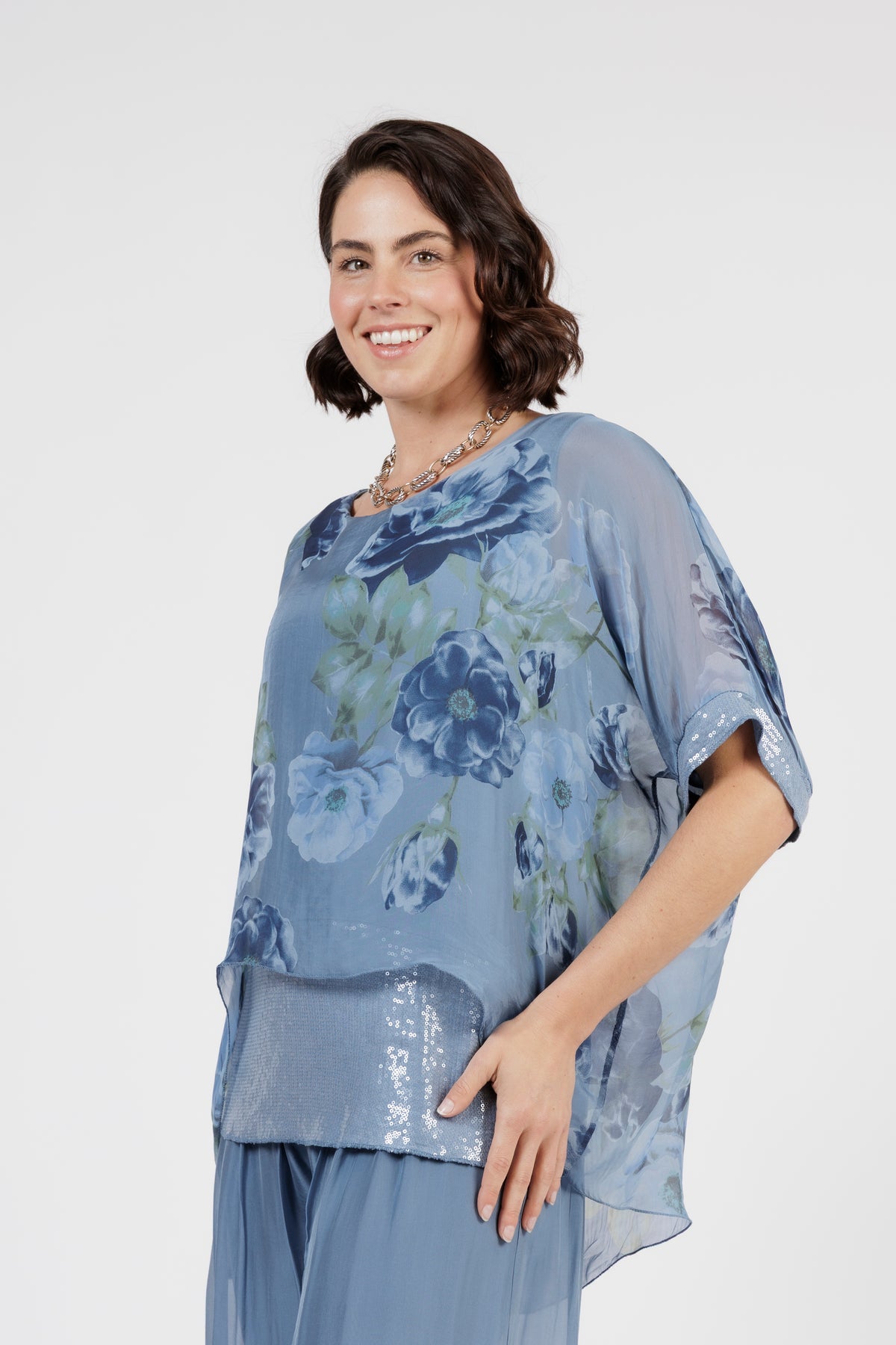 ARIADNA Navy Pink Floral Silk Overlay Top