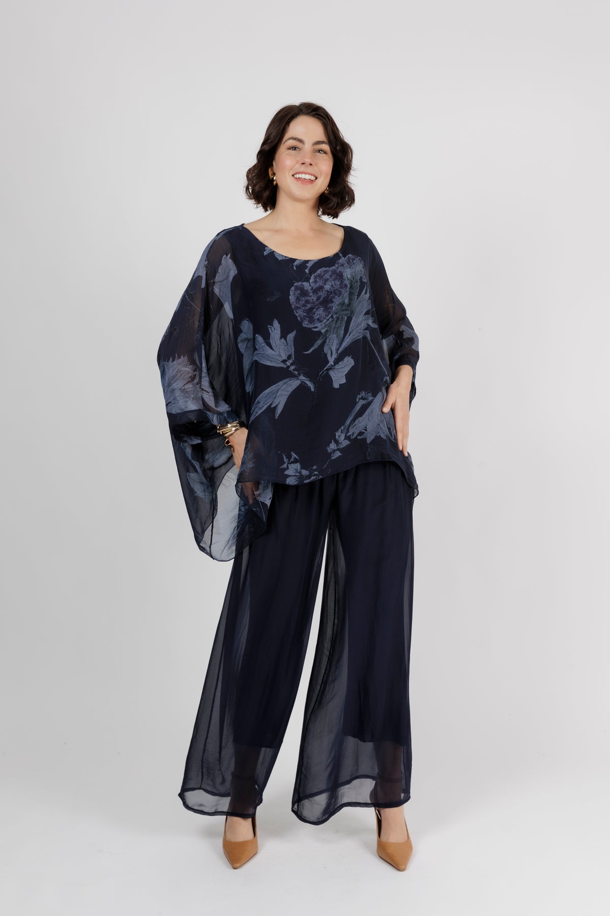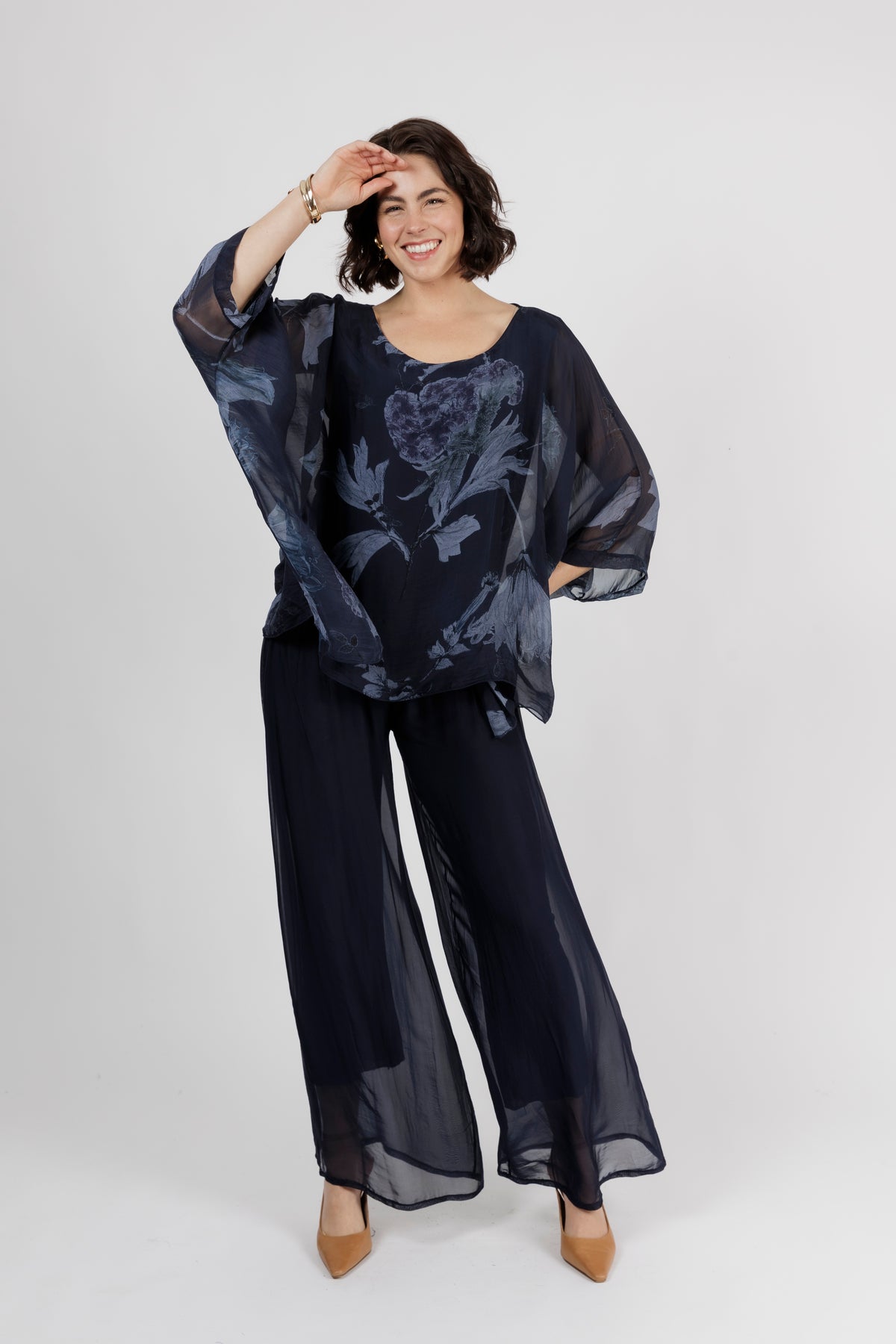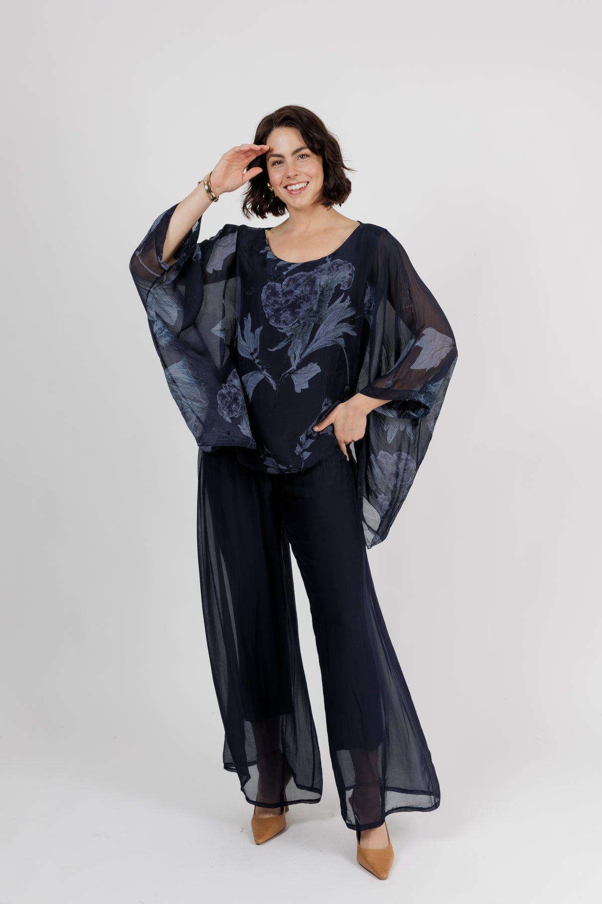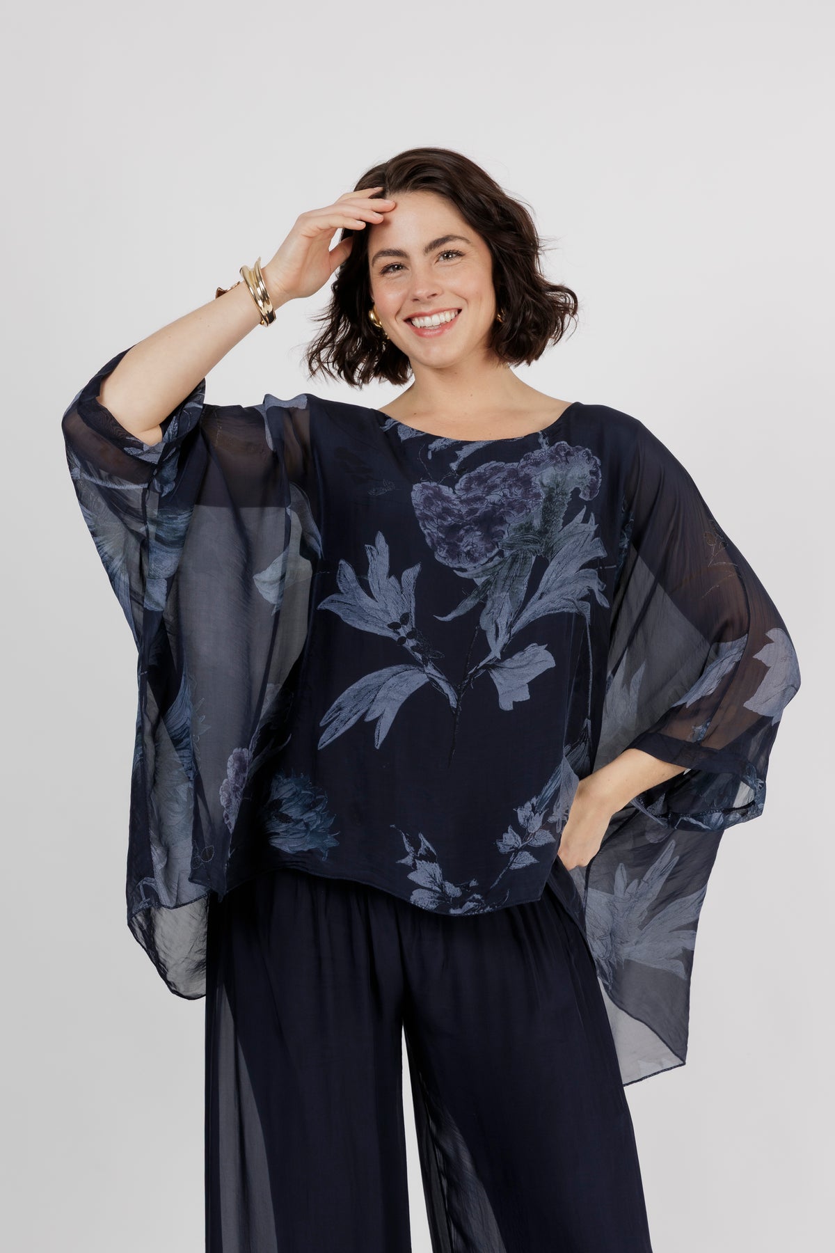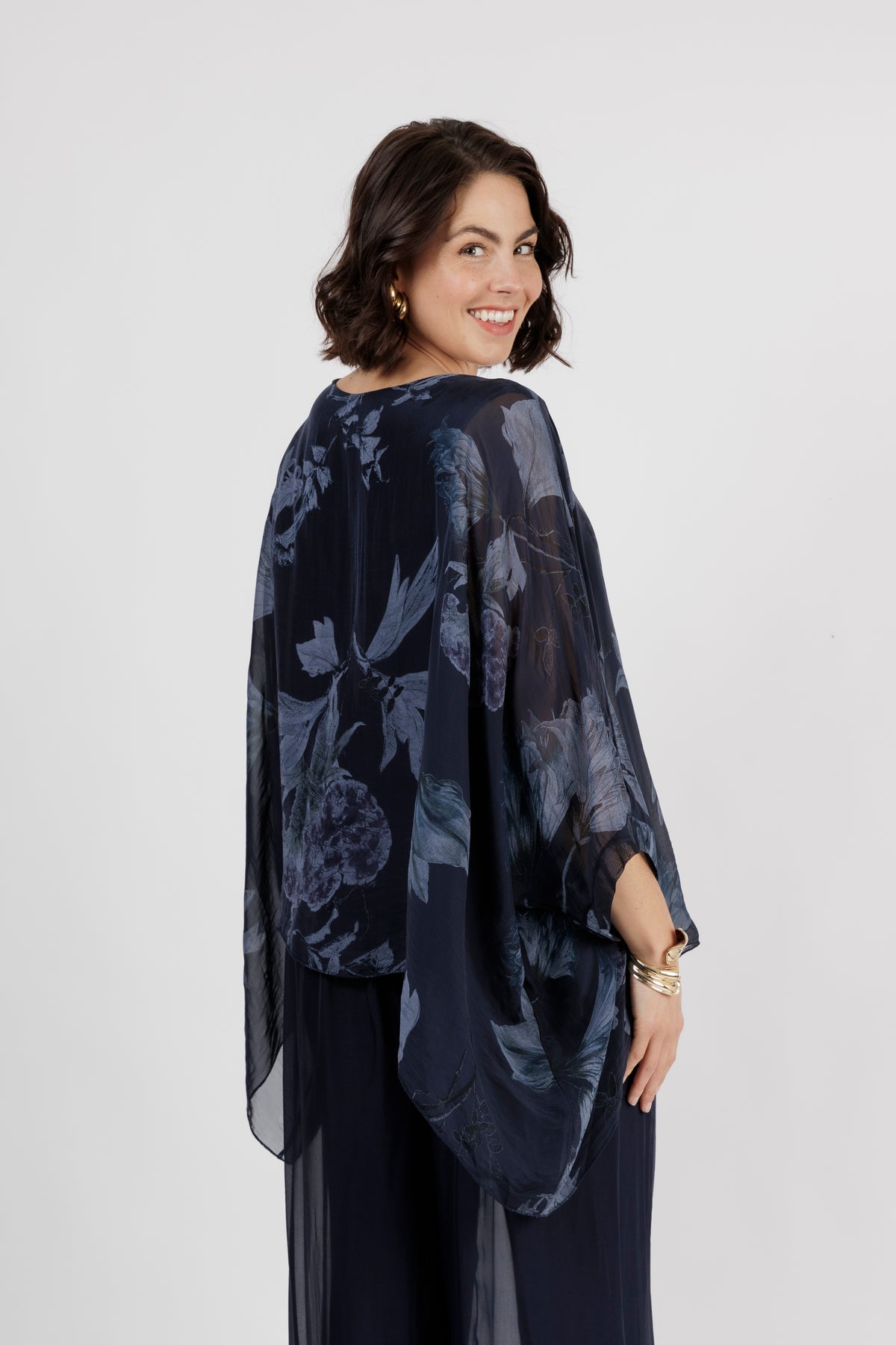 ELMIRA Navy Floral Silk Overlay Top