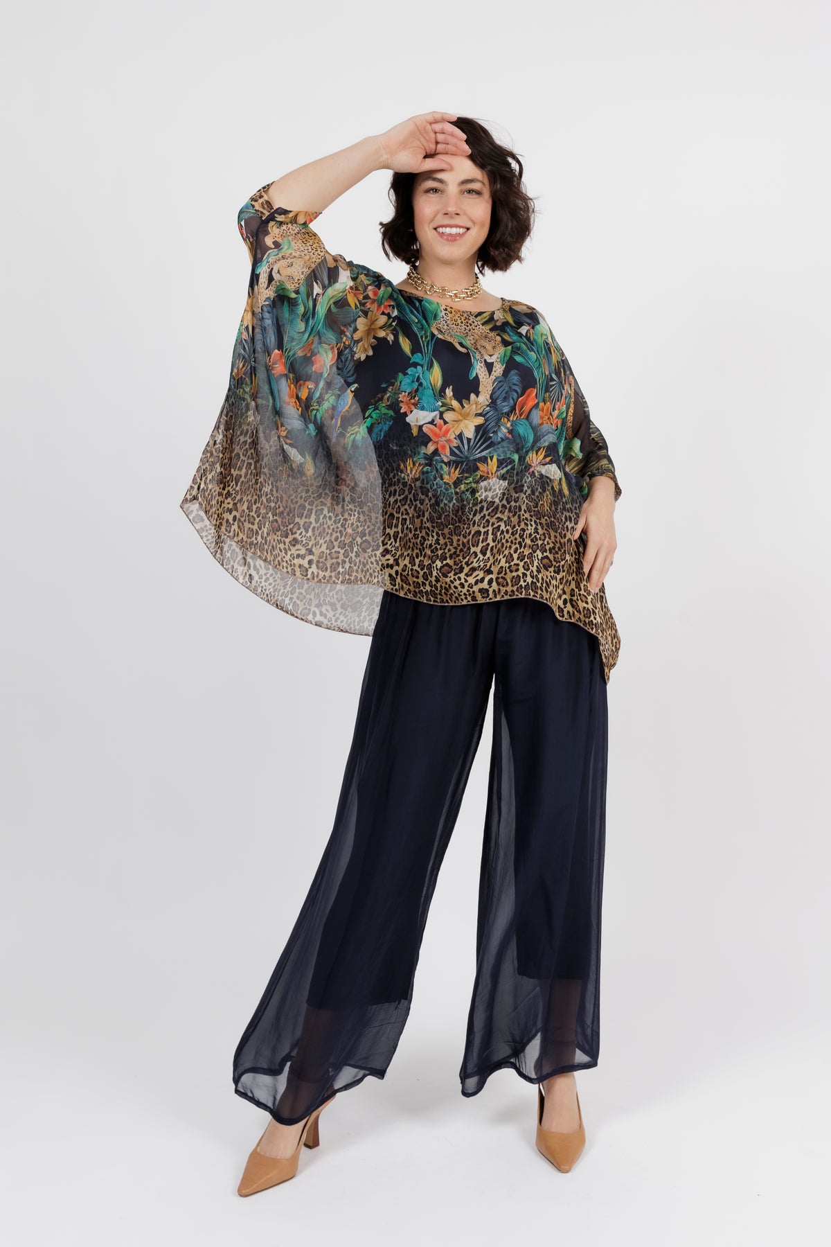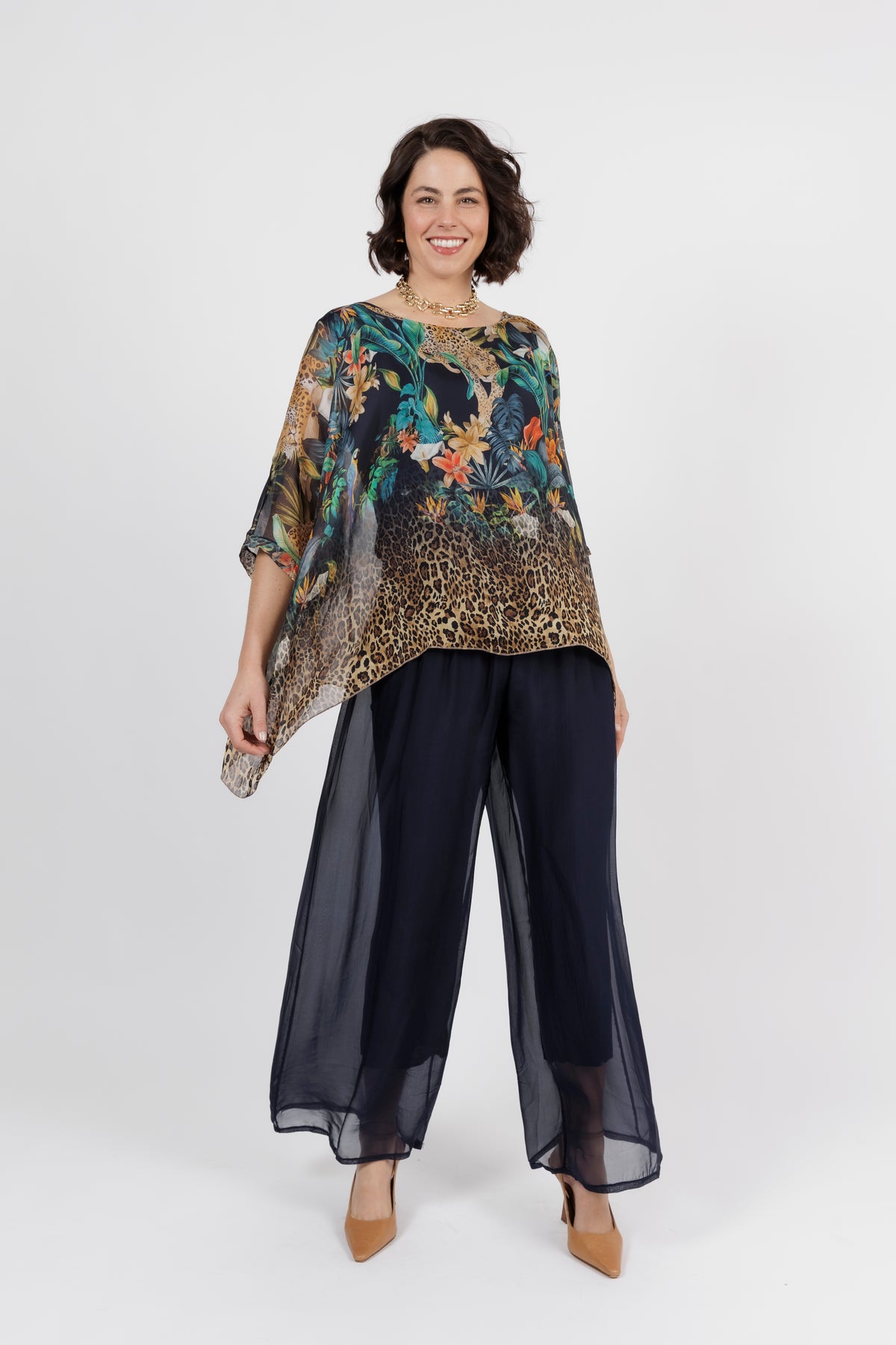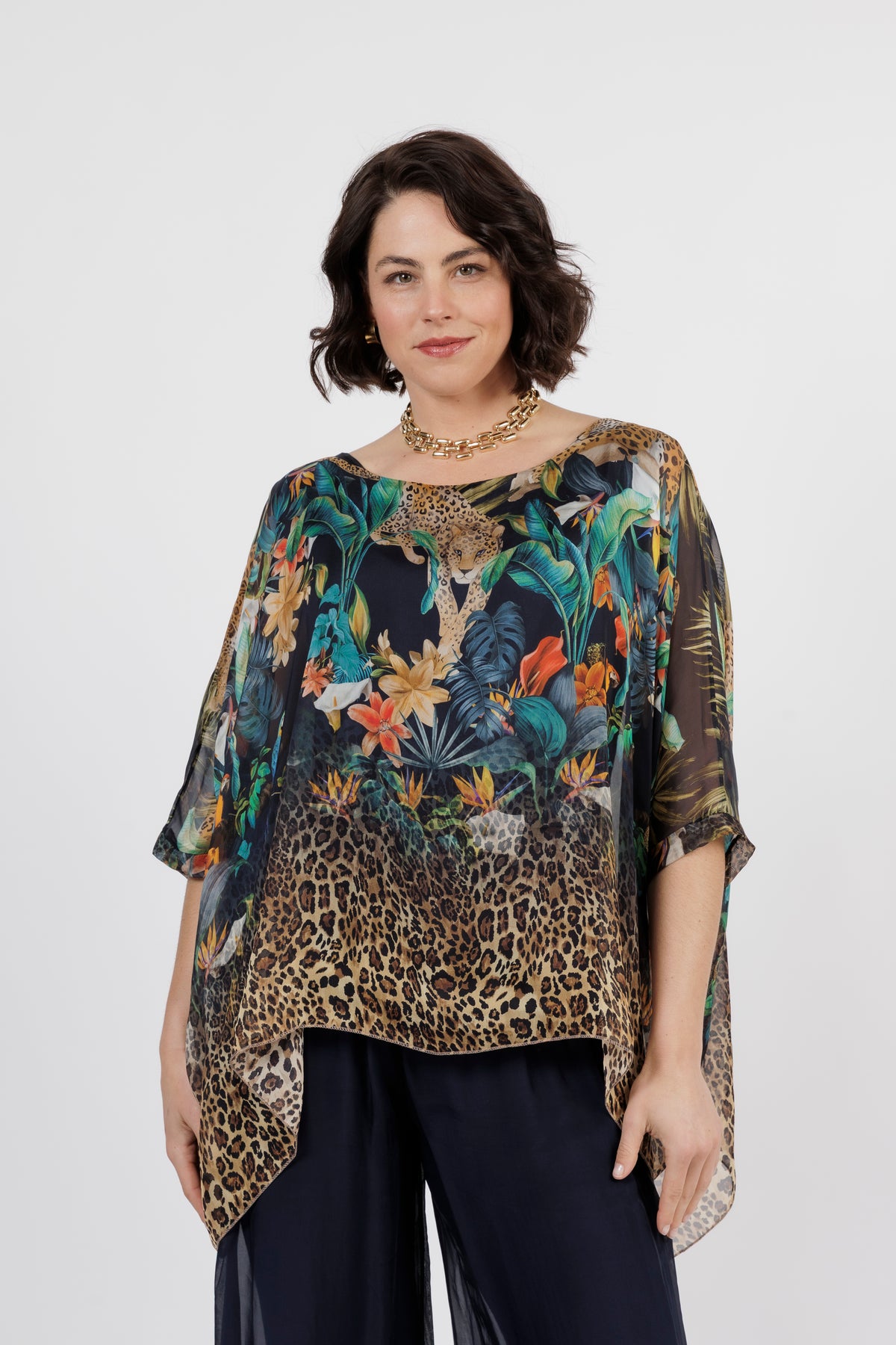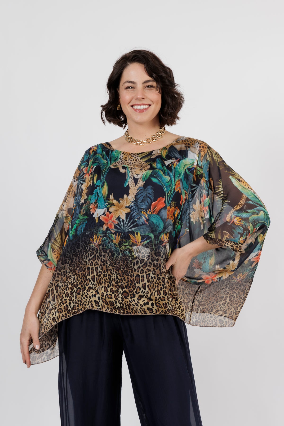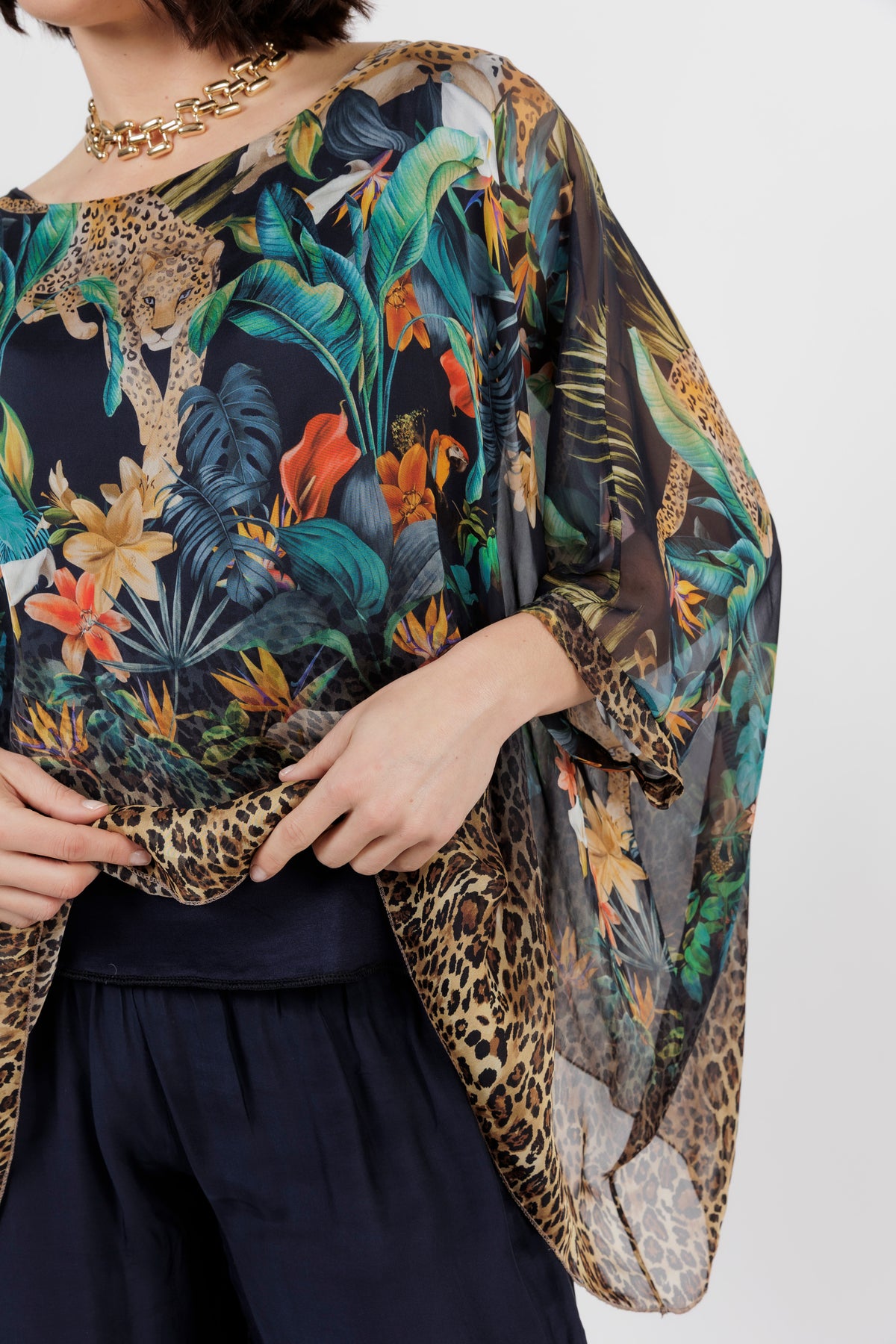 CONTESSA Navy Animal Silk Overlay Top