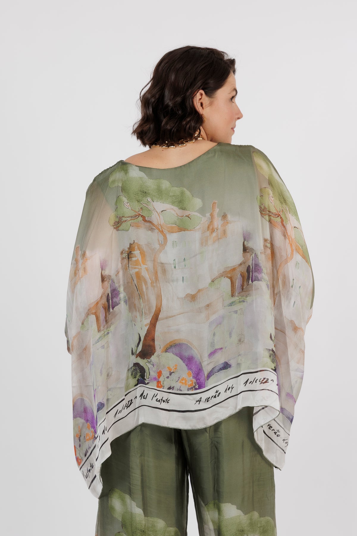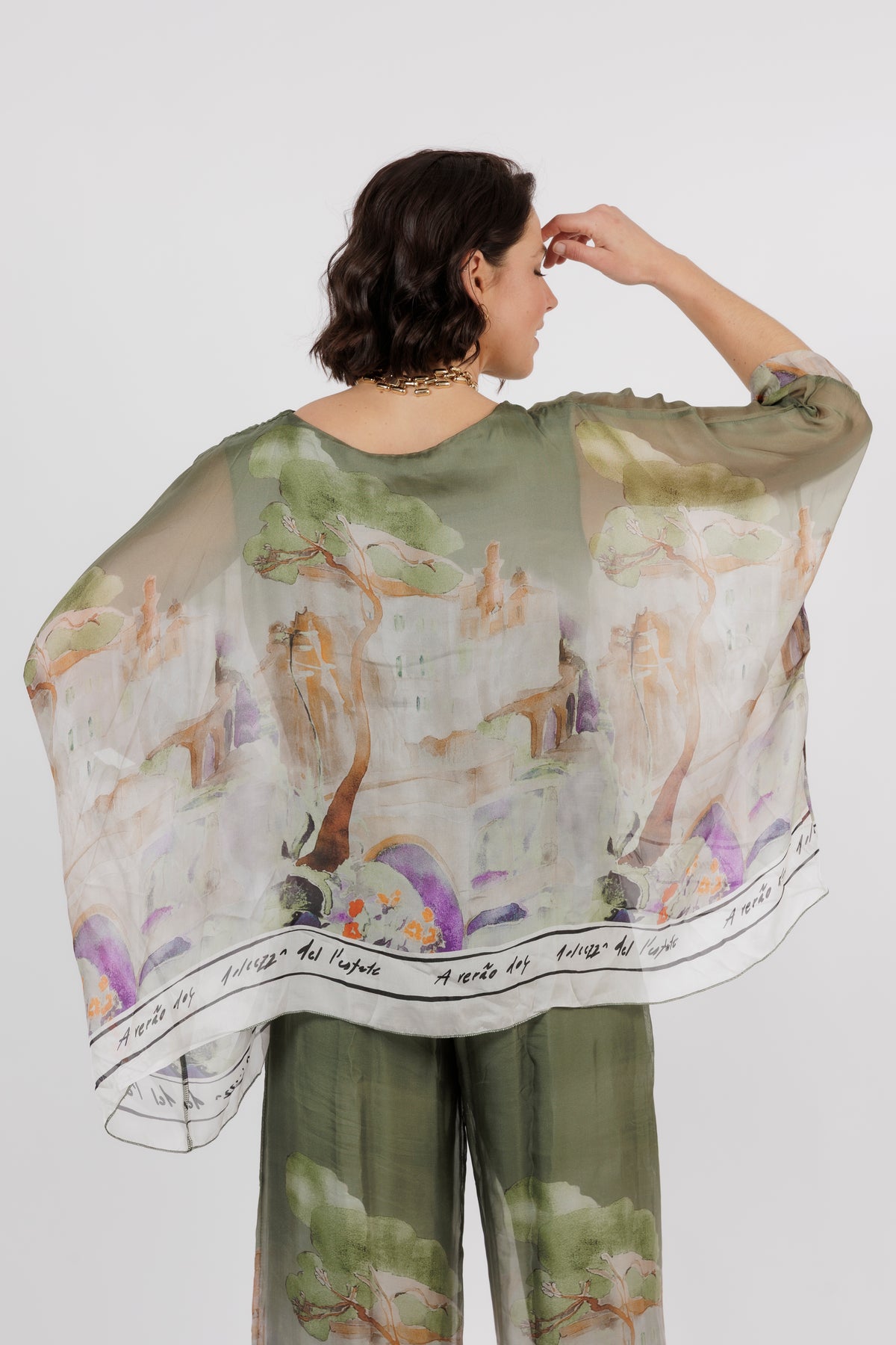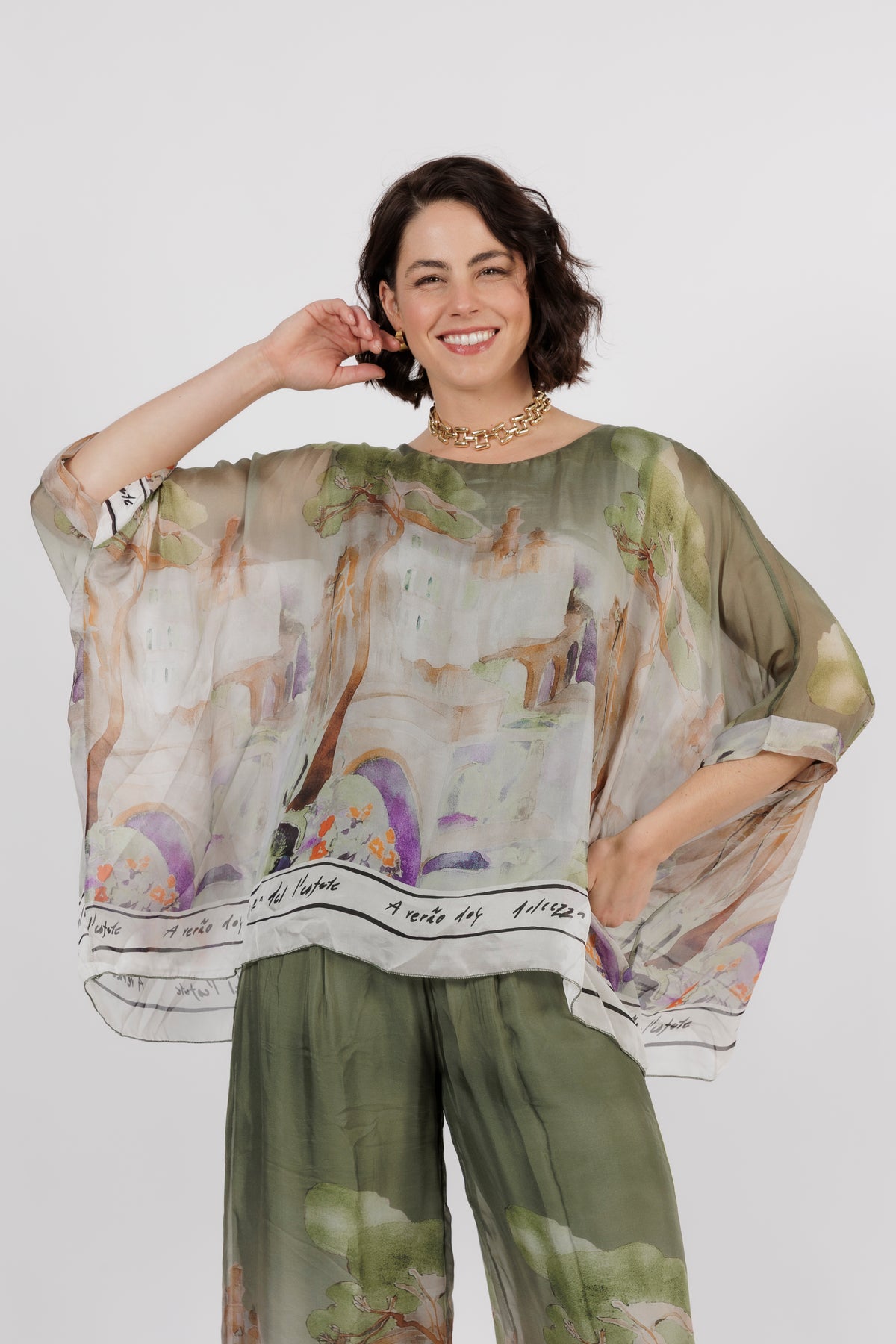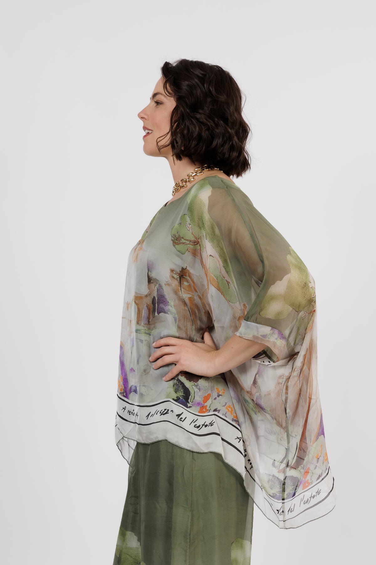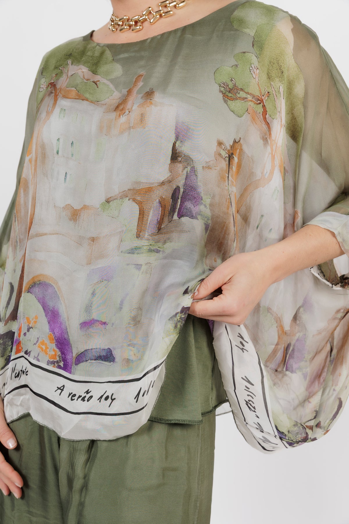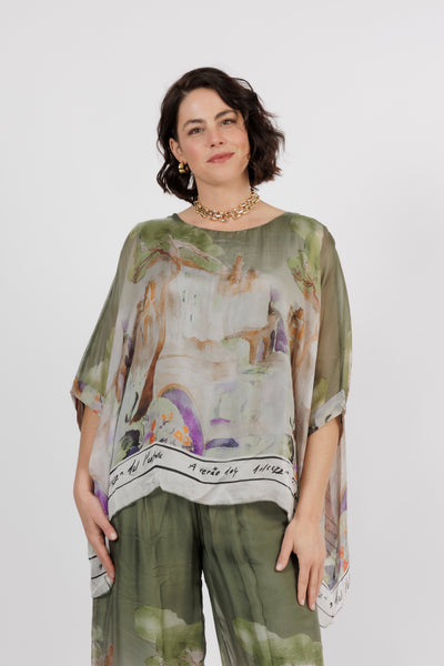 CONTESSA Khaki Abstract Silk Overlay Top