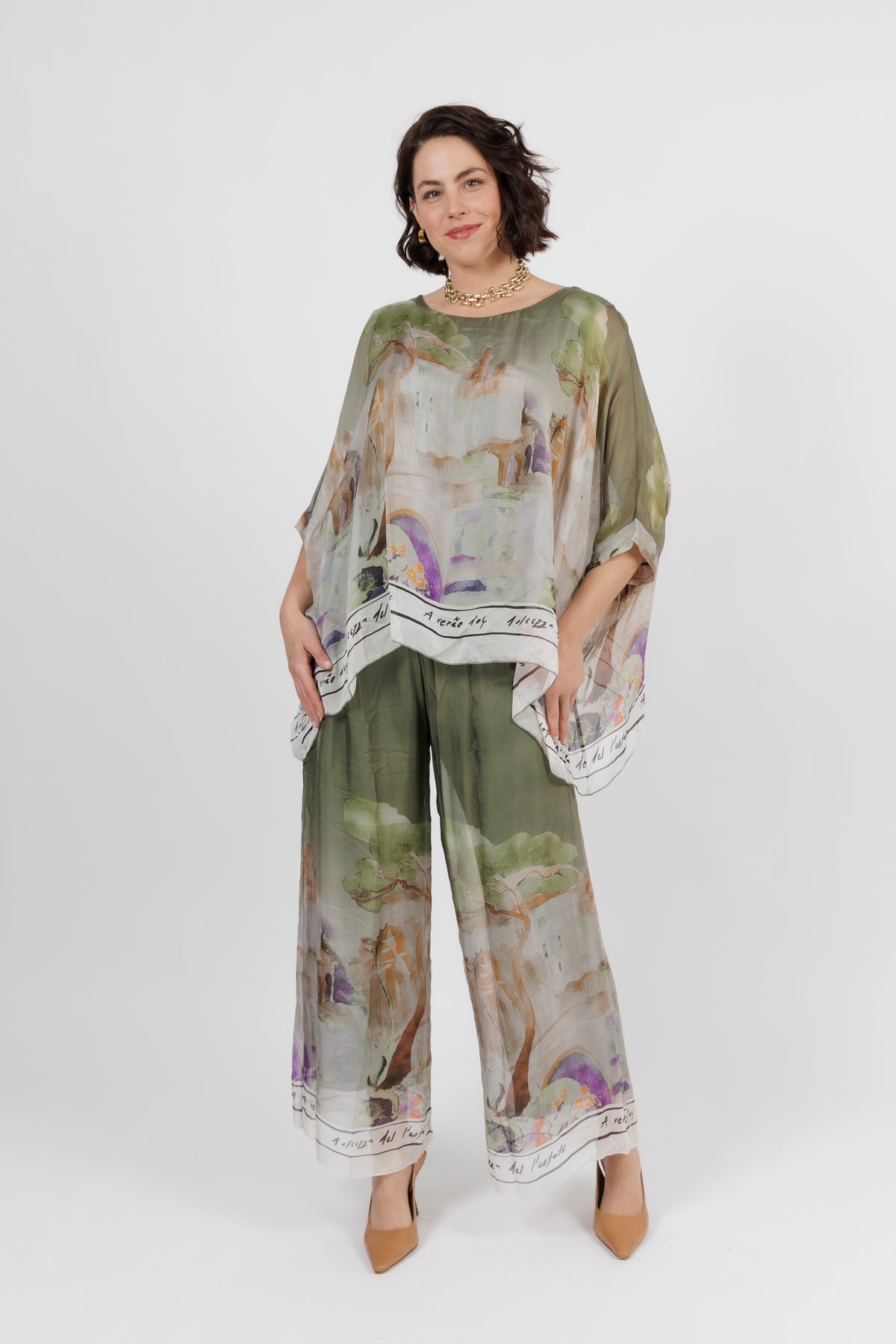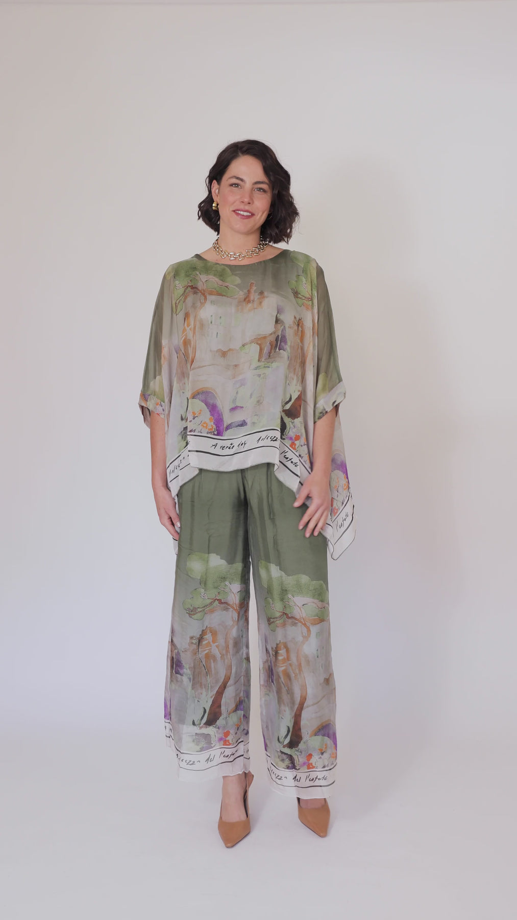 DONYA Khaki Abstract Silk Wide Leg Pants