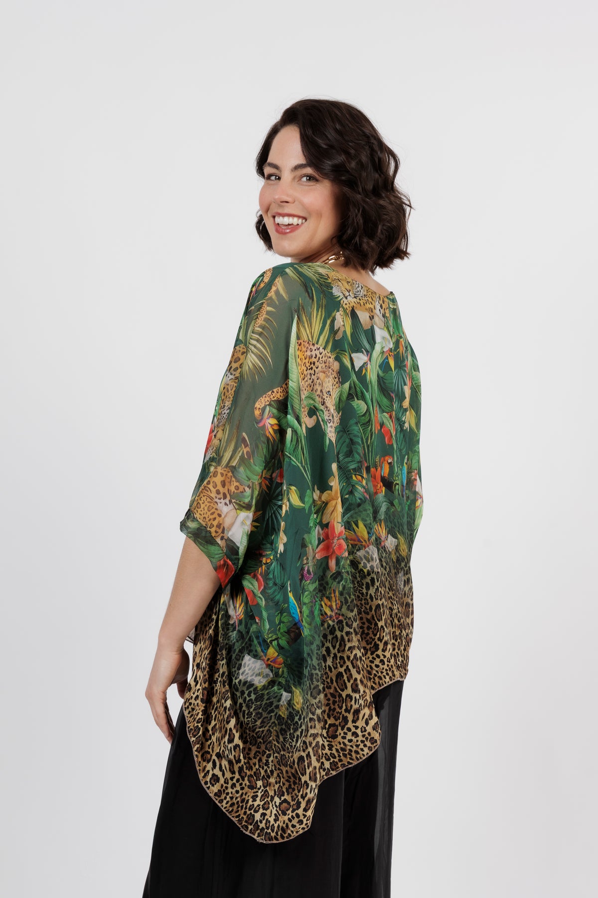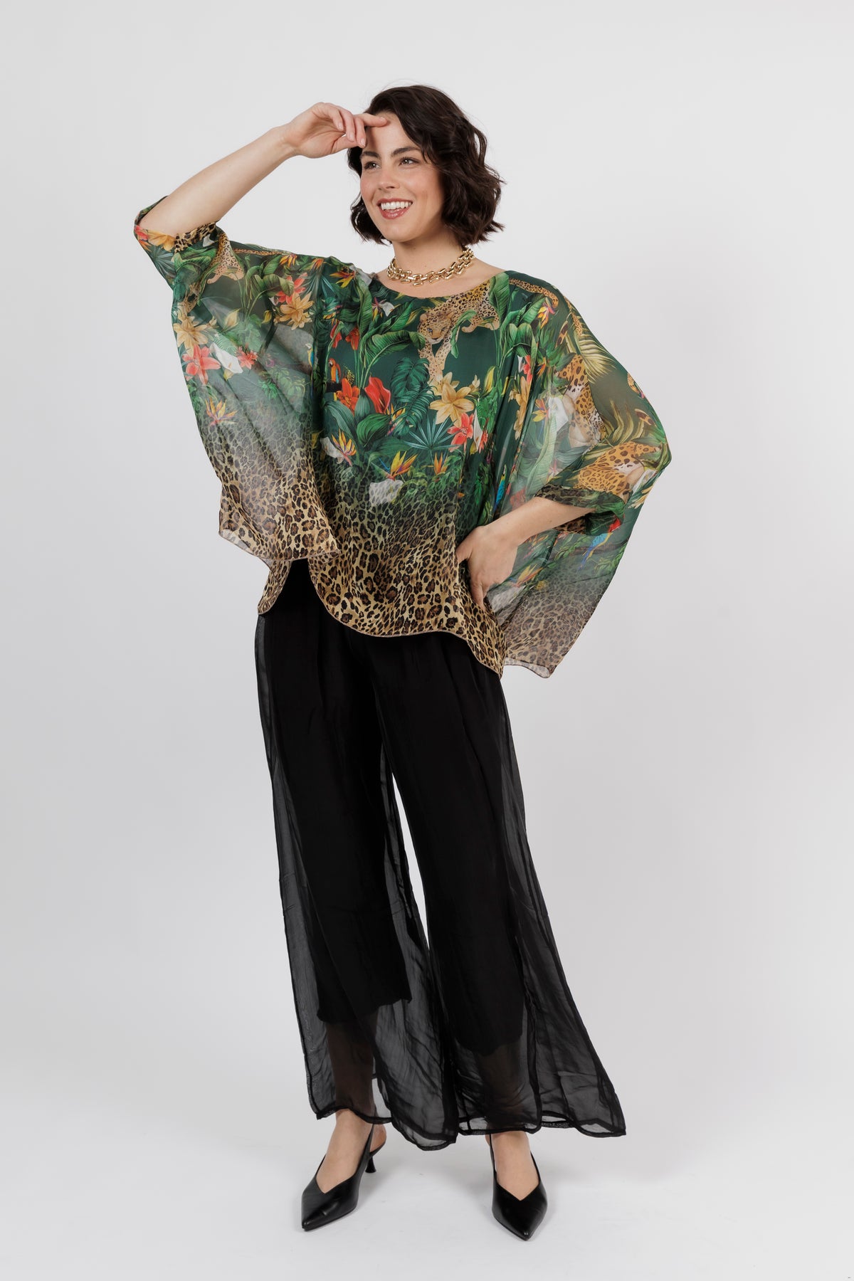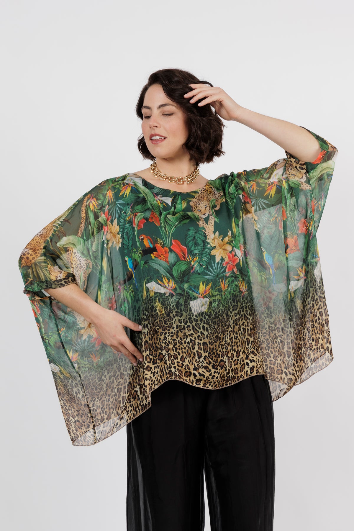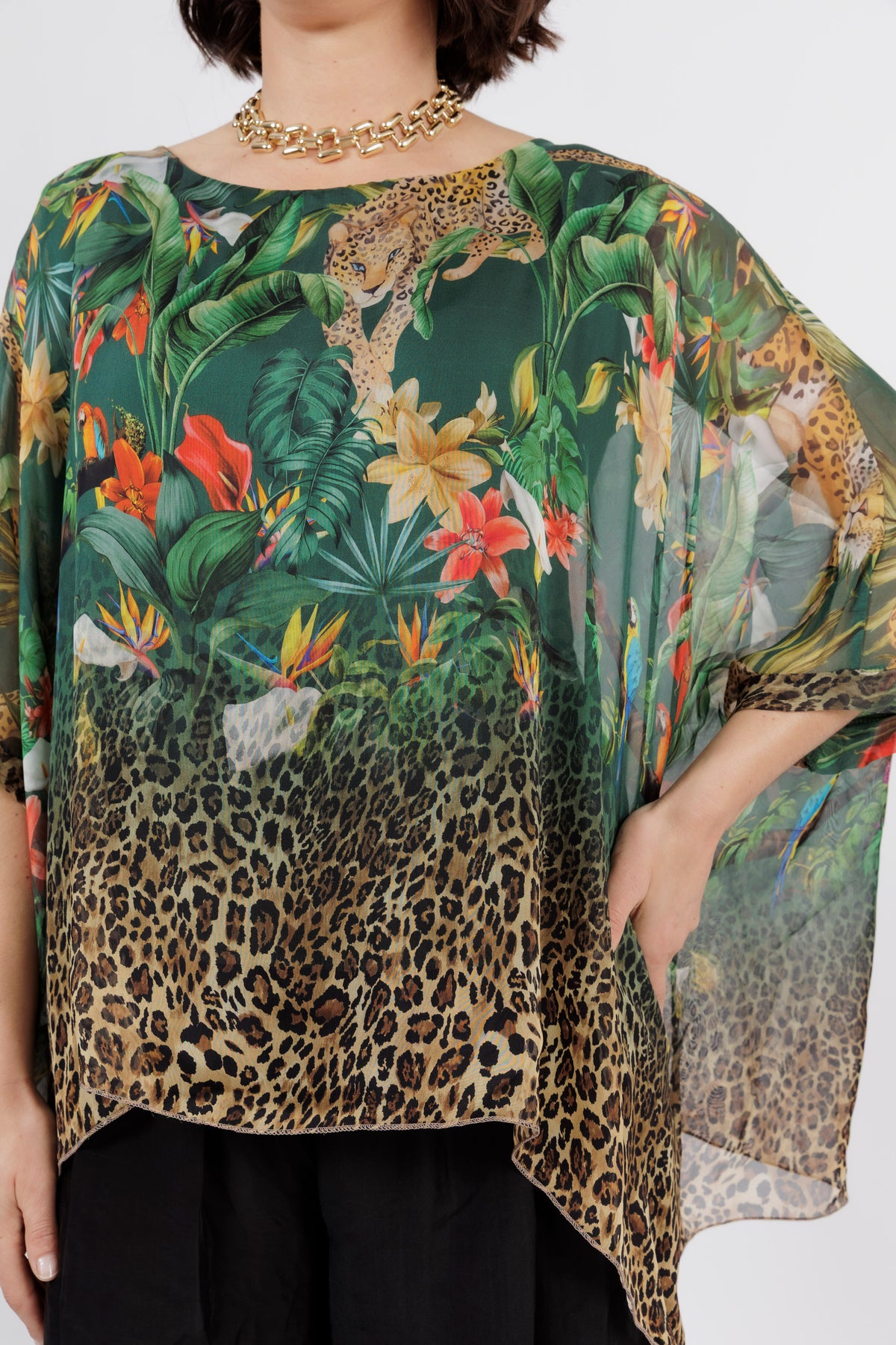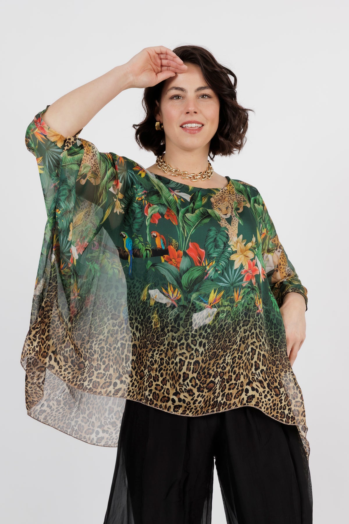 CONTESSA Green Animal Silk Overlay Top