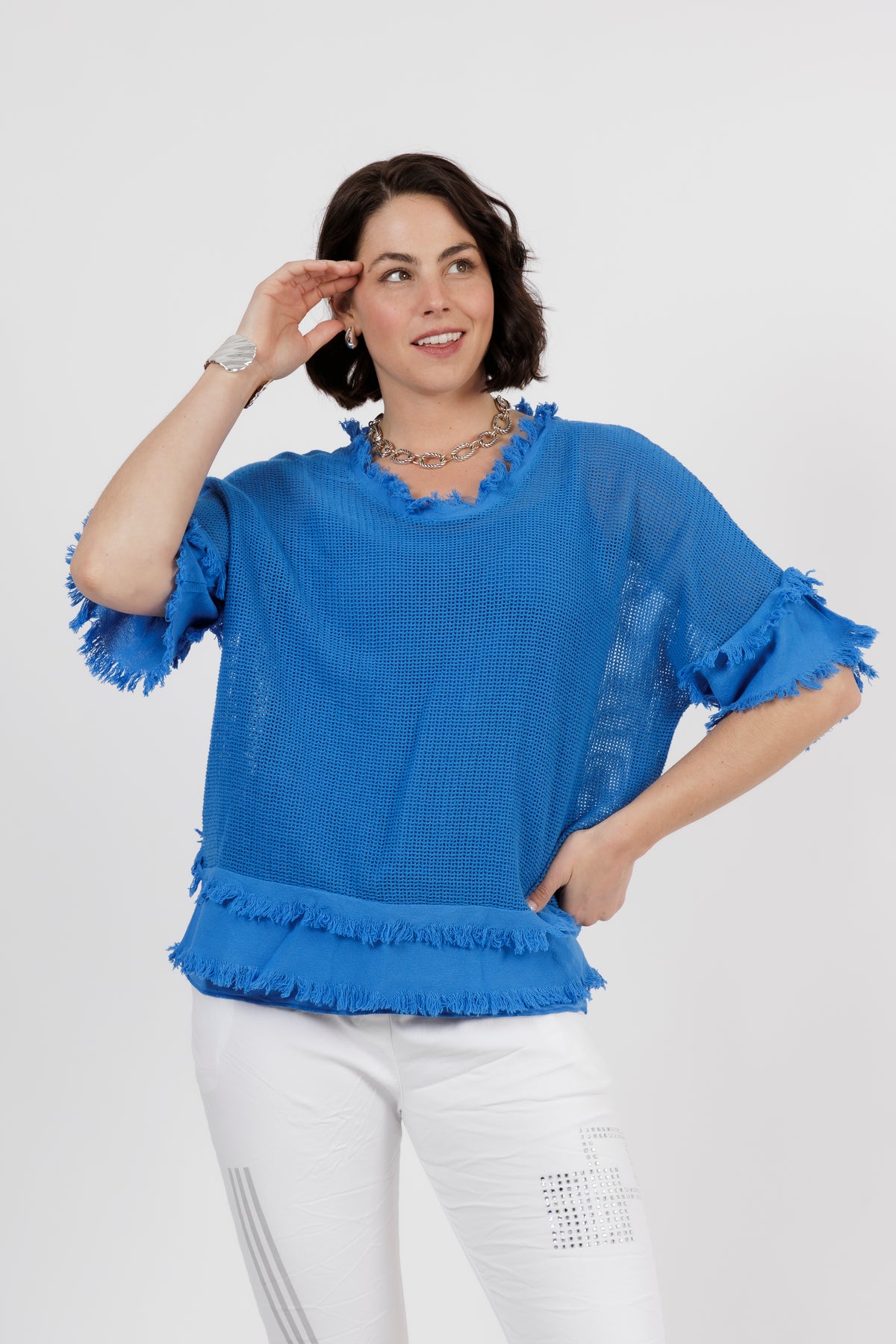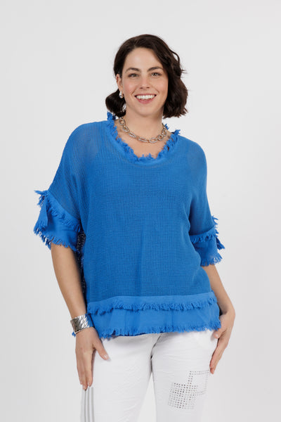 - Relaxed-fitting short sleeve top is defined by a semi-sheer net cotton fabric