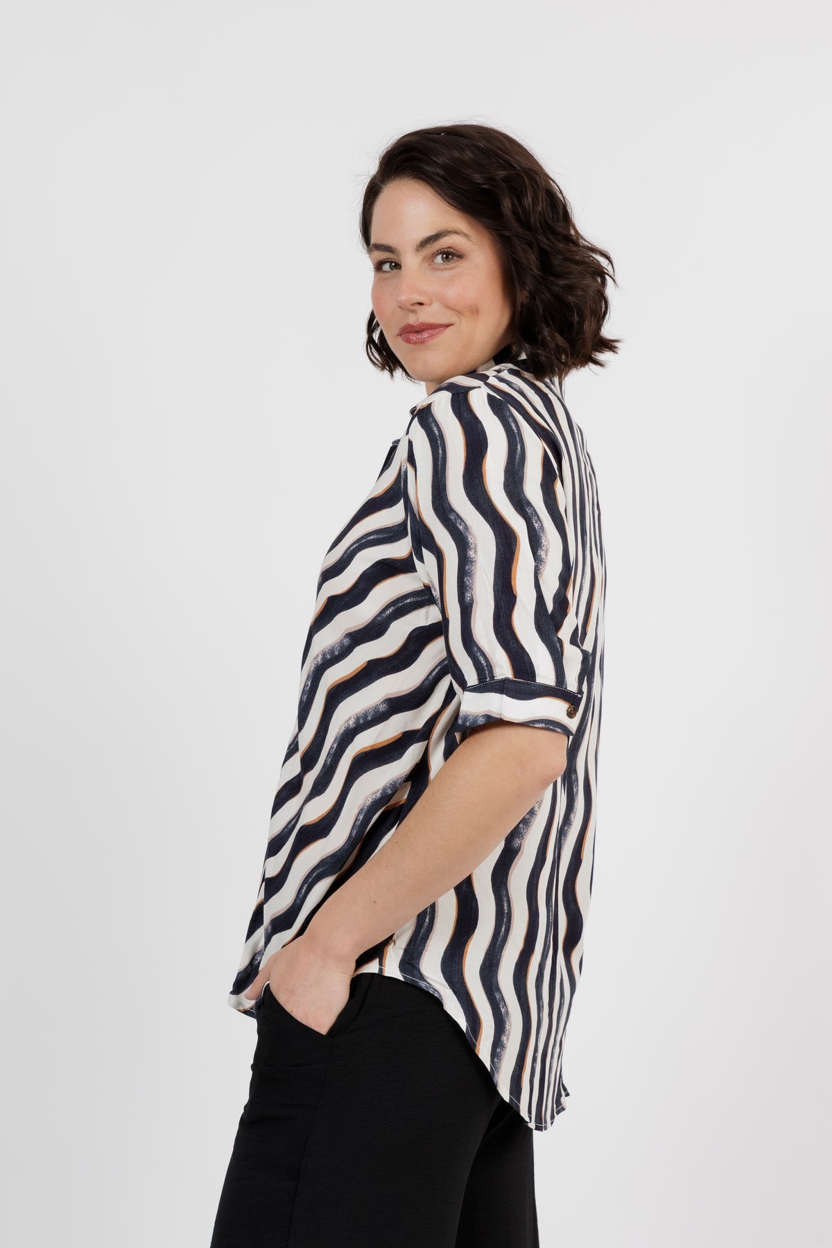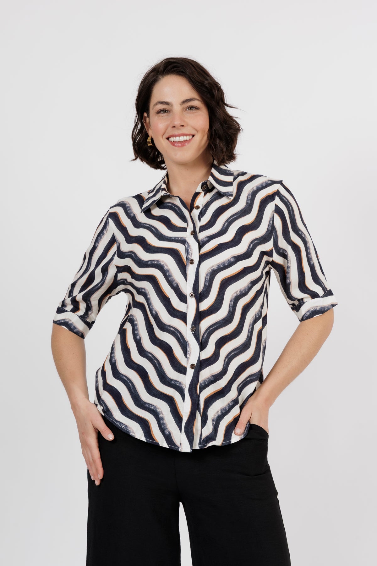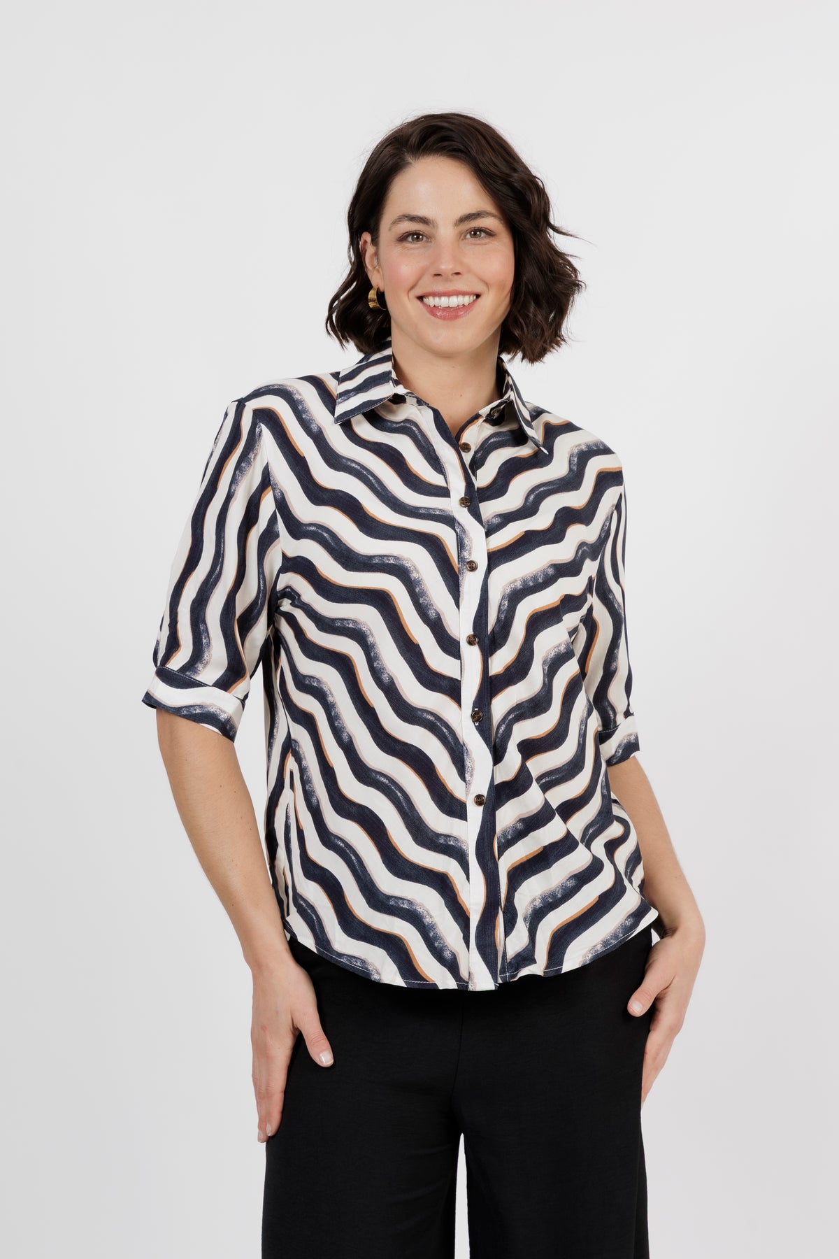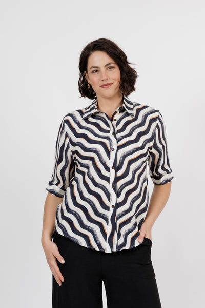 The Amalfi is the newest member of beautiful shirt range. This button through shirt is just beautiful, now is a delicate new multi colour art print. Combining black, white and taupe. Cut from lightweight fabric with, it has the look of resort wear, lending itself to both casual and smarter styling.