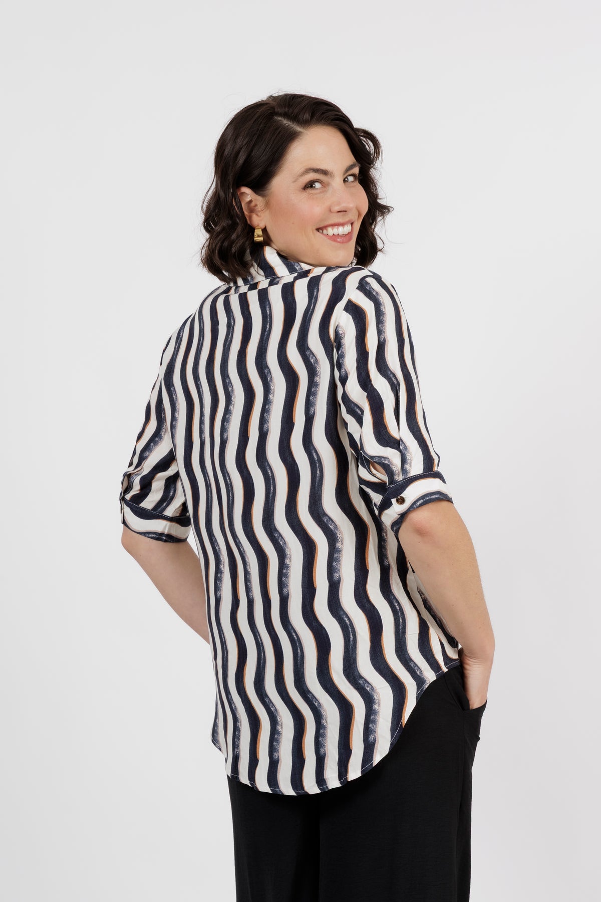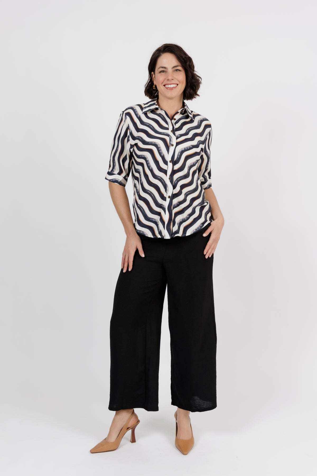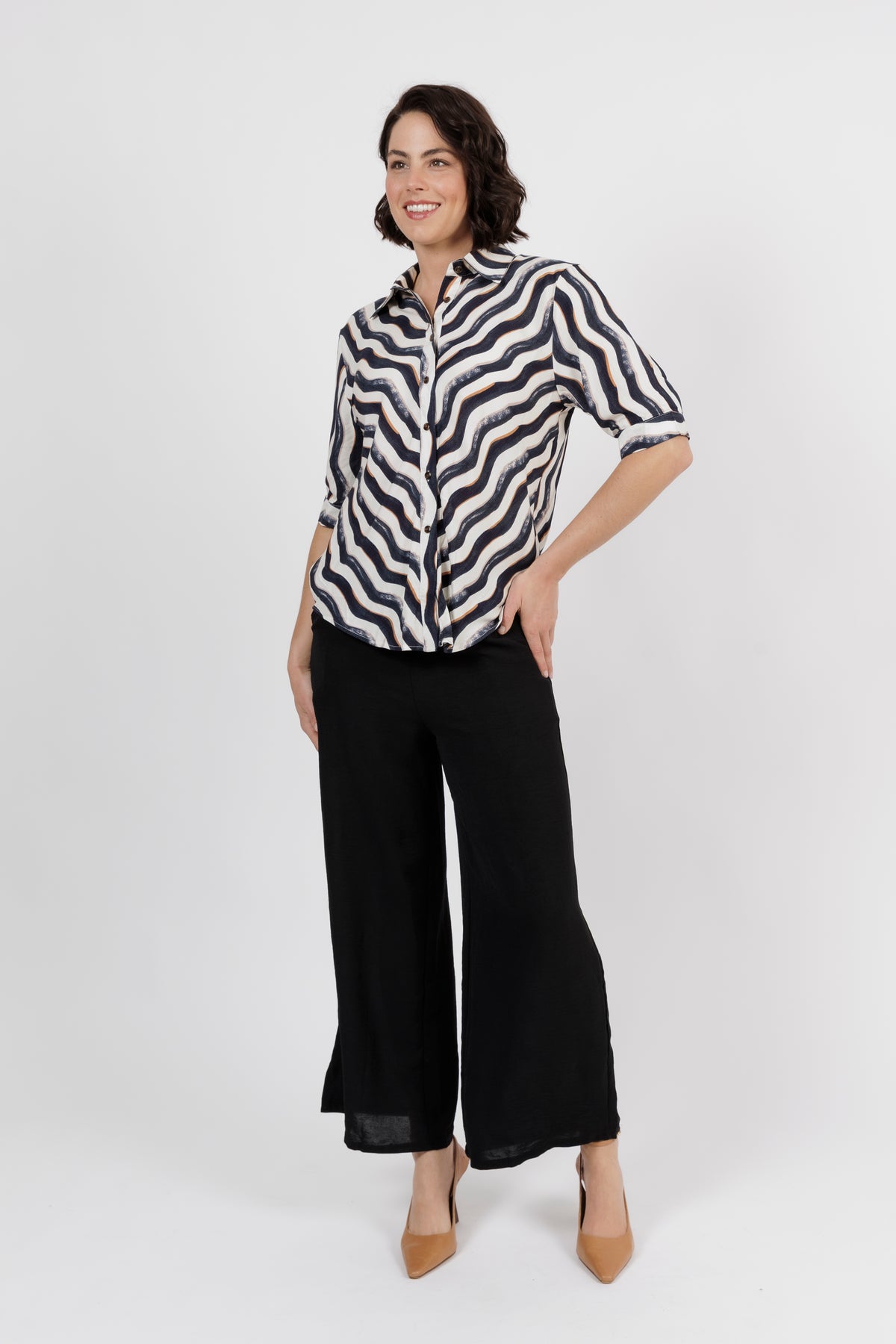 The Amalfi is the newest member of beautiful shirt range. This button through shirt is just beautiful, now is a delicate new multi colour art print. Combining black, white and taupe. Cut from lightweight fabric with, it has the look of resort wear, lending itself to both casual and smarter styling.