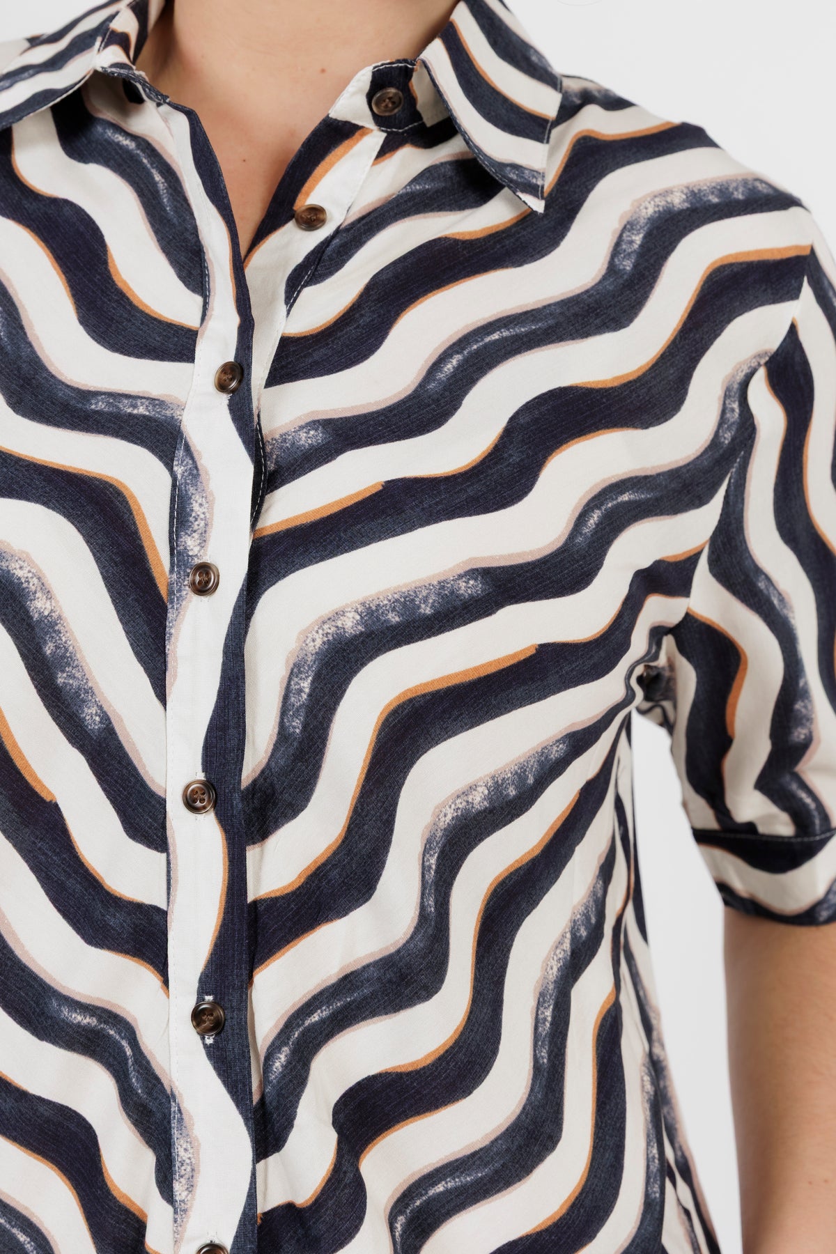 - Stand collar with front placket and eye-catching geometric print