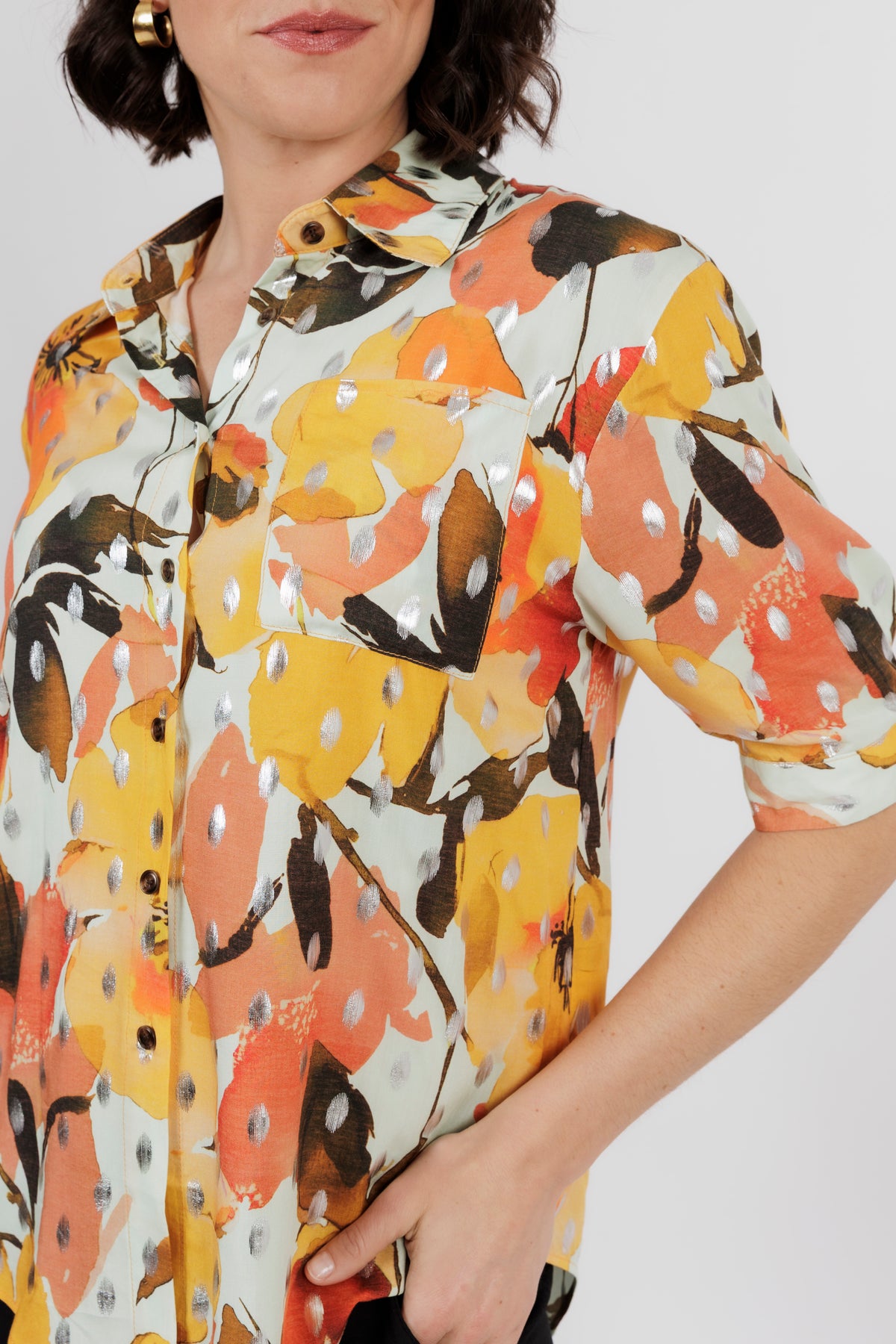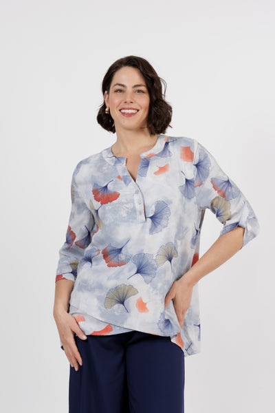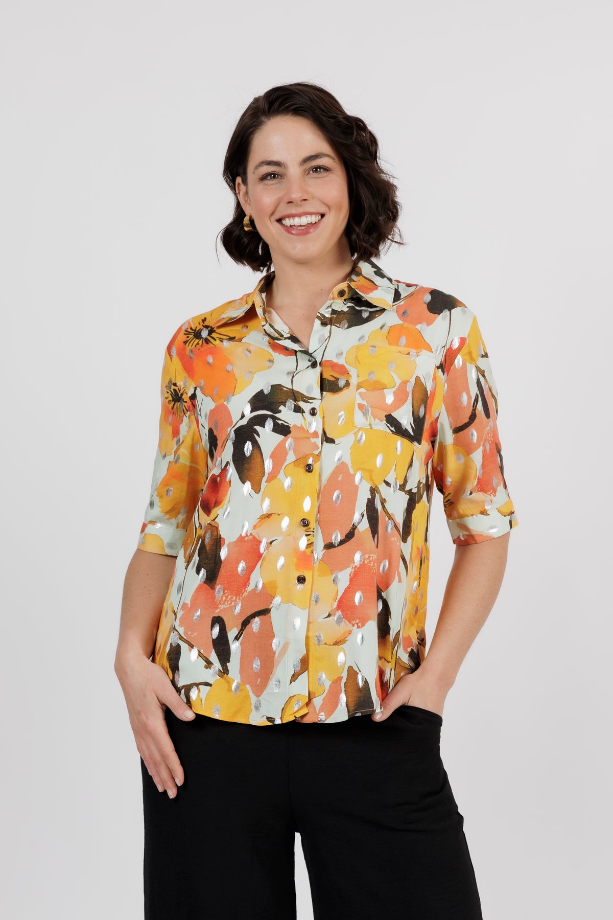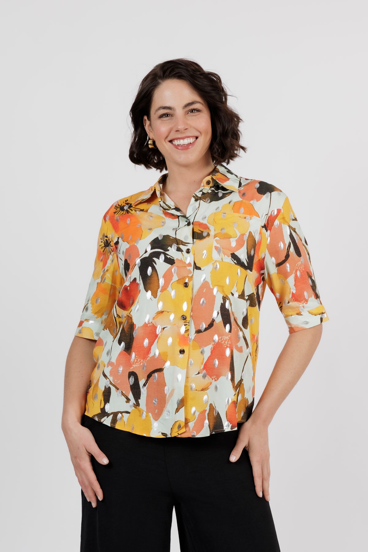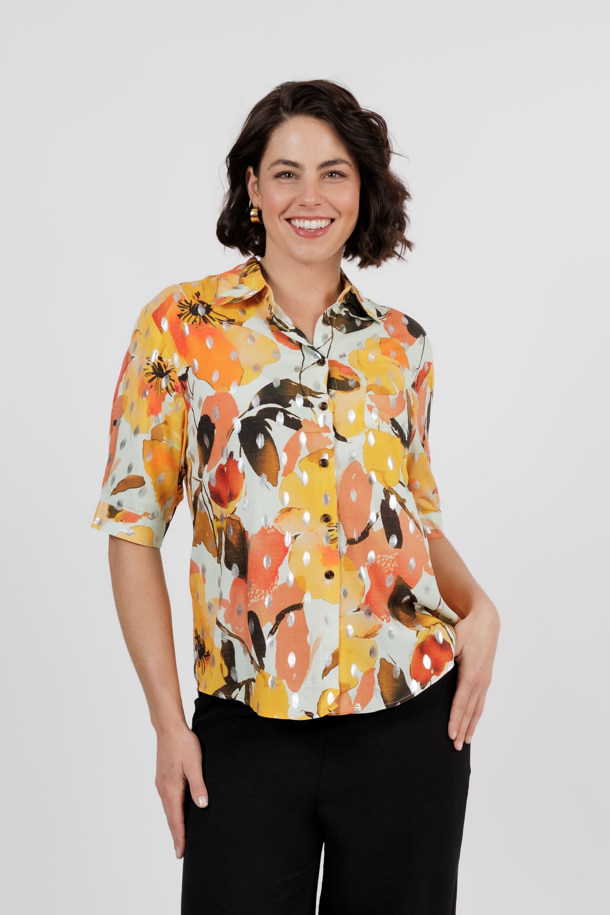 The Amalfi is the newest member of beautiful shirt range. This button through shirt is just beautiful, now is a delicate new multi colour art print. Combining orange, yellow and cream. Cut from lightweight fabric with, it has the look of resort wear, lending itself to both casual and smarter styling.