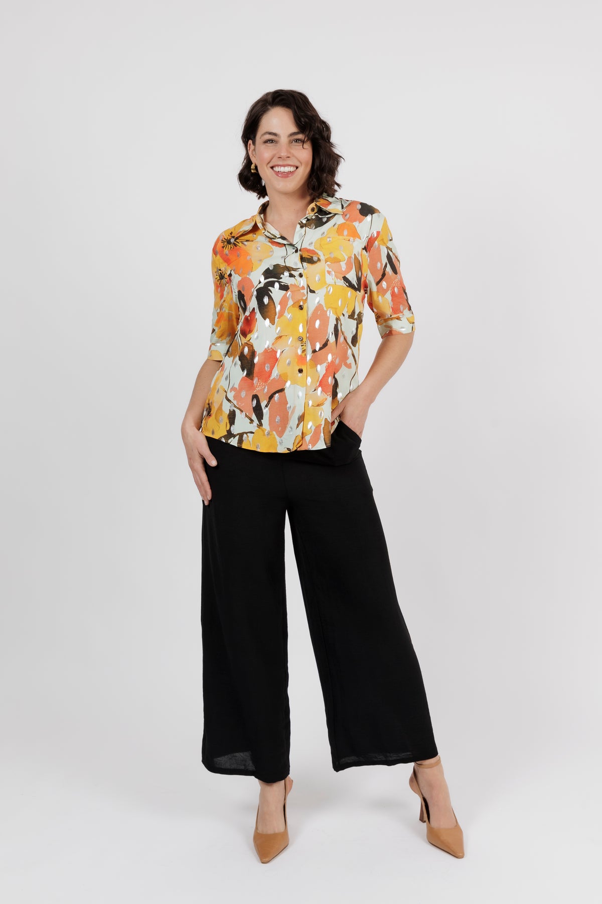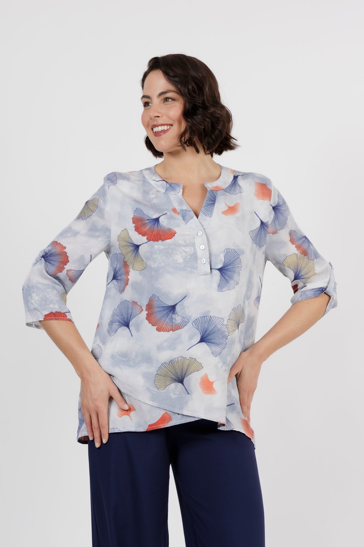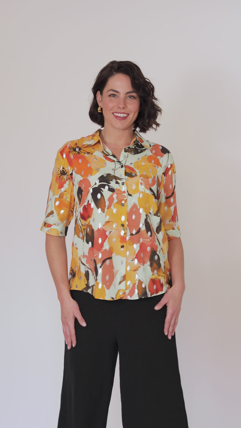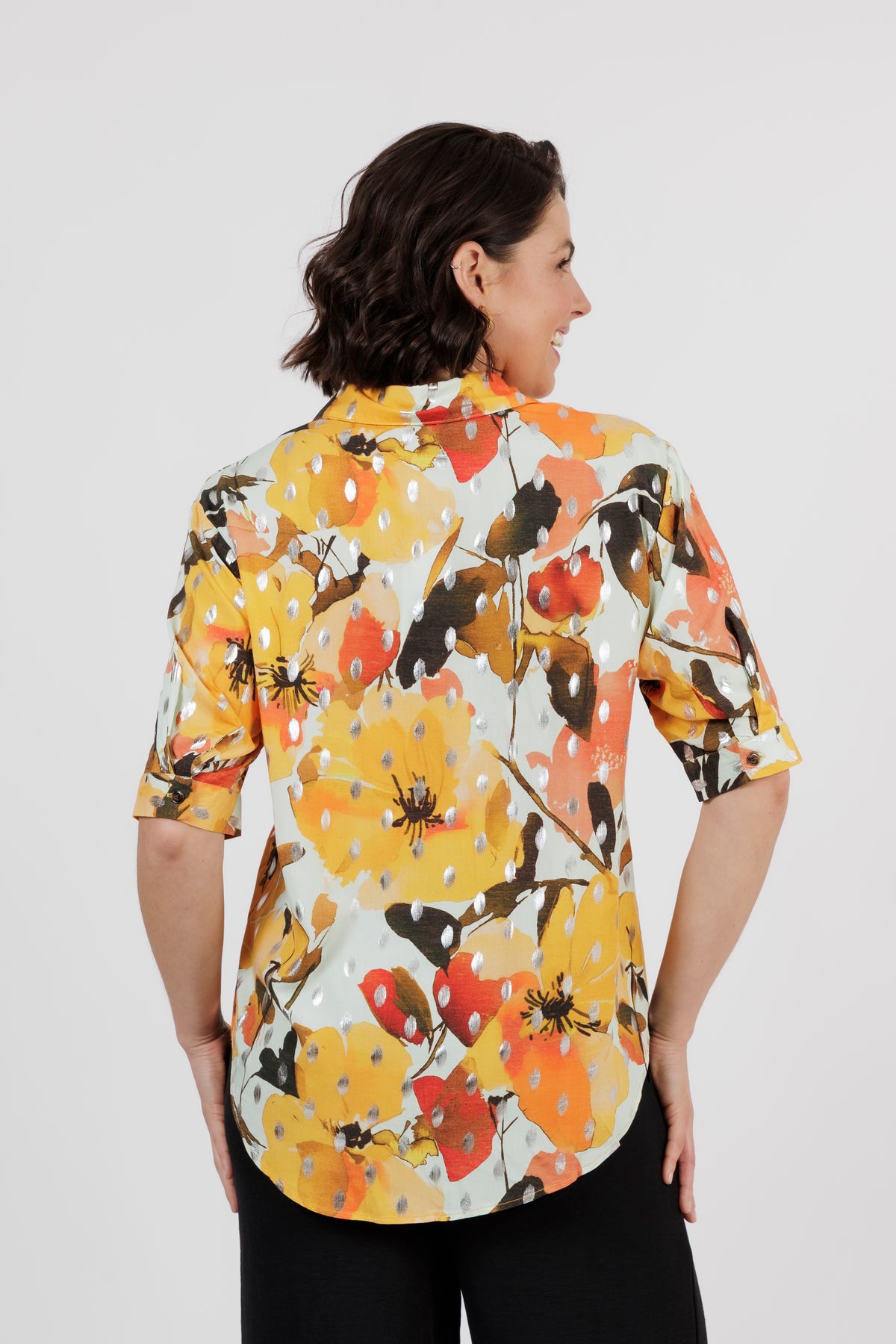 The Amalfi is the newest member of beautiful shirt range. This button through shirt is just beautiful, now is a delicate new multi colour art print. Combining orange, yellow and cream. Cut from lightweight fabric with, it has the look of resort wear, lending itself to both casual and smarter styling.