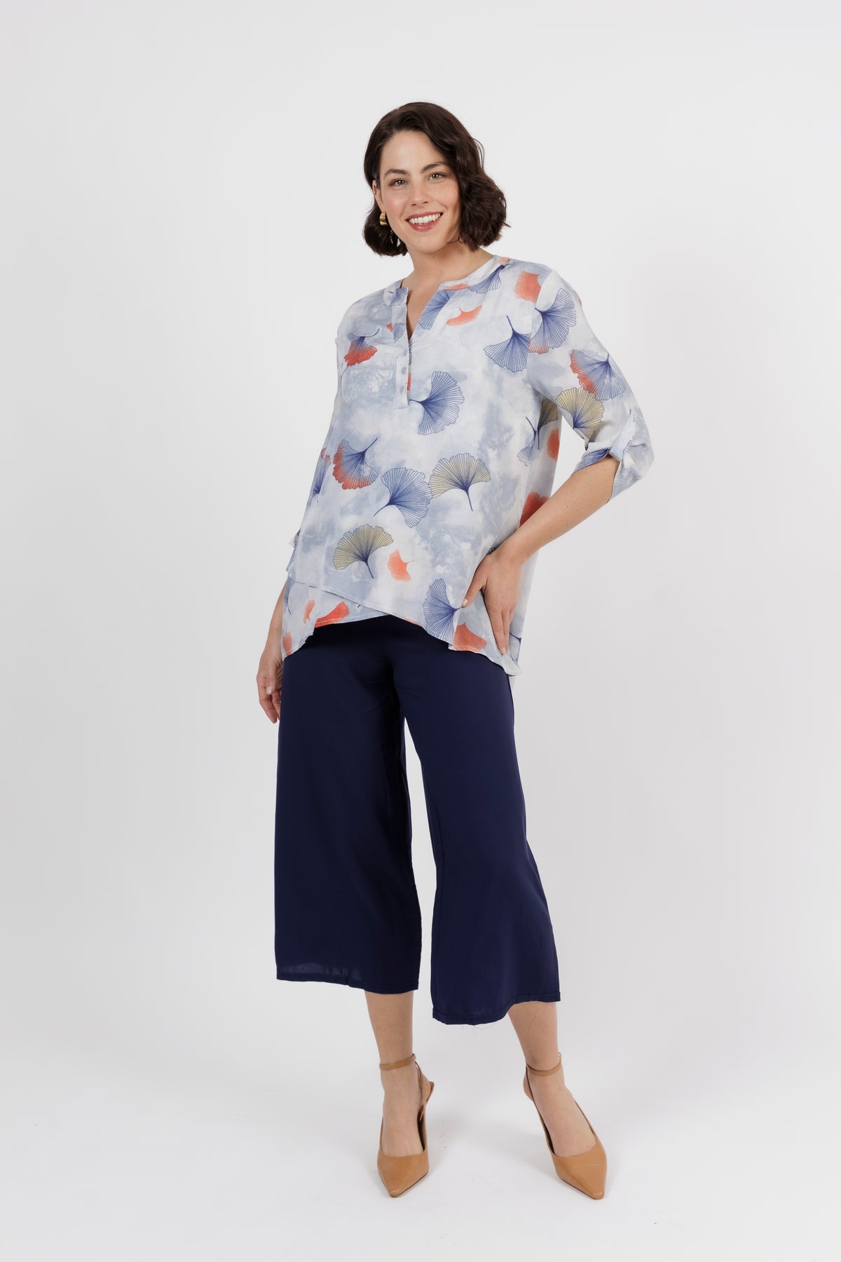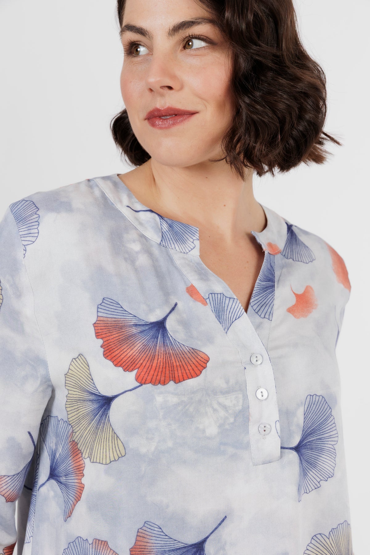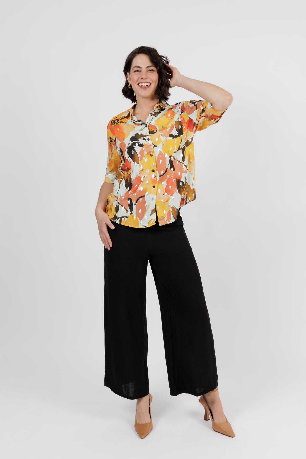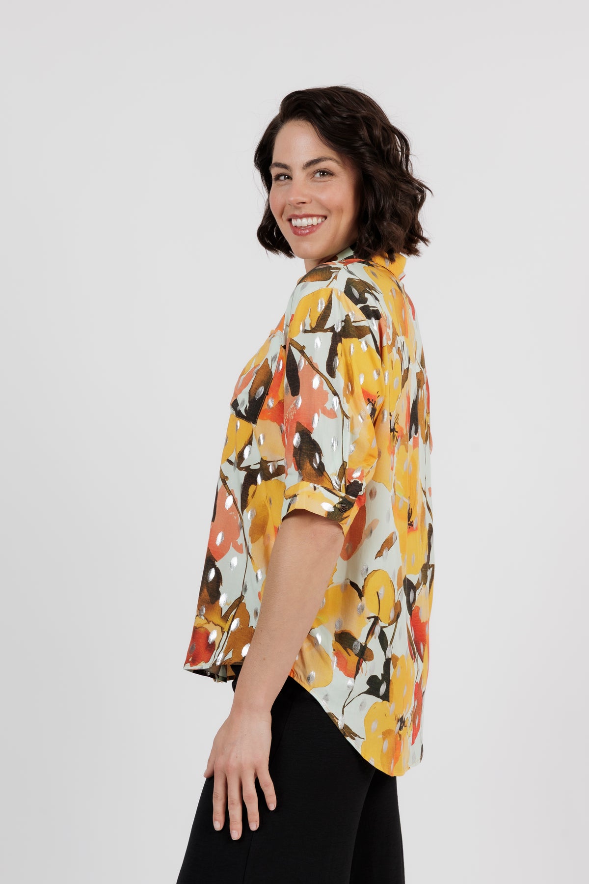 The Amalfi is the newest member of beautiful shirt range. This button through shirt is just beautiful, now is a delicate new multi colour art print. Combining orange, yellow and cream. Cut from lightweight fabric with, it has the look of resort wear, lending itself to both casual and smarter styling.