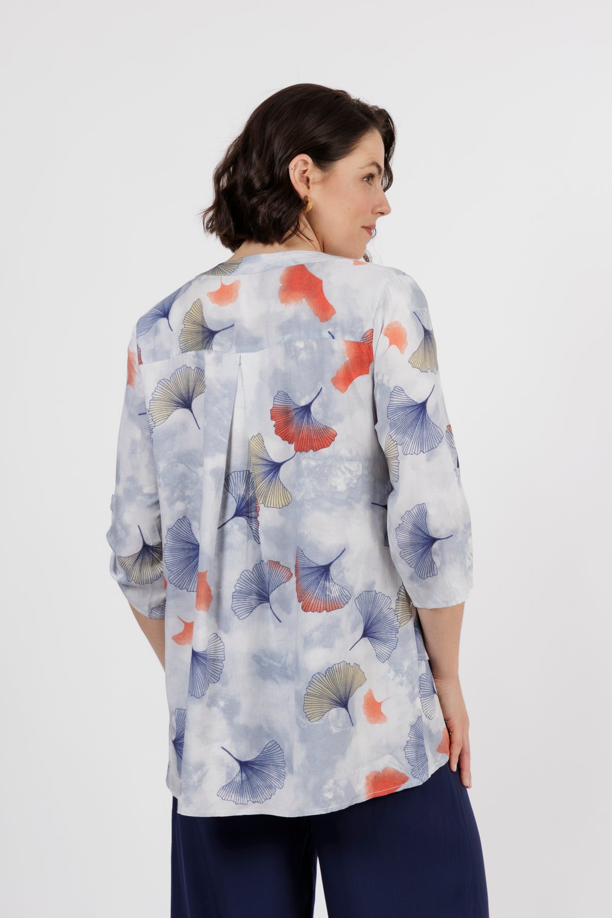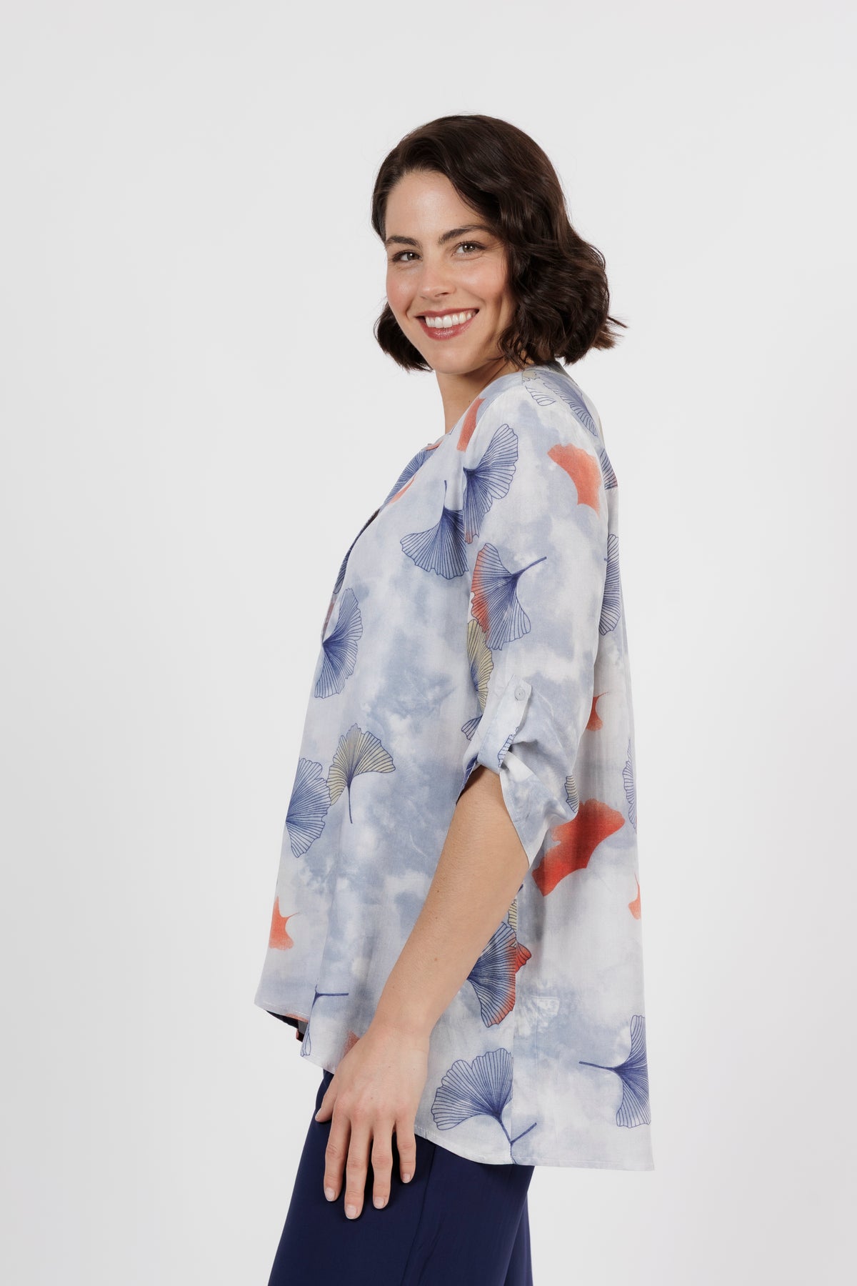The Alvara Top is an impeccable statement style with a smart sophisticated look. Now in a new colour way that combines blue base with shades of vivid navy and rust. Combining a wash of soft colours and abstract print with a sleek, polished silhouette.