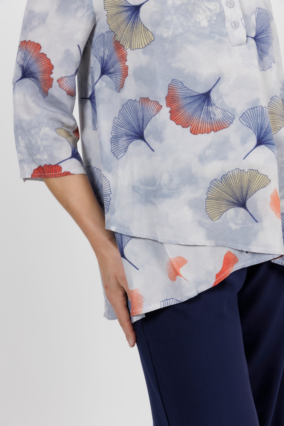 - Three quarter sleeves with button tab