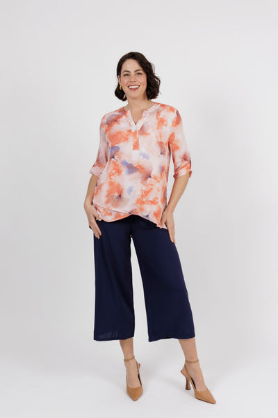 The Alvara Top is an impeccable statement style with a smart sophisticated look. Now in a new colour way that combines orange base with shades of vivid navy and rust. Combining a wash of soft colours and abstract print with a sleek, polished silhouette.