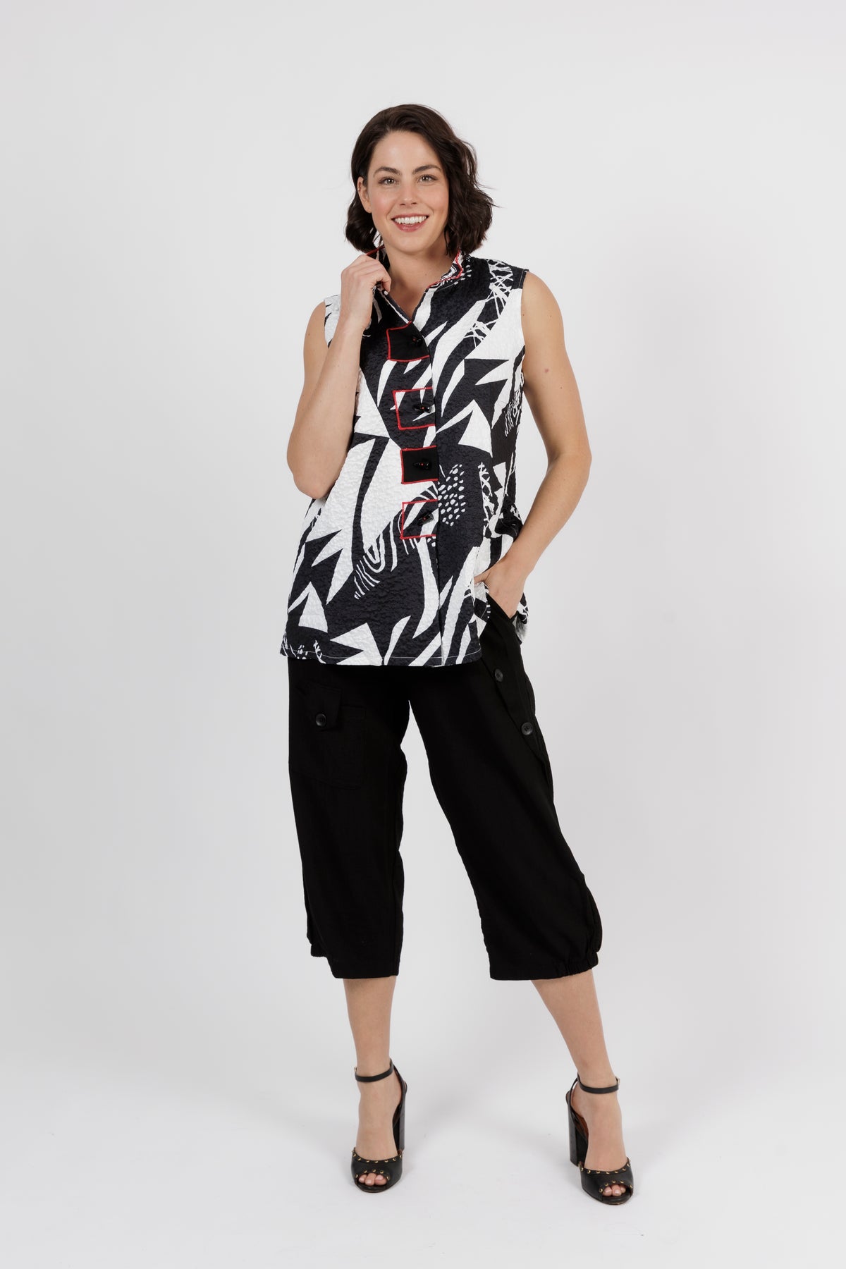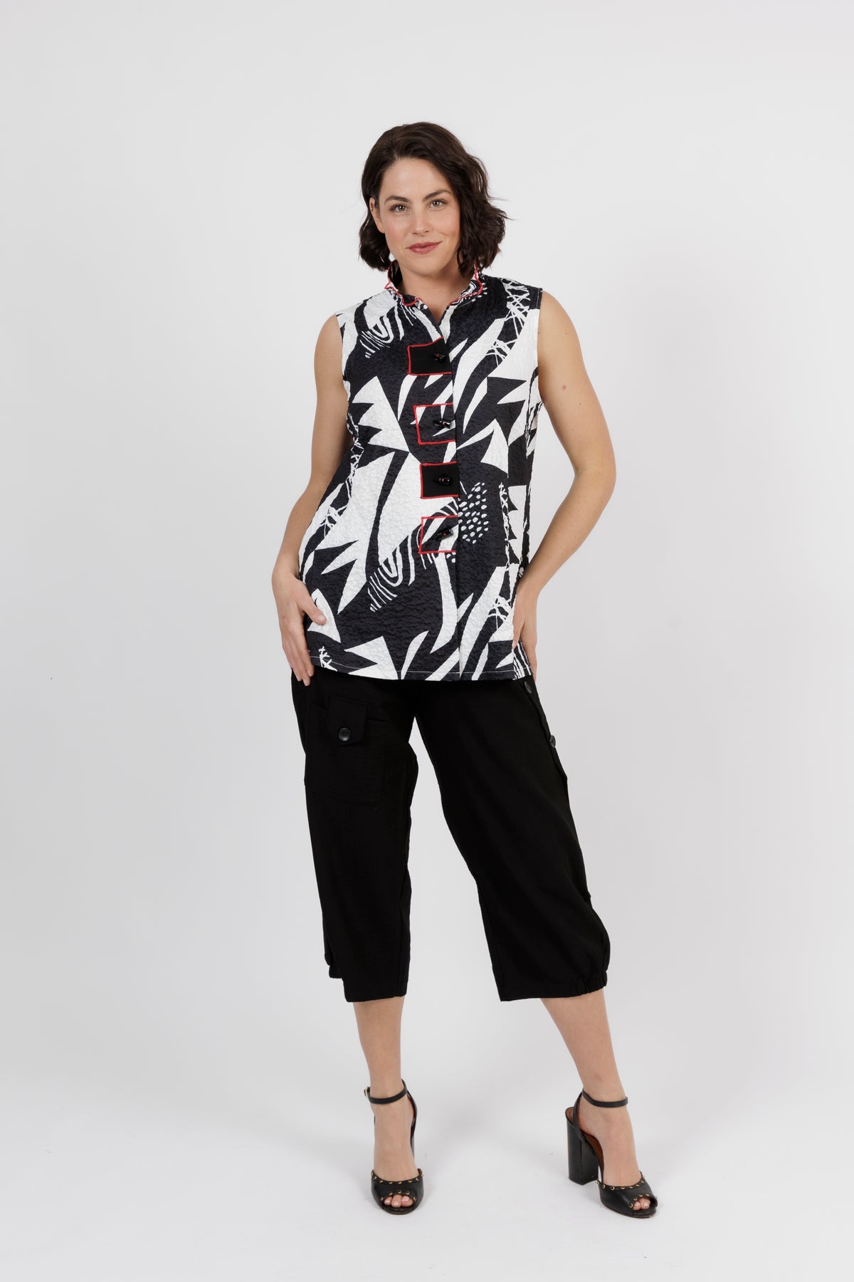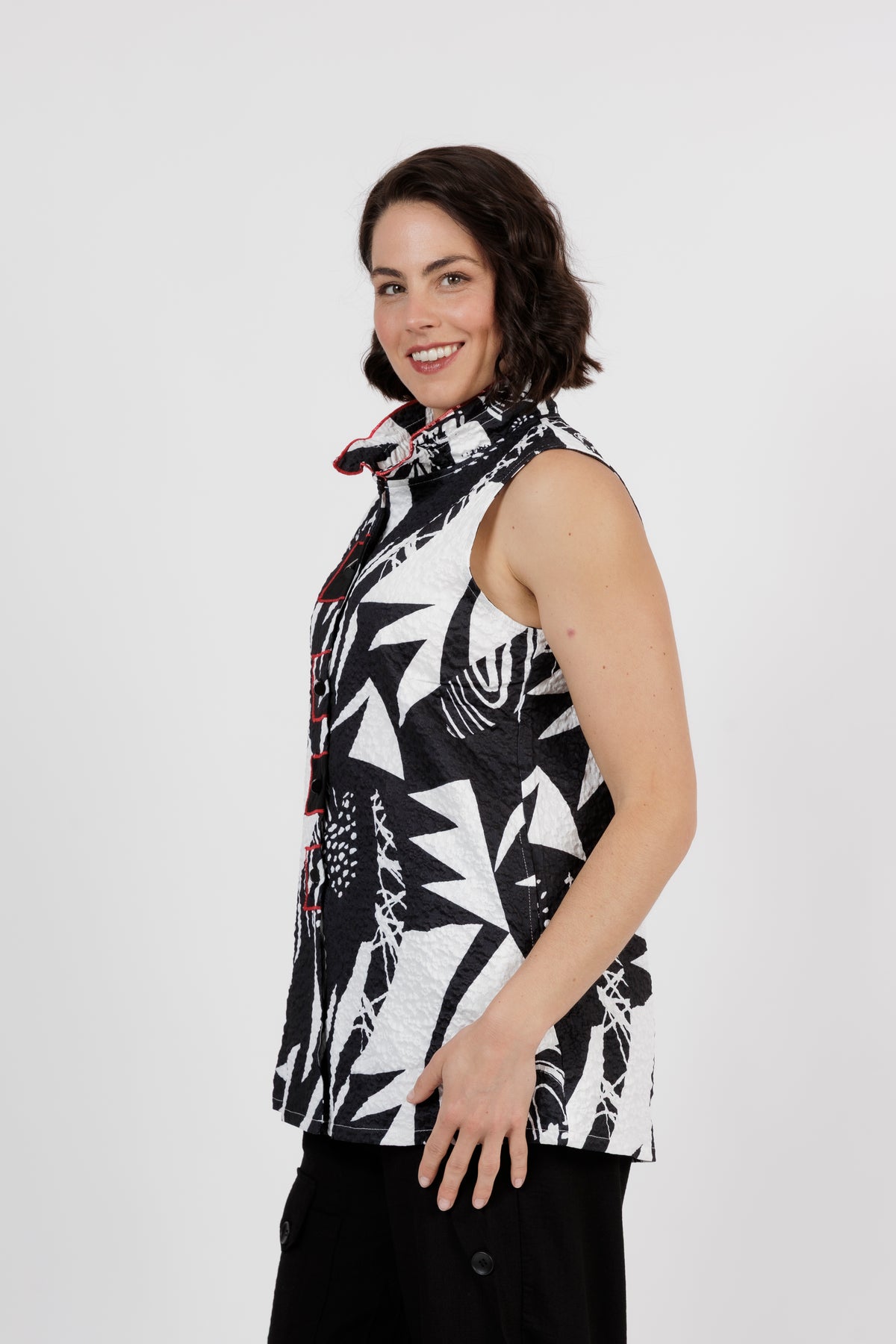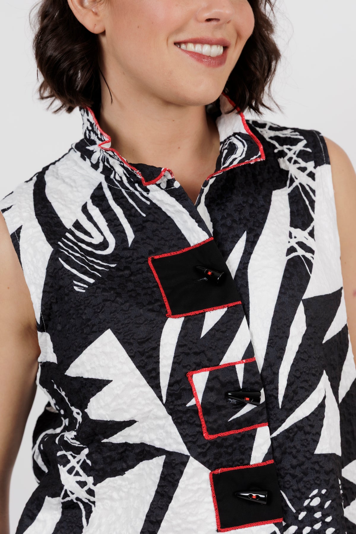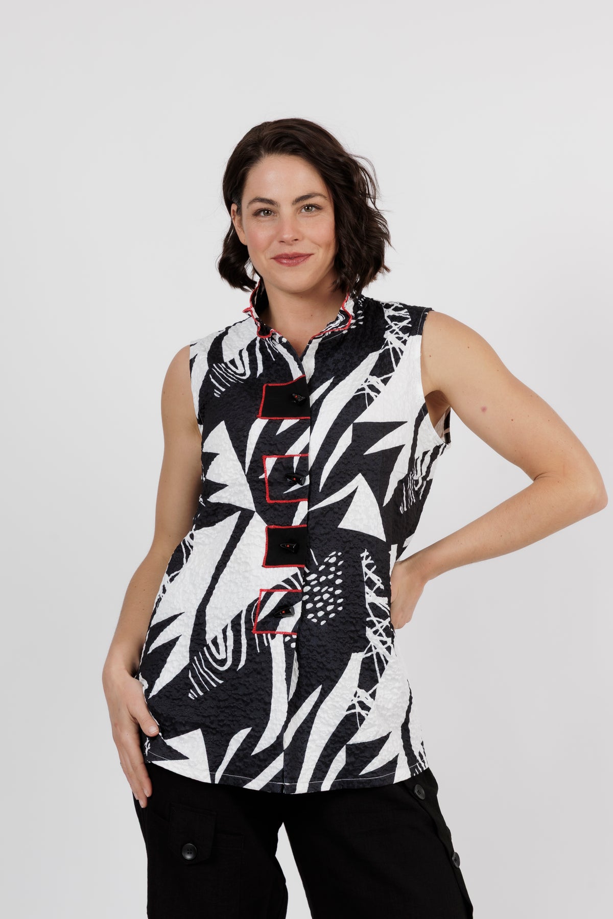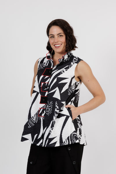 Make a bold statement with this striking sleeveless top that combines comfort and modern artistry. Featuring a dynamic black and white abstract print accented with subtle red trim, its the perfect piece for both everyday sophistication and stand out style.