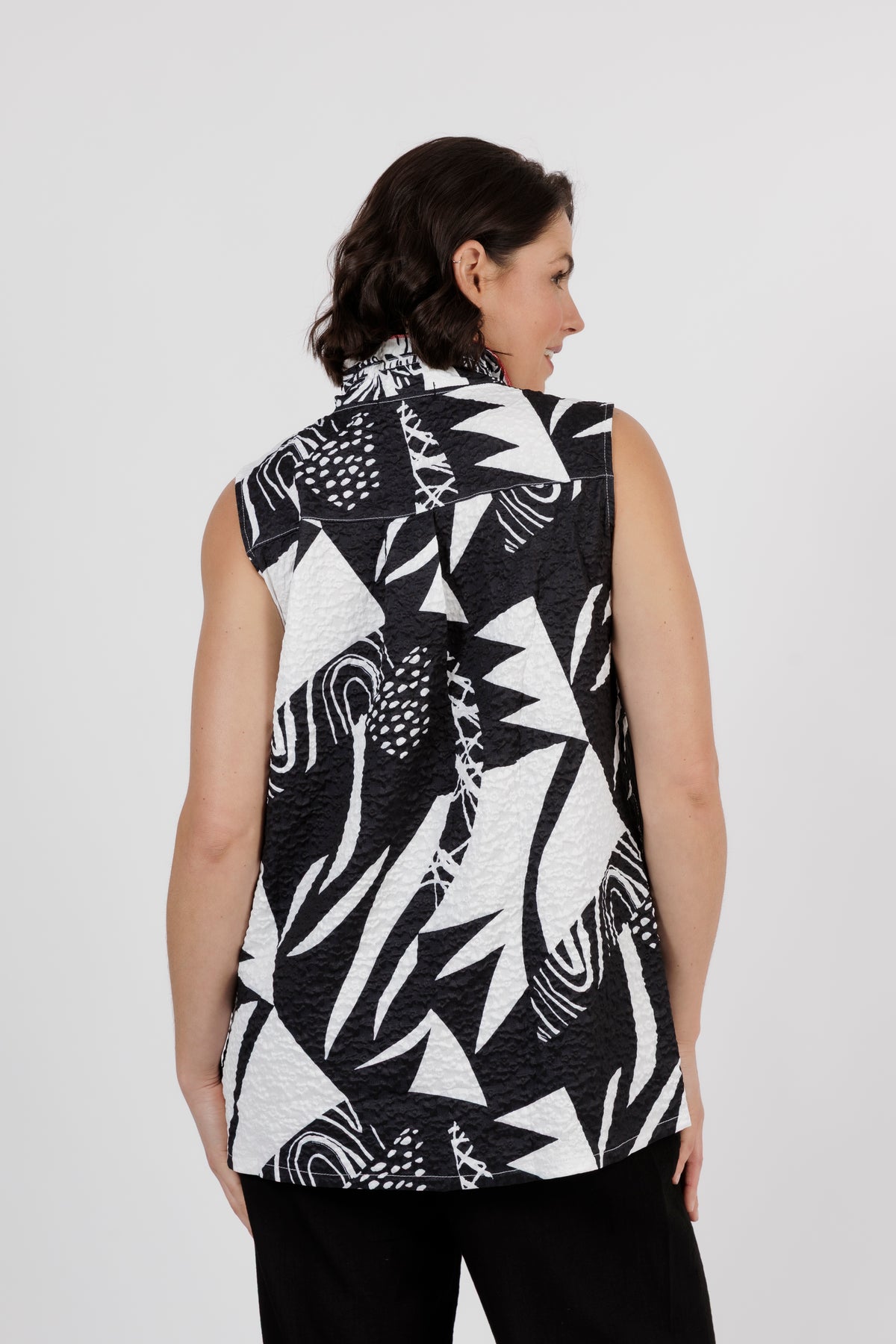 AMADEA Monochrome Muse Sleeveless Top in Black White Abstract Print