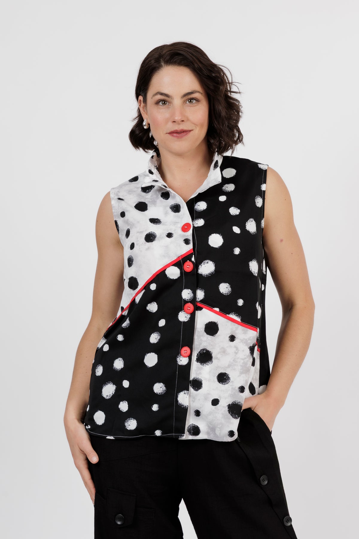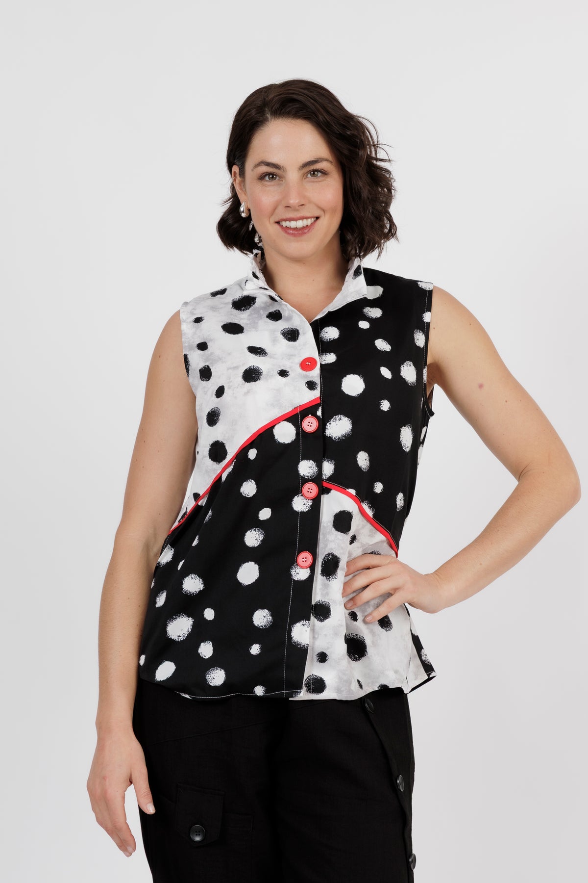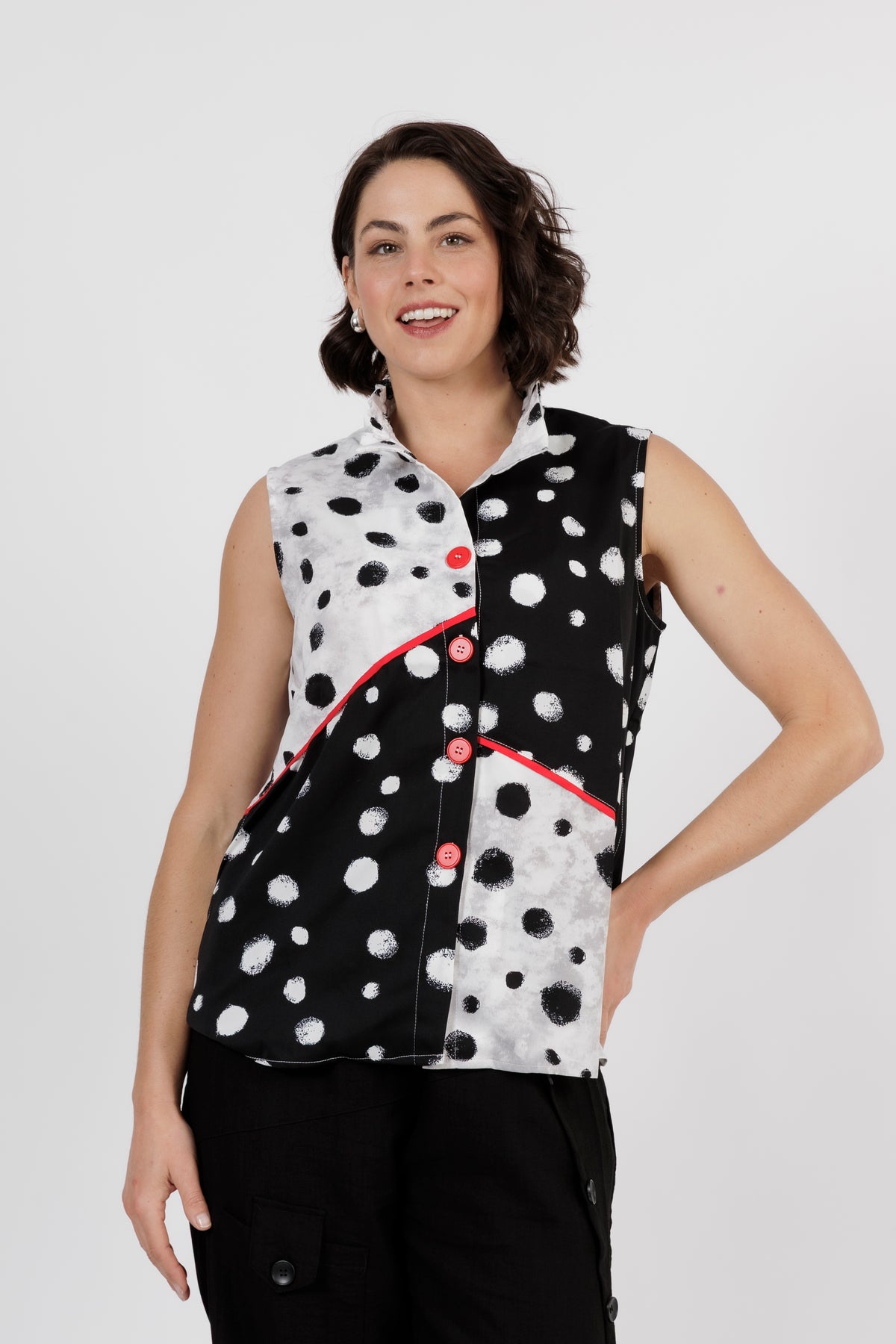 Add a fun twist to your wardrobe with this modern sleeveless top that's full of personality. A bold black and white polka dot print meets striking red accents for a statement look that's as playful as it chic.