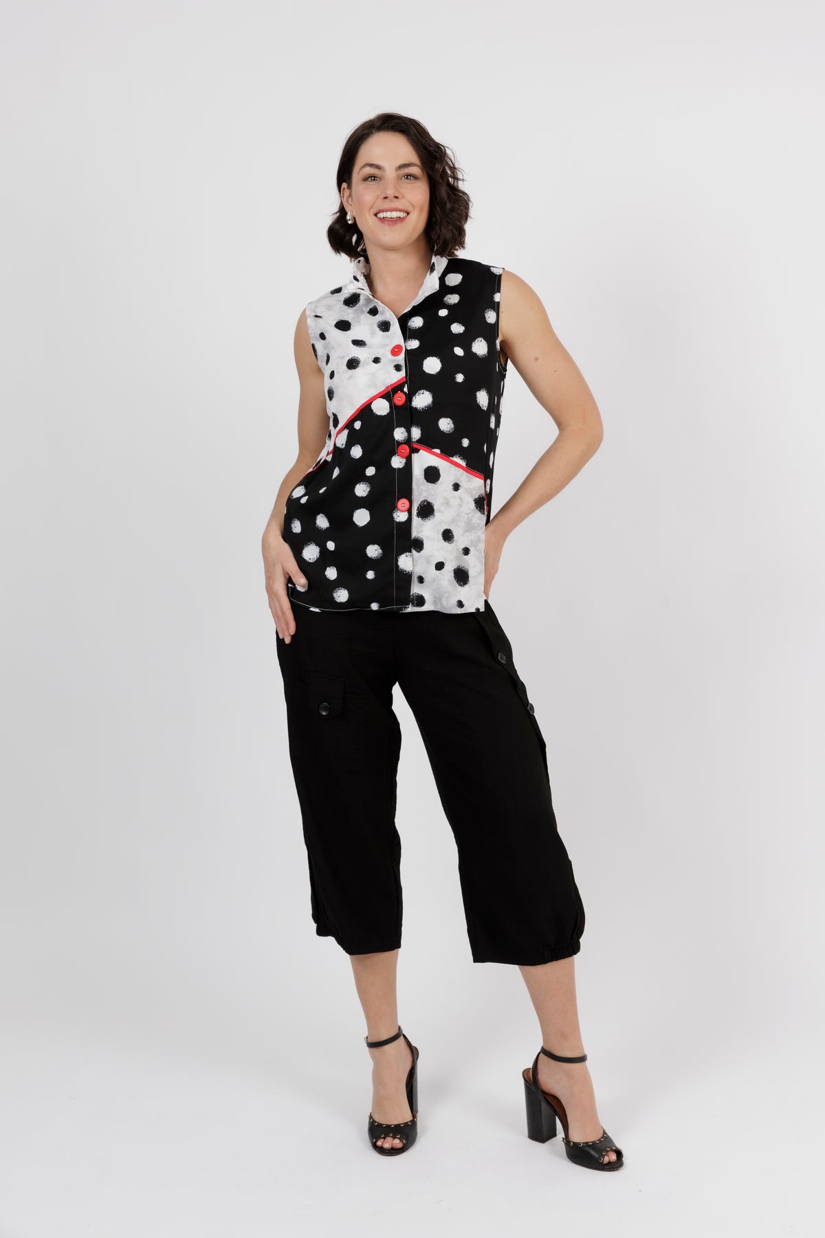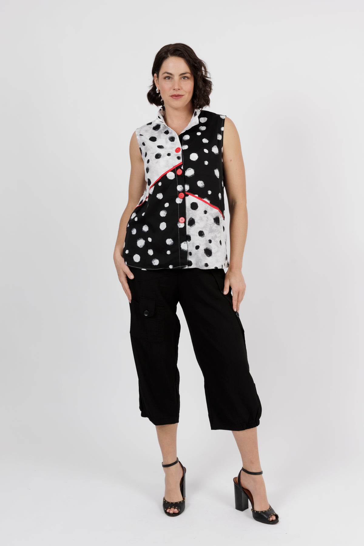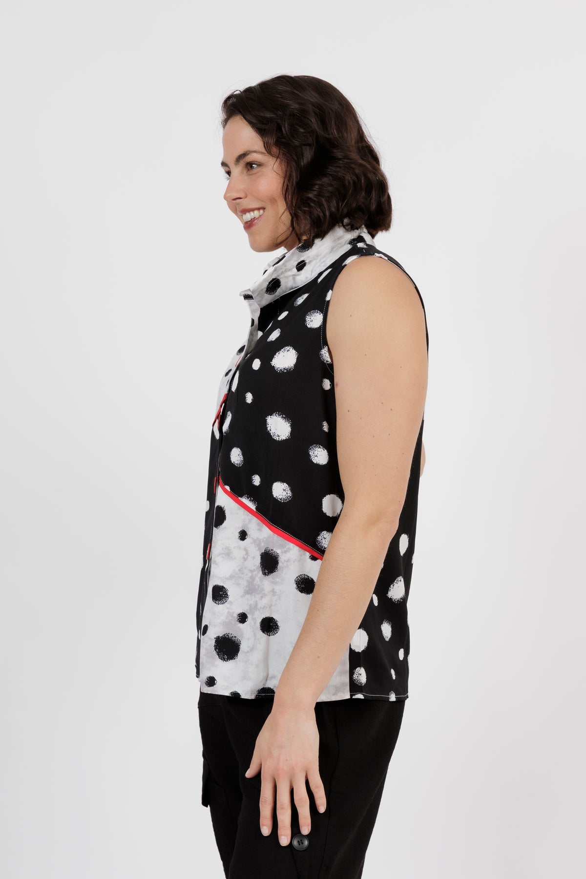 Add a fun twist to your wardrobe with this modern sleeveless top that's full of personality. A bold black and white polka dot print meets striking red accents for a statement look that's as playful as it chic.