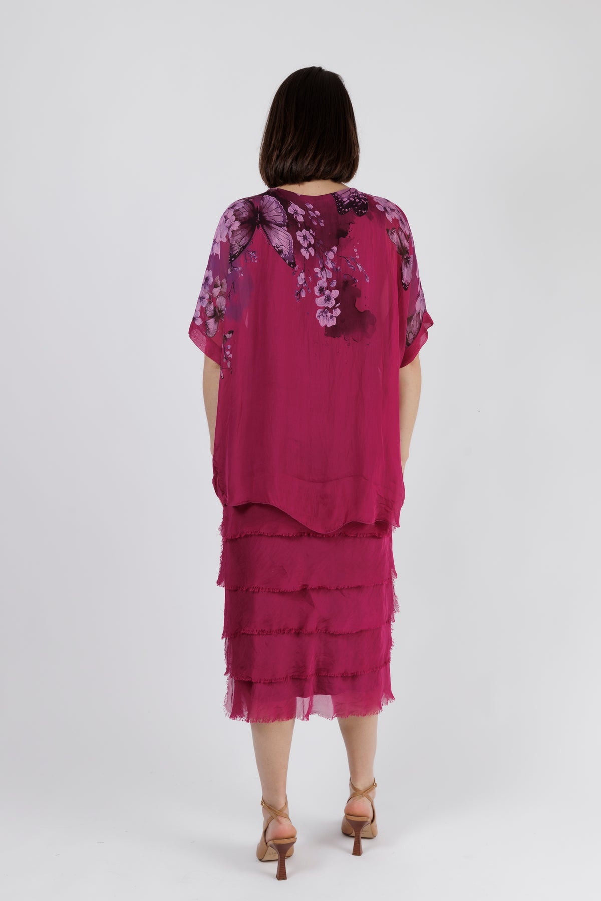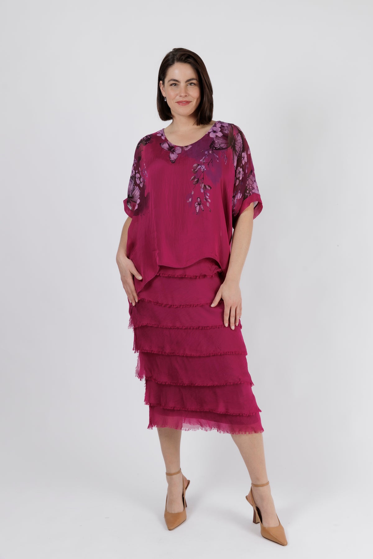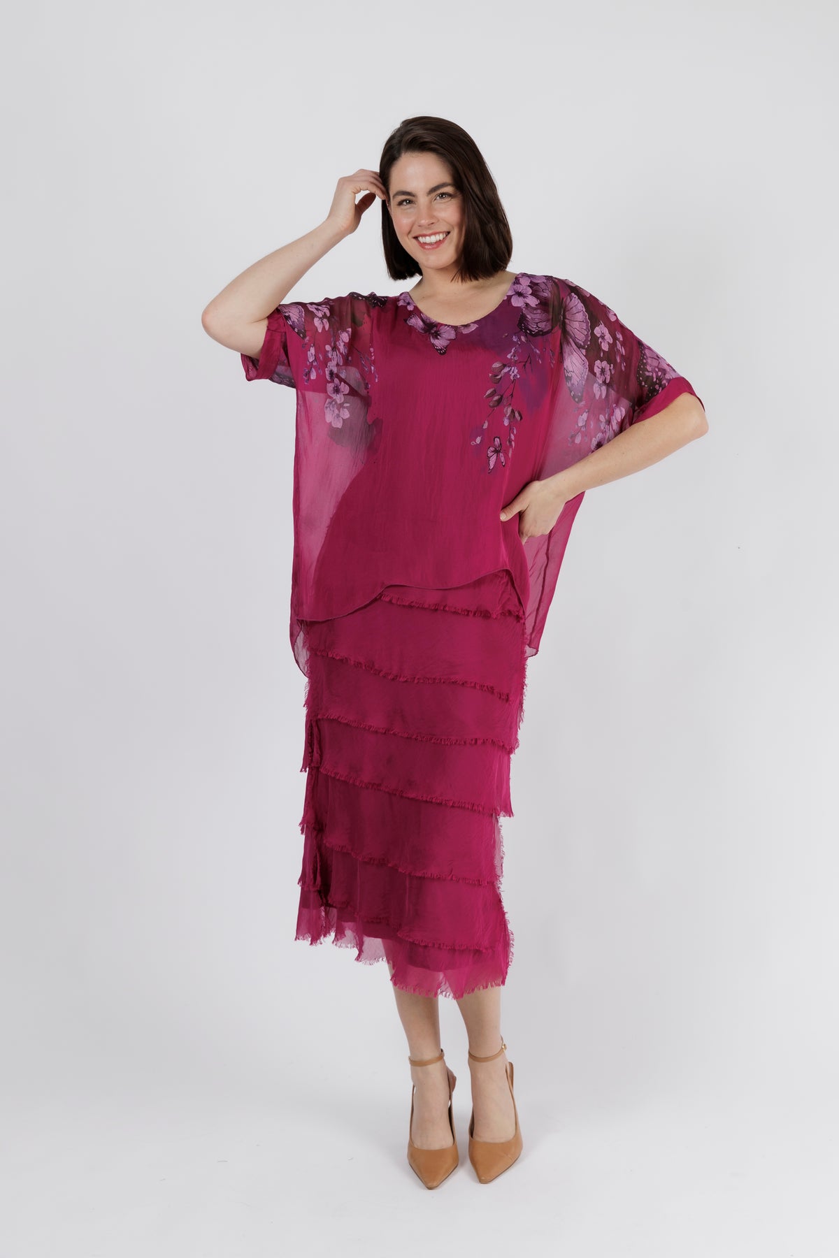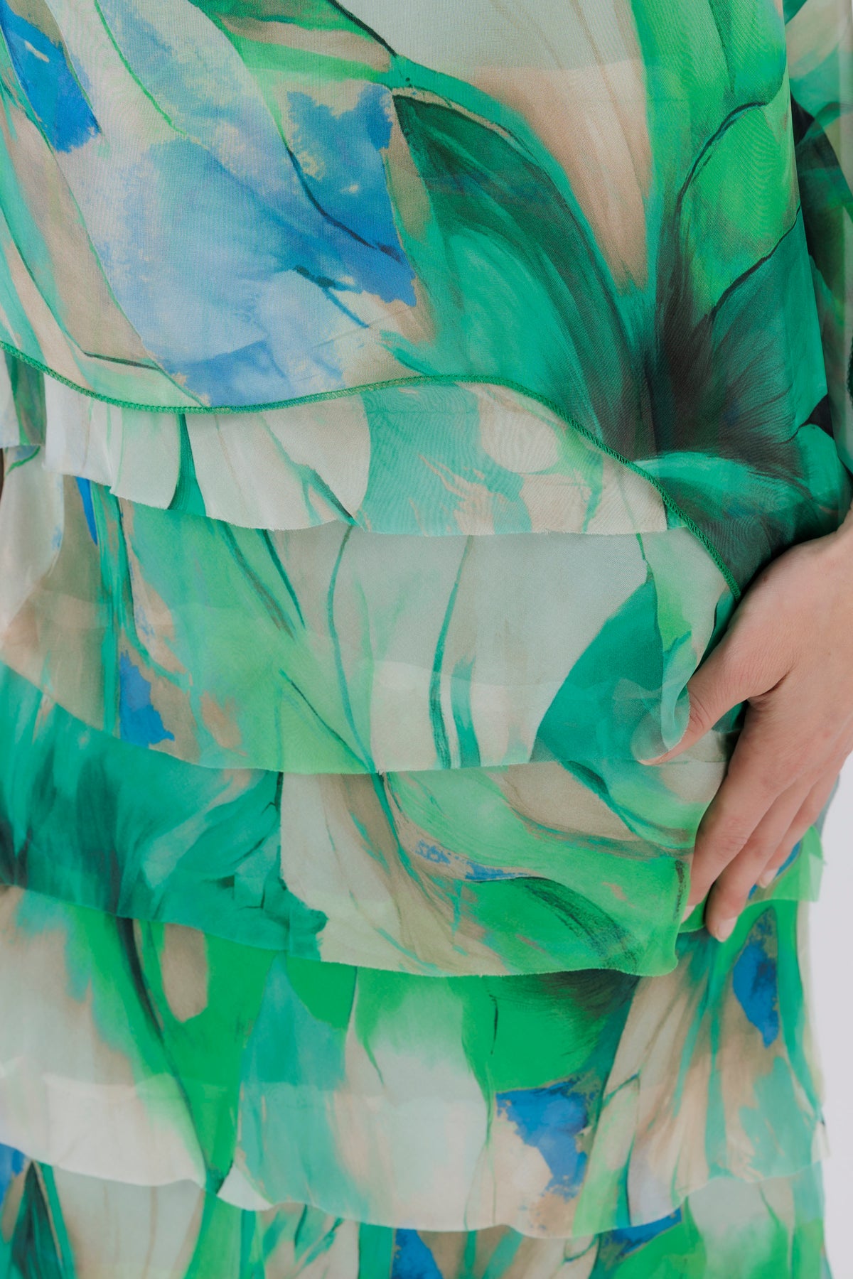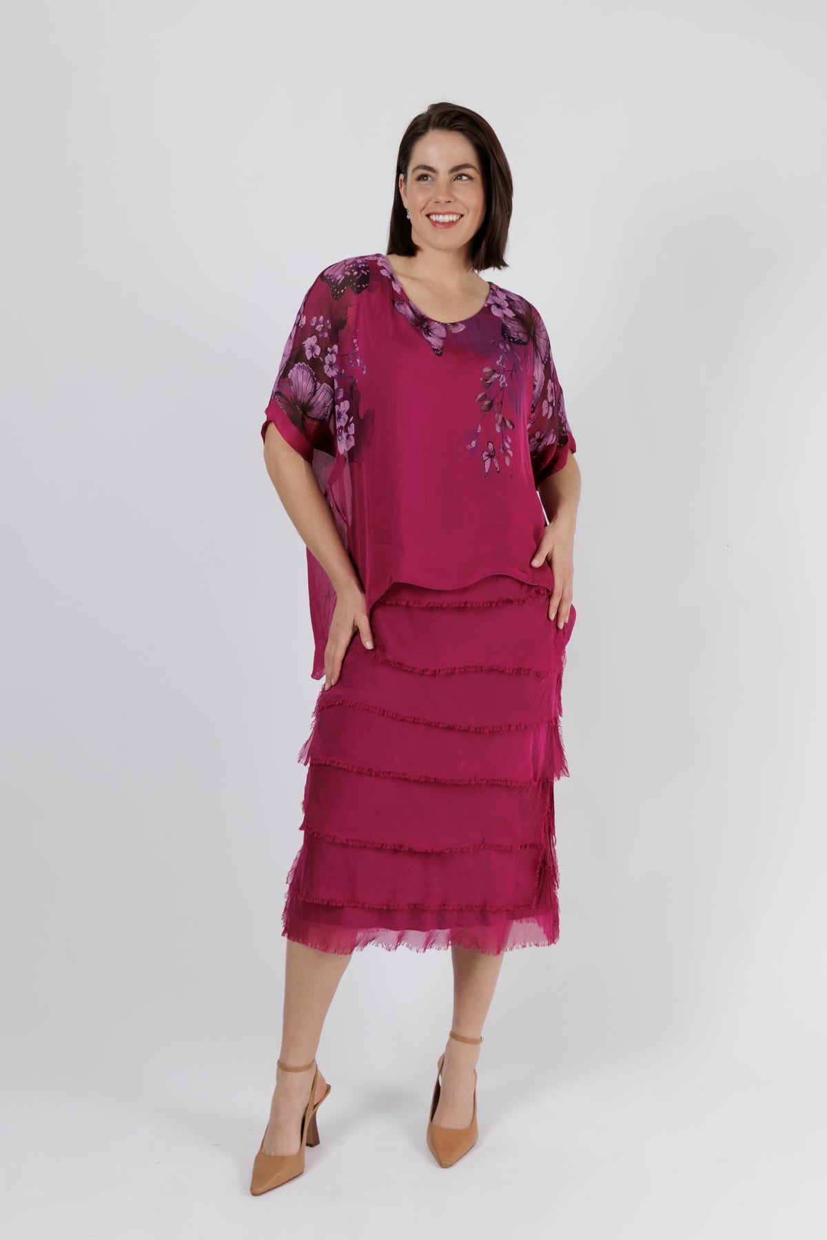 - Layers of silk blend fabric, with raw hems, create a flattering tiered silhouette from the waist down