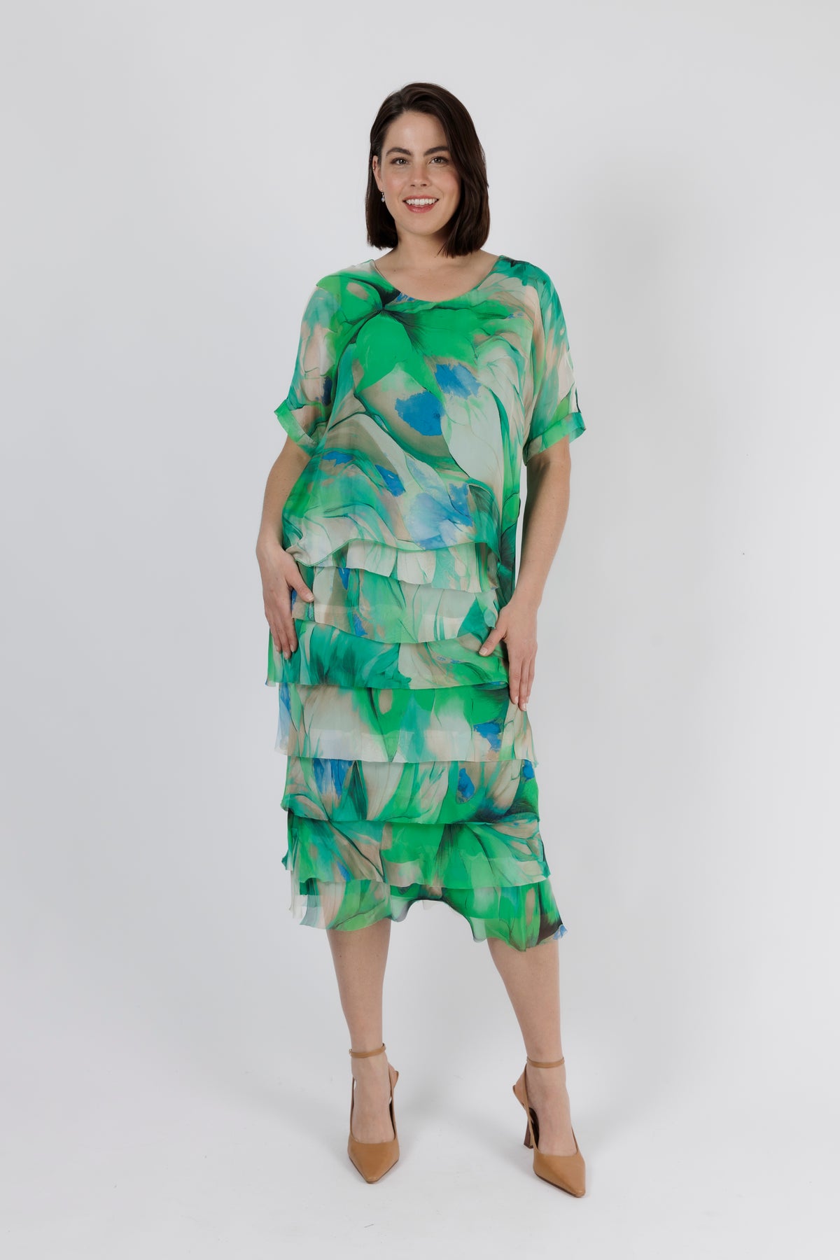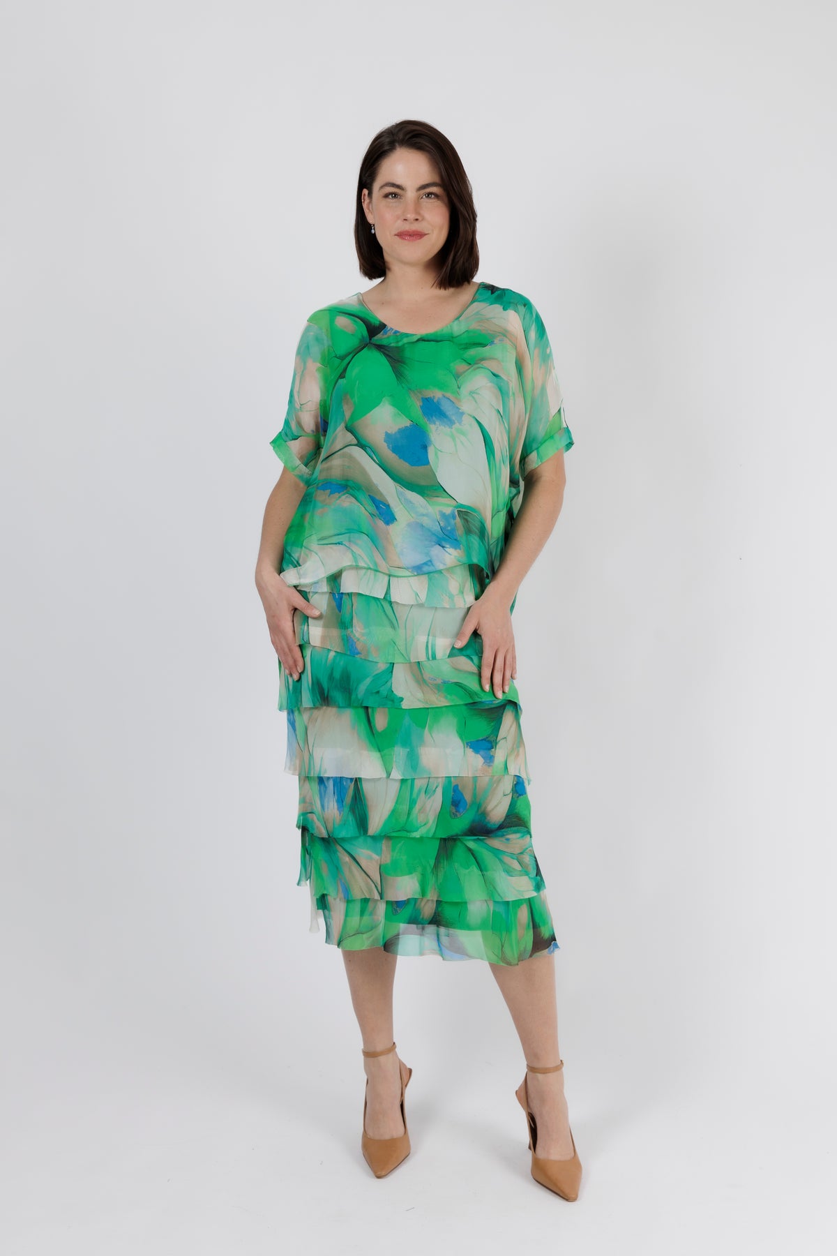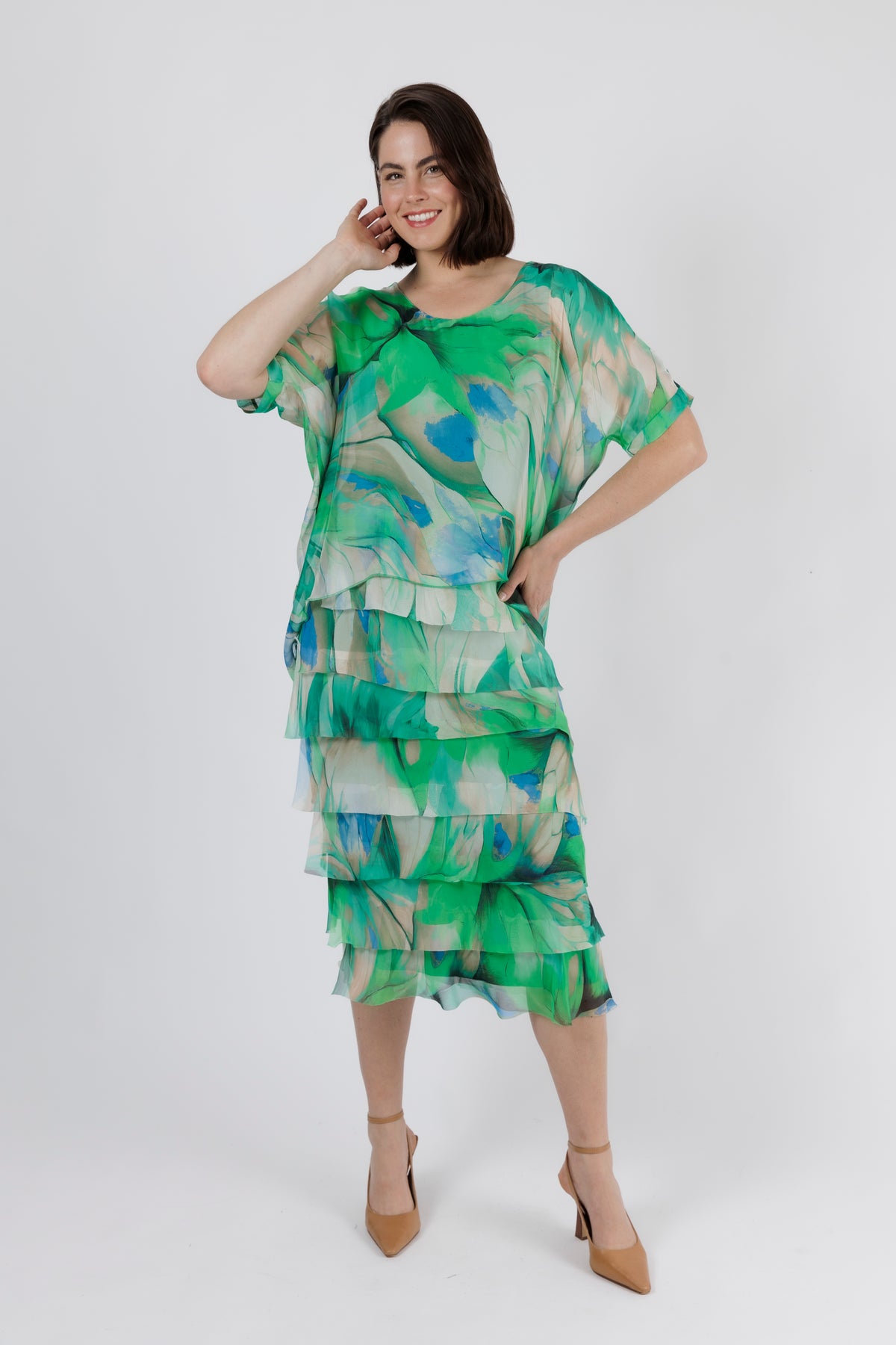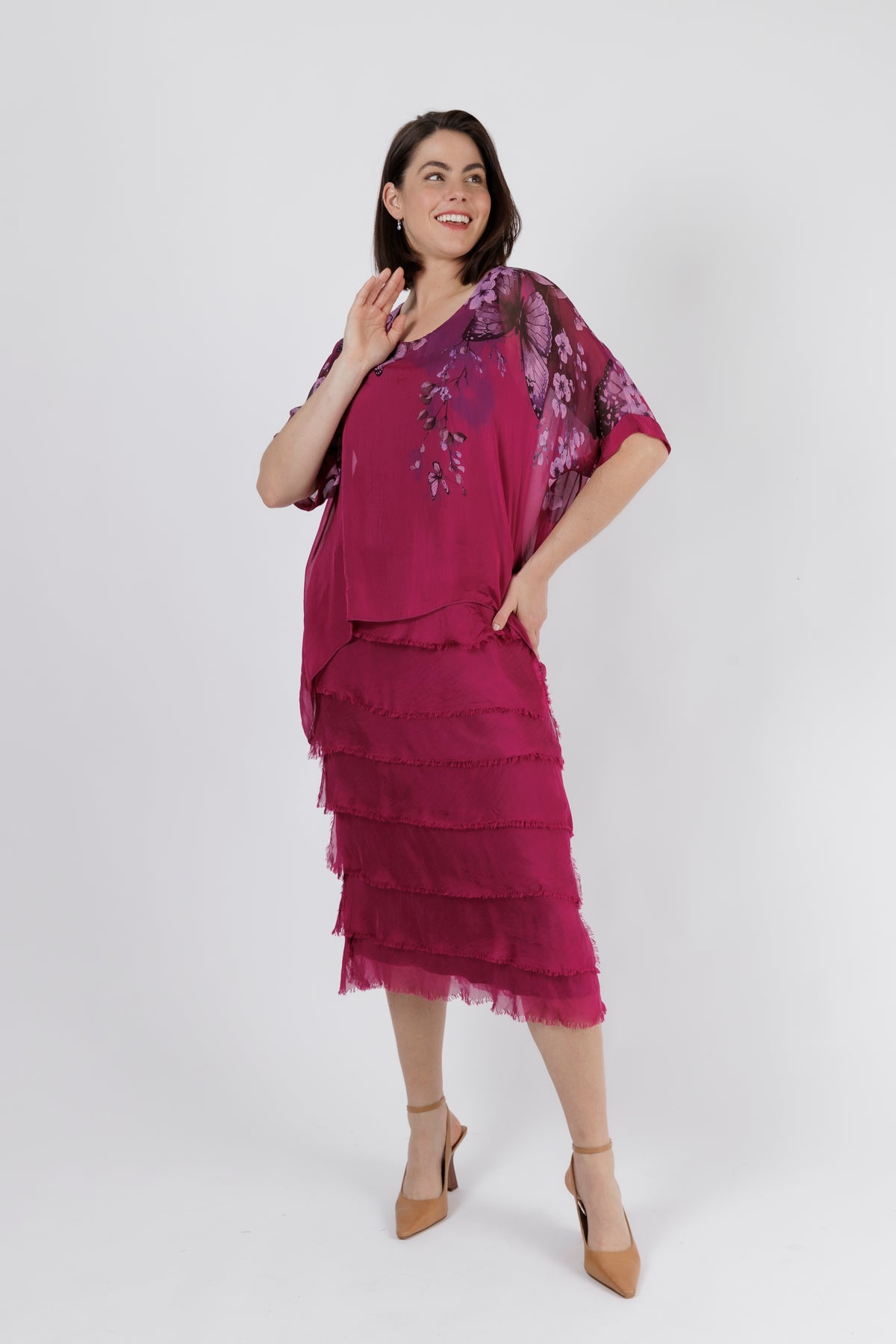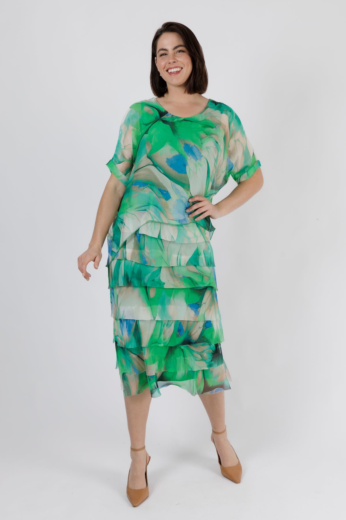 - Layers of silk blend fabric, with raw hems, create a flattering tiered silhouette from the waist down