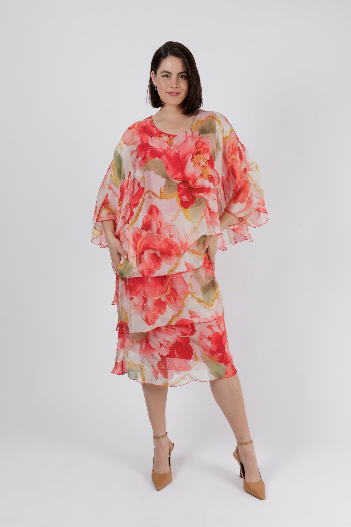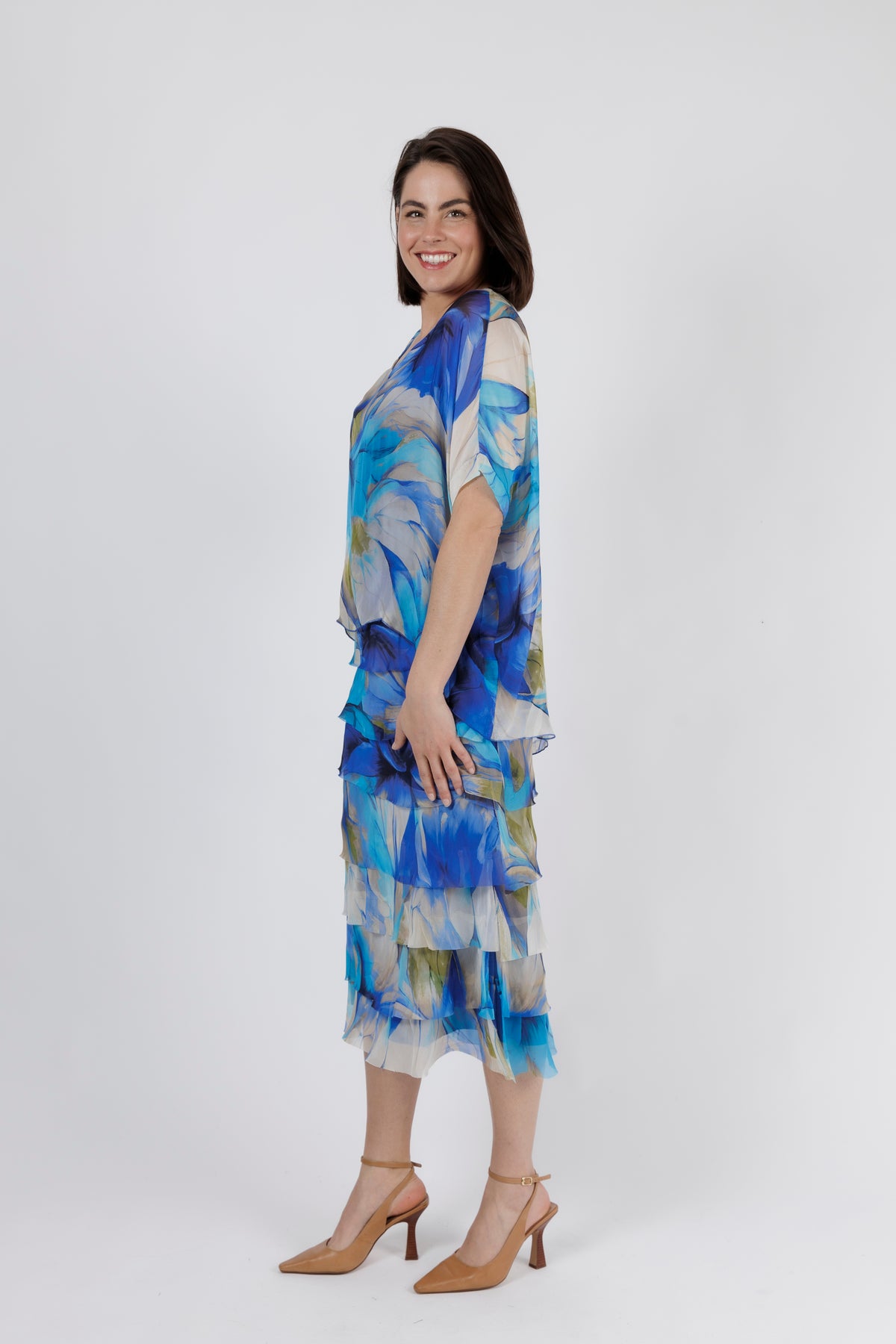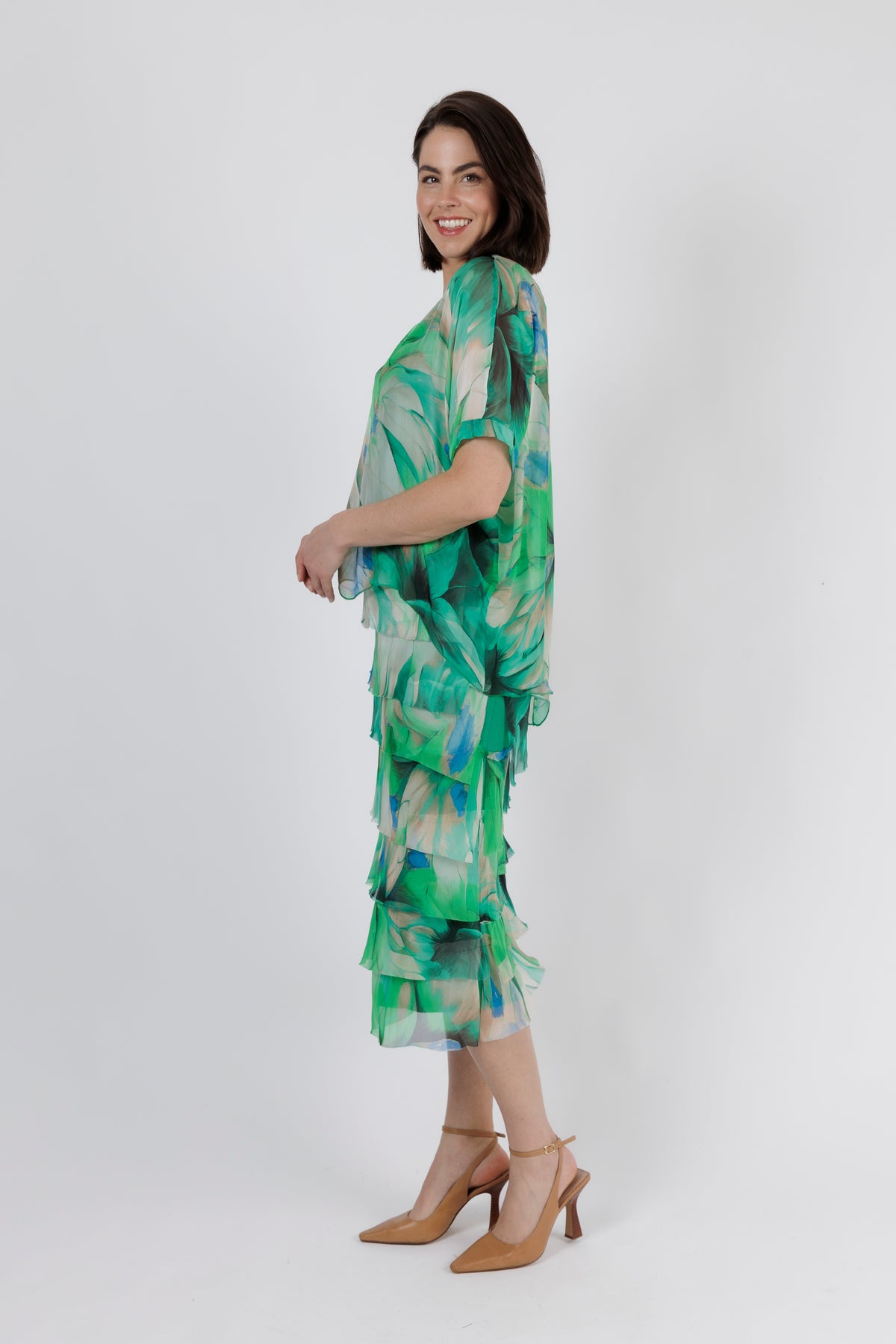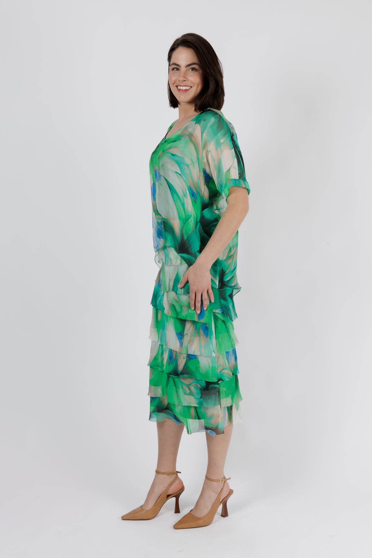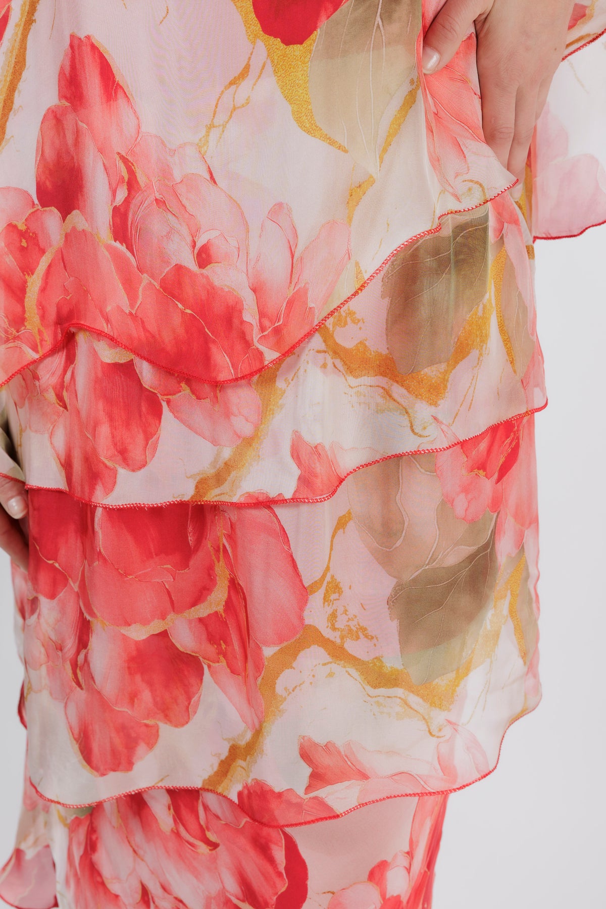 - Layers of silk blend fabric, with raw hems, create a flattering tiered silhouette from the waist down