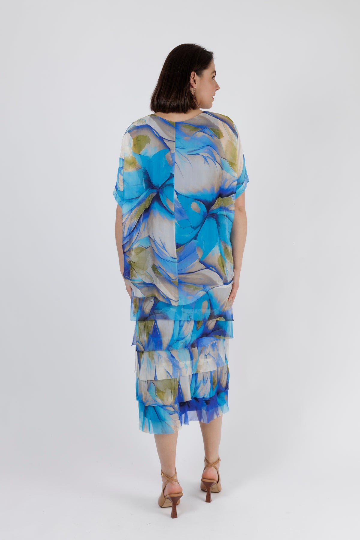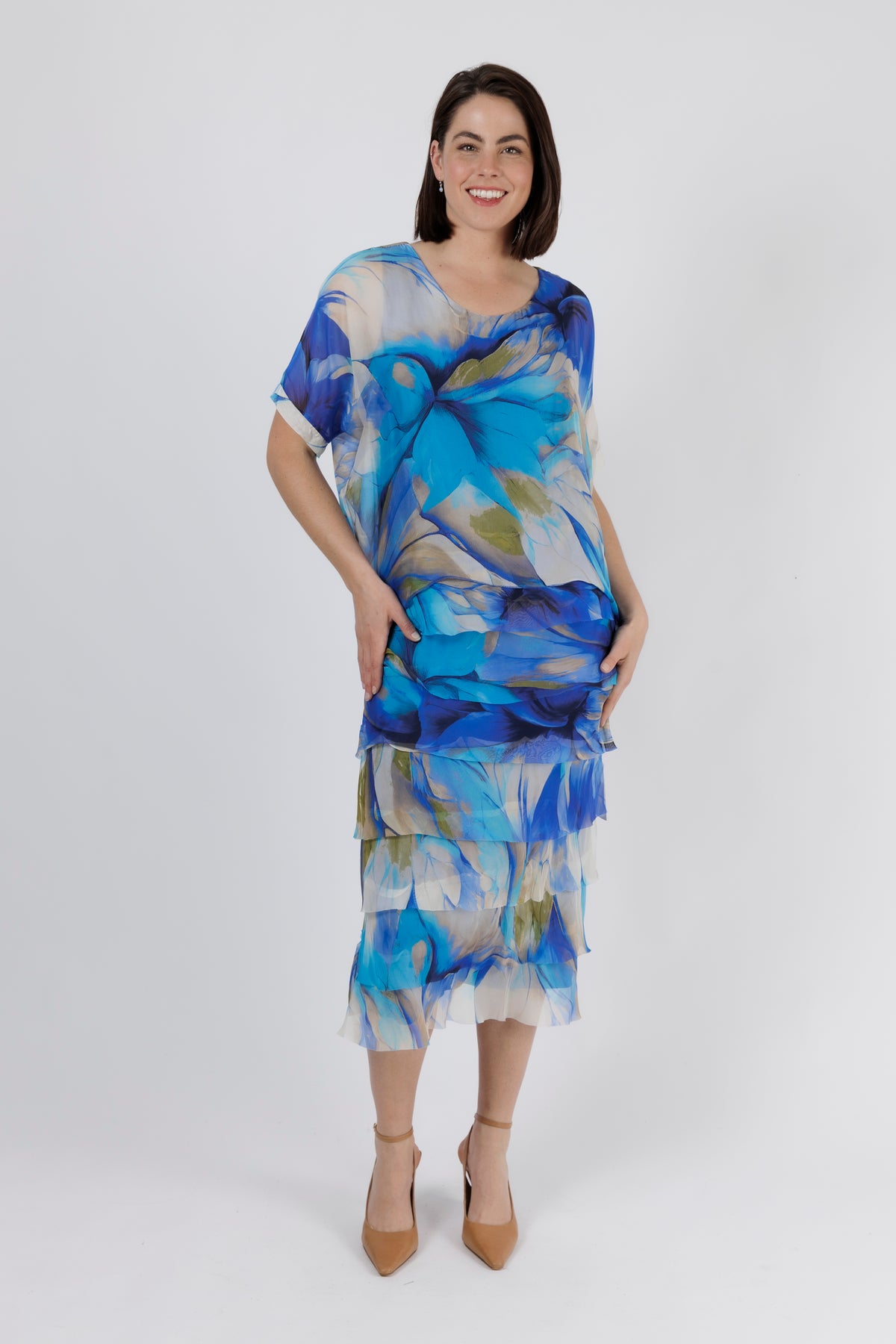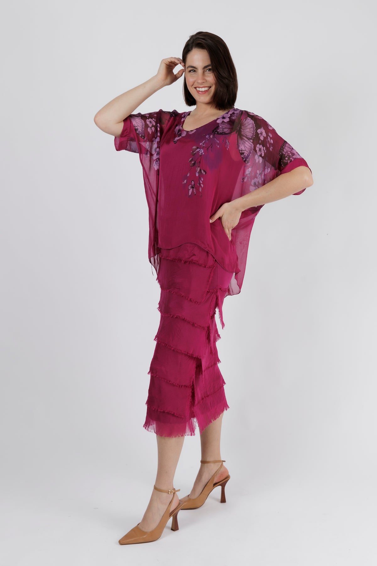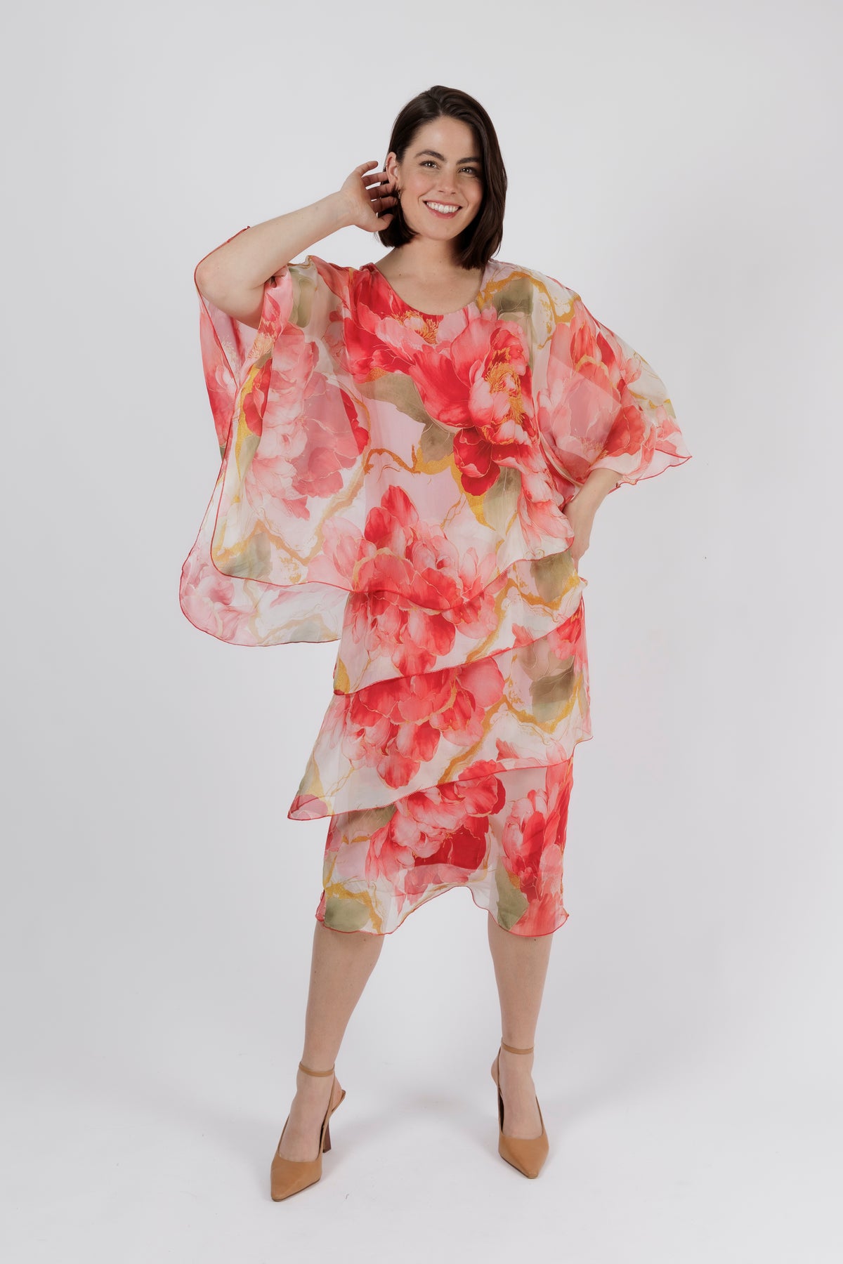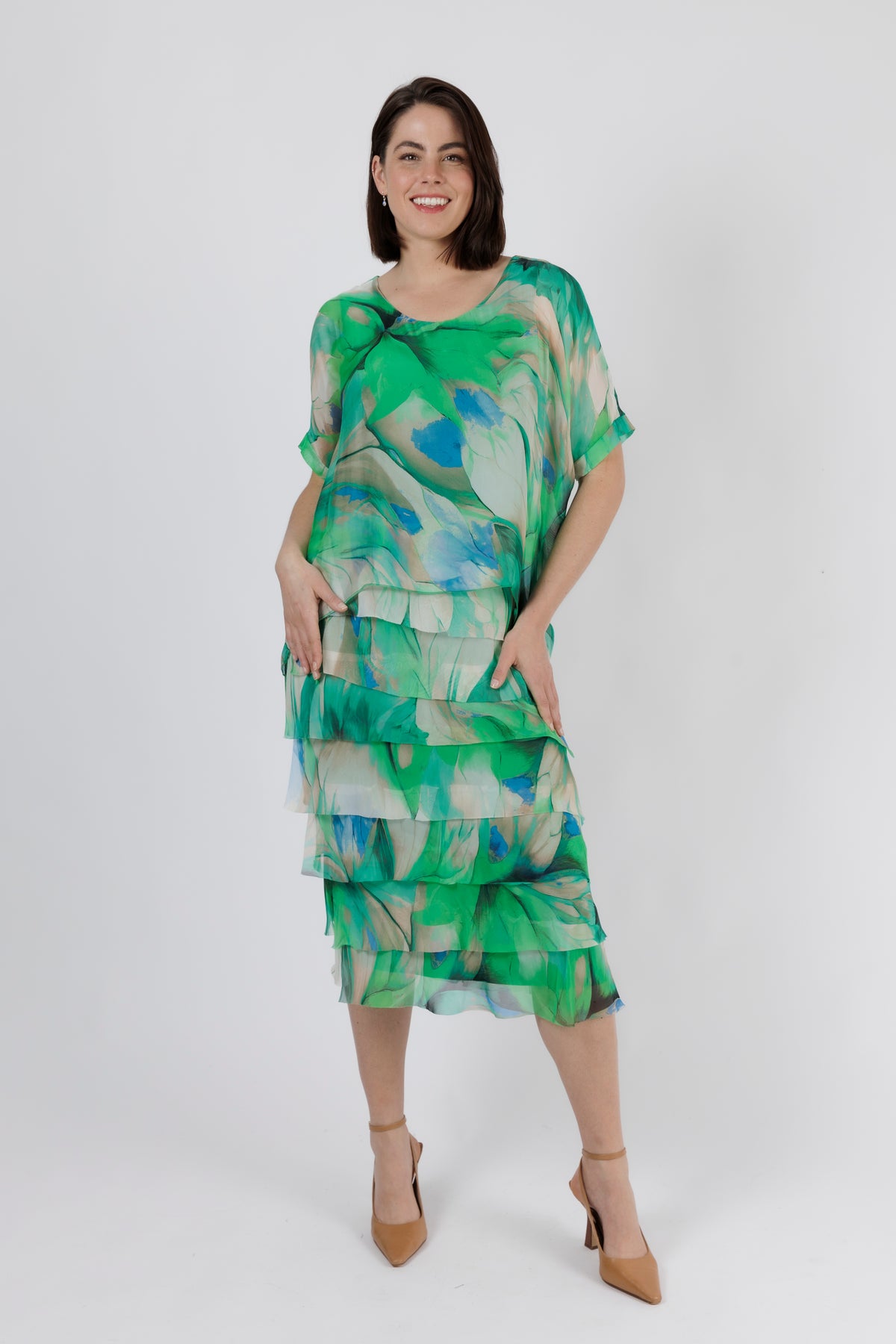 - Layers of silk blend fabric, with raw hems, create a flattering tiered silhouette from the waist down