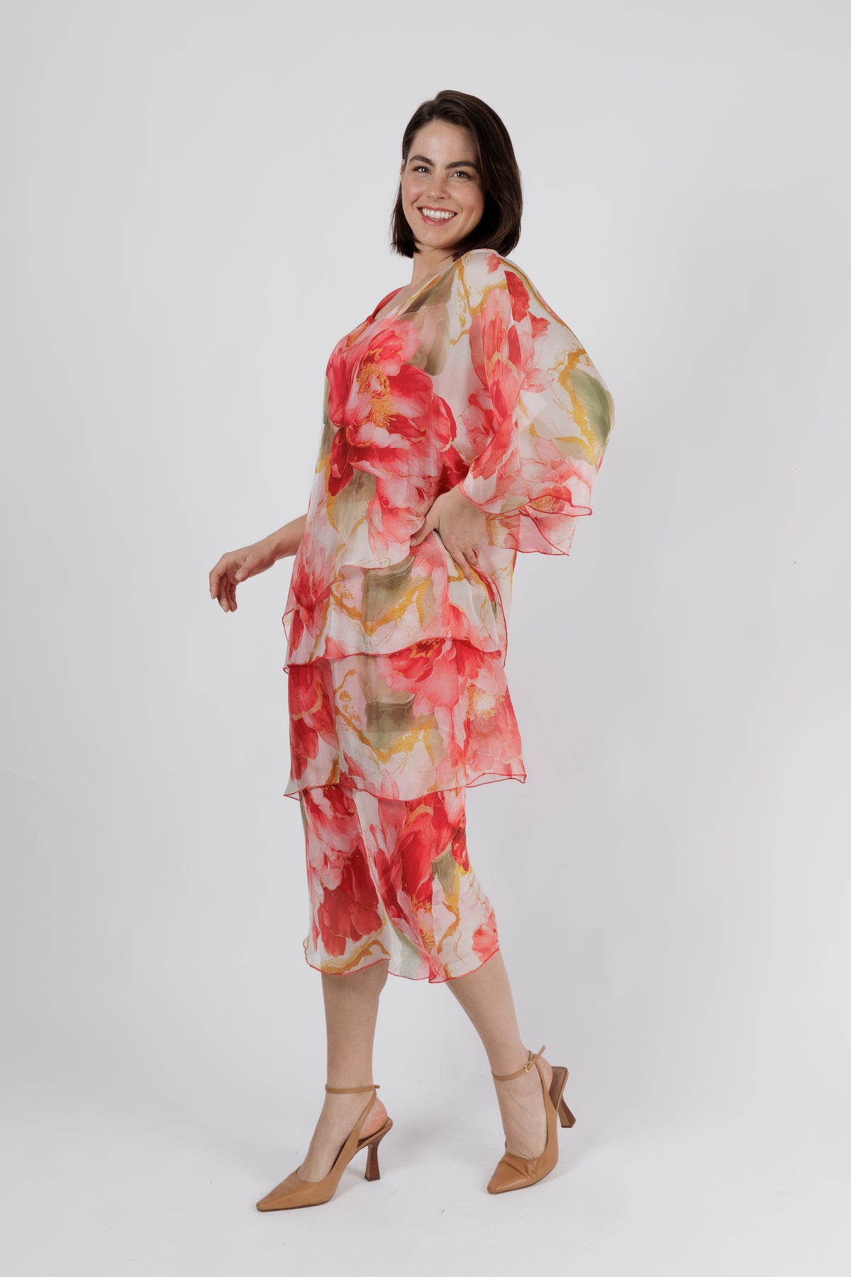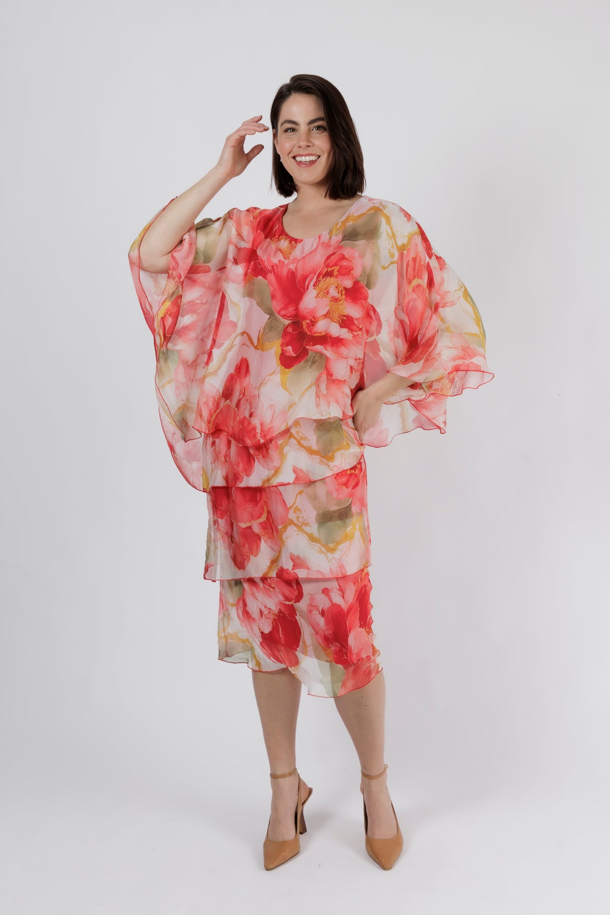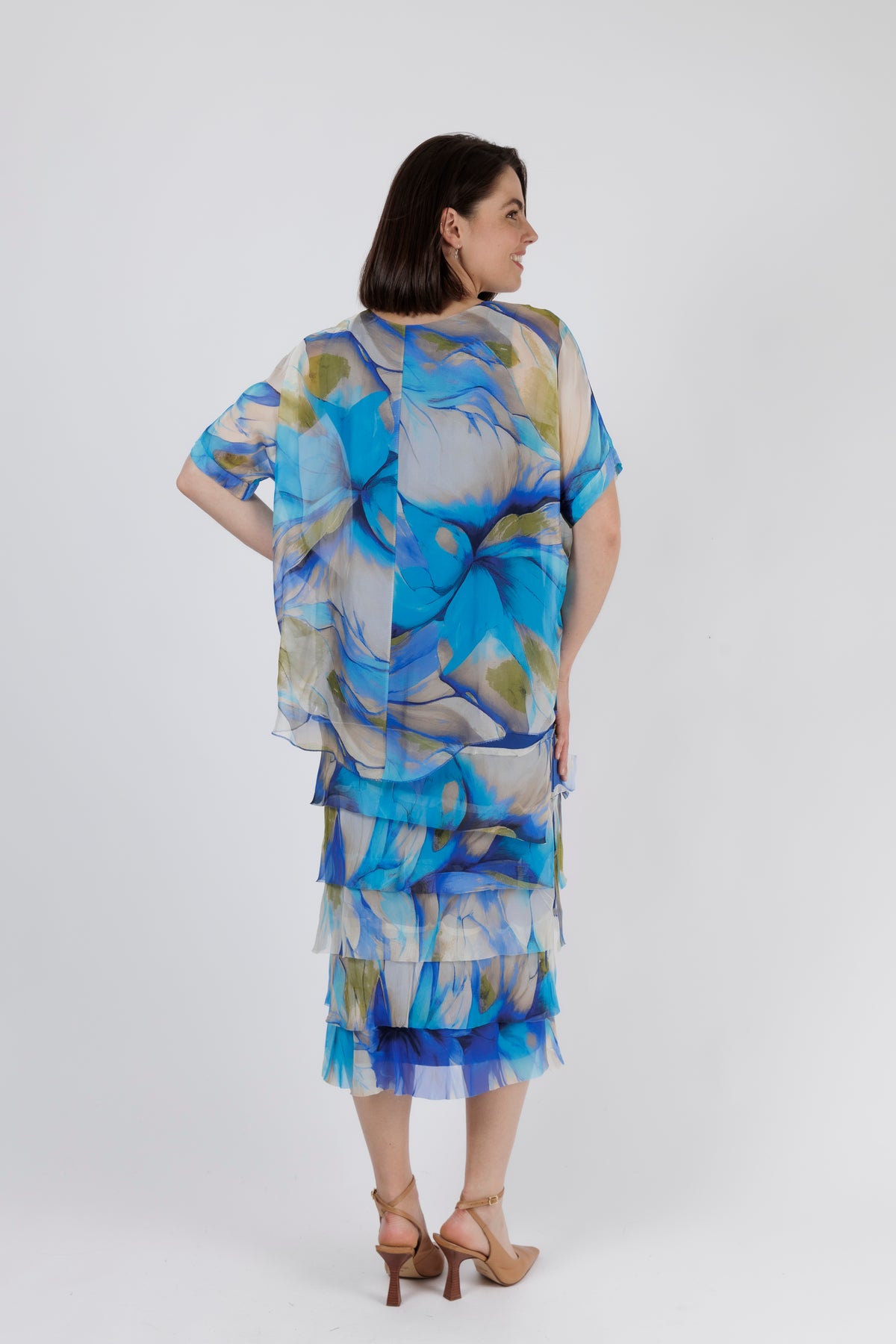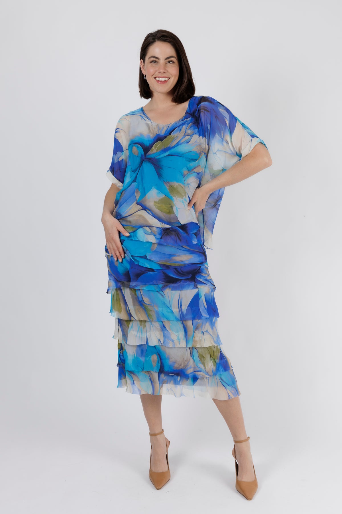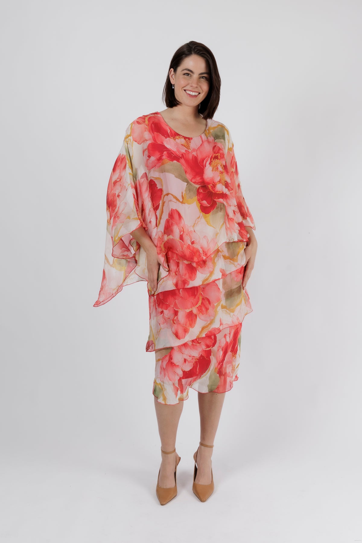 - Layers of silk blend fabric, with raw hems, create a flattering tiered silhouette from the waist down