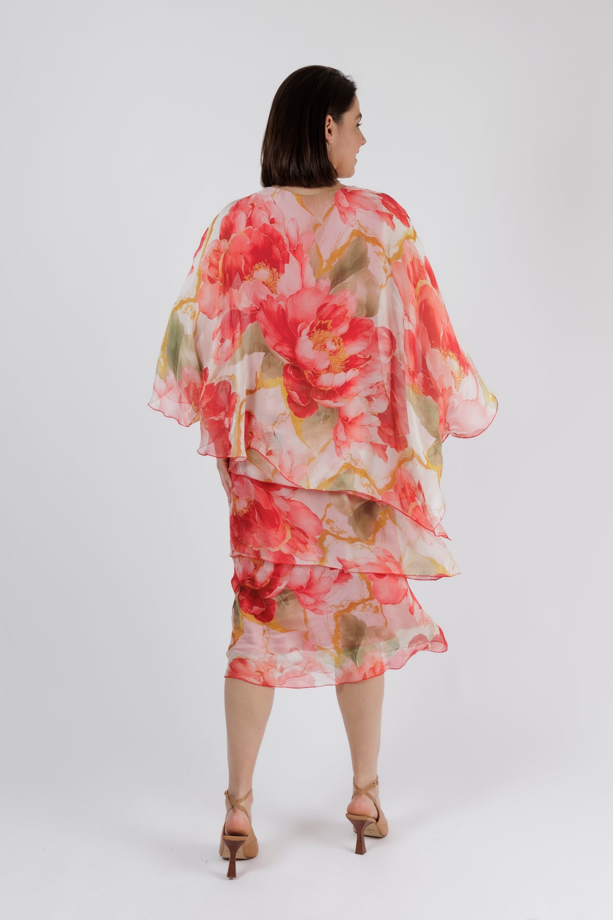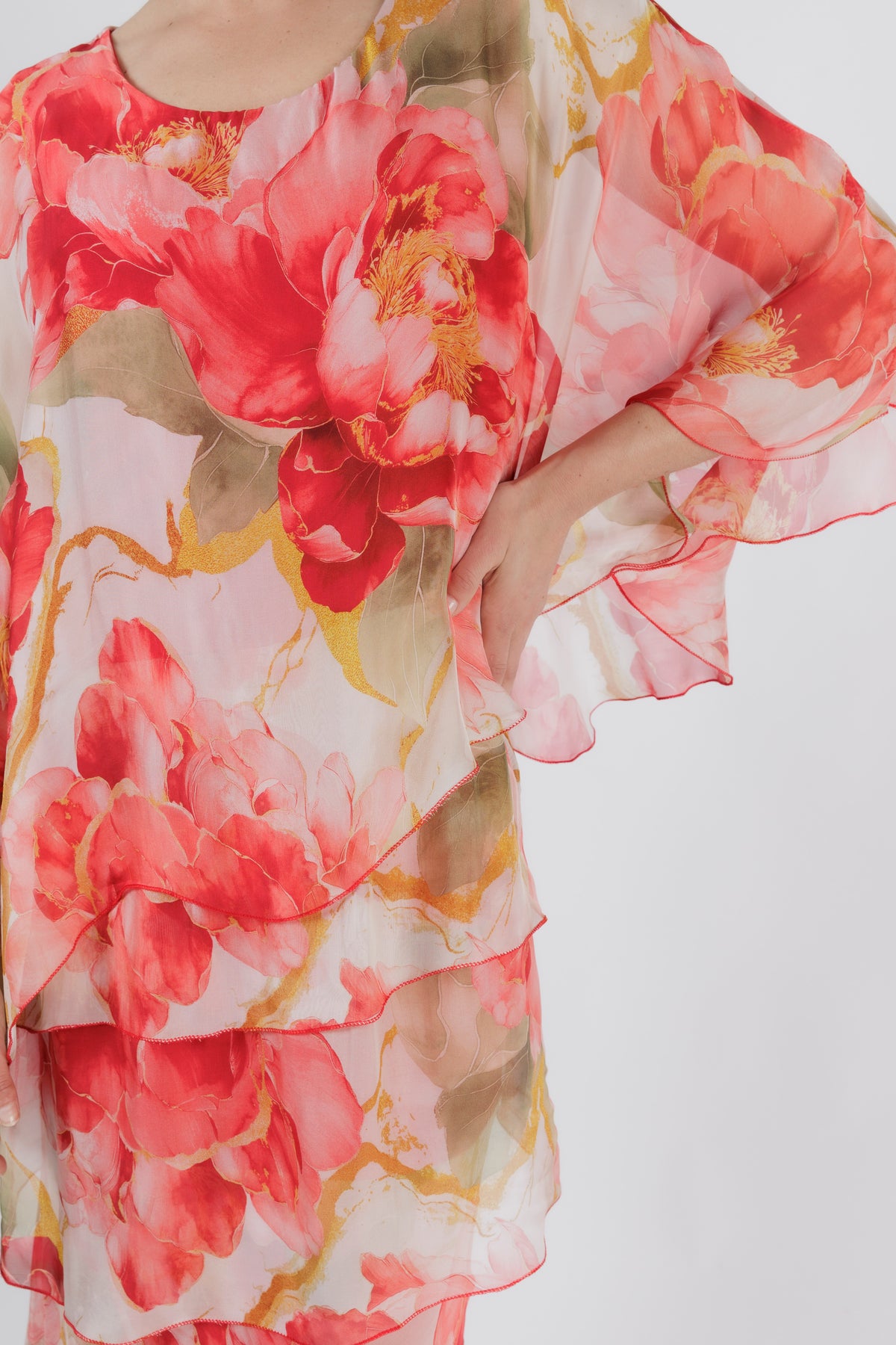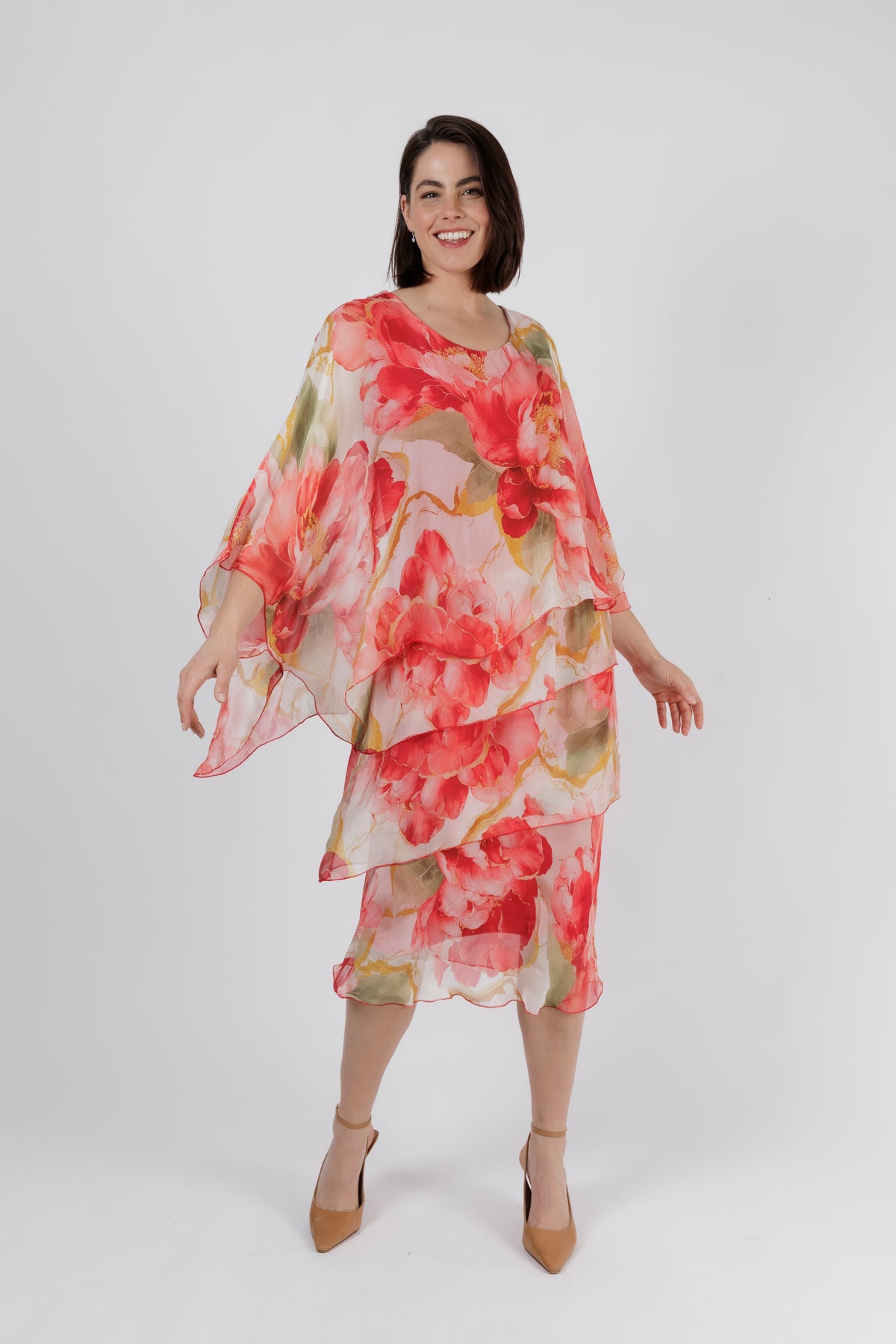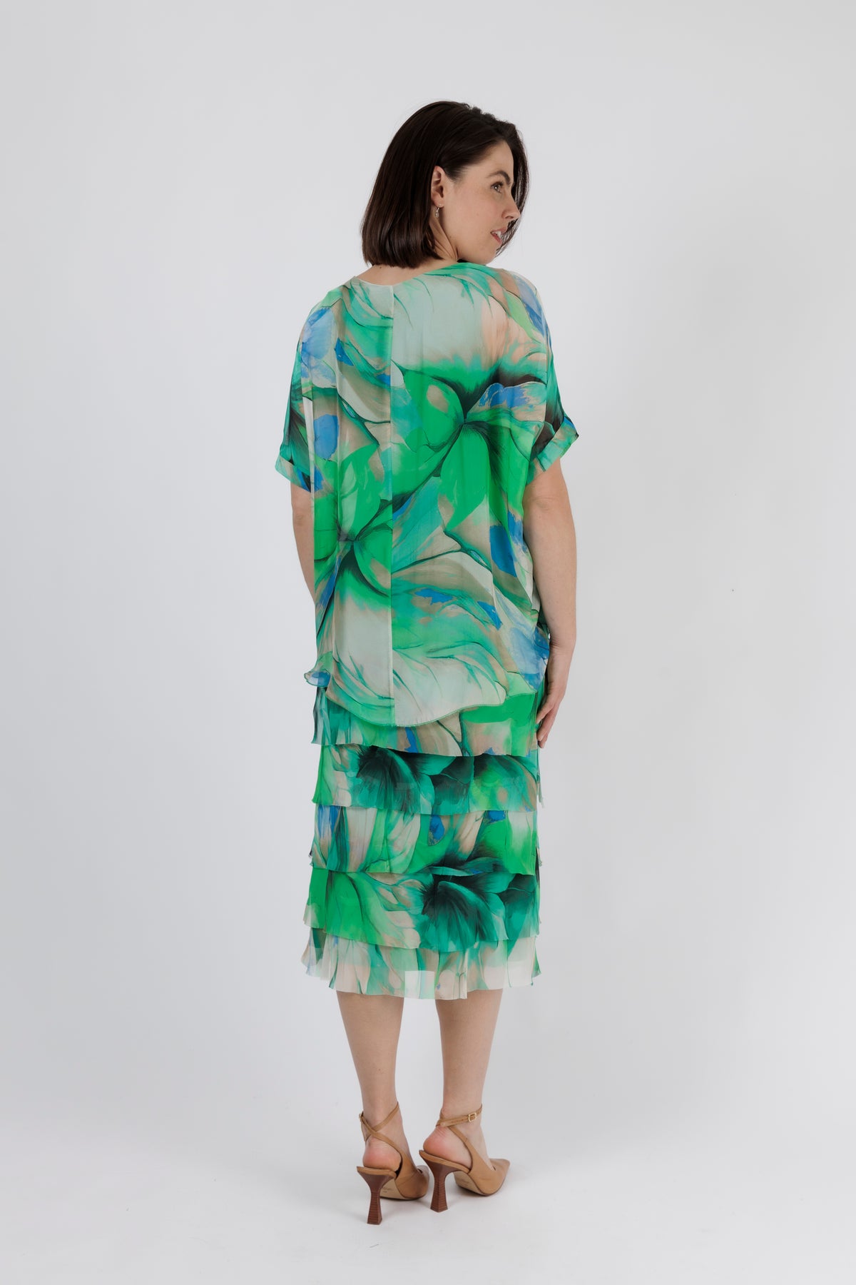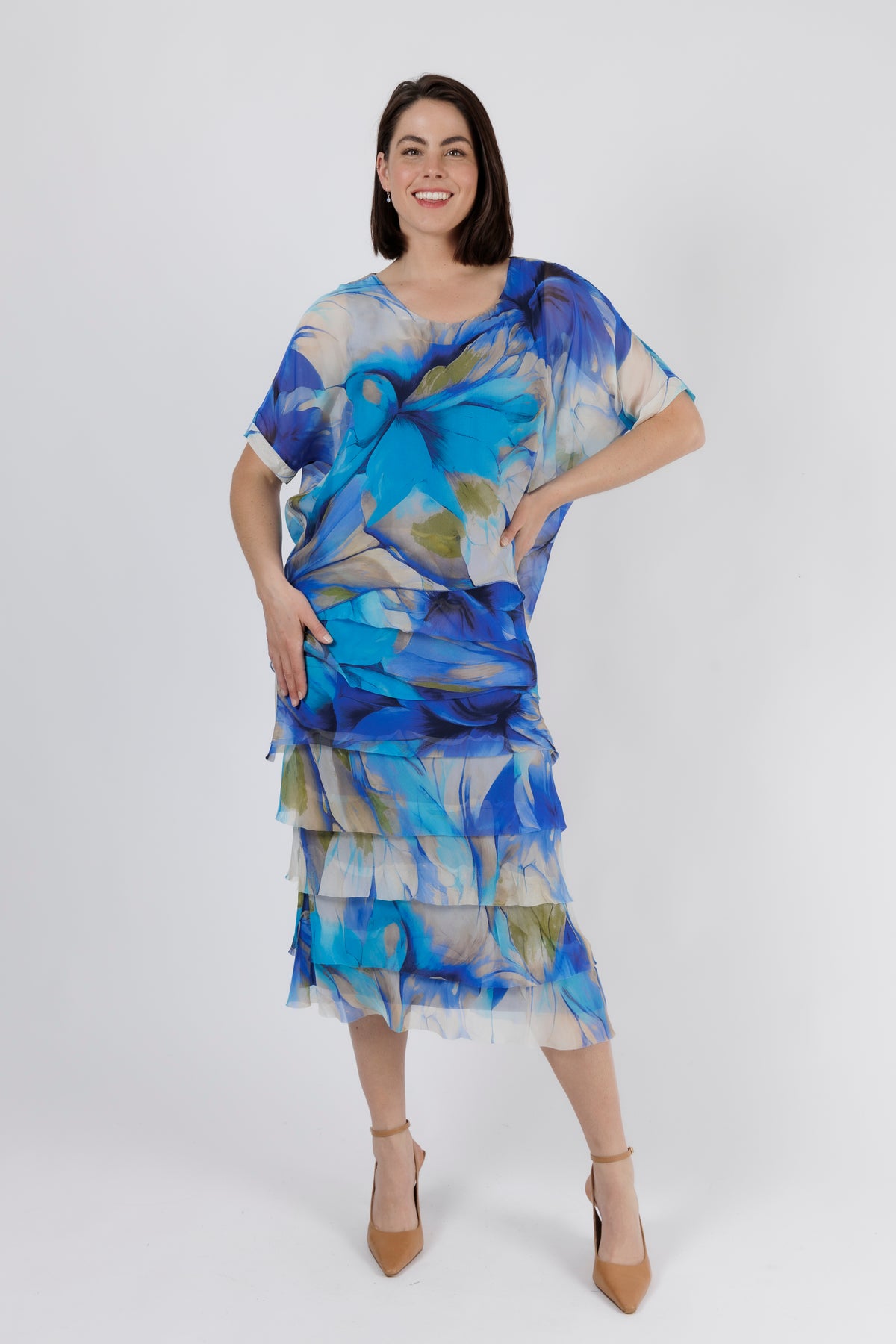 - Layers of silk blend fabric, with raw hems, create a flattering tiered silhouette from the waist down