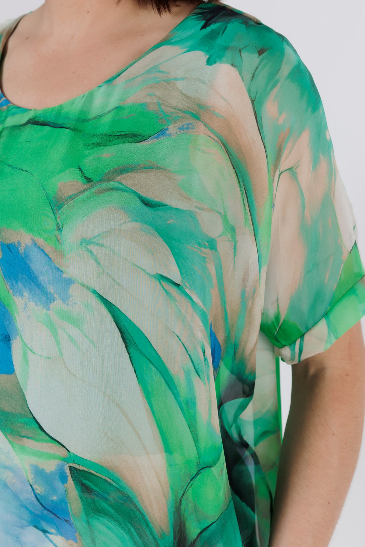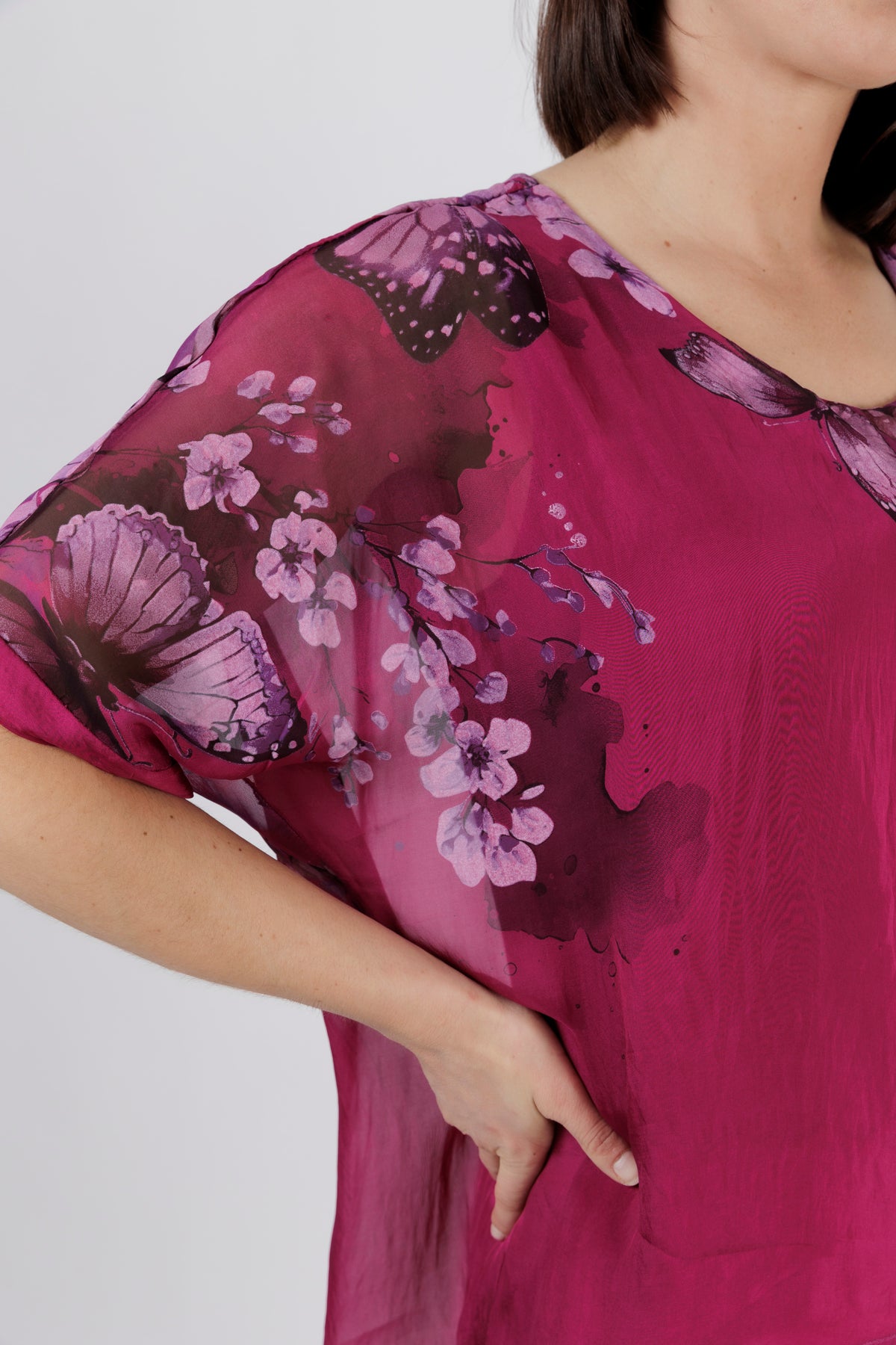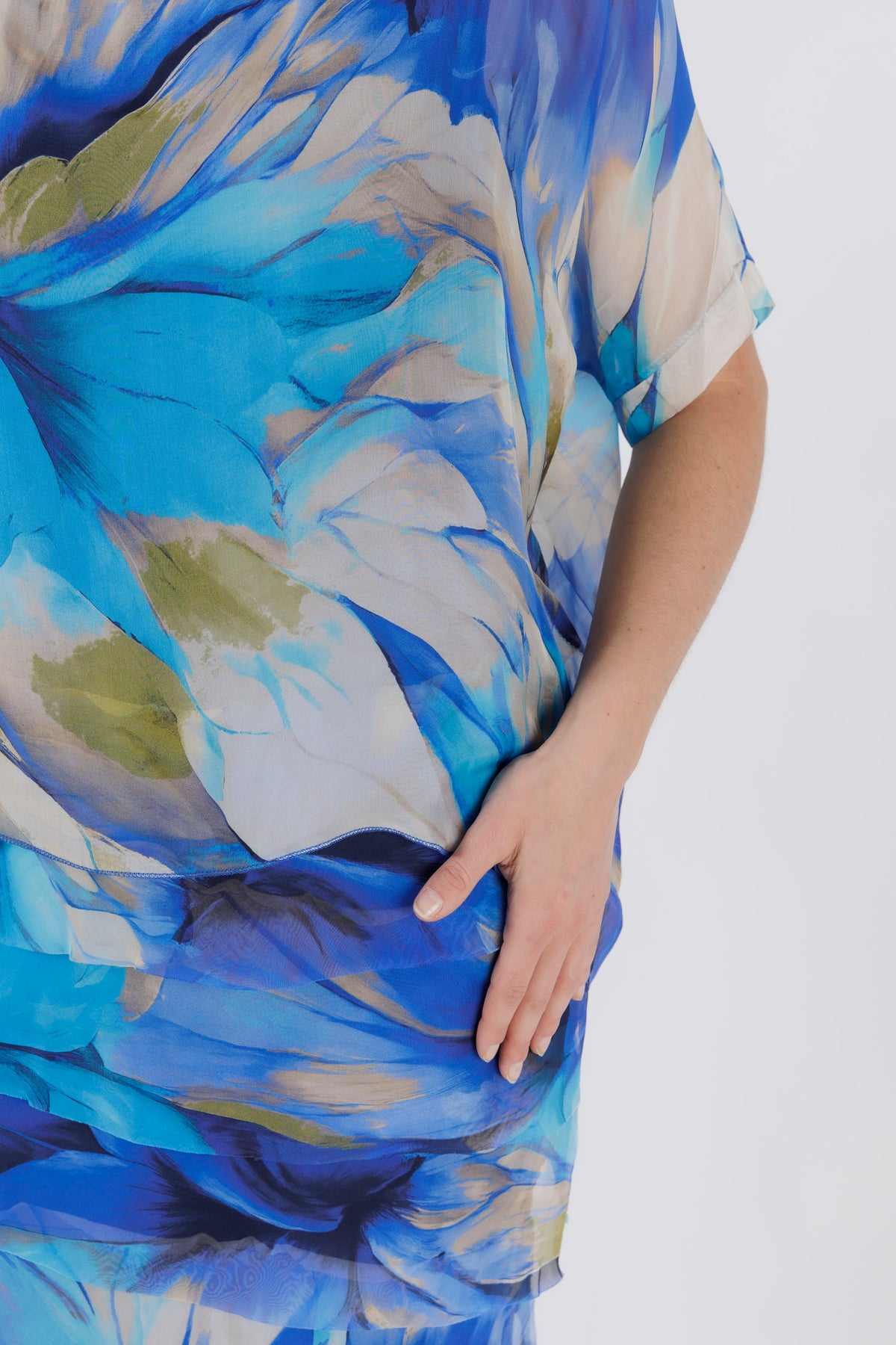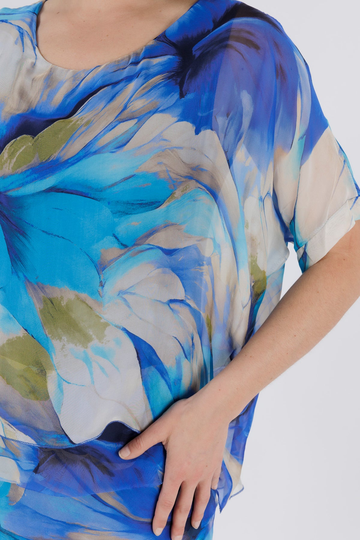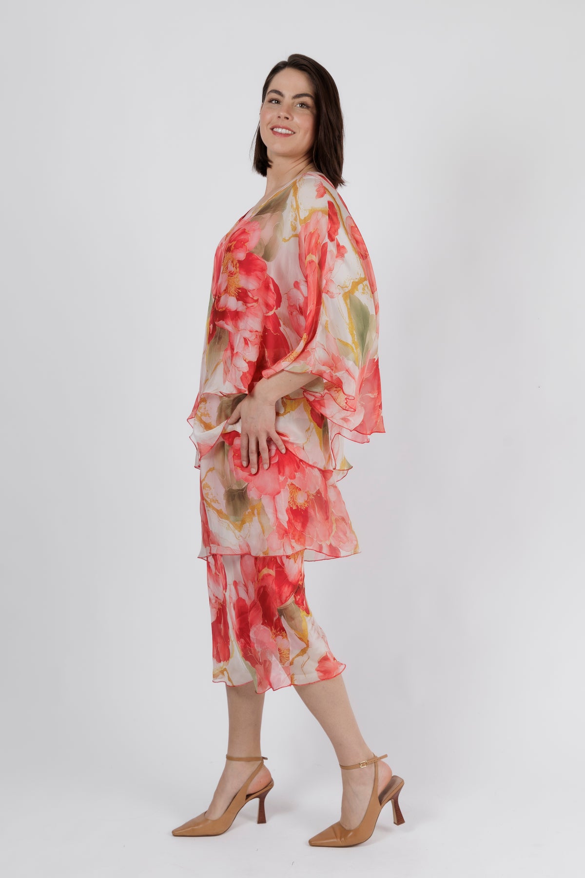 - Layers of silk blend fabric, with raw hems, create a flattering tiered silhouette from the waist down