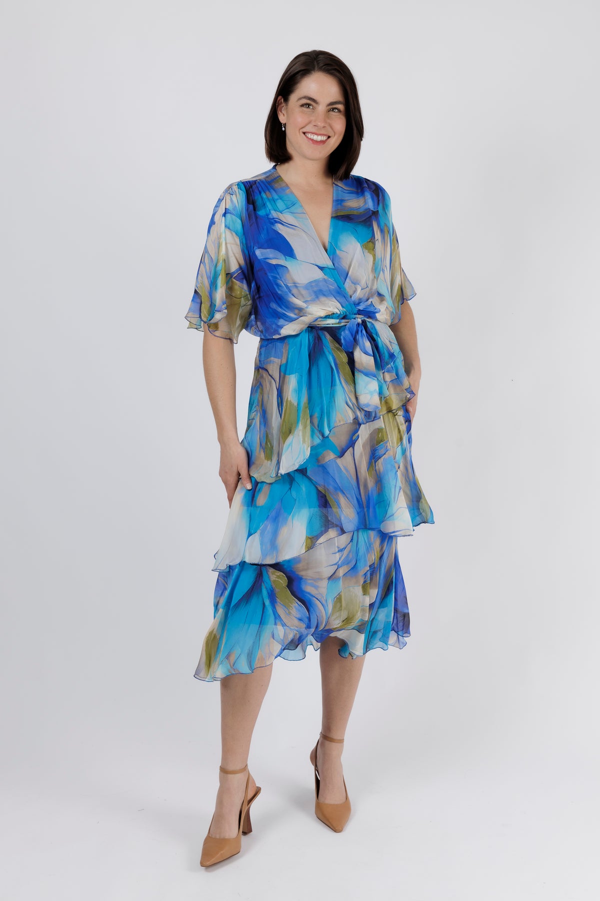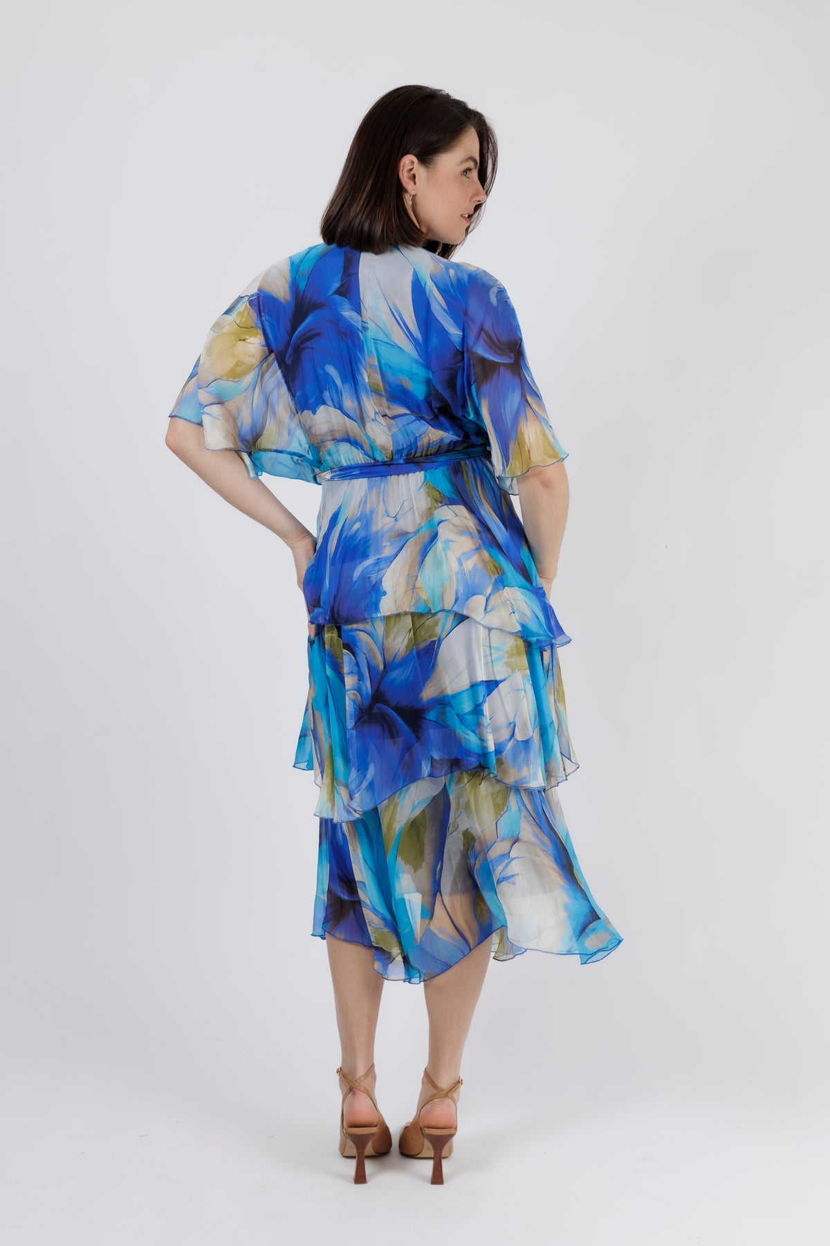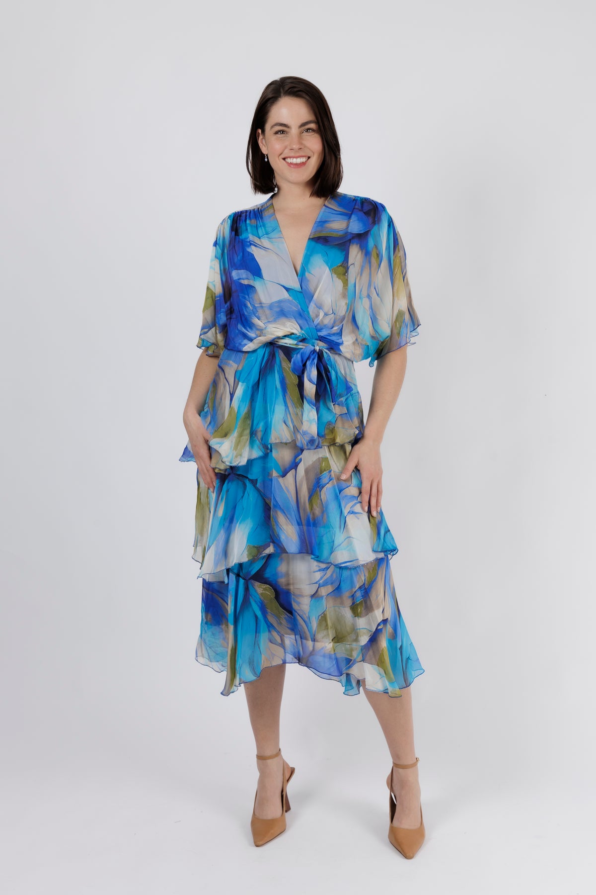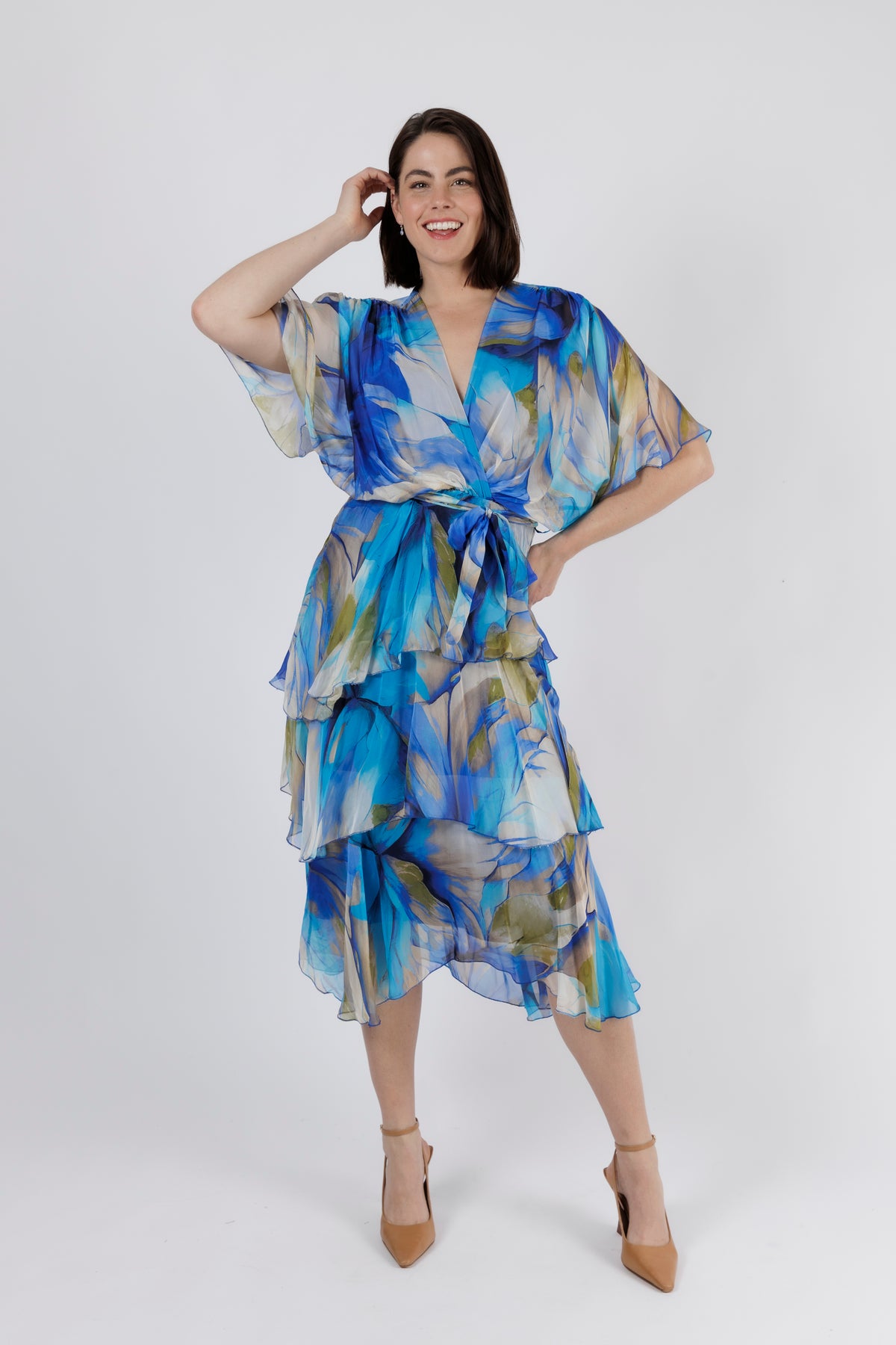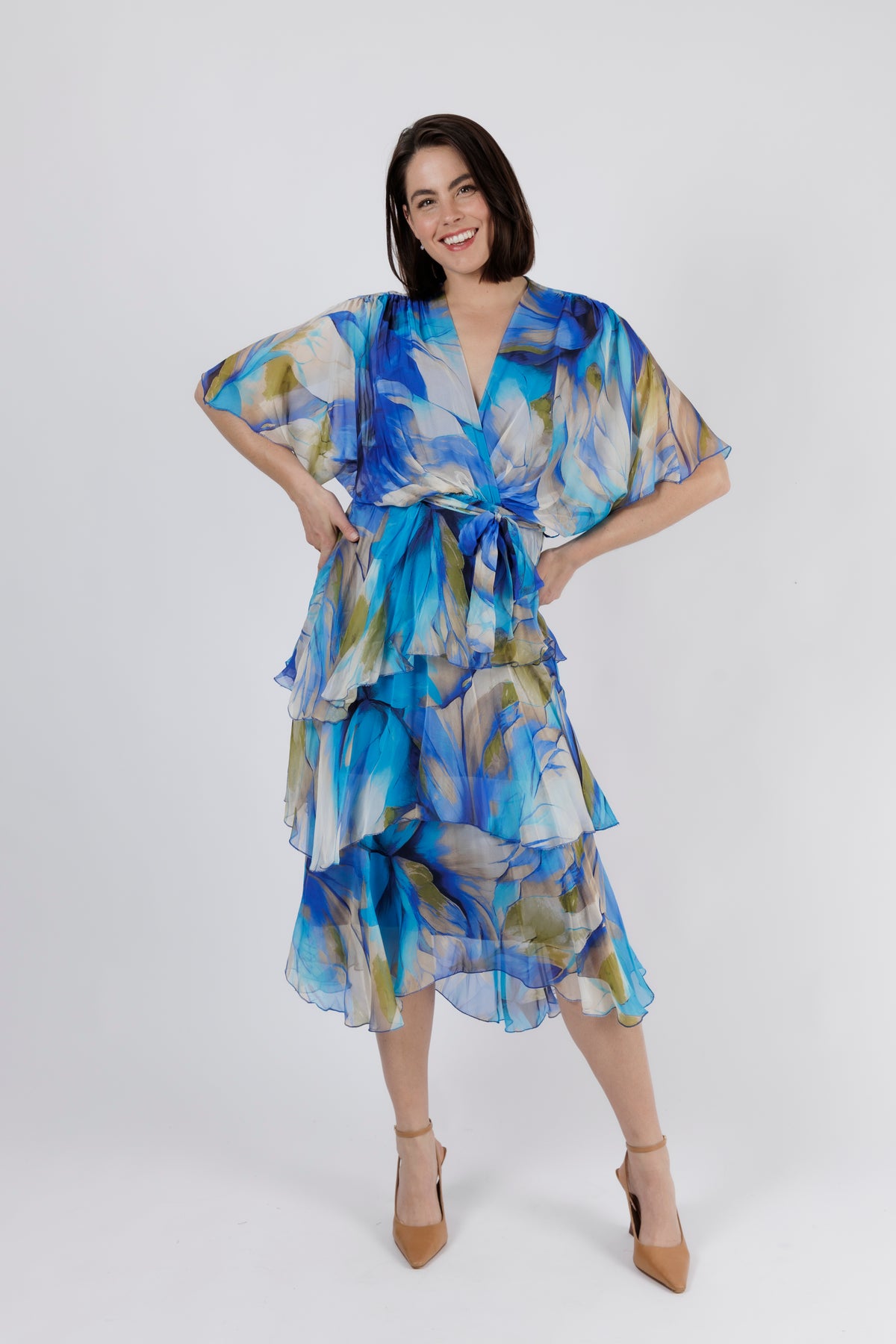 - Falls to a midi length with cascading silk layers