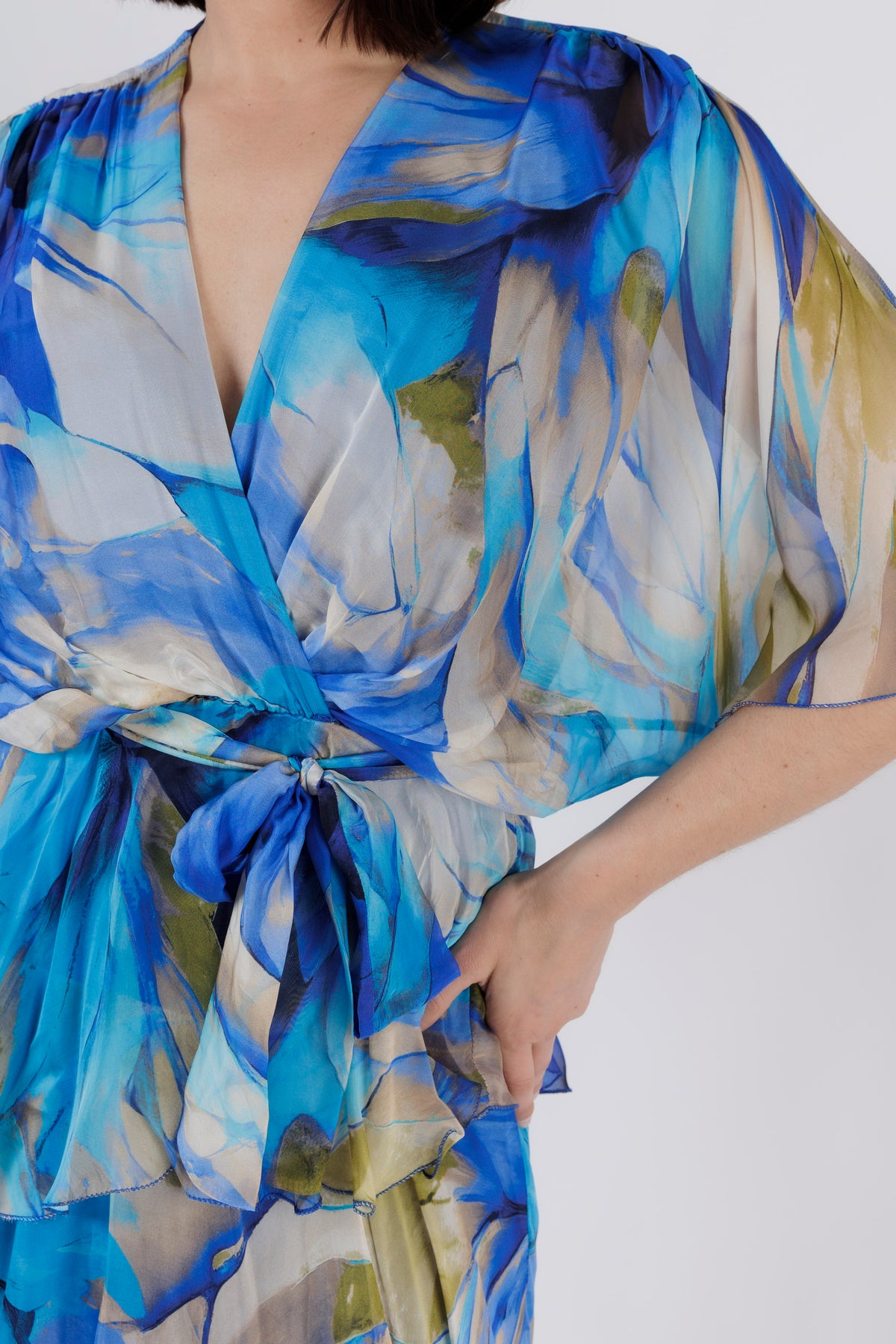 - Deep V-neckline and elbow-length fluttery sheer sleeves