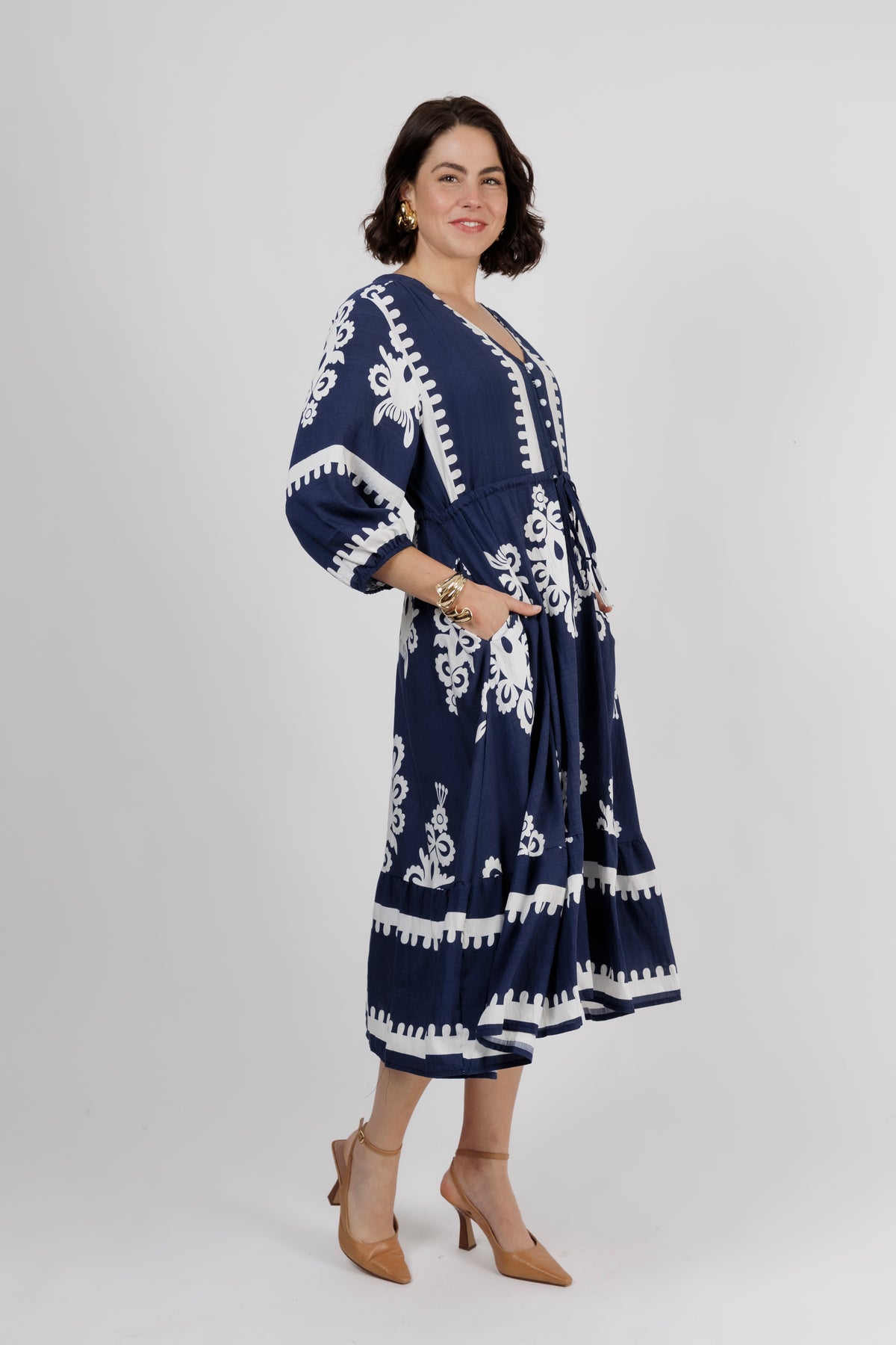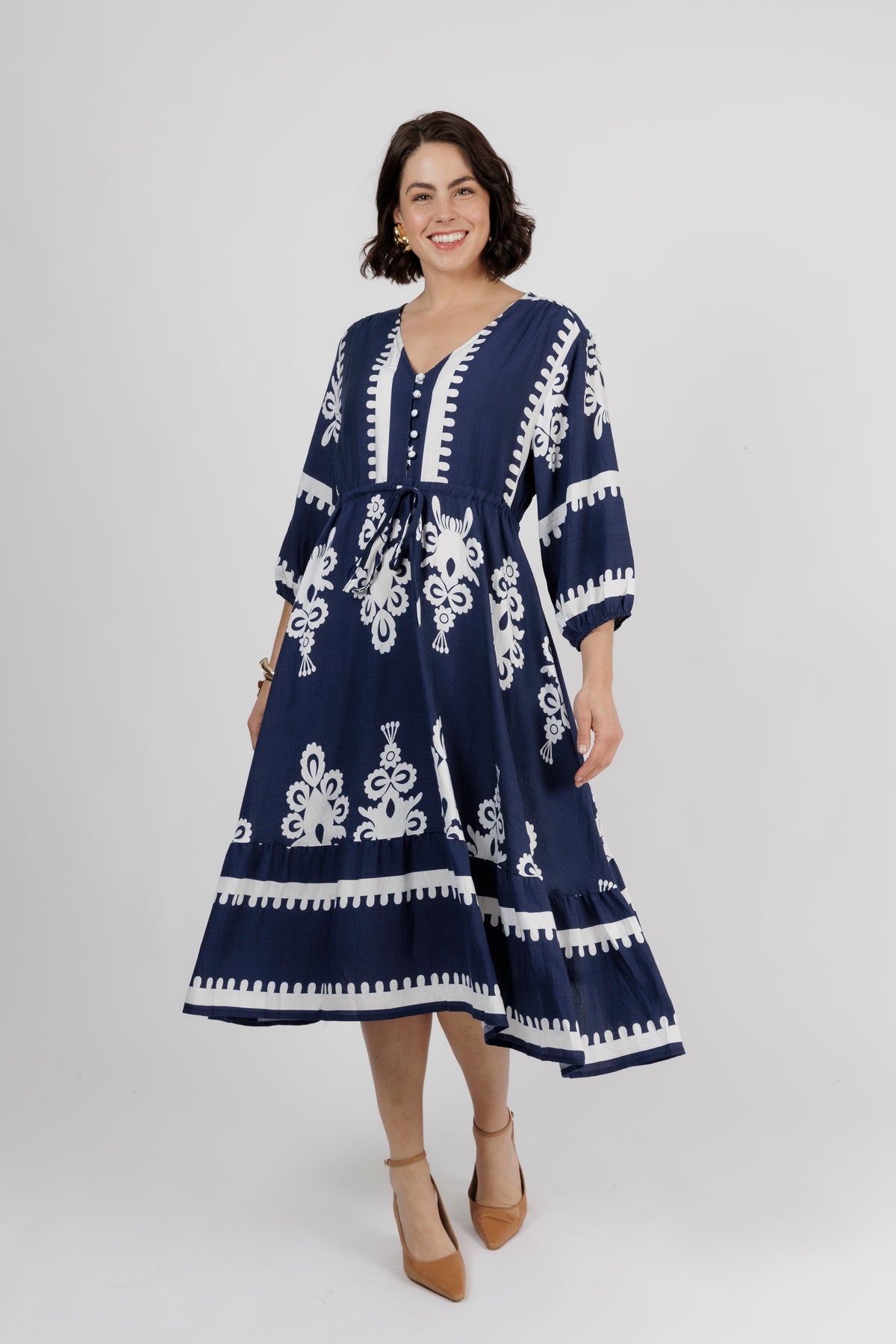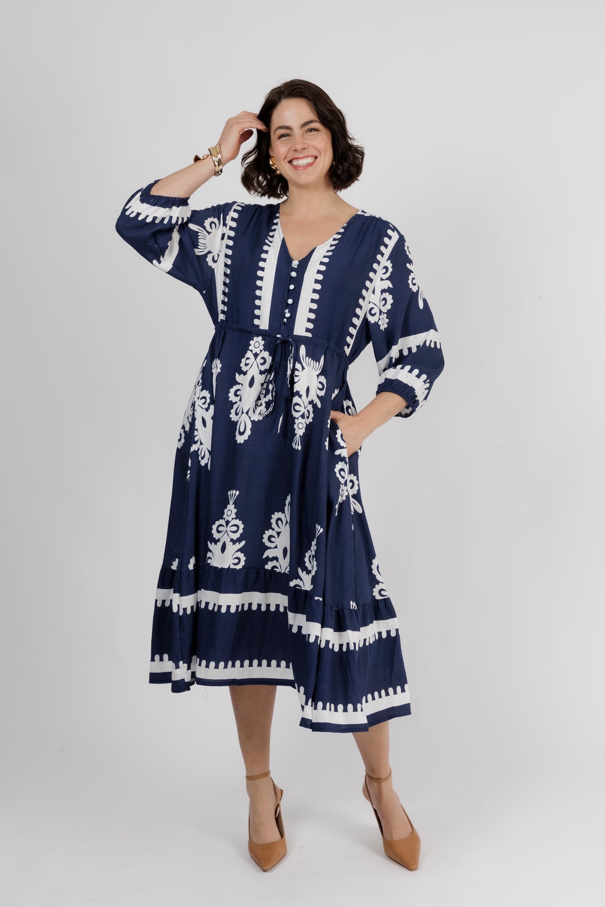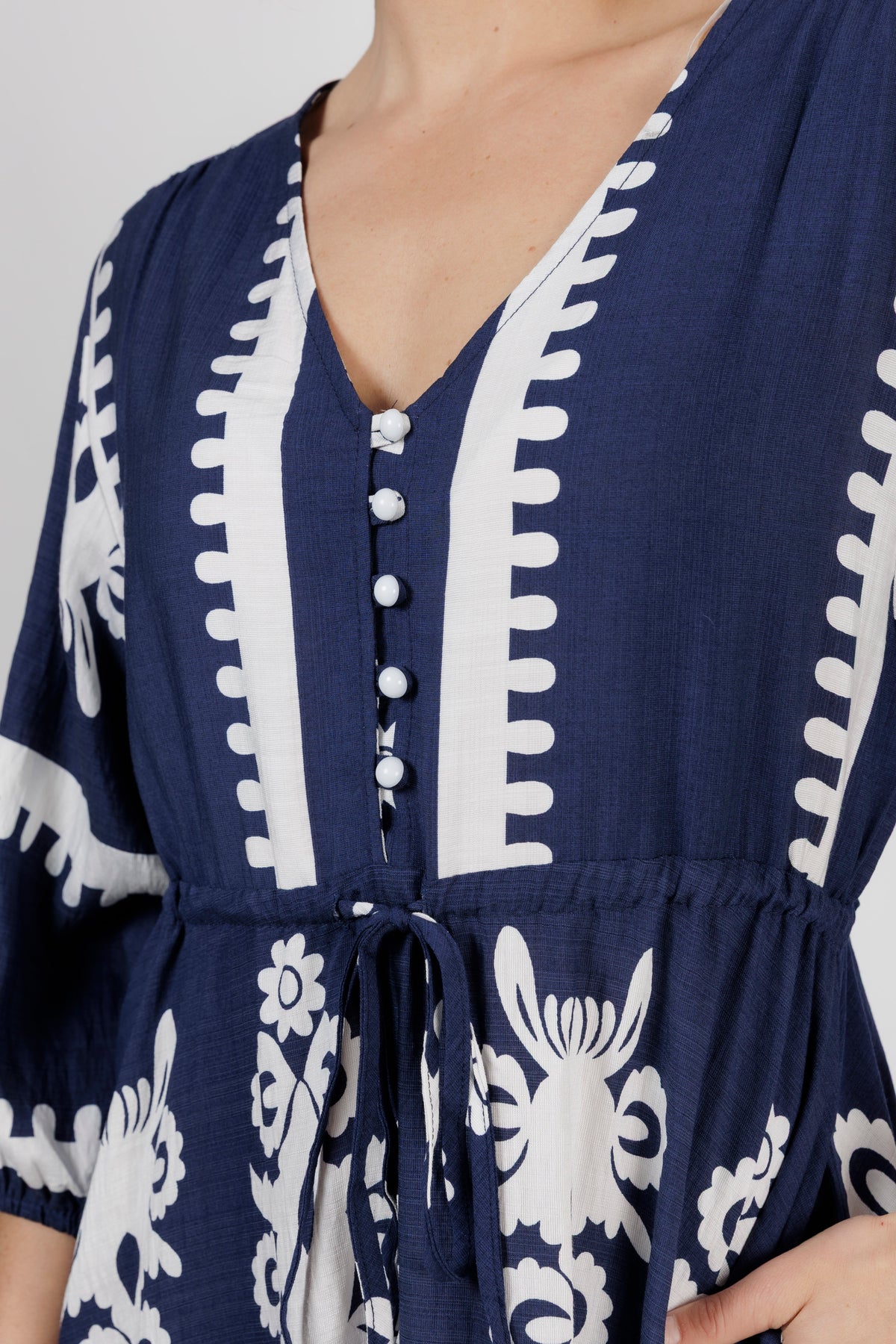 The dress features an intricate white pattern on deep navy fabric, a flattering V-neckline with button detail, and a gently gathered waist with adjustable drawstring ties for a perfect fit. The three-quarter sleeves and tiered hem add a touch of bohemian charm, while side pockets provide everyday comfort and practicality.