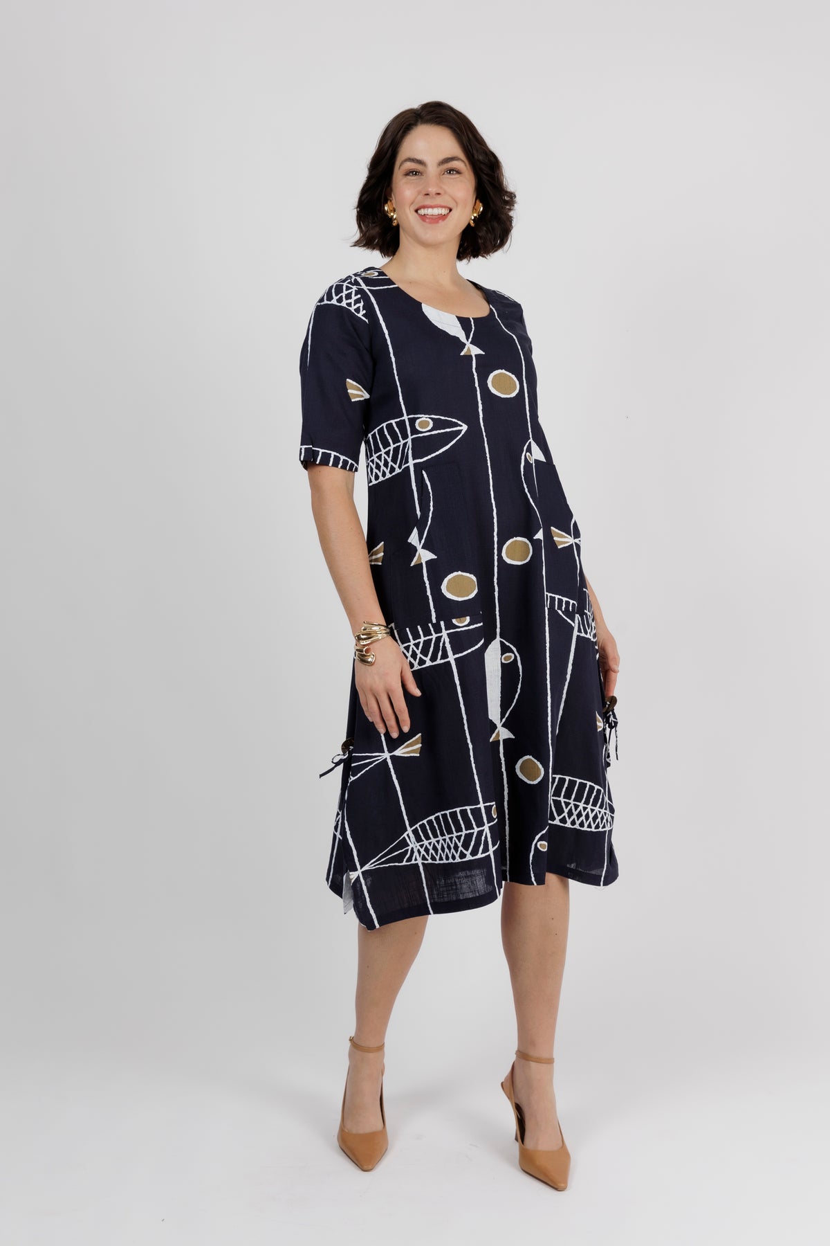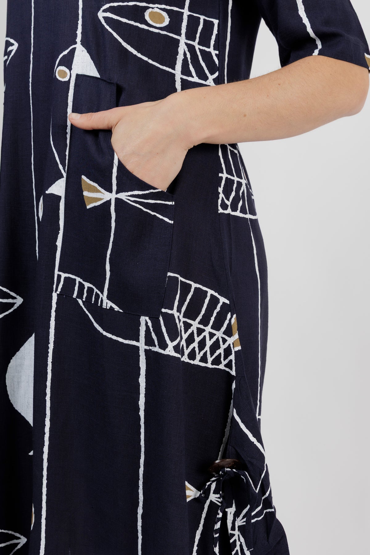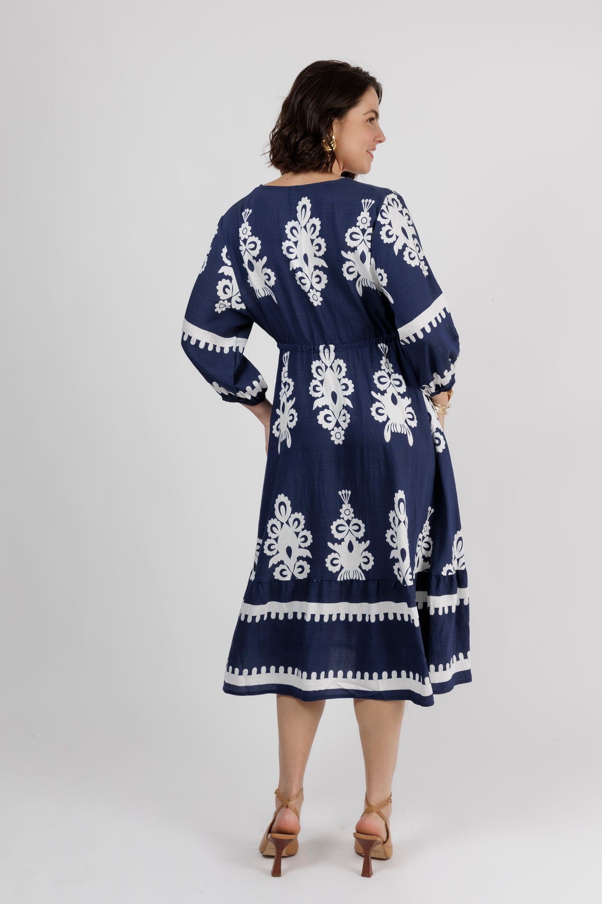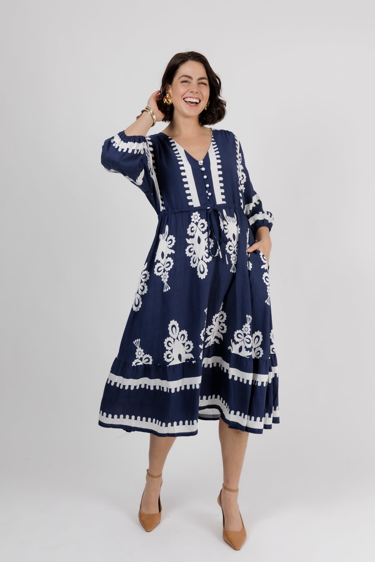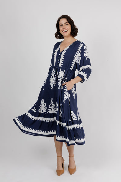 The dress features an intricate white pattern on deep navy fabric, a flattering V-neckline with button detail, and a gently gathered waist with adjustable drawstring ties for a perfect fit. The three-quarter sleeves and tiered hem add a touch of bohemian charm, while side pockets provide everyday comfort and practicality.