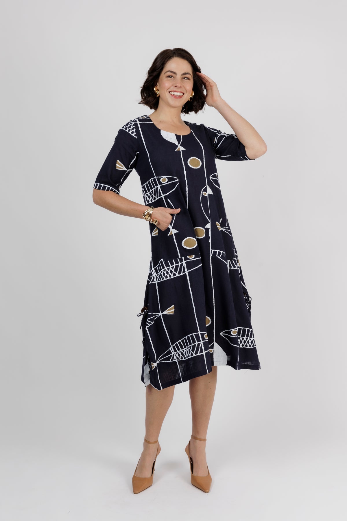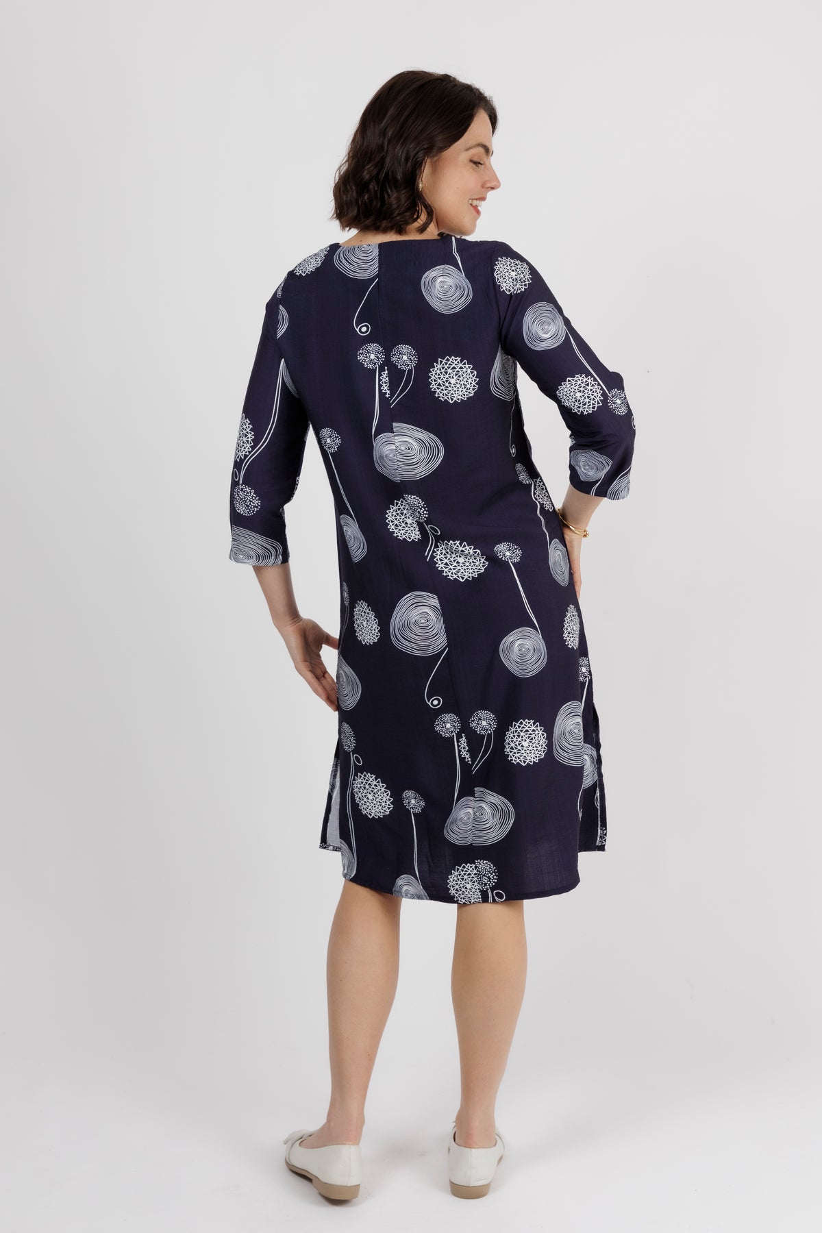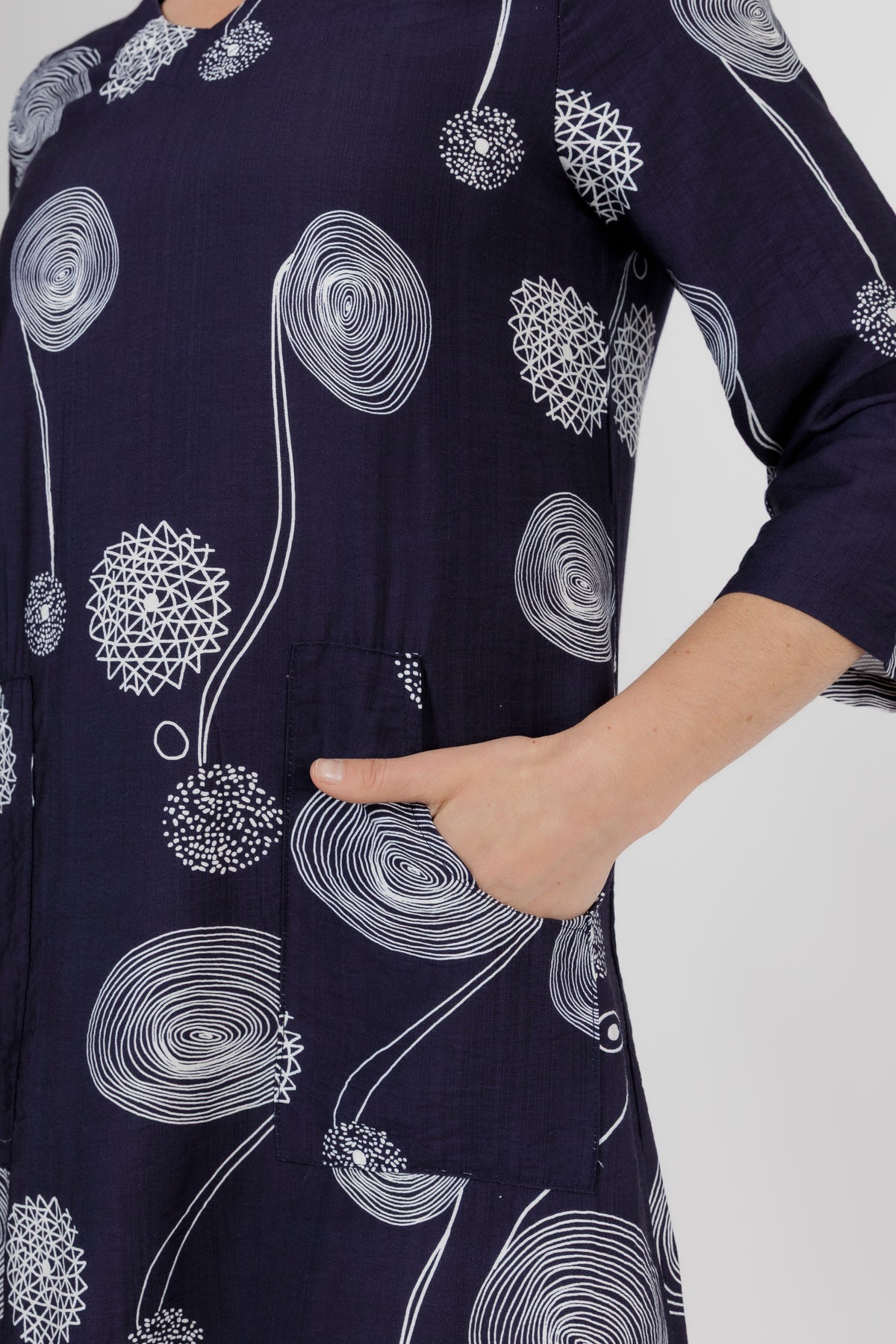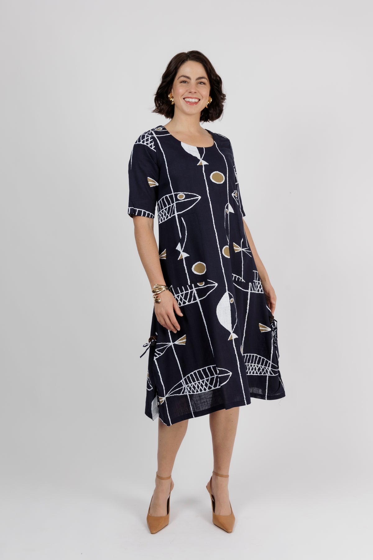 The dress features an intricate white pattern on deep navy fabric, a flattering V-neckline with button detail, and a gently gathered waist with adjustable drawstring ties for a perfect fit. The three-quarter sleeves and tiered hem add a touch of bohemian charm, while side pockets provide everyday comfort and practicality.