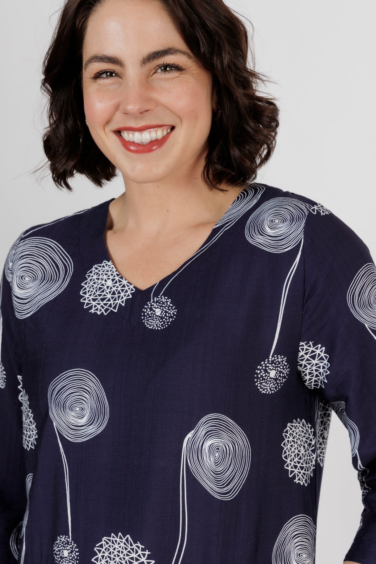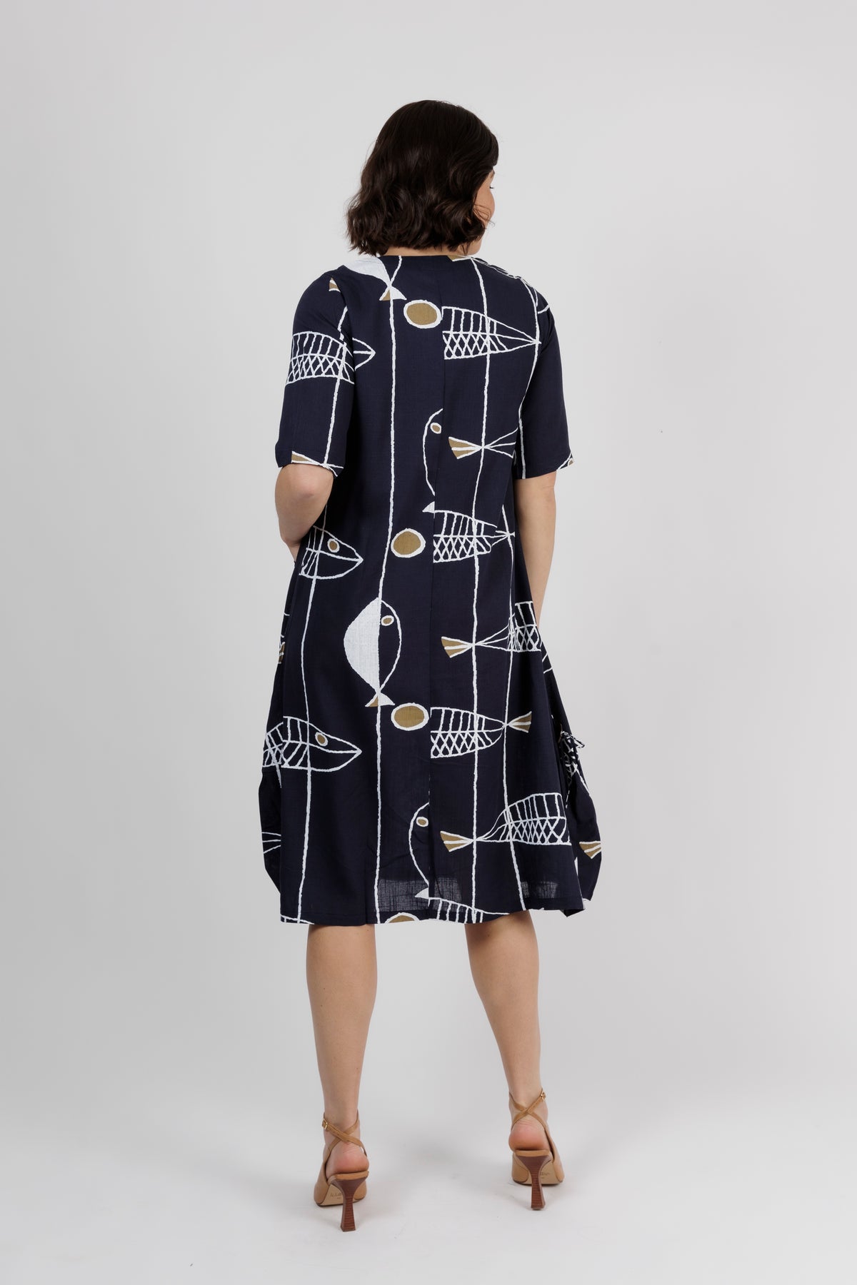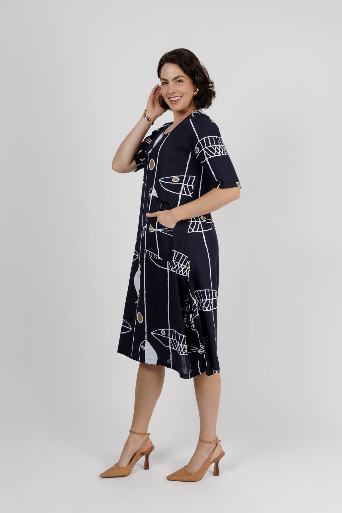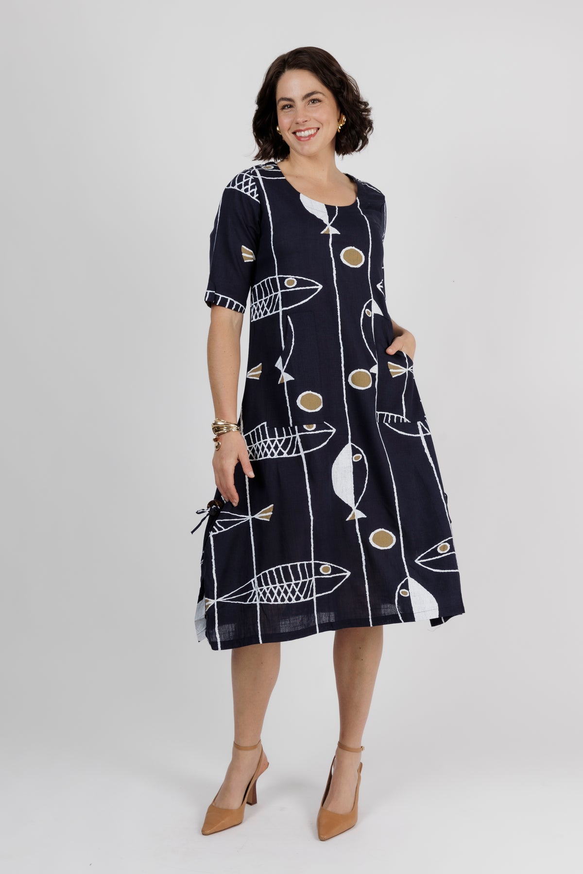 The dress features an intricate white pattern on deep navy fabric, a flattering V-neckline with button detail, and a gently gathered waist with adjustable drawstring ties for a perfect fit. The three-quarter sleeves and tiered hem add a touch of bohemian charm, while side pockets provide everyday comfort and practicality.