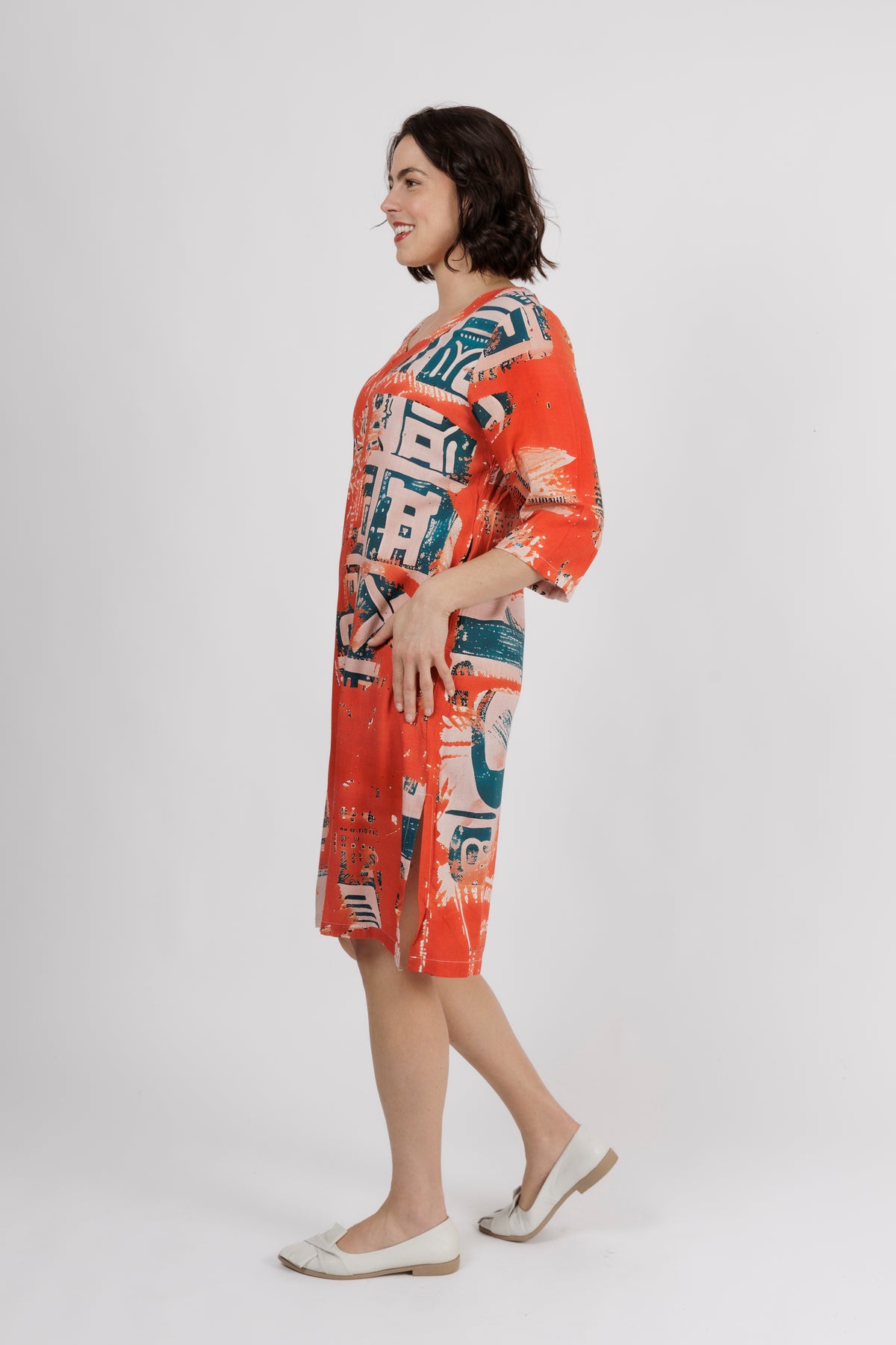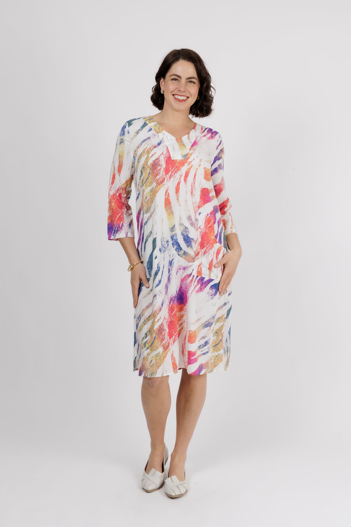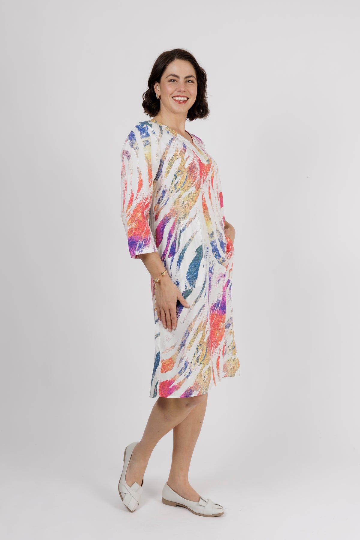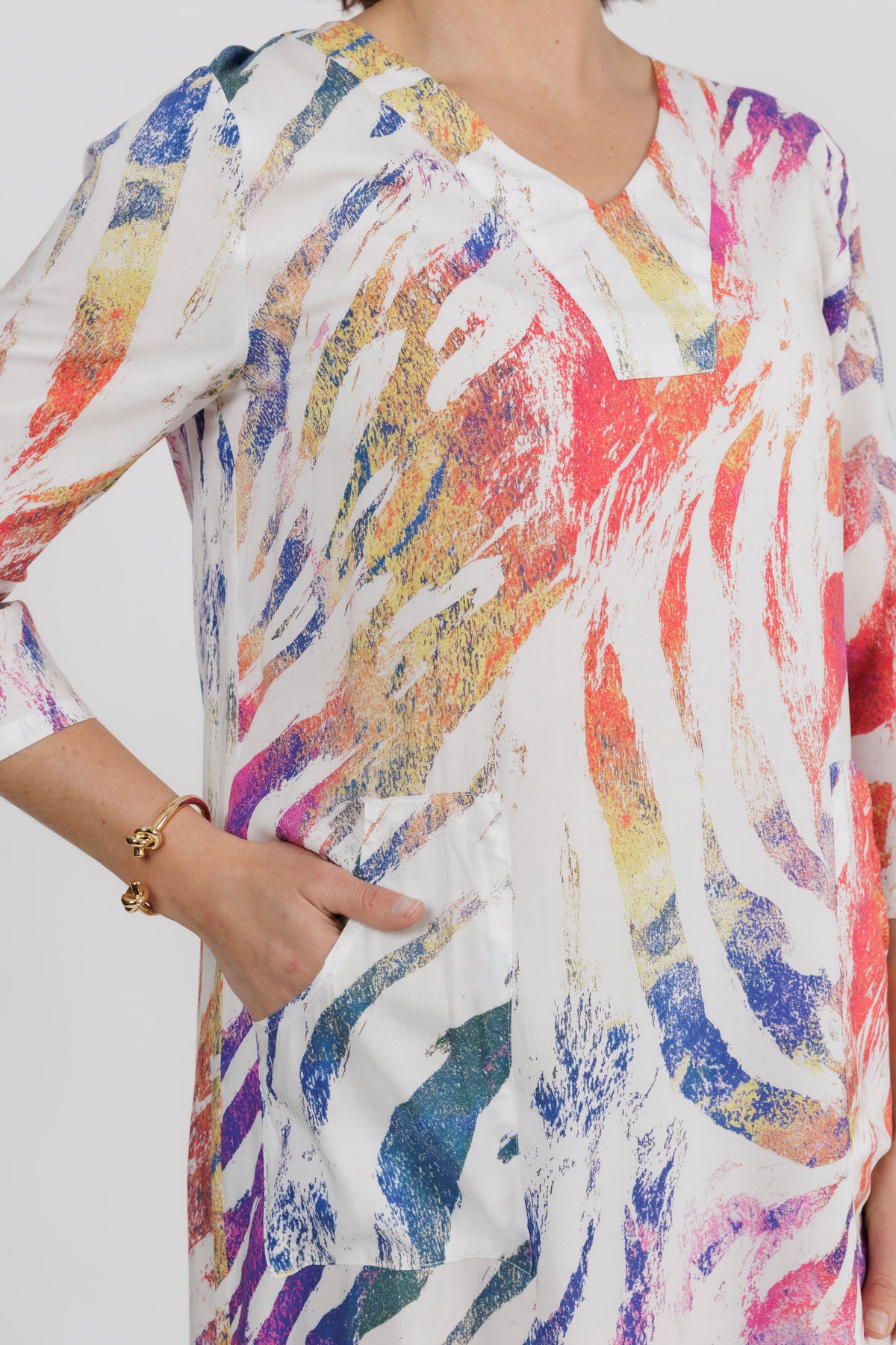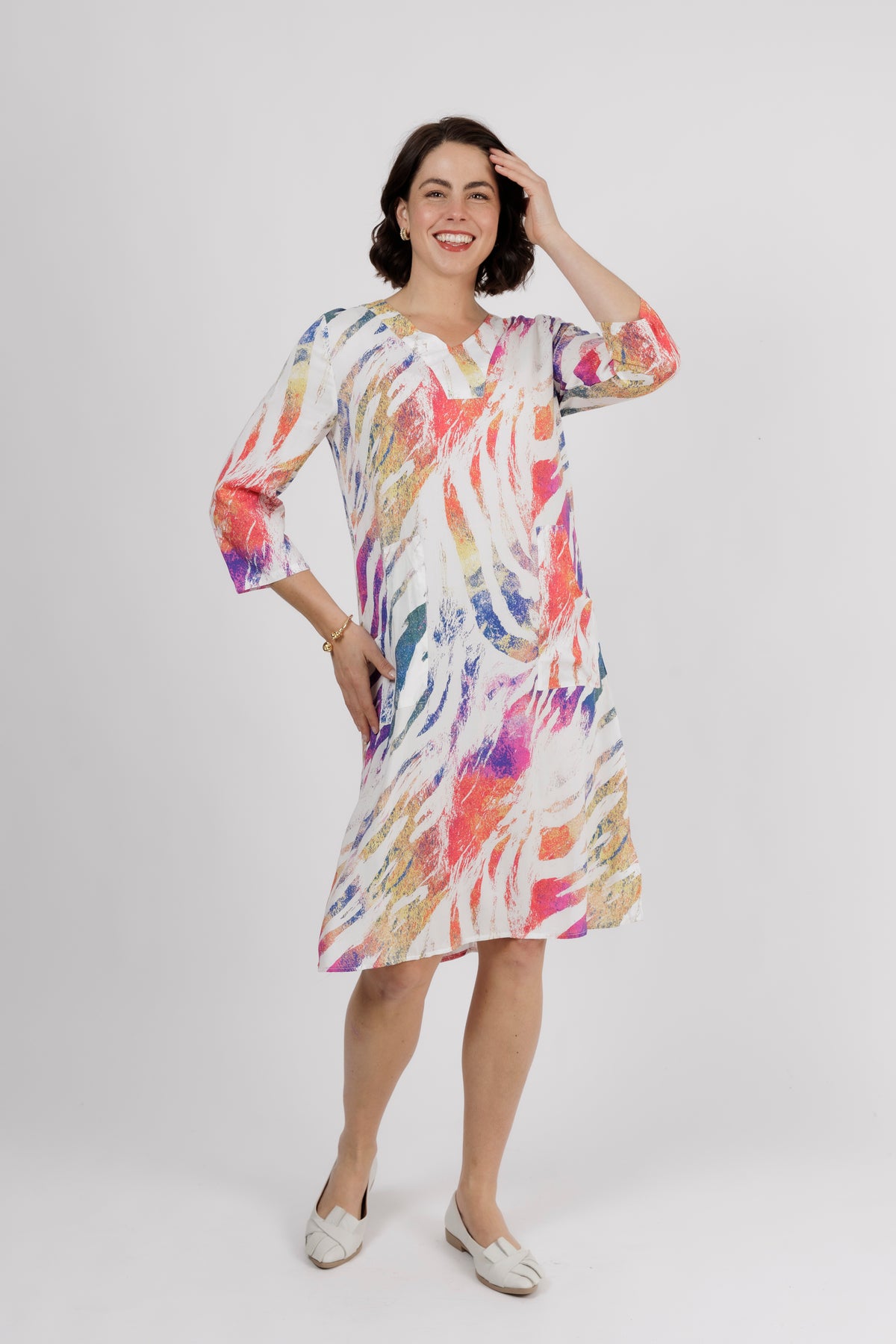 The V-neckline and three-quarter sleeves add a flattering touch, while the straight relaxed silhouette and side pockets provide both comfort and practicality. Ideal for brunches, travel, or warm-weather events, this artistic dress brings colour, movement, and sophistication to every occasion.