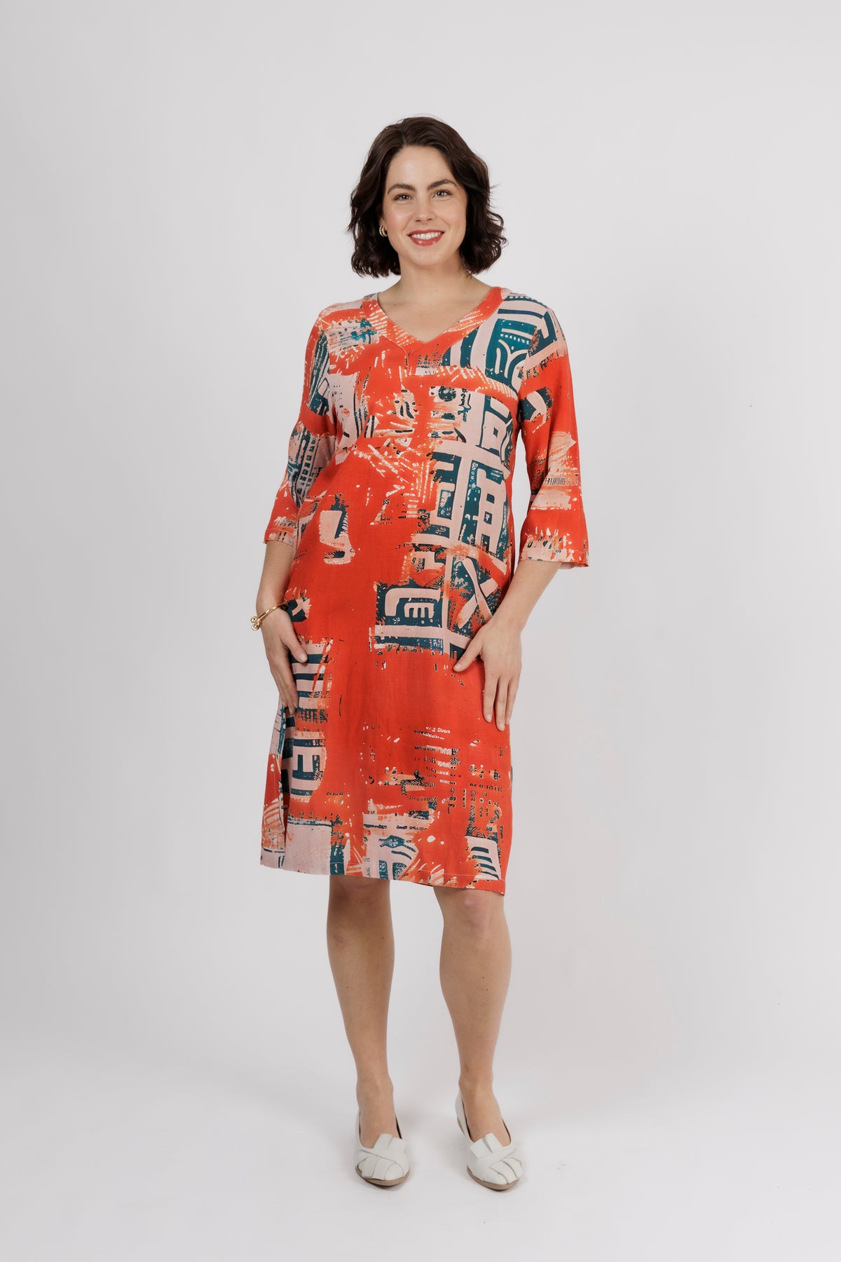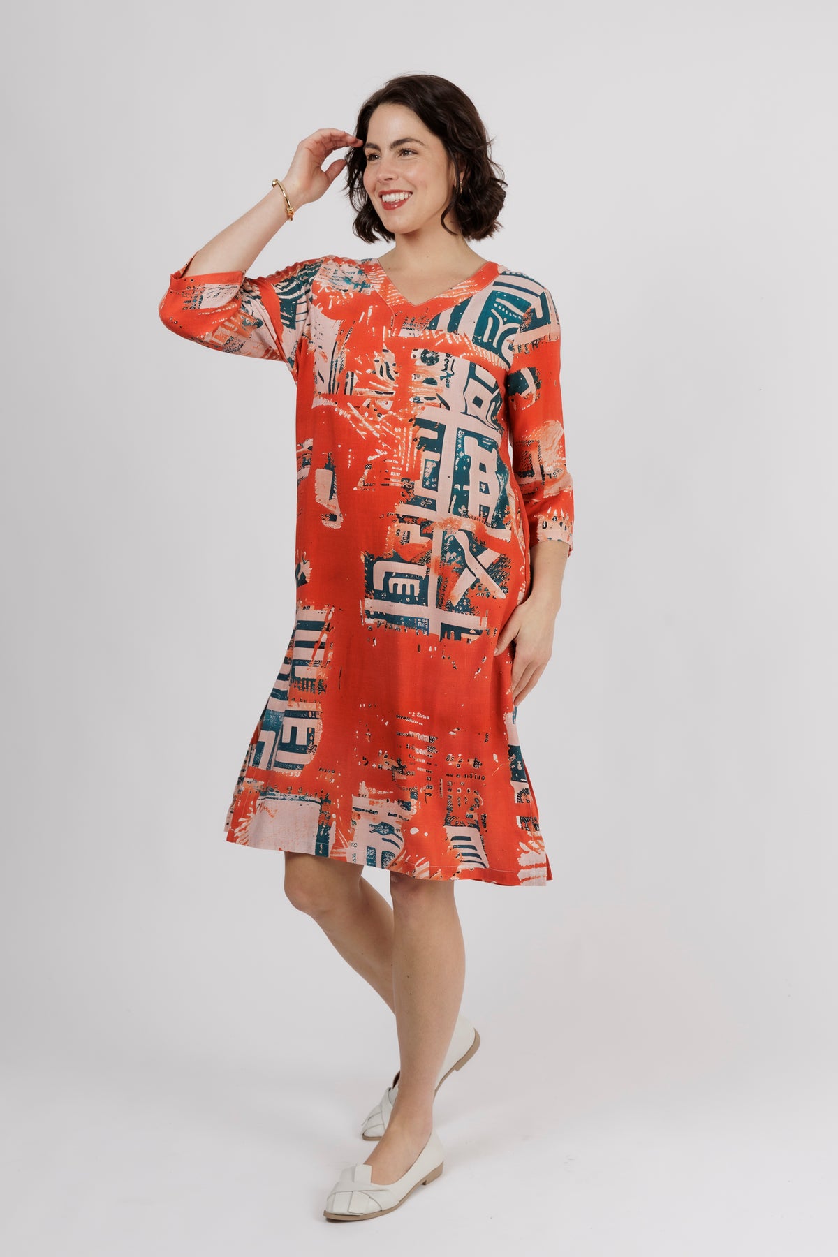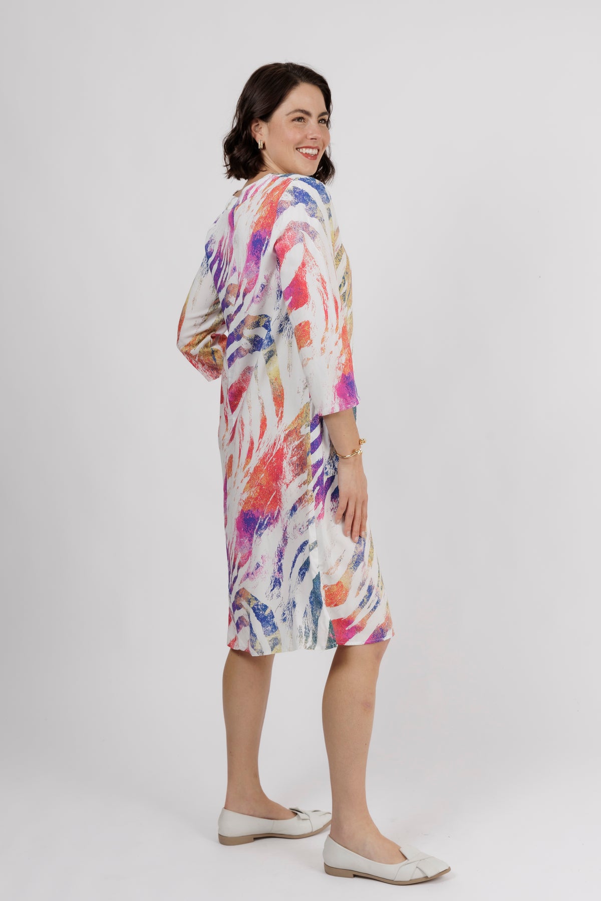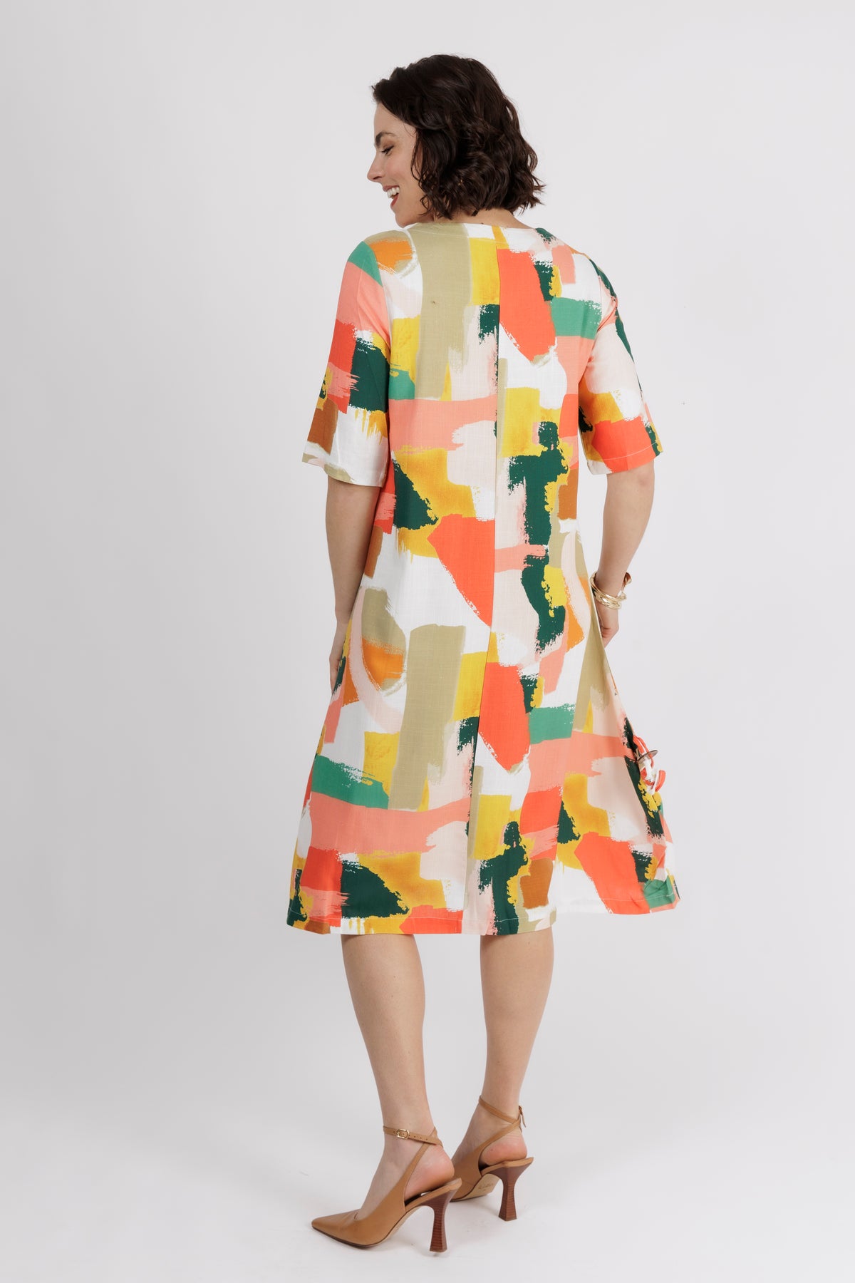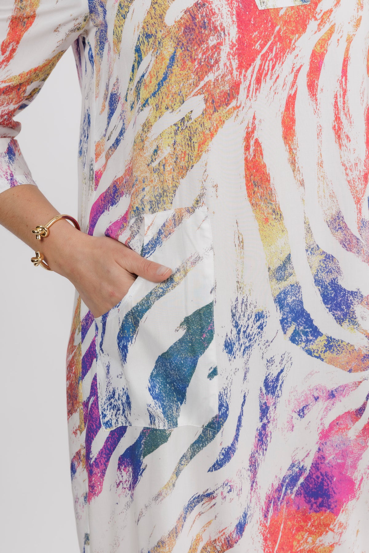 The V-neckline and three-quarter sleeves add a flattering touch, while the straight relaxed silhouette and side pockets provide both comfort and practicality. Ideal for brunches, travel, or warm-weather events, this artistic dress brings colour, movement, and sophistication to every occasion.