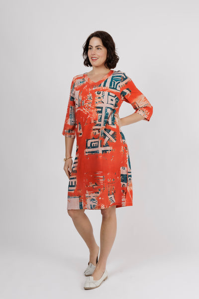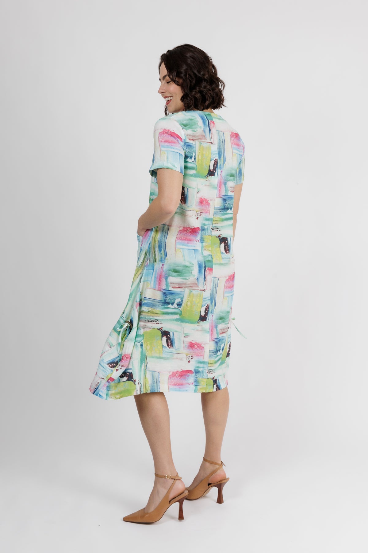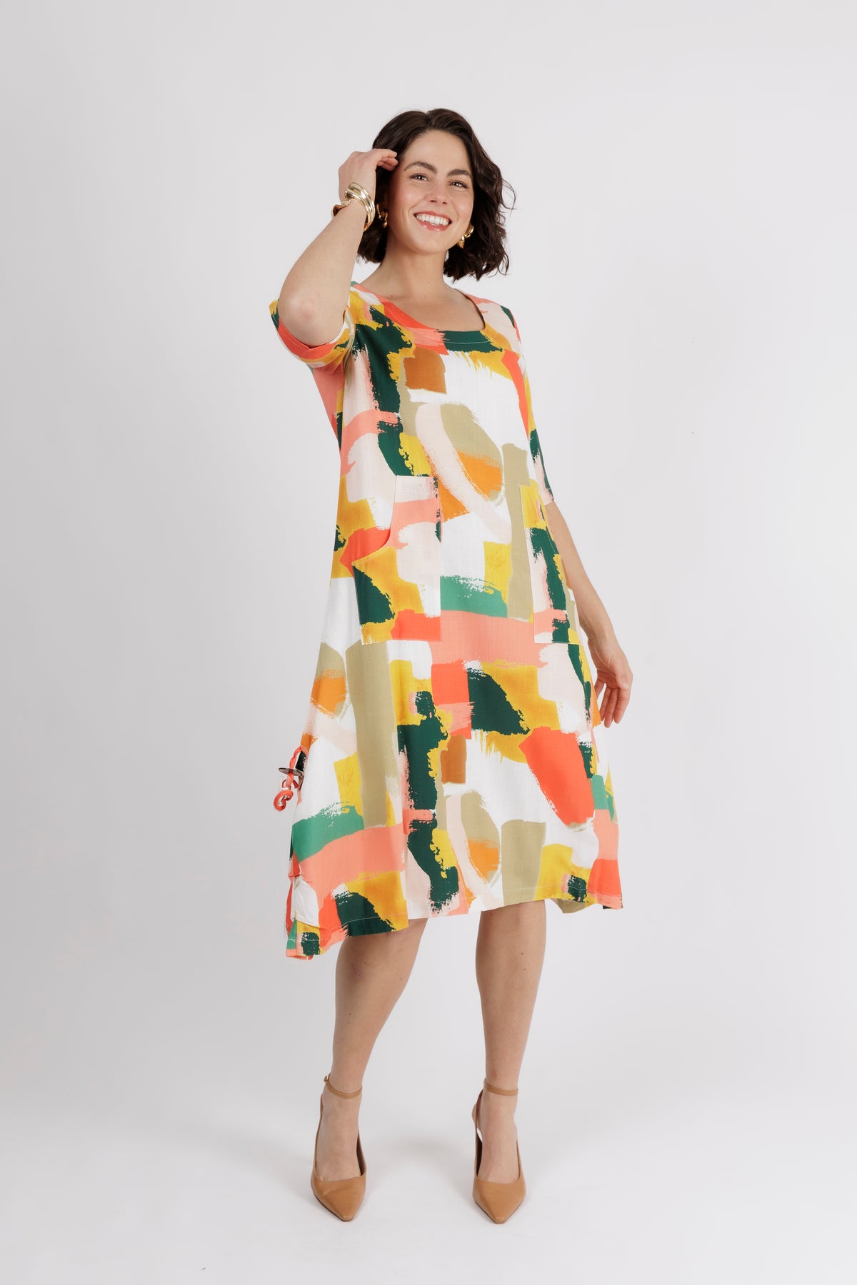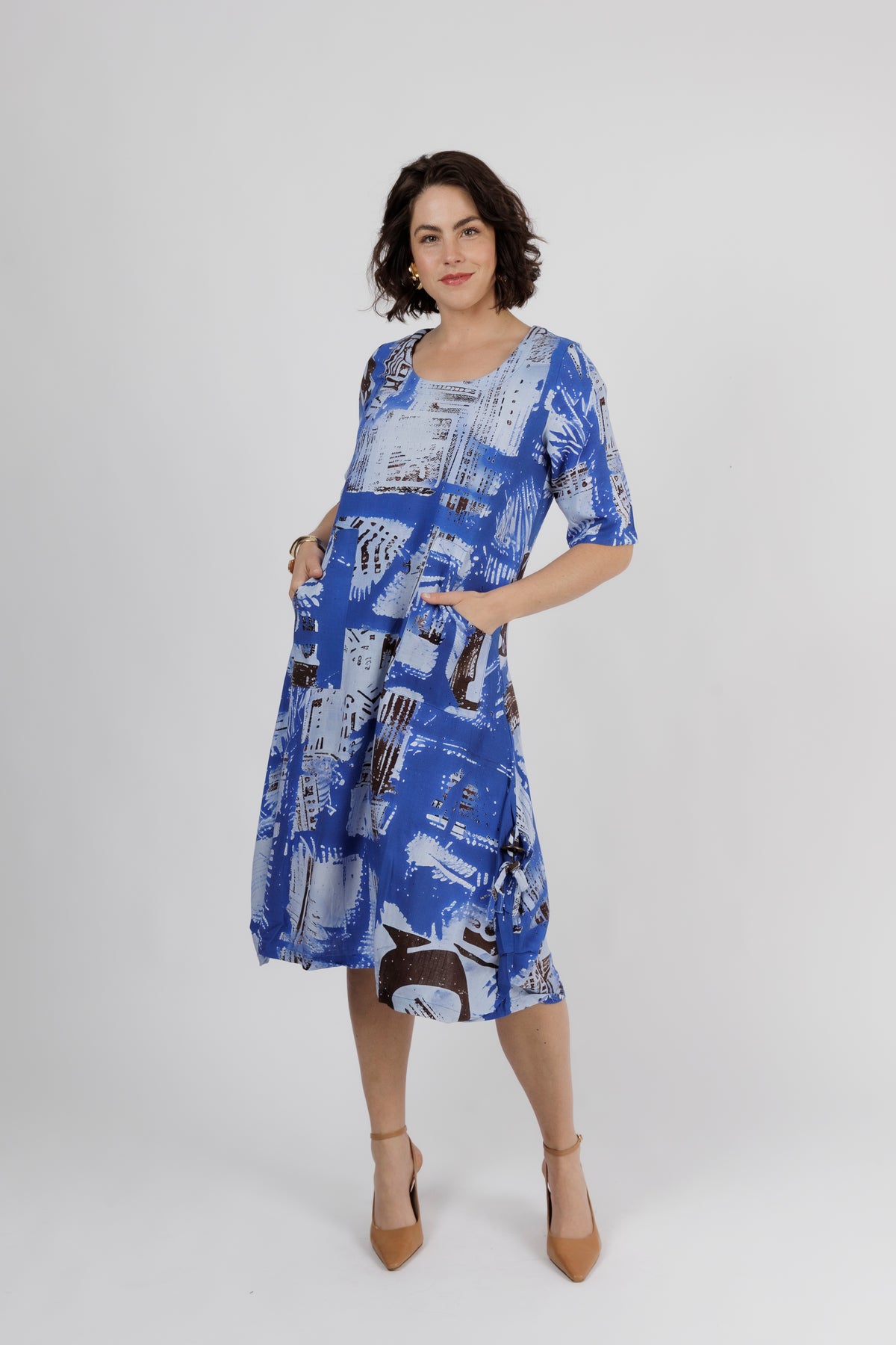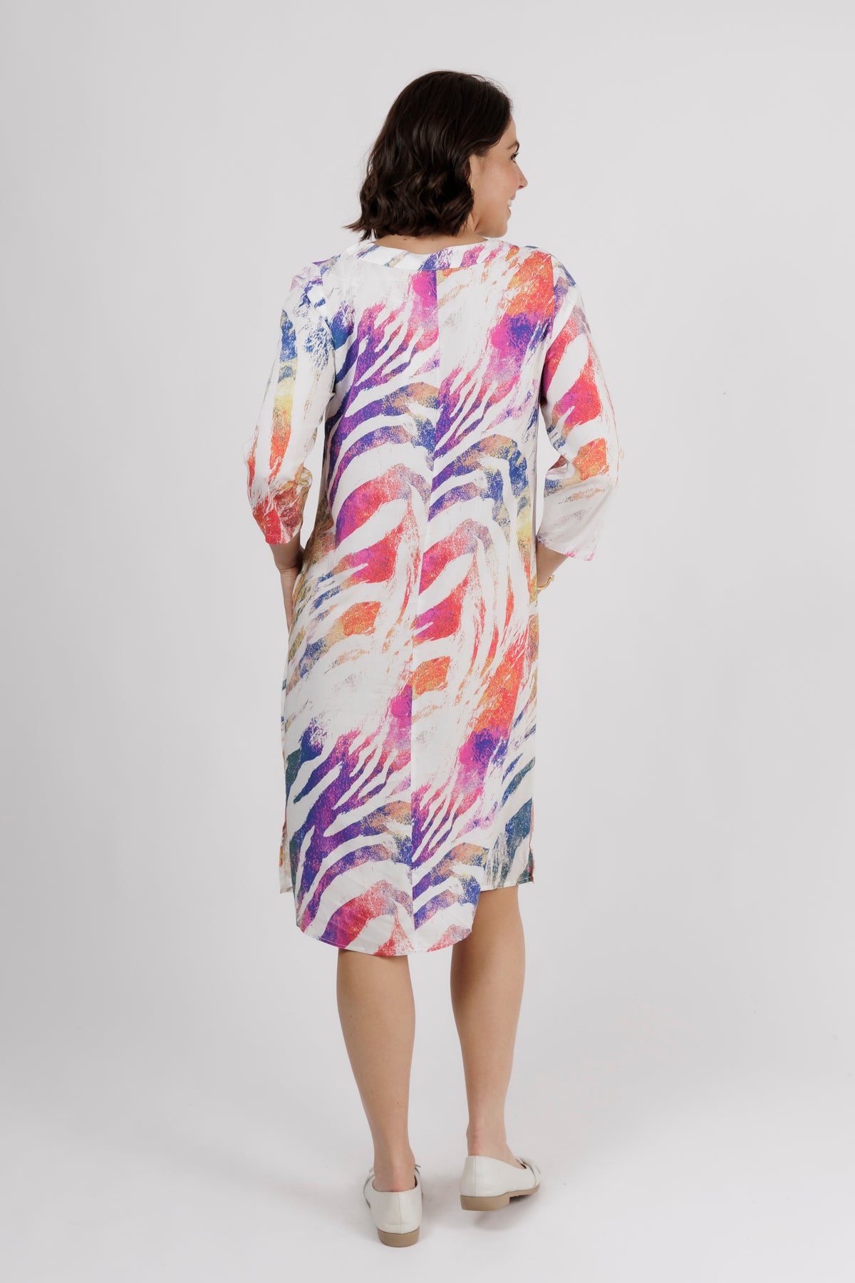 The V-neckline and three-quarter sleeves add a flattering touch, while the straight relaxed silhouette and side pockets provide both comfort and practicality. Ideal for brunches, travel, or warm-weather events, this artistic dress brings colour, movement, and sophistication to every occasion.