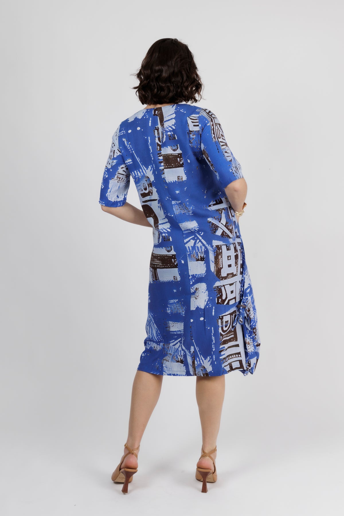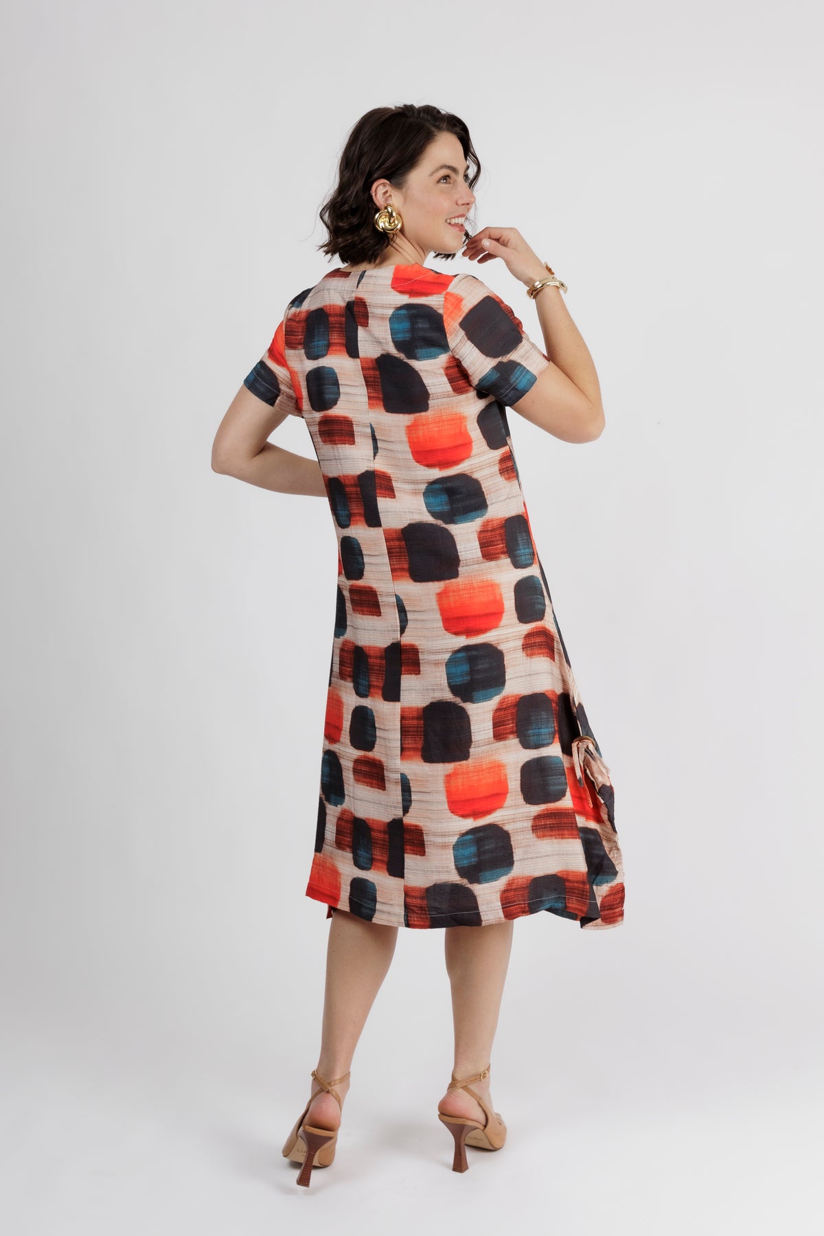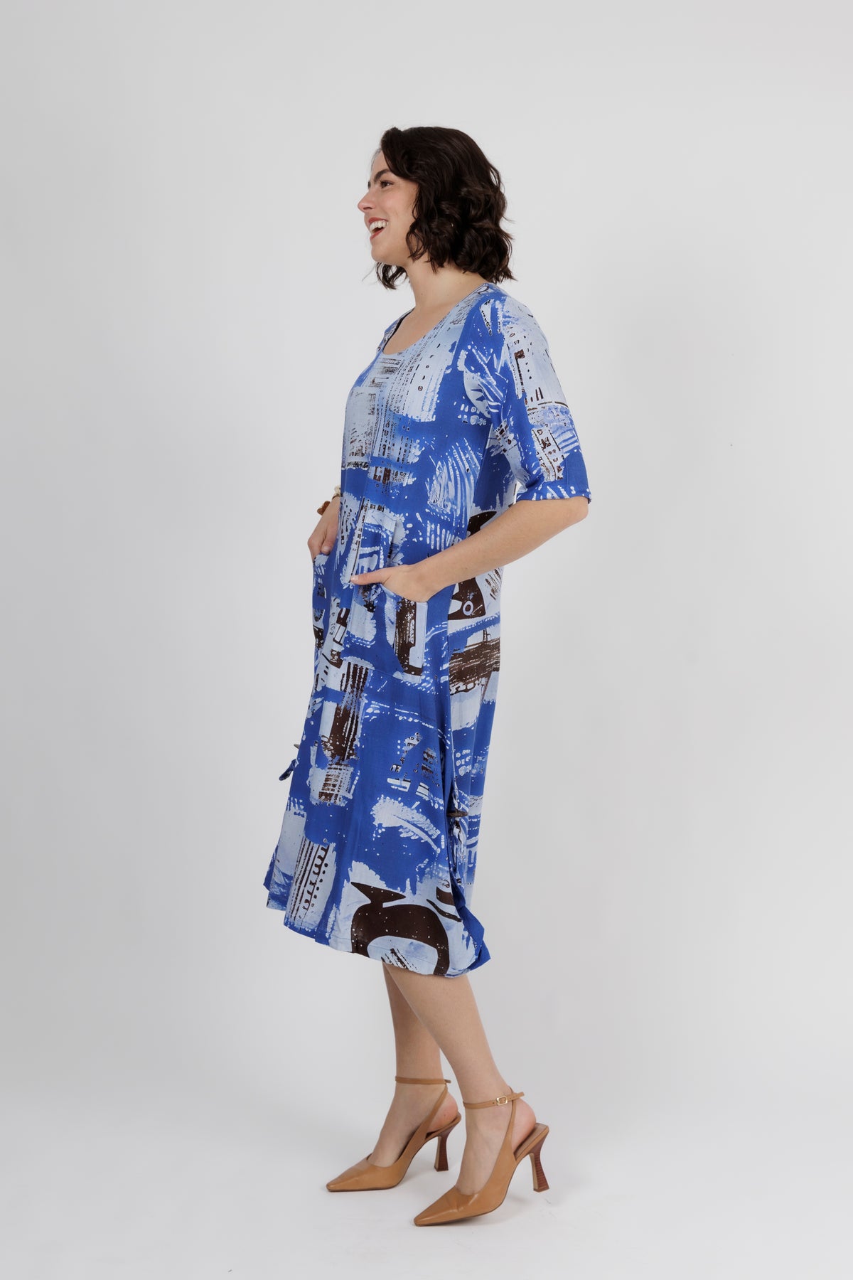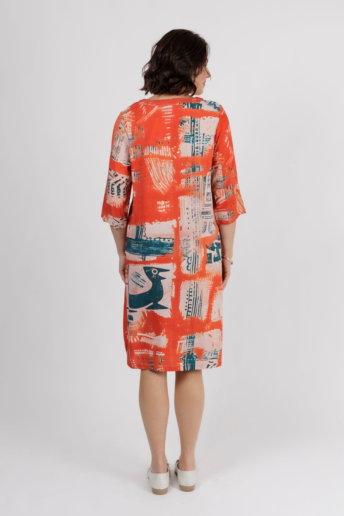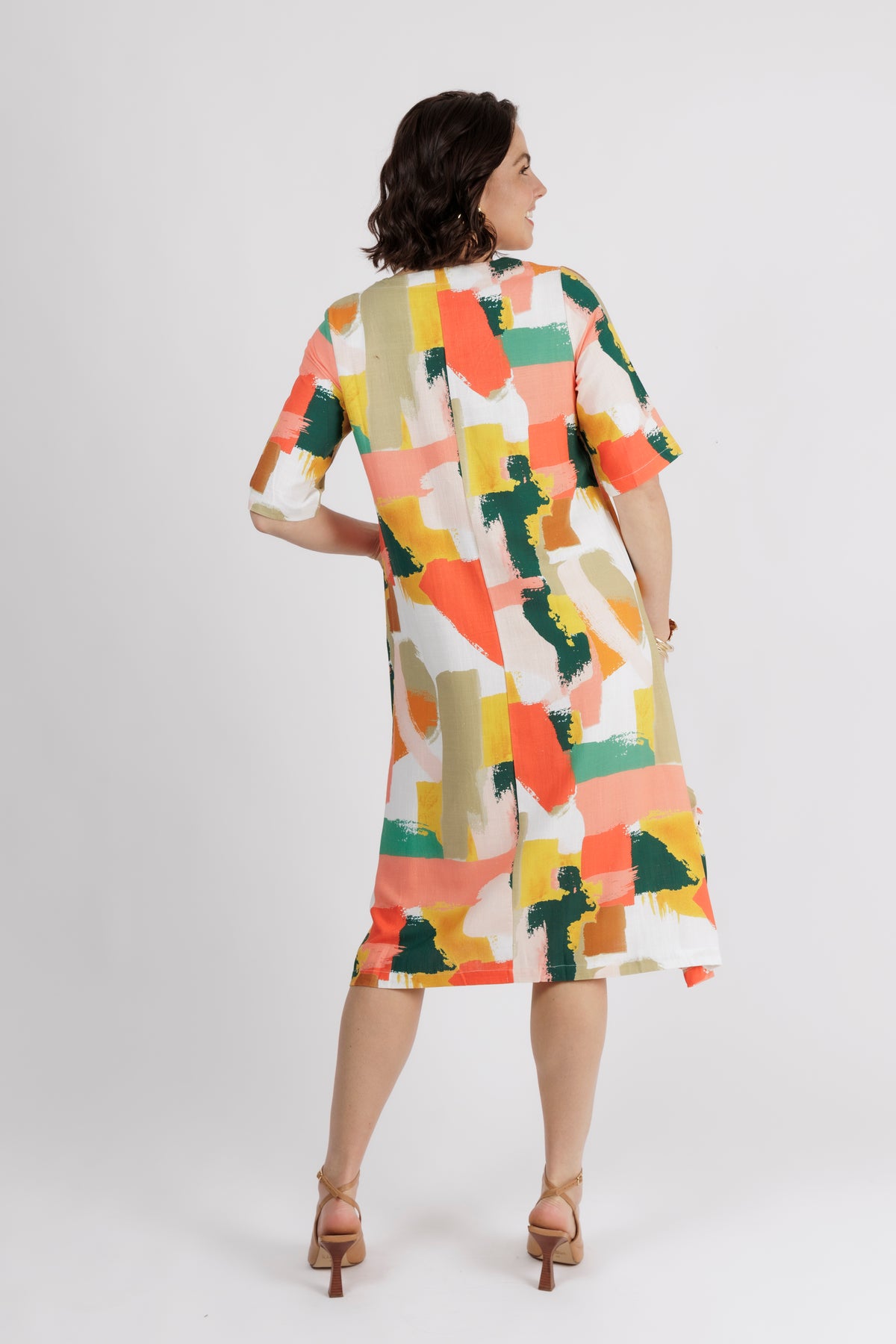 The V-neckline and three-quarter sleeves add a flattering touch, while the straight relaxed silhouette and side pockets provide both comfort and practicality. Ideal for brunches, travel, or warm-weather events, this artistic dress brings colour, movement, and sophistication to every occasion.