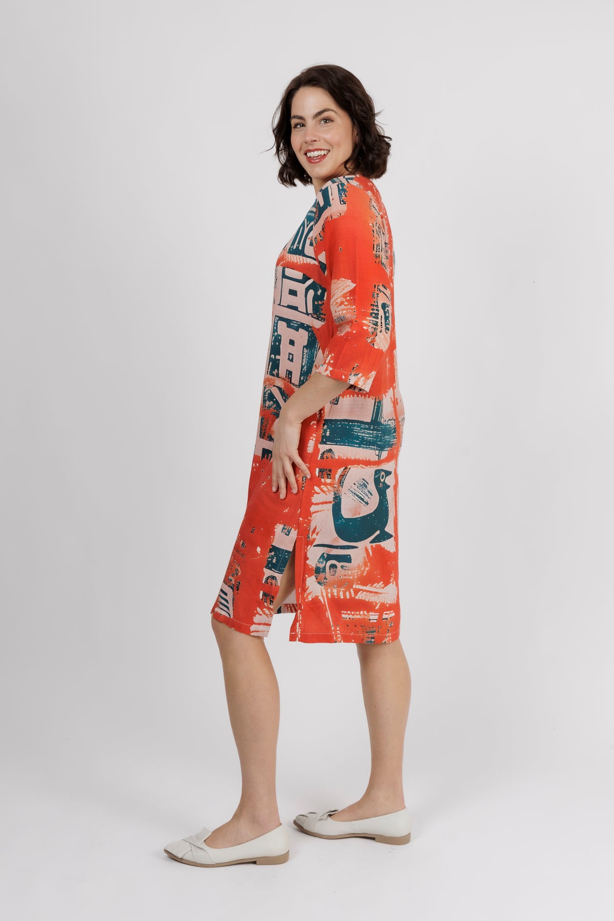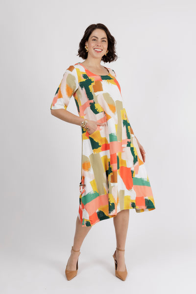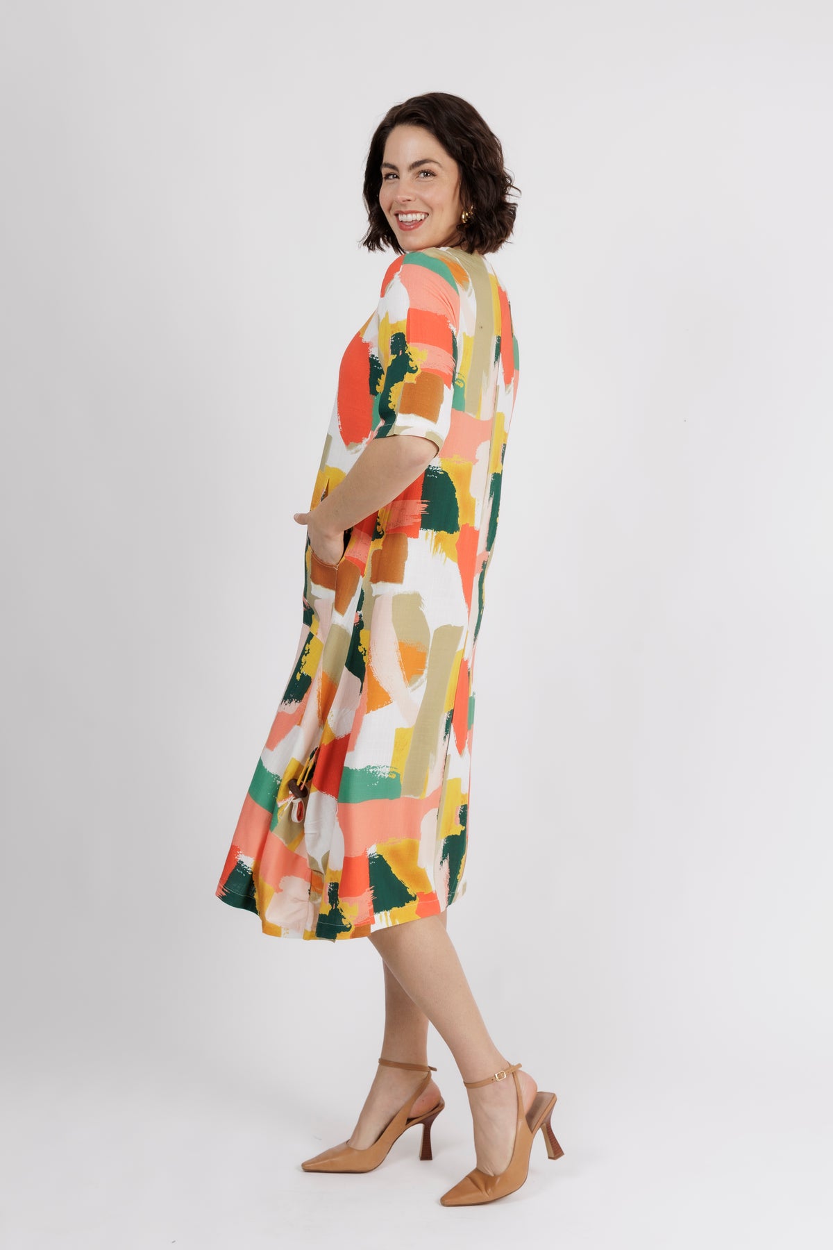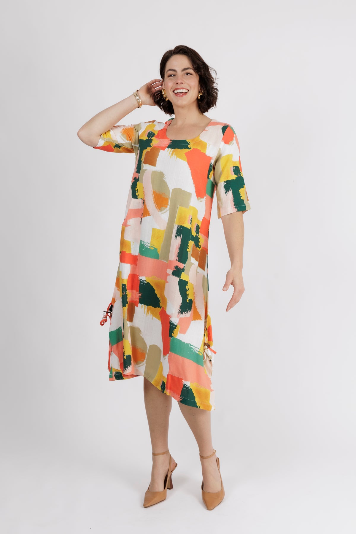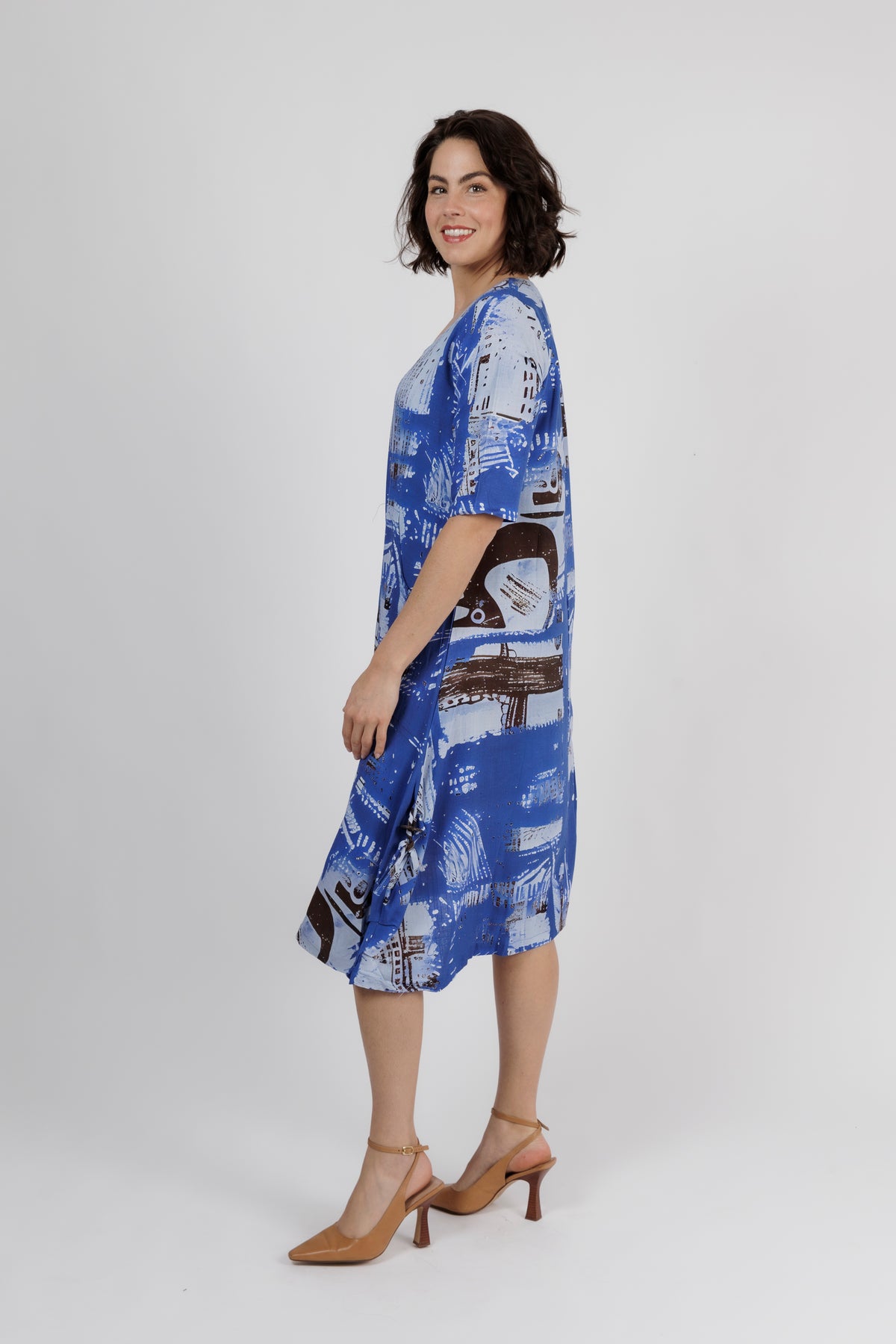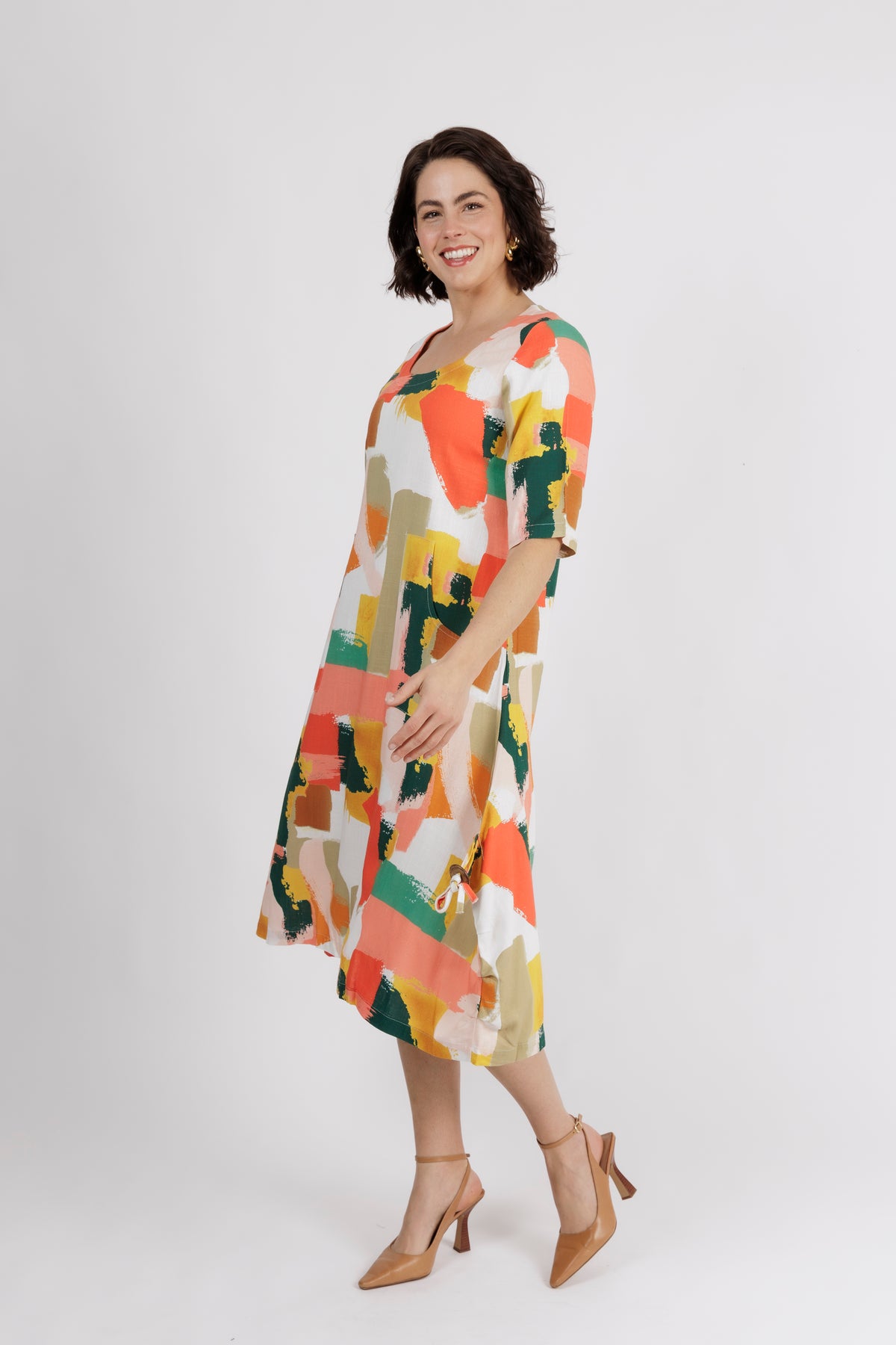 The V-neckline and three-quarter sleeves add a flattering touch, while the straight relaxed silhouette and side pockets provide both comfort and practicality. Ideal for brunches, travel, or warm-weather events, this artistic dress brings colour, movement, and sophistication to every occasion.
