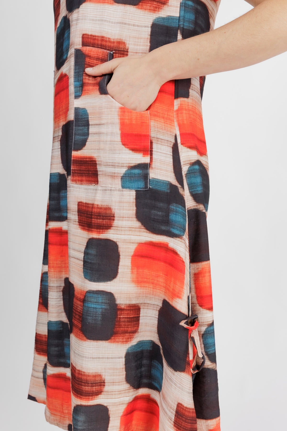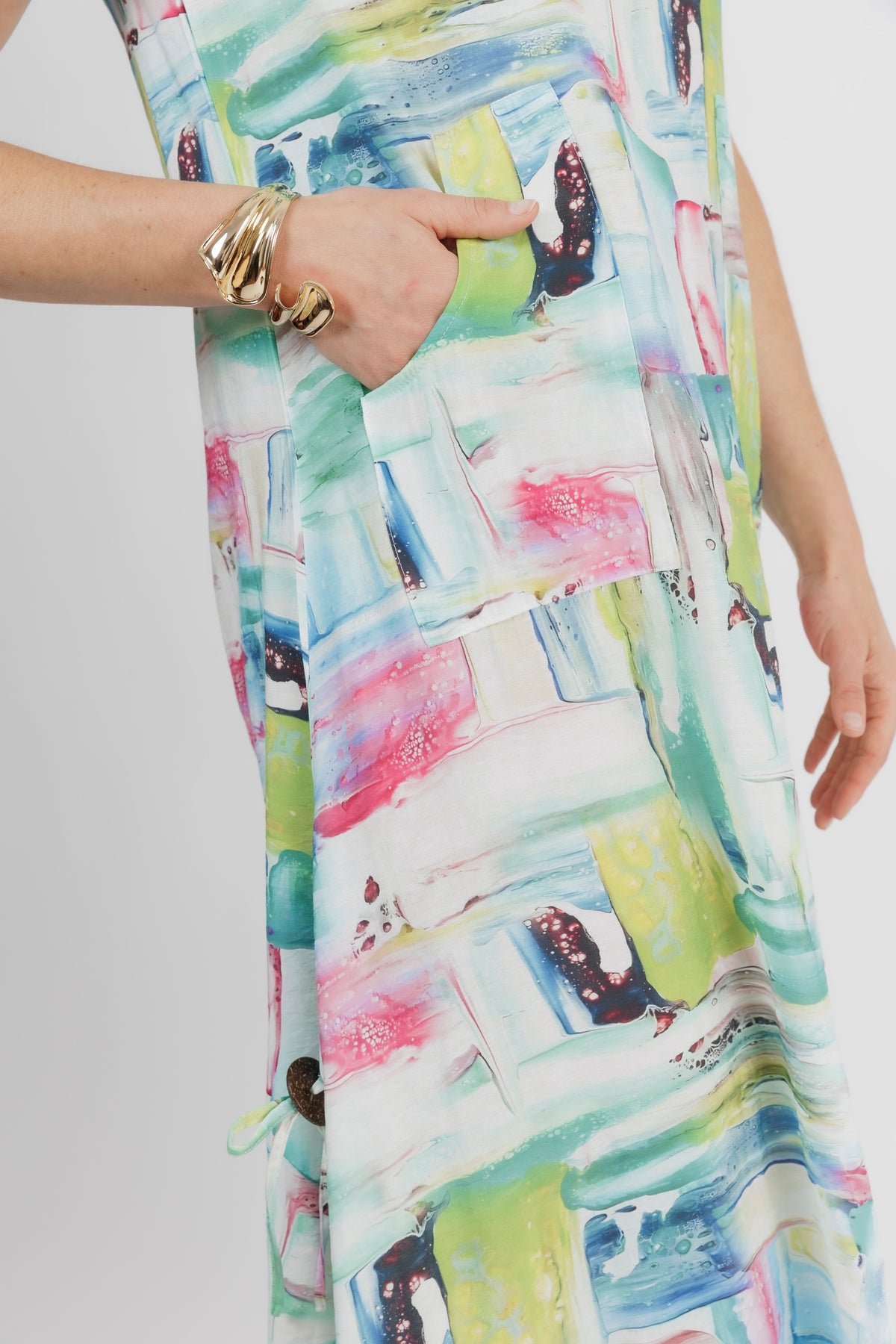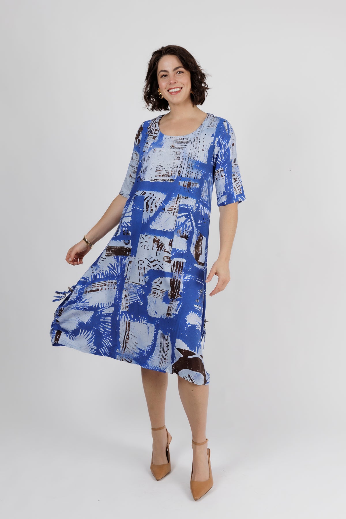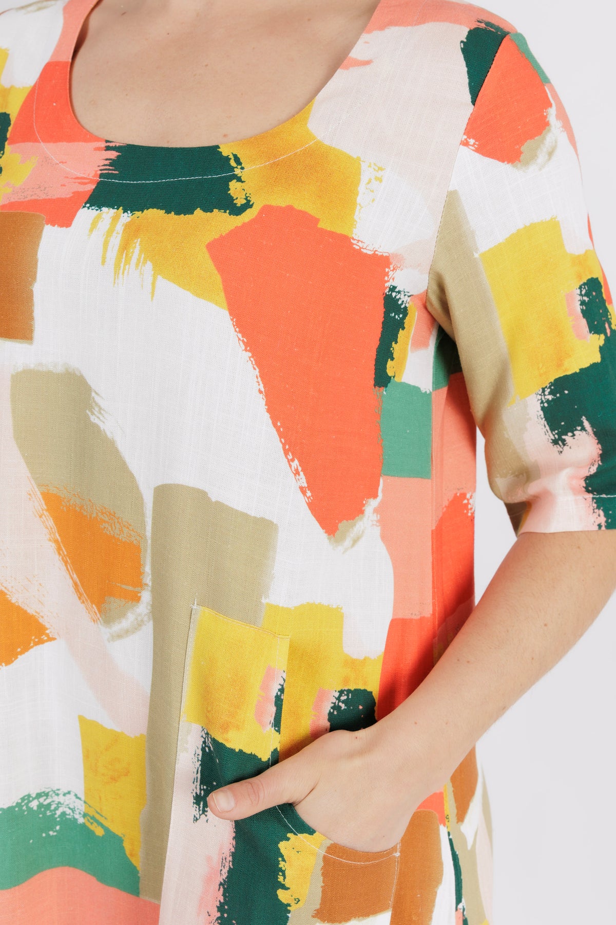 The V-neckline and three-quarter sleeves add a flattering touch, while the straight relaxed silhouette and side pockets provide both comfort and practicality. Ideal for brunches, travel, or warm-weather events, this artistic dress brings colour, movement, and sophistication to every occasion.
