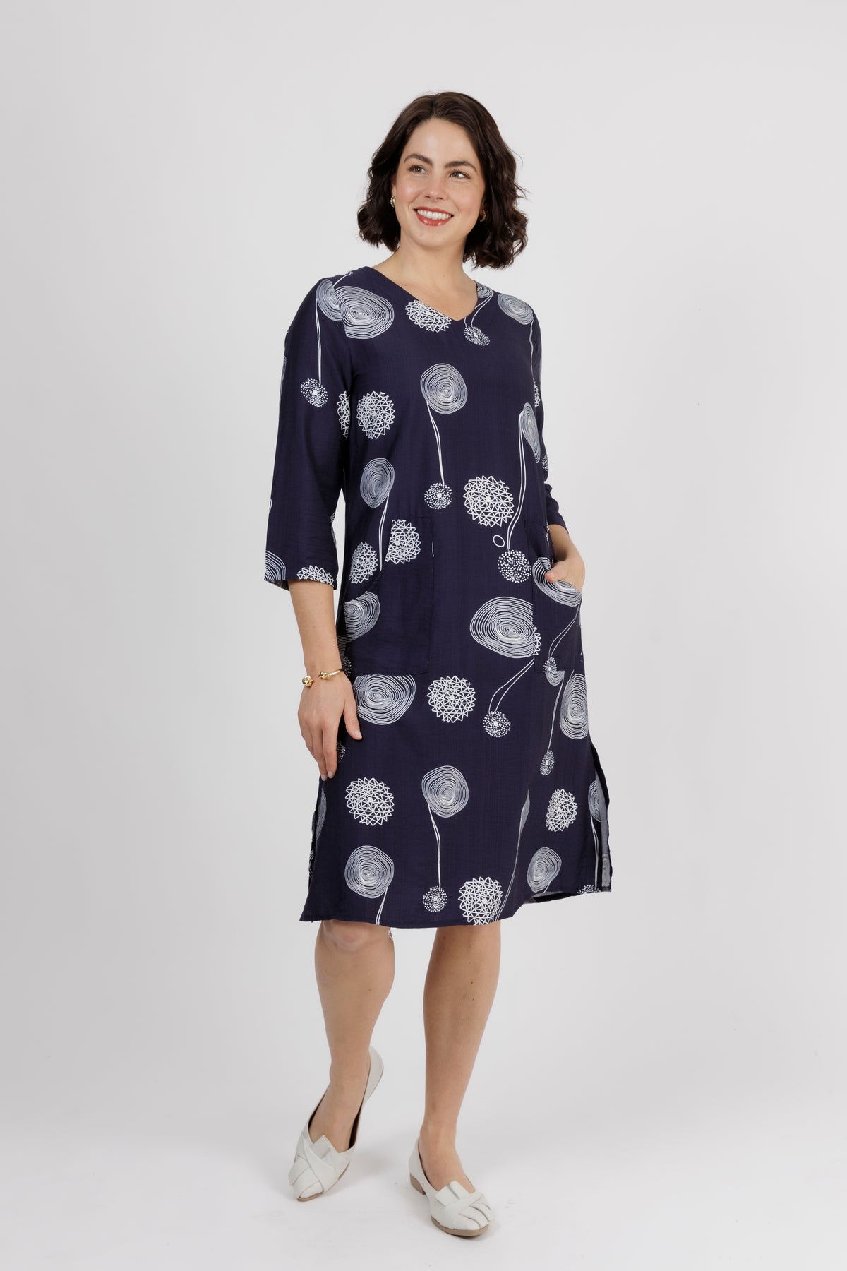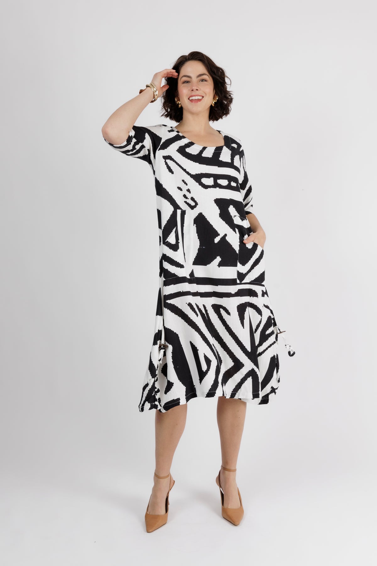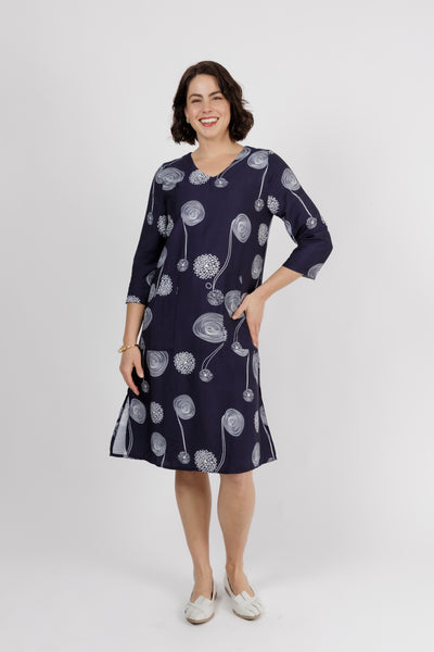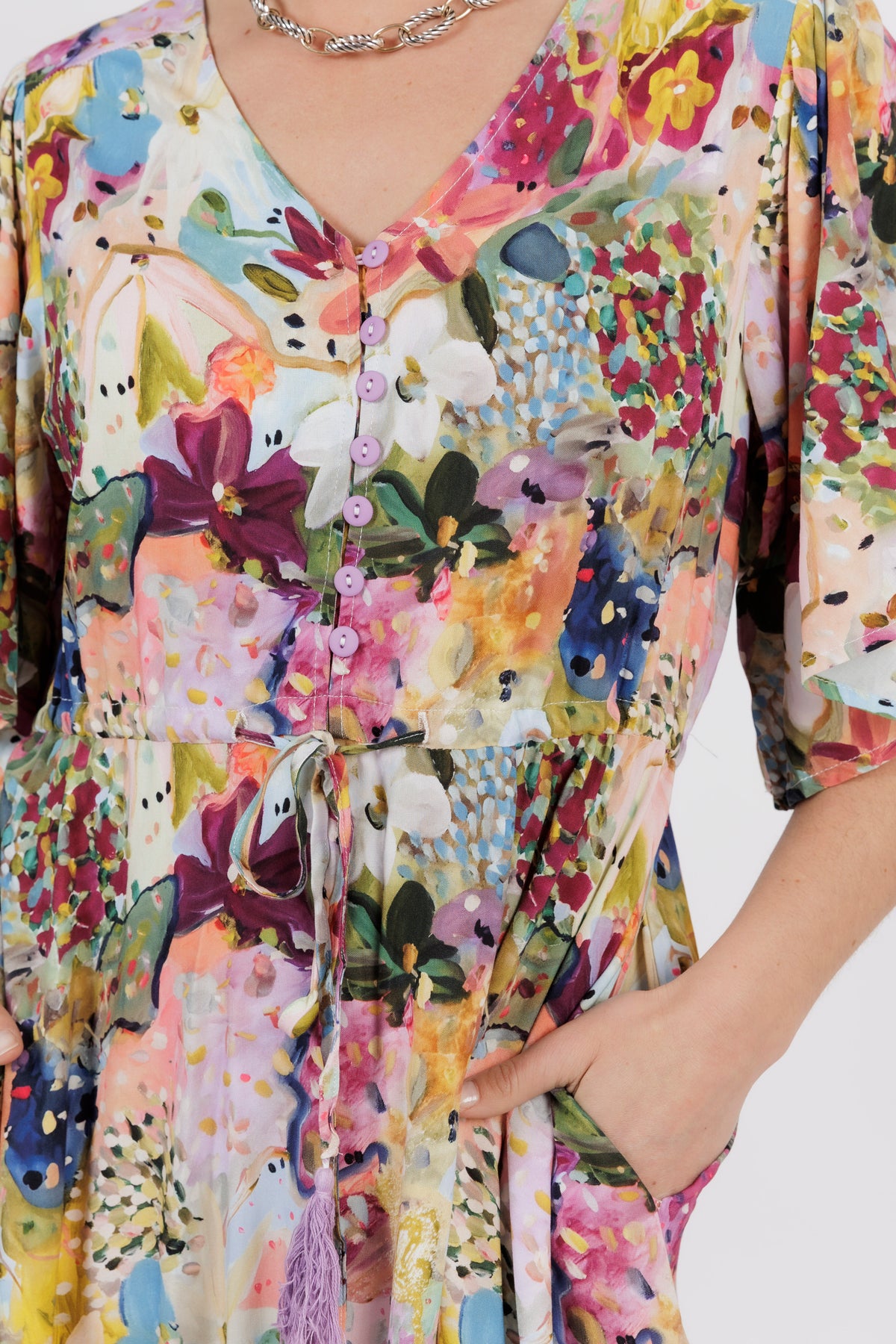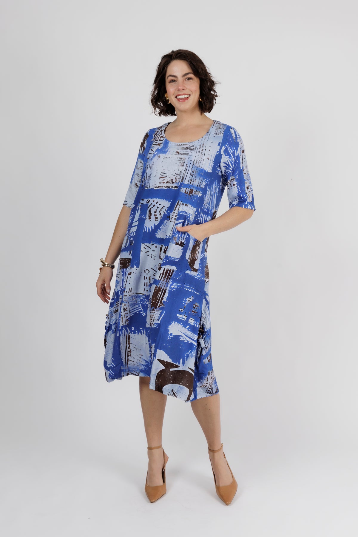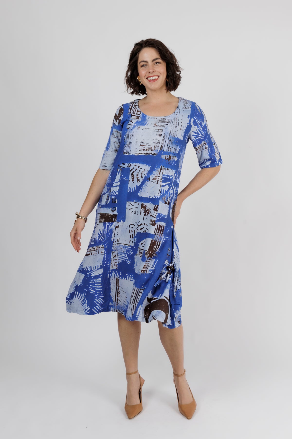 The V-neckline and three-quarter sleeves add a flattering touch, while the straight relaxed silhouette and side pockets provide both comfort and practicality. Ideal for brunches, travel, or warm-weather events, this artistic dress brings colour, movement, and sophistication to every occasion.