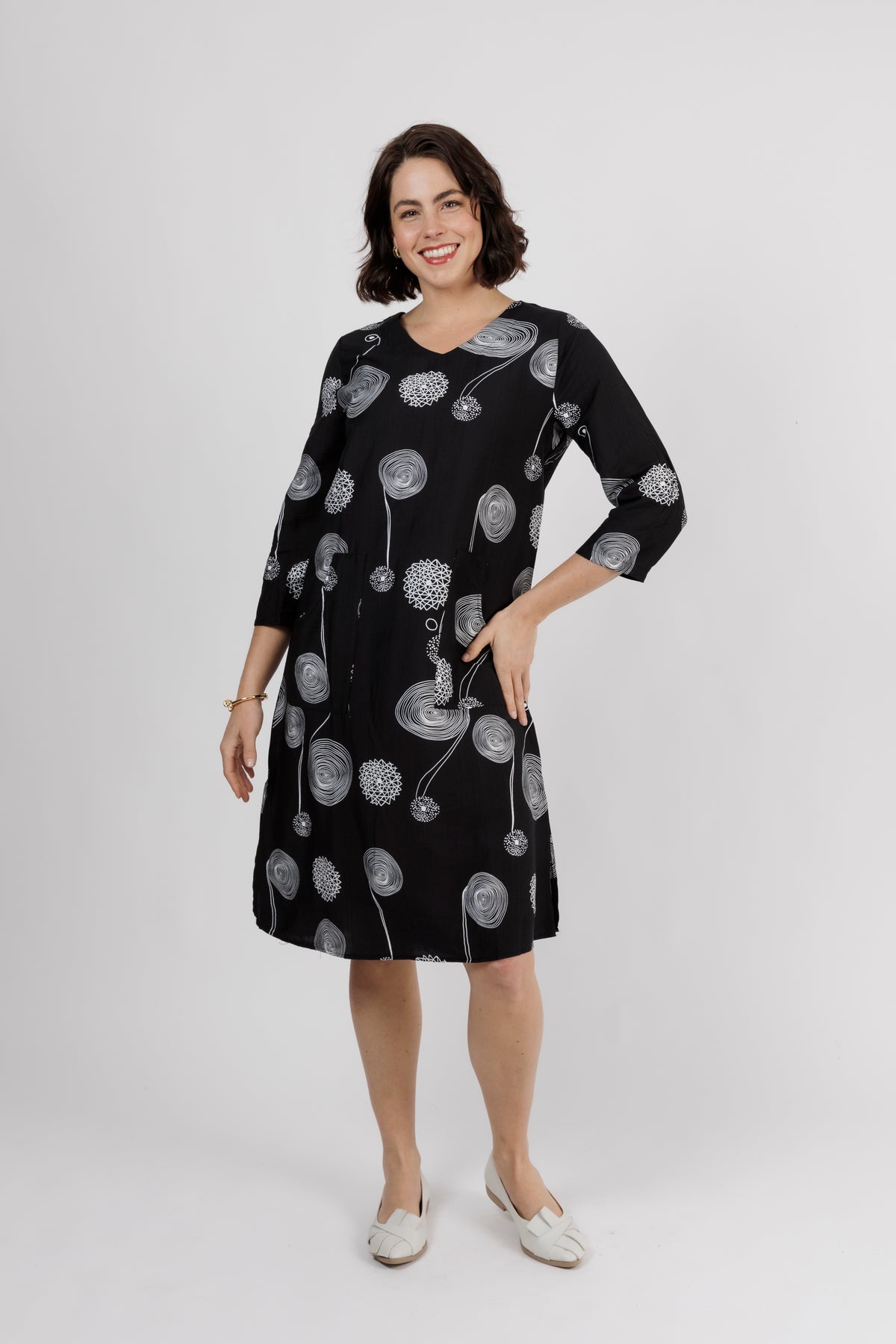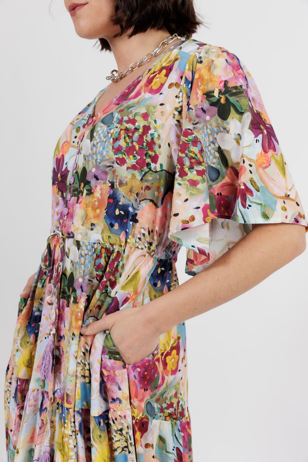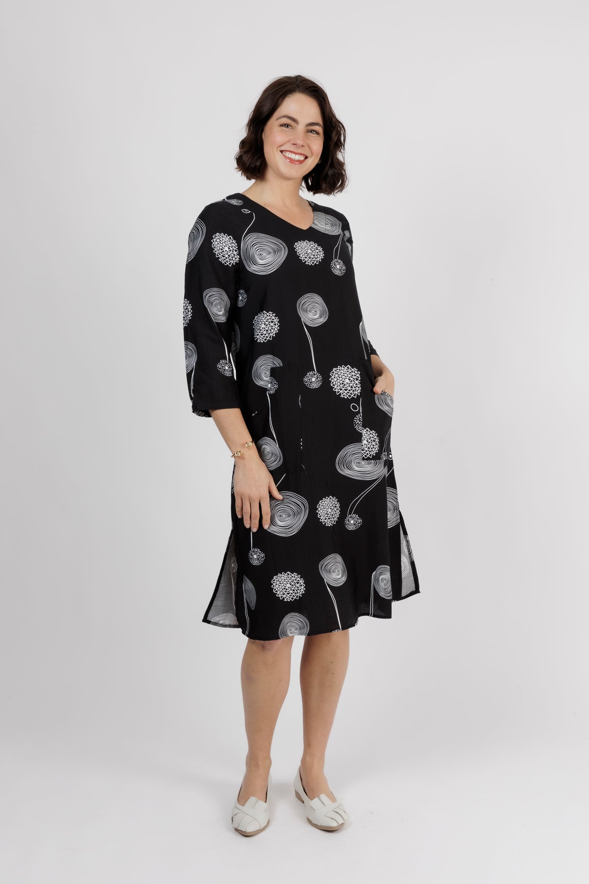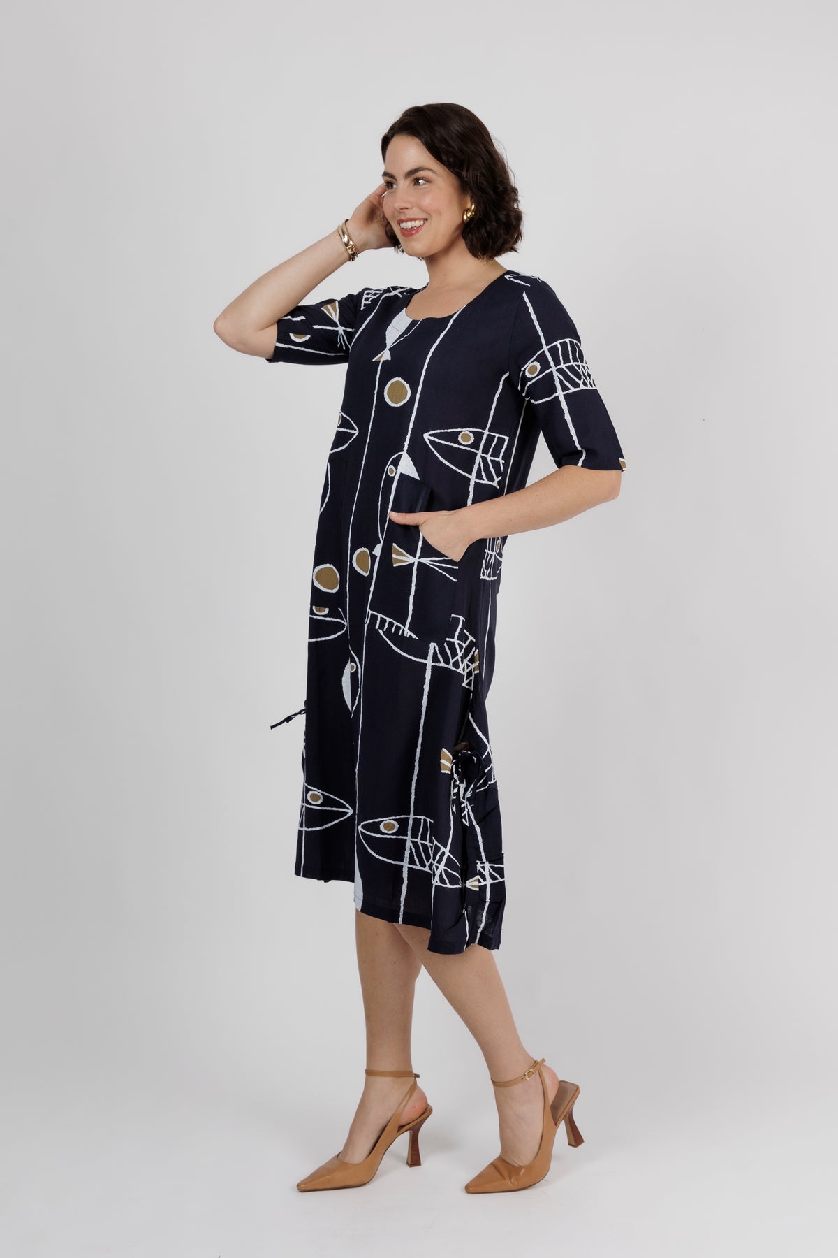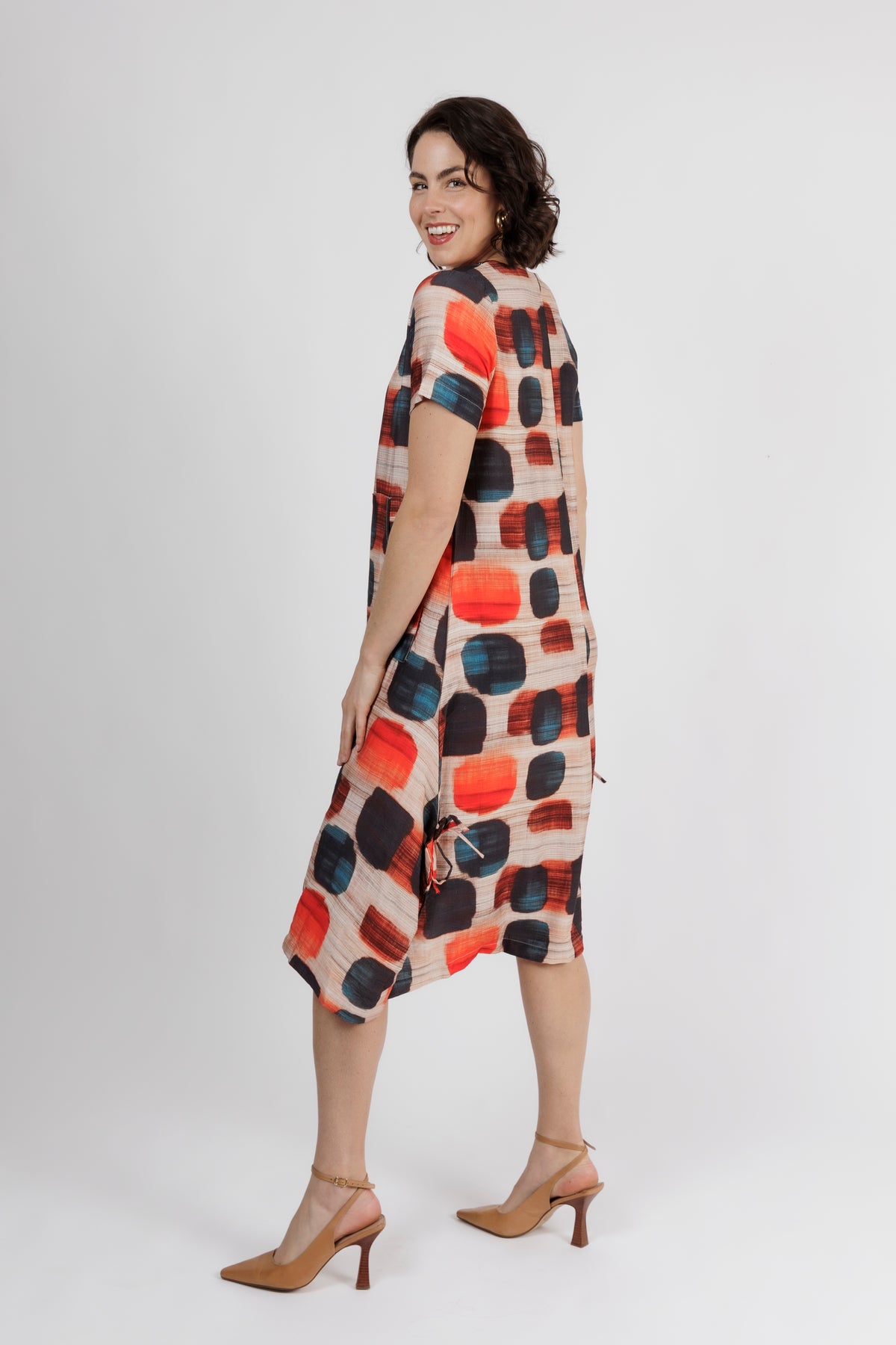 The V-neckline and three-quarter sleeves add a flattering touch, while the straight relaxed silhouette and side pockets provide both comfort and practicality. Ideal for brunches, travel, or warm-weather events, this artistic dress brings colour, movement, and sophistication to every occasion.