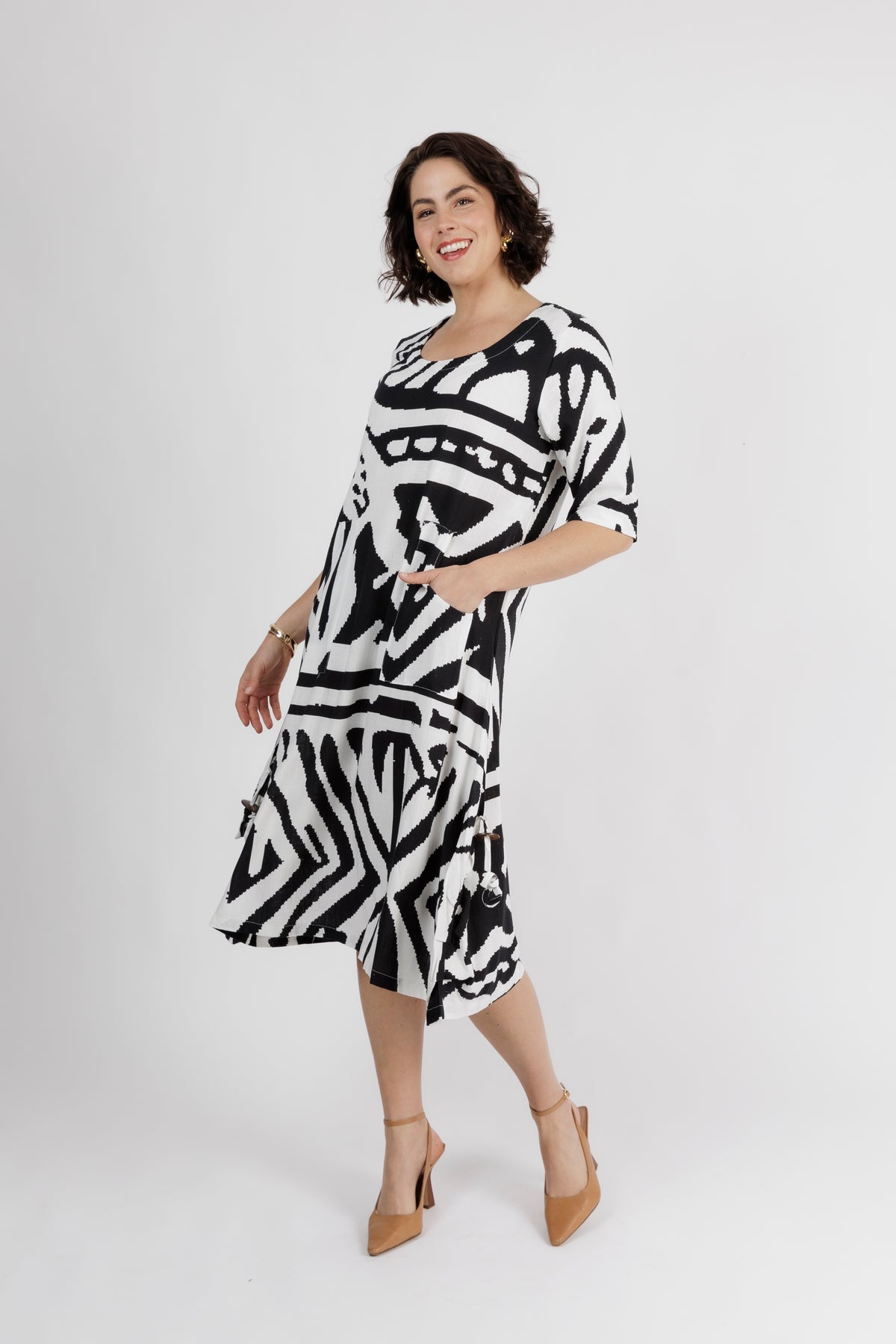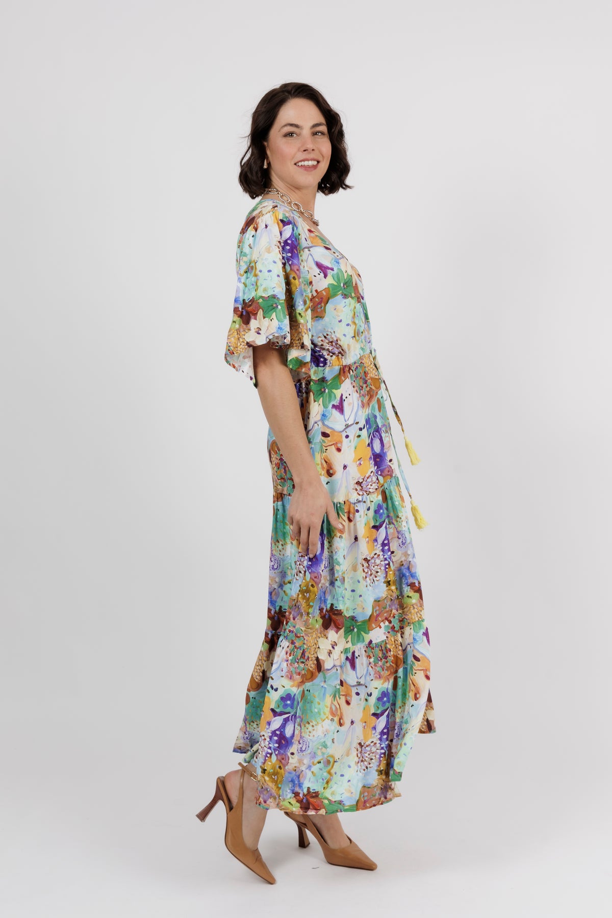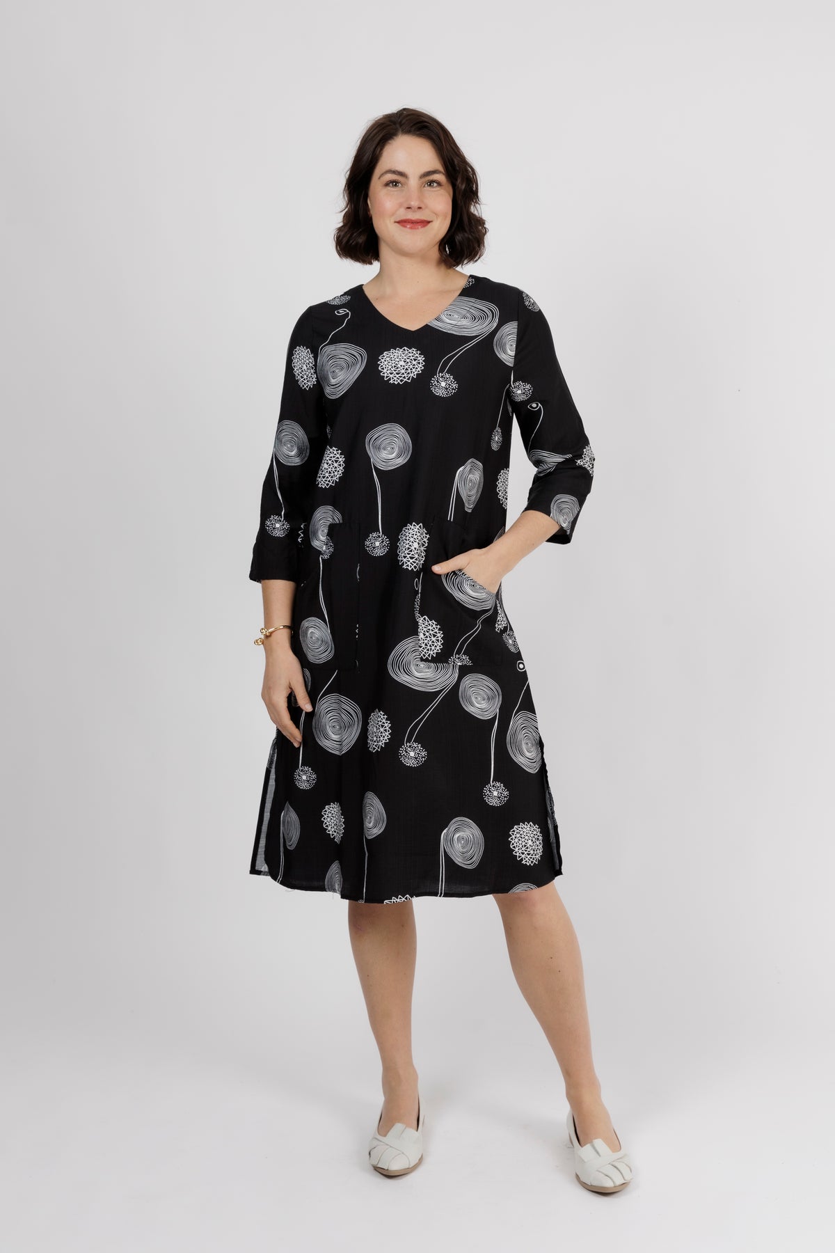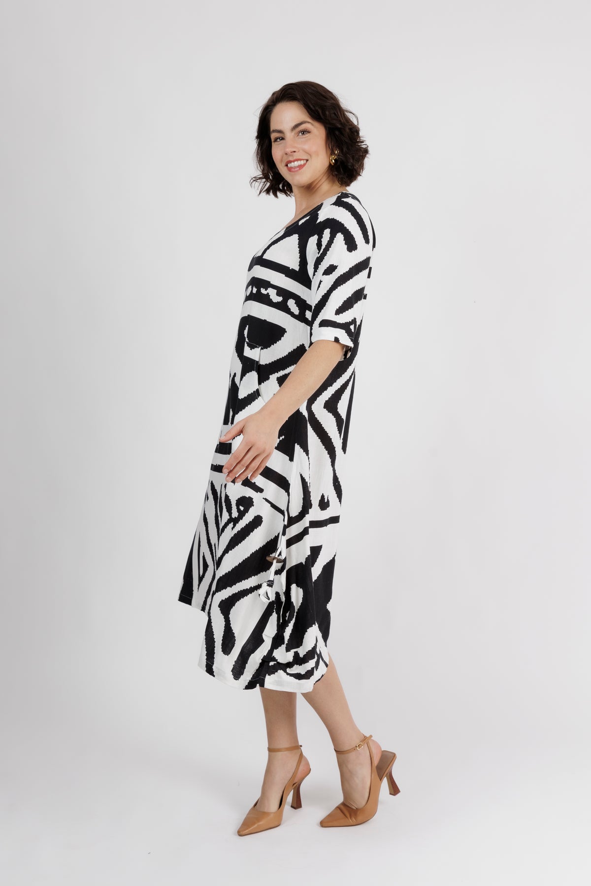 The V-neckline and three-quarter sleeves add a flattering touch, while the straight relaxed silhouette and side pockets provide both comfort and practicality. Ideal for brunches, travel, or warm-weather events, this artistic dress brings colour, movement, and sophistication to every occasion.