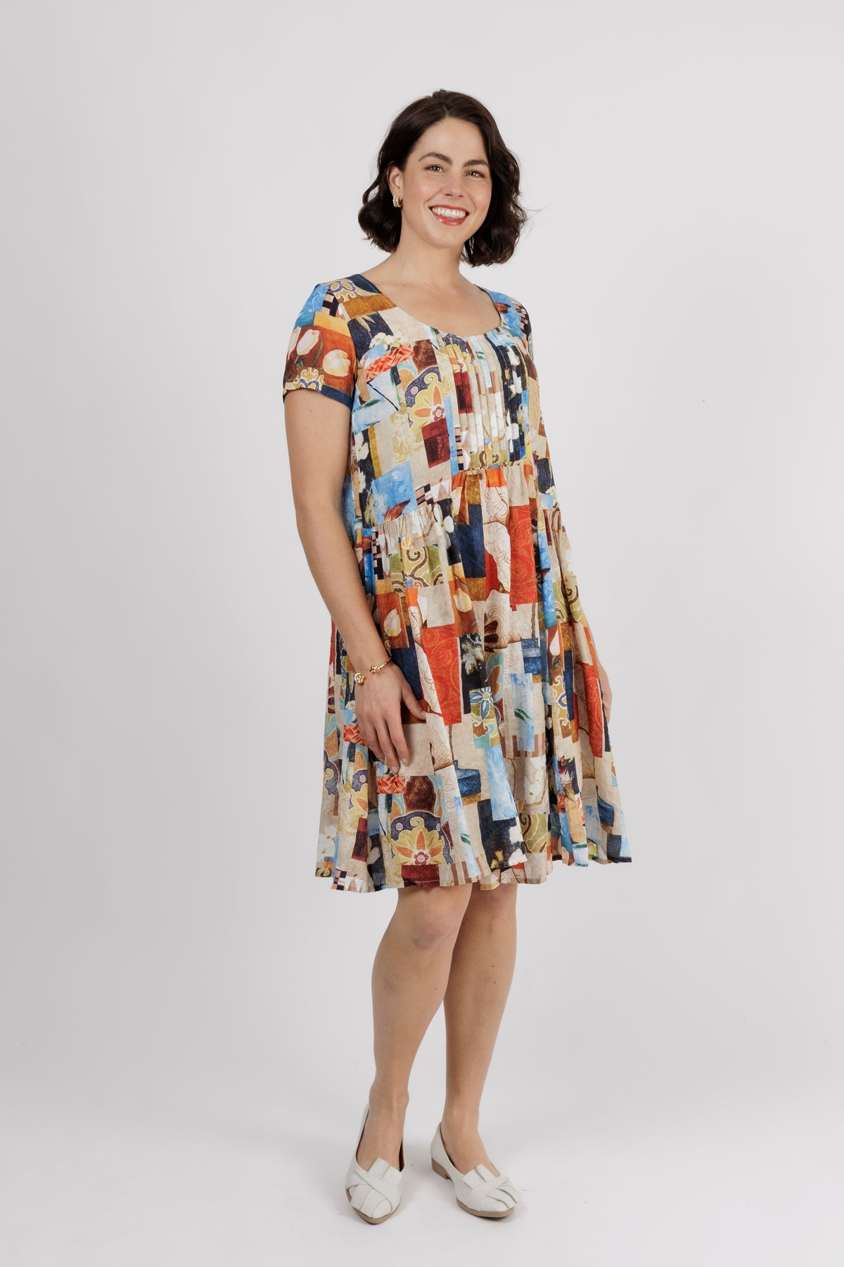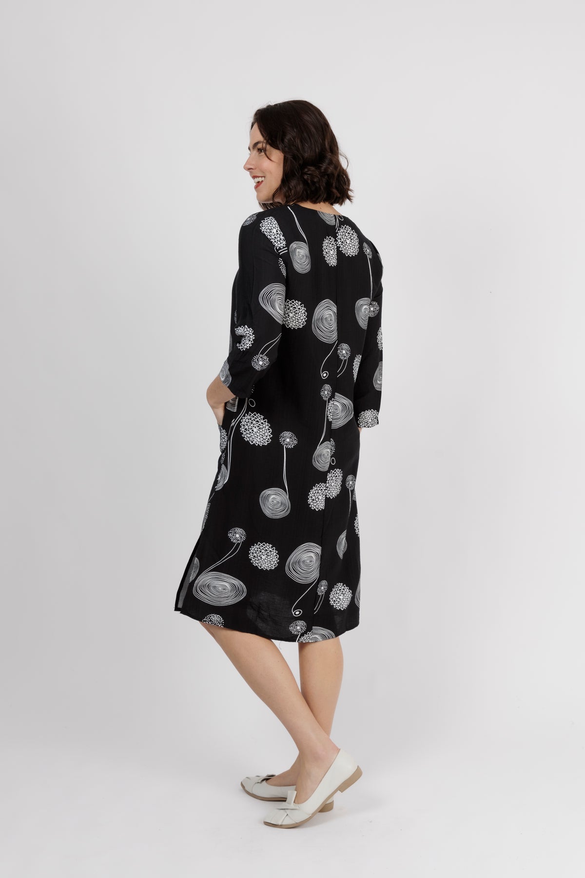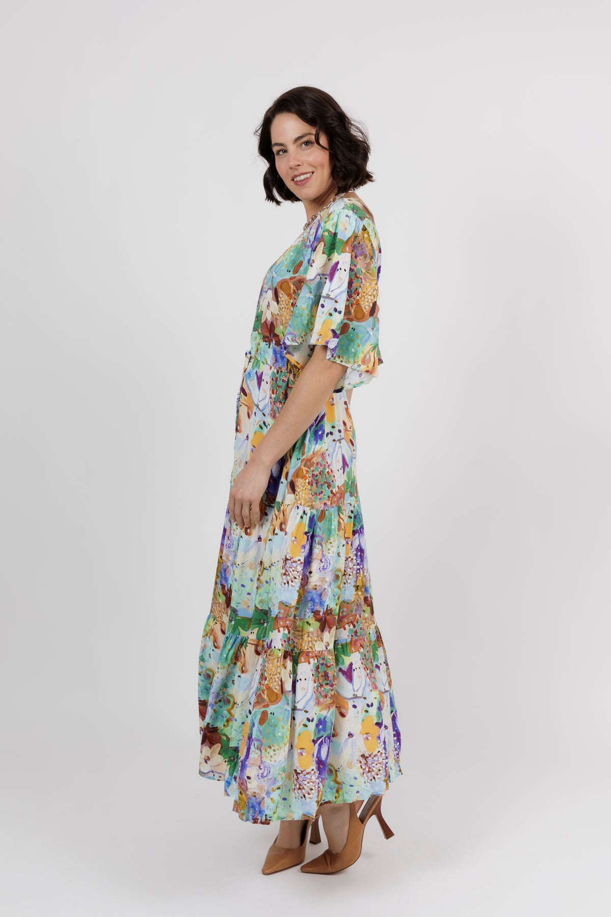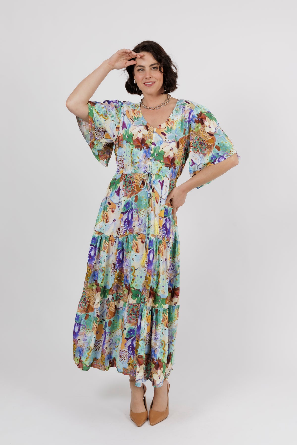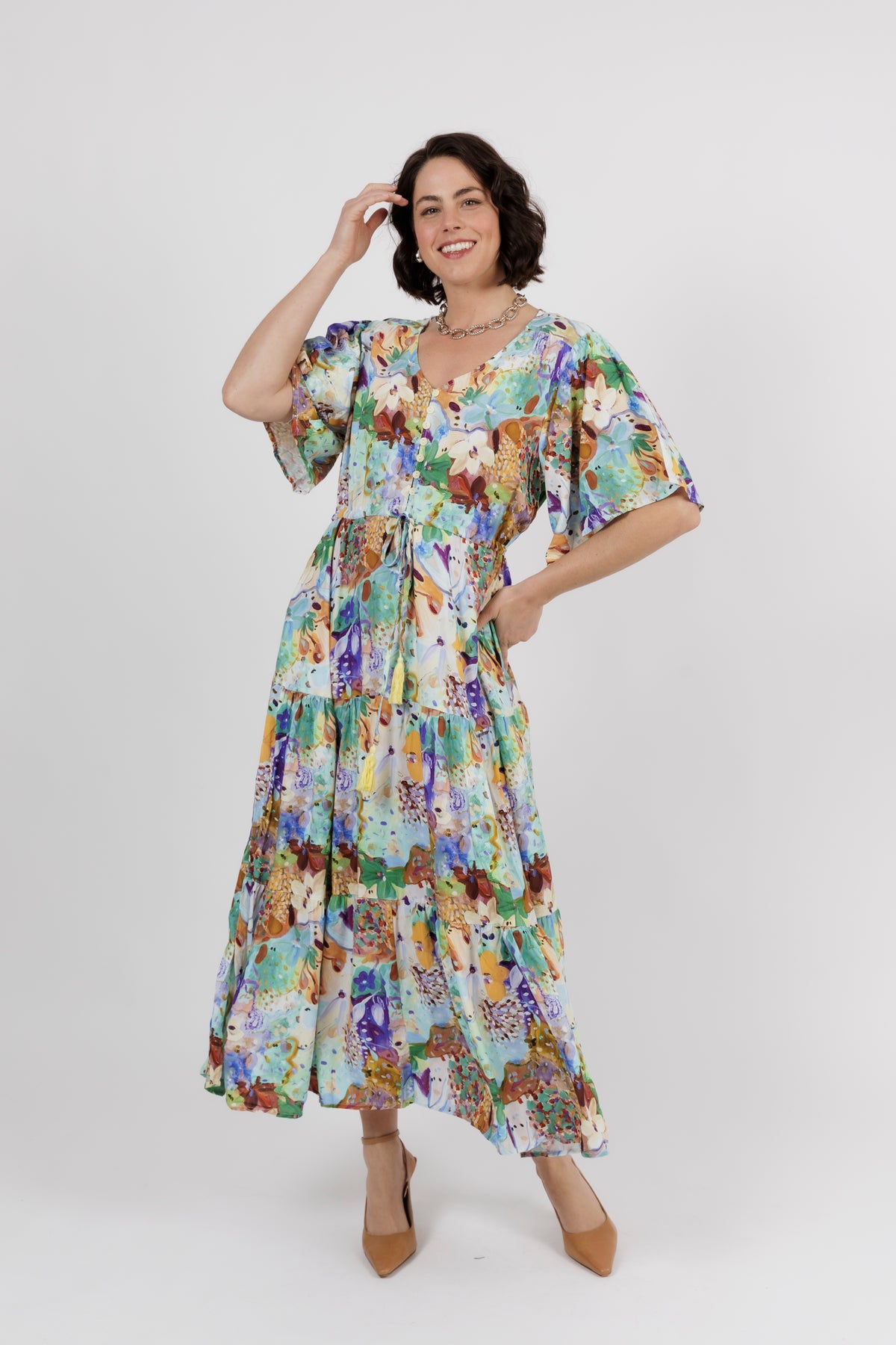 The V-neckline and three-quarter sleeves add a flattering touch, while the straight relaxed silhouette and side pockets provide both comfort and practicality. Ideal for brunches, travel, or warm-weather events, this artistic dress brings colour, movement, and sophistication to every occasion.